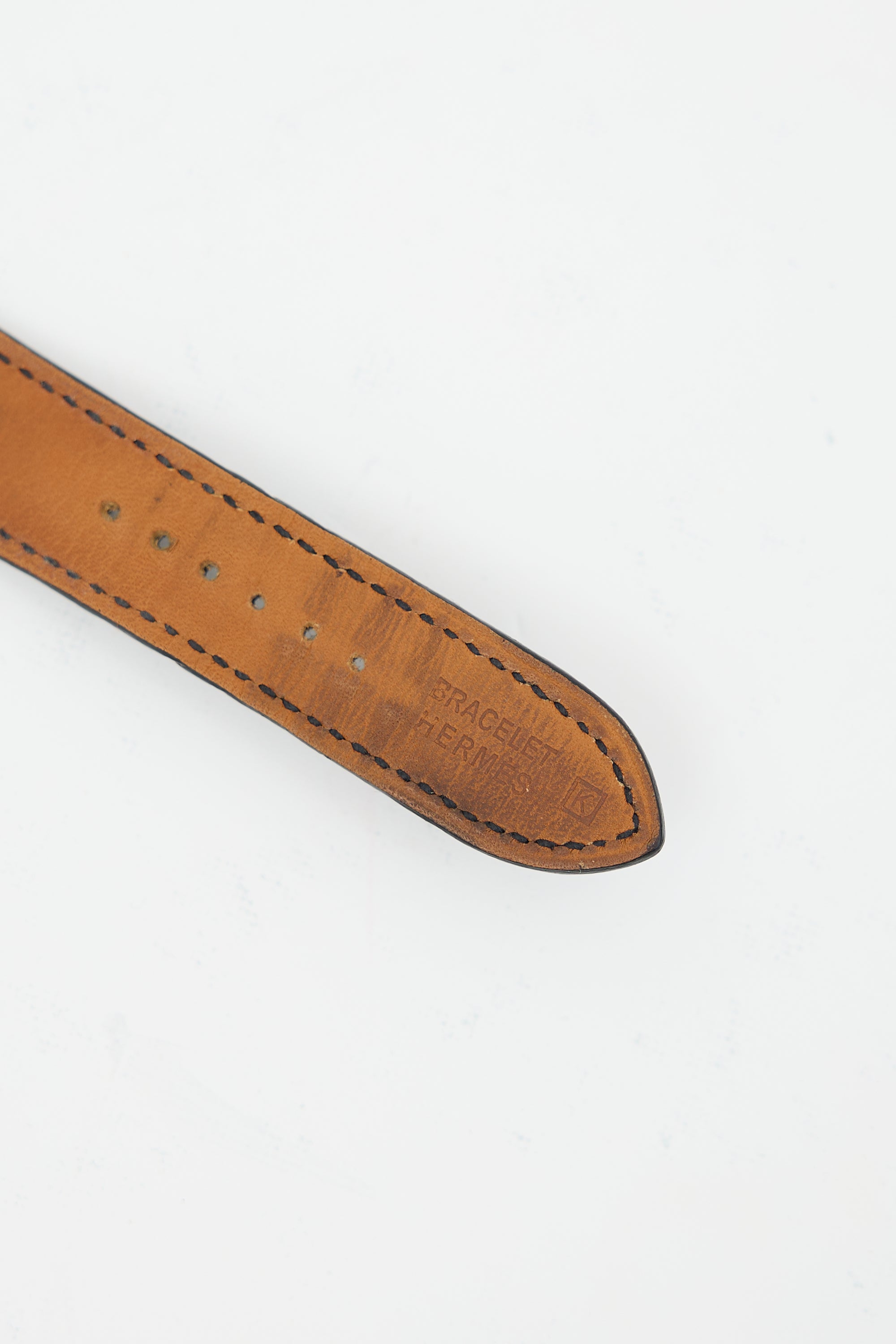 Pre-owned Hermès 2007 Cape Cod watch featuring Noir Swift leather straps, 33mm stainless steel square case, quartz movement, opaline silvered dial, and stamped logo at reverse. Comes with extra set of Fauve Swift leather Double Tour straps.