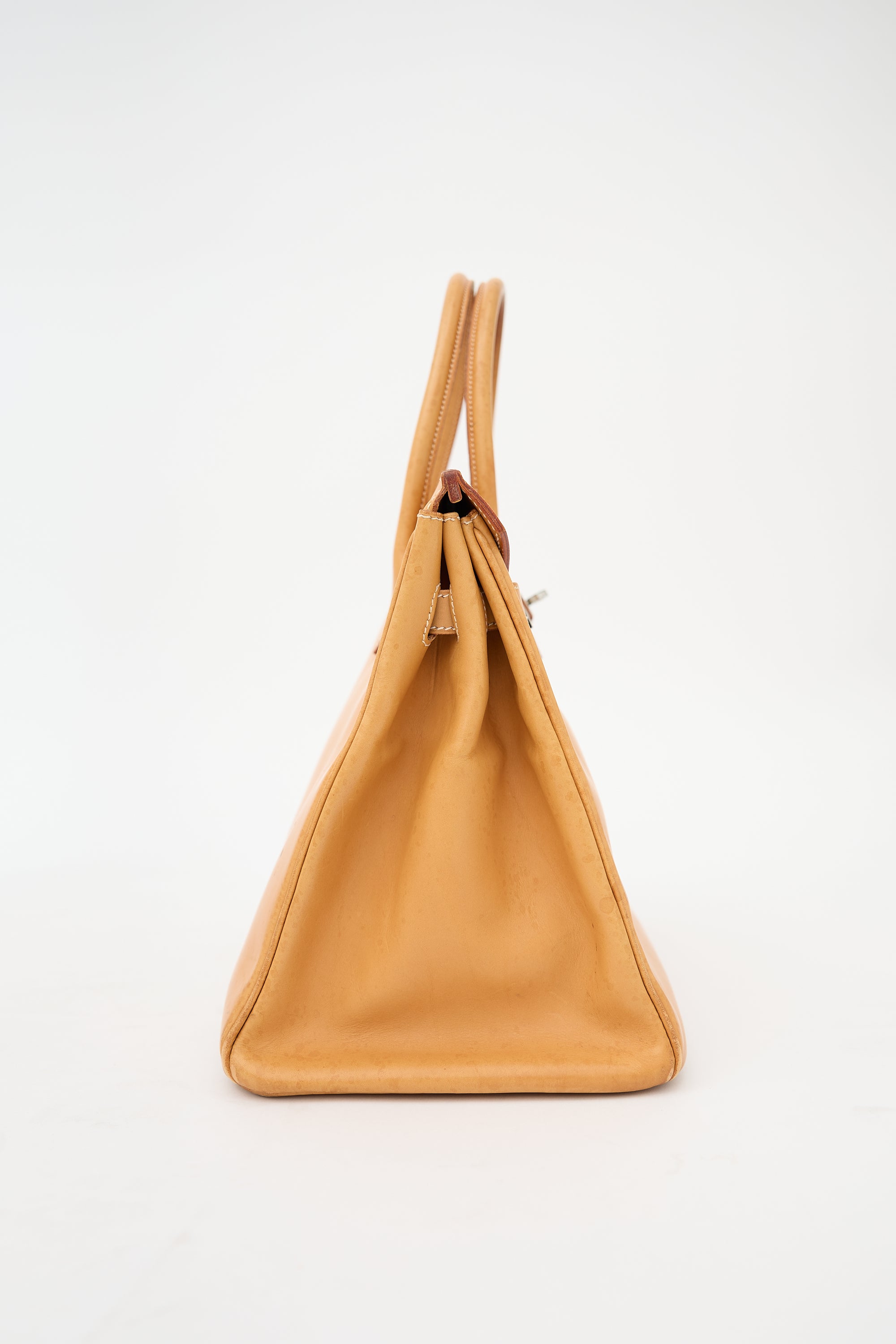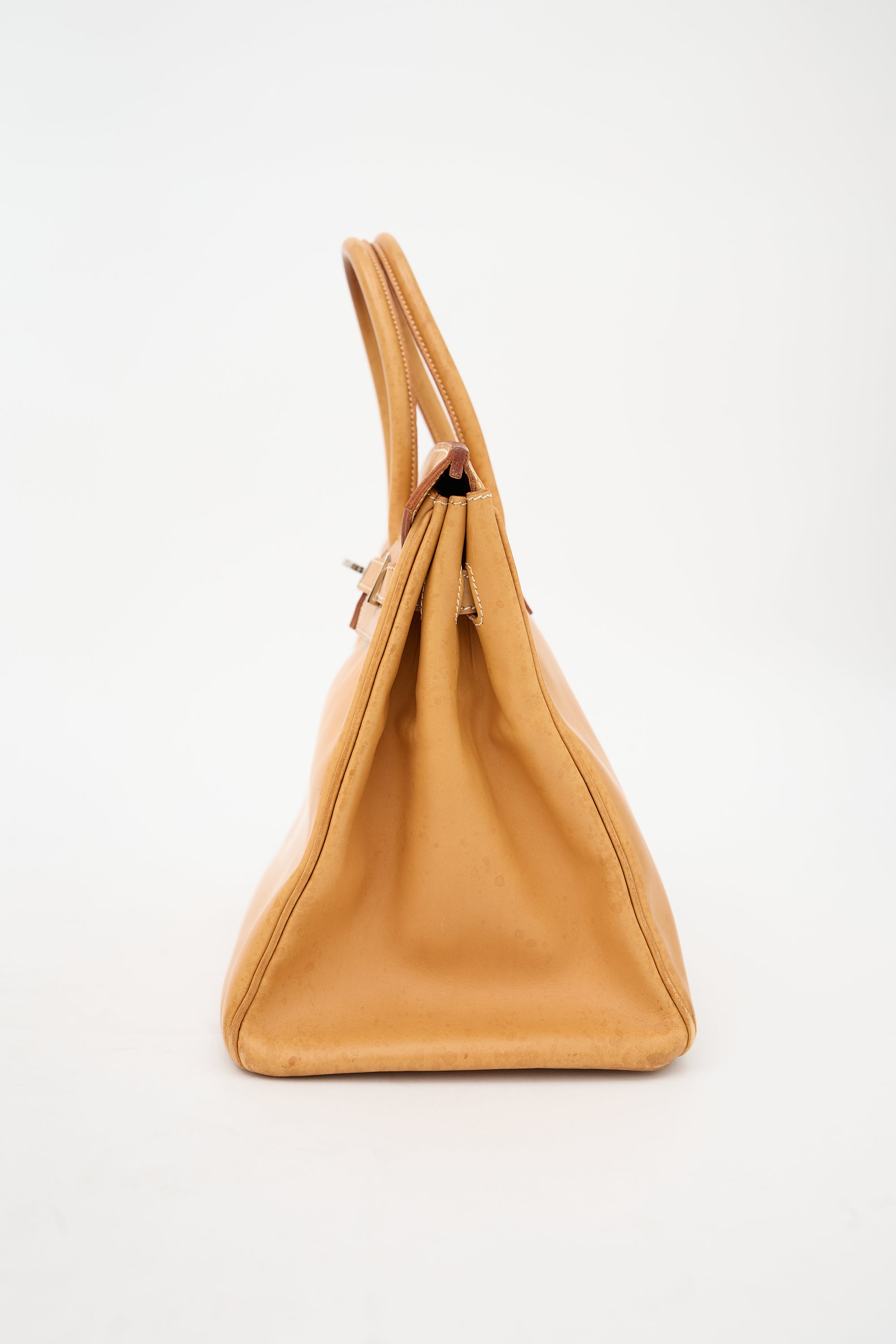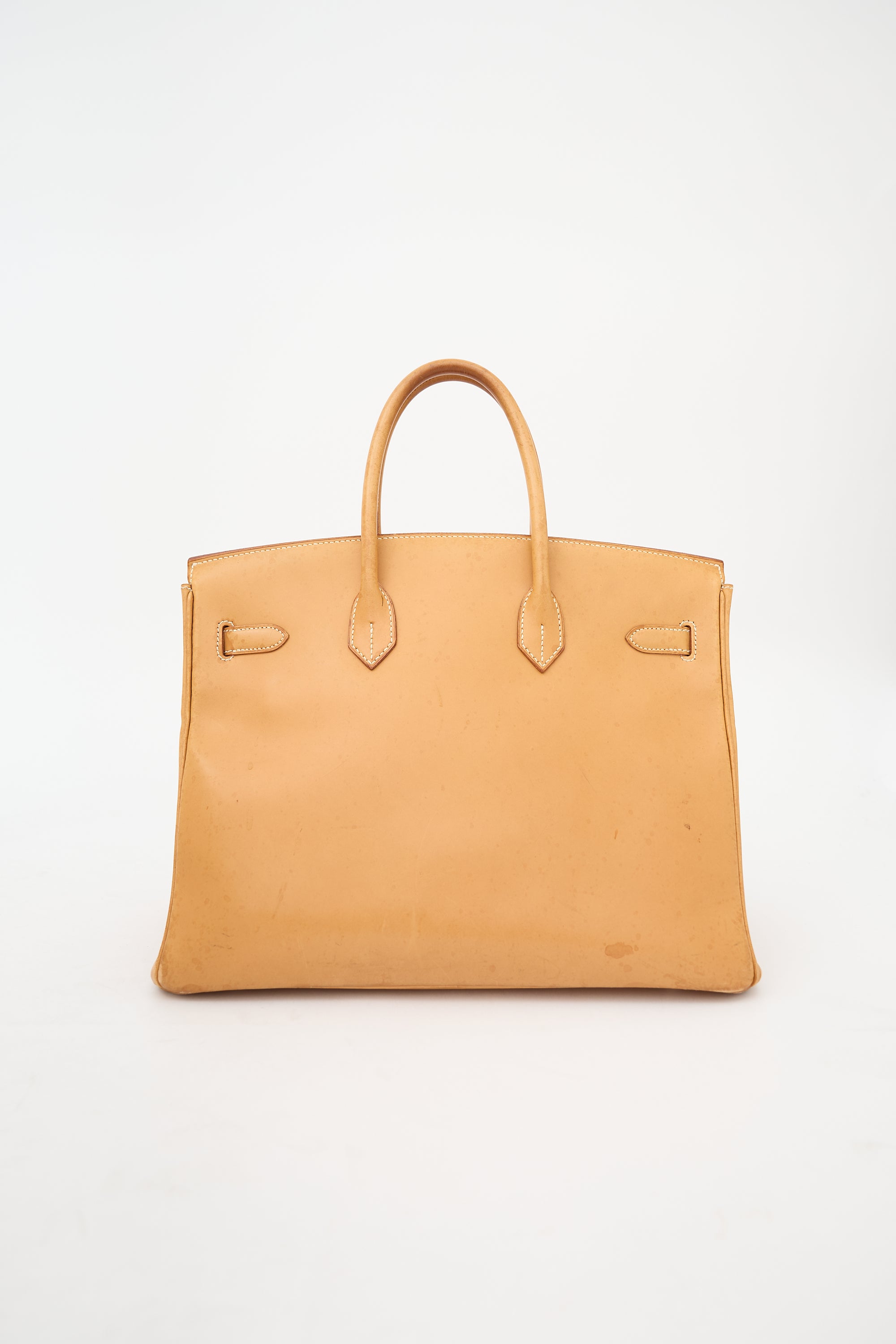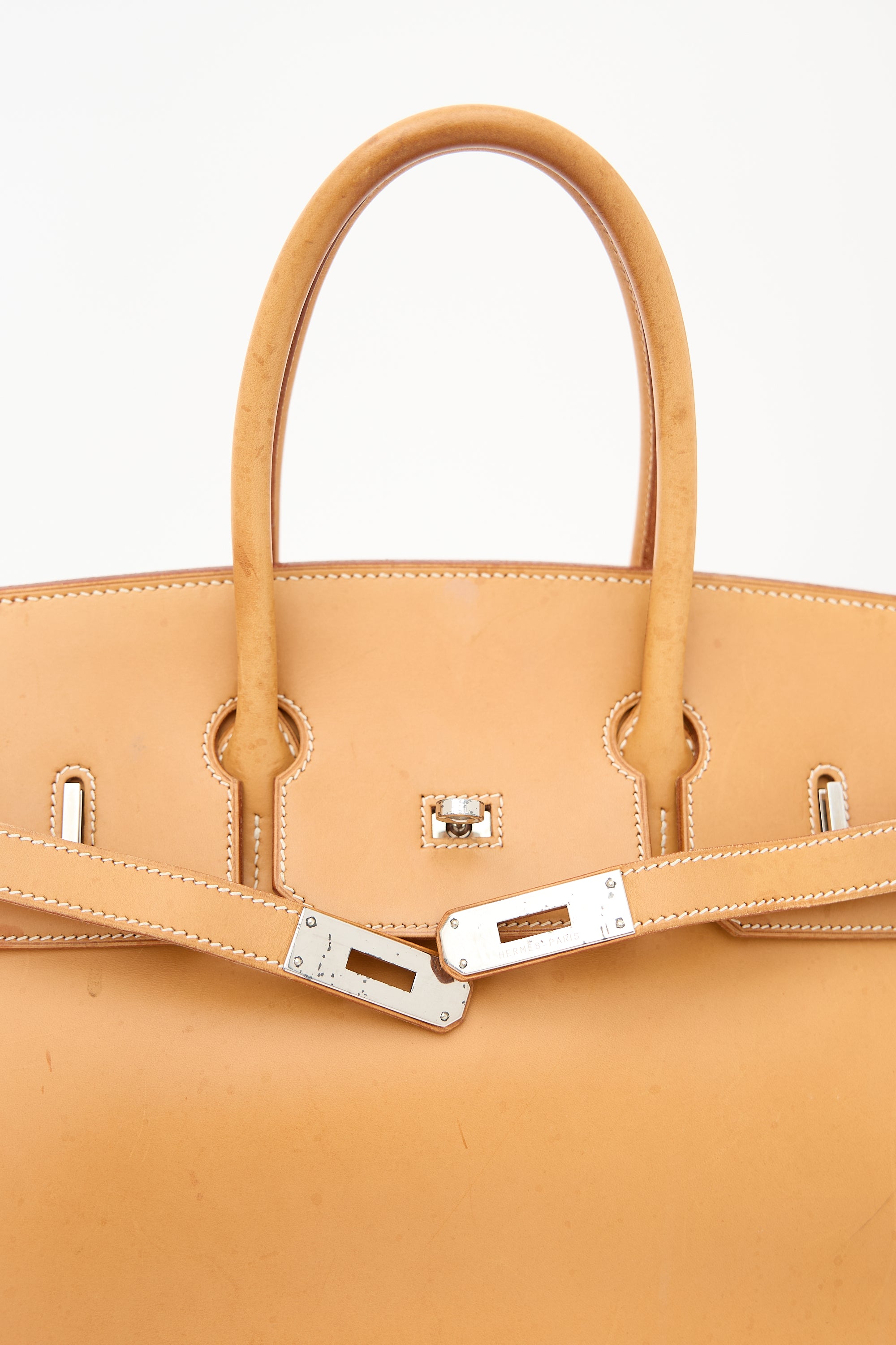 Pre-owned Hermès 2009 Birkin 35 bag in brown Vache Naturelle leather featuring white contrast stitching, Palladium hardware, dual top handles, sangles, logo engraved plaque, signature touret closure, stamped logo under top flap, four clou, and one main compartment with one zip pocket and one slip pocket.