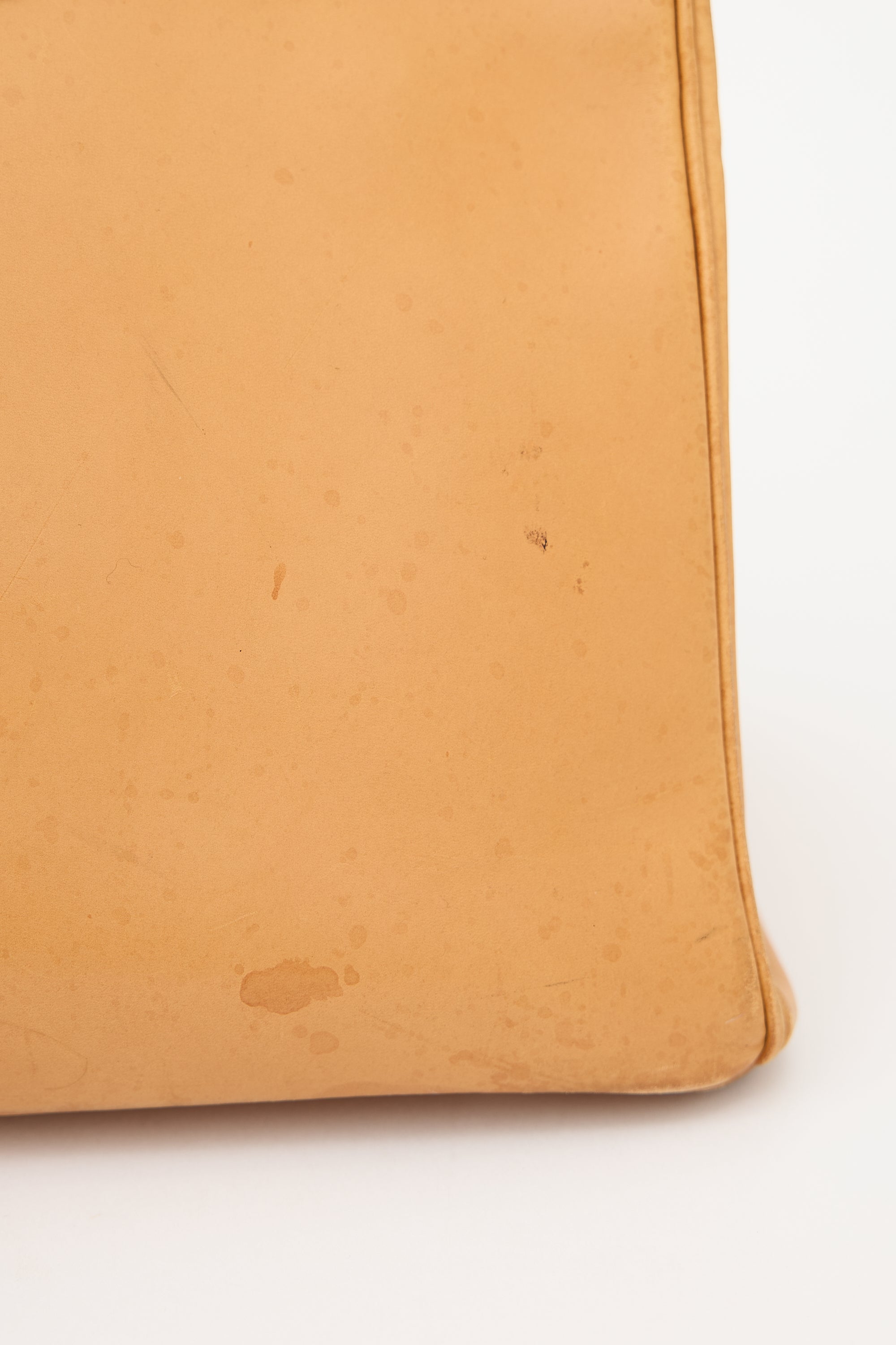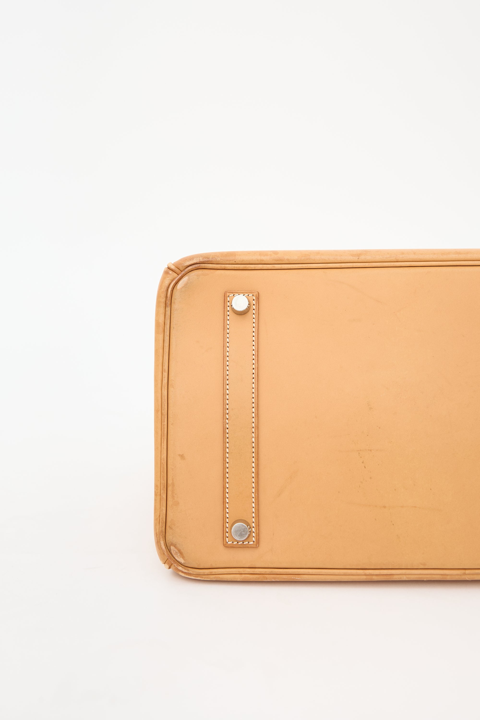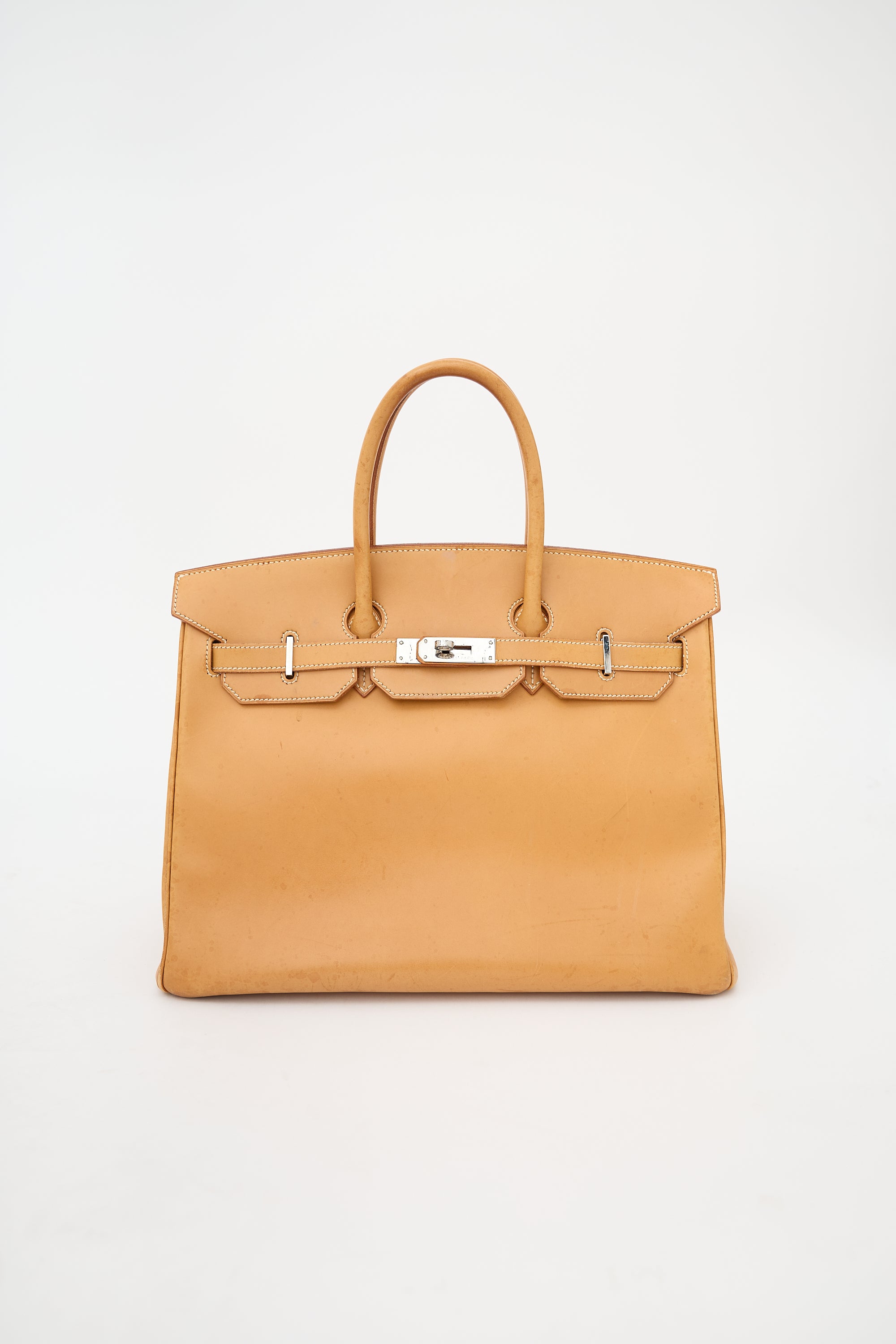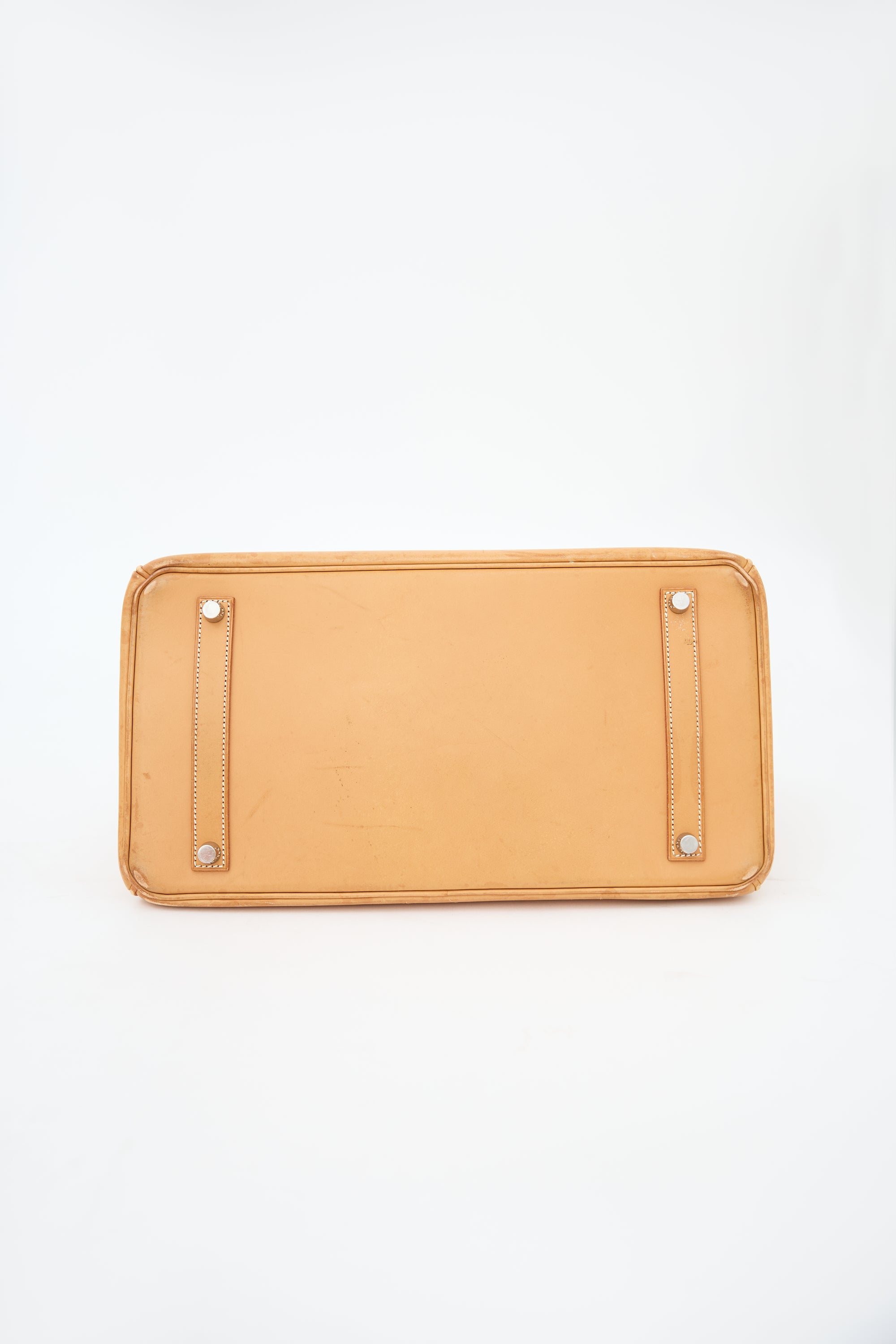 Pre-owned Hermès 2009 Birkin 35 bag in brown Vache Naturelle leather featuring white contrast stitching, Palladium hardware, dual top handles, sangles, logo engraved plaque, signature touret closure, stamped logo under top flap, four clou, and one main compartment with one zip pocket and one slip pocket.