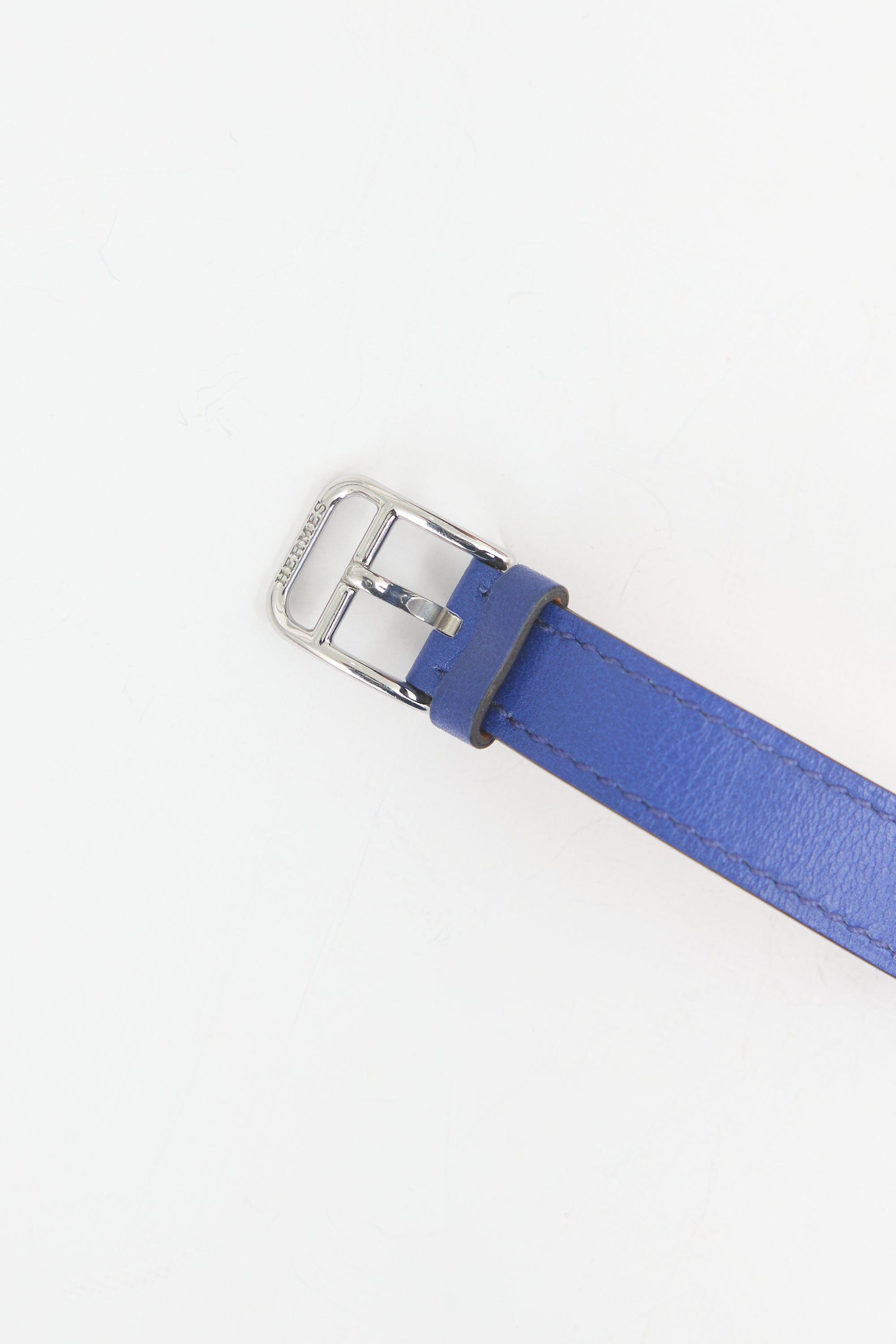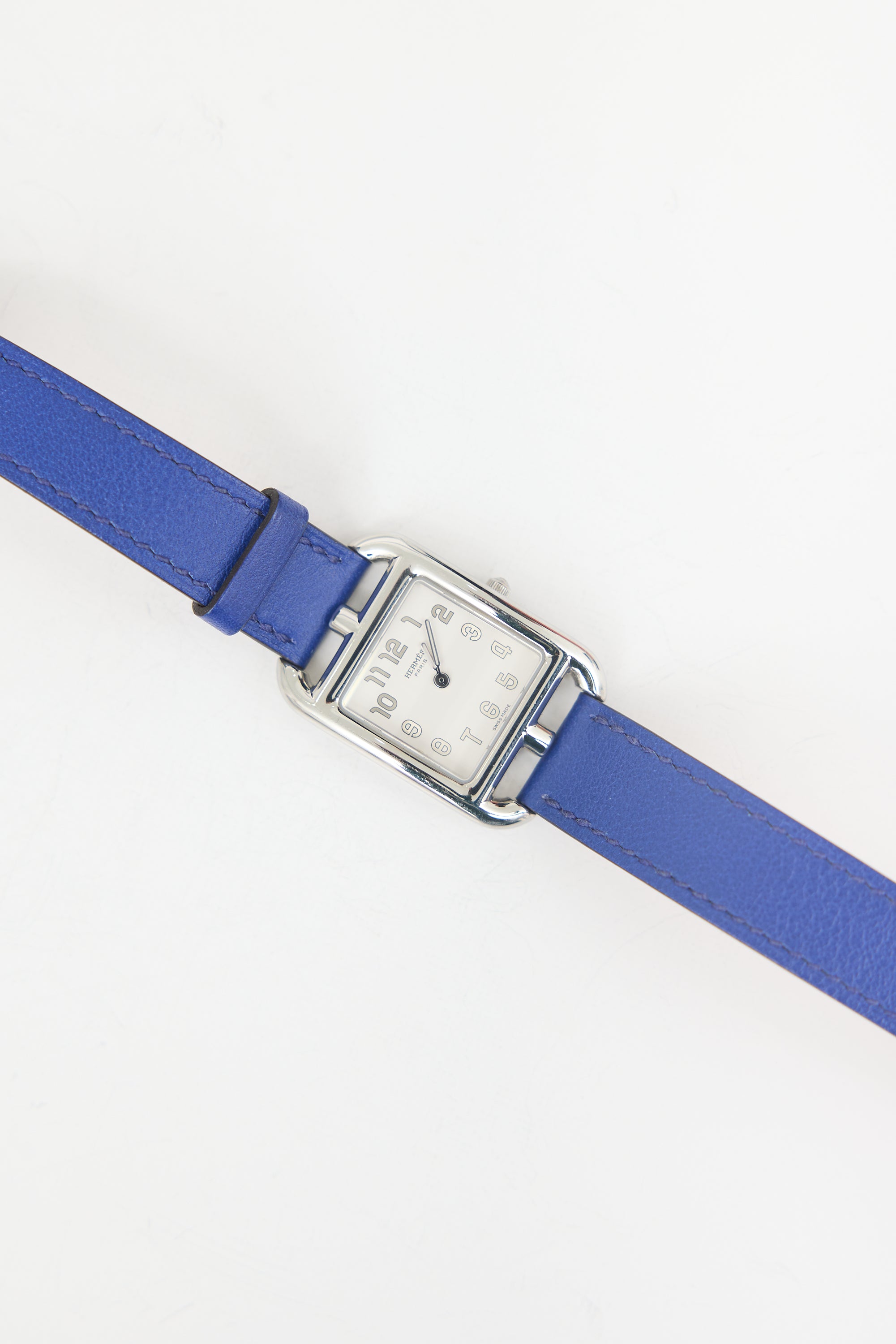 Pre-owned Hermès 2012 Cape Cod Double Tour watch featuring a 23mm stainless steel square case, quartz movement, opaline silvered dial, blue Swift leather Double Tour band, and stamped logo at reverse. Comes with original case.