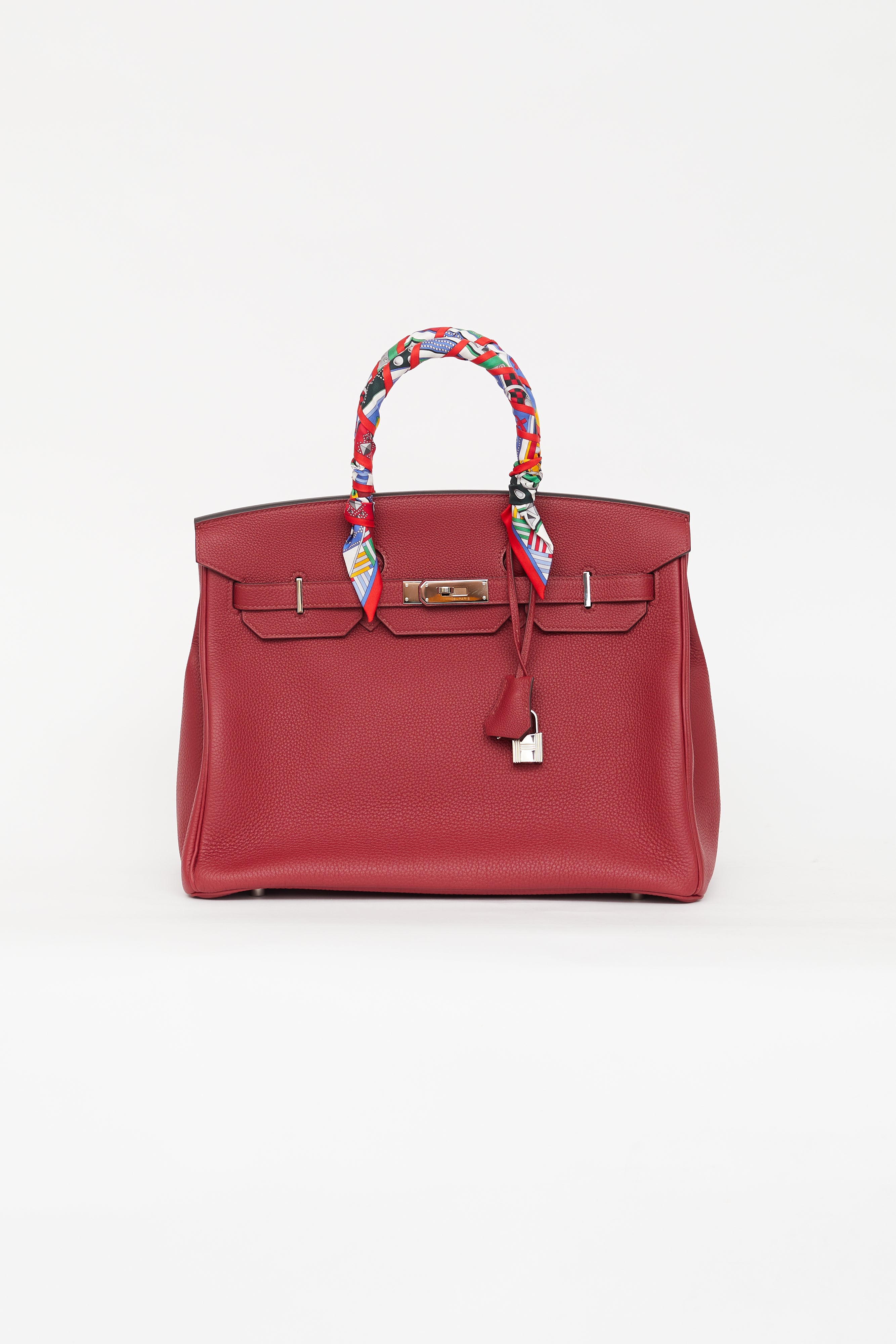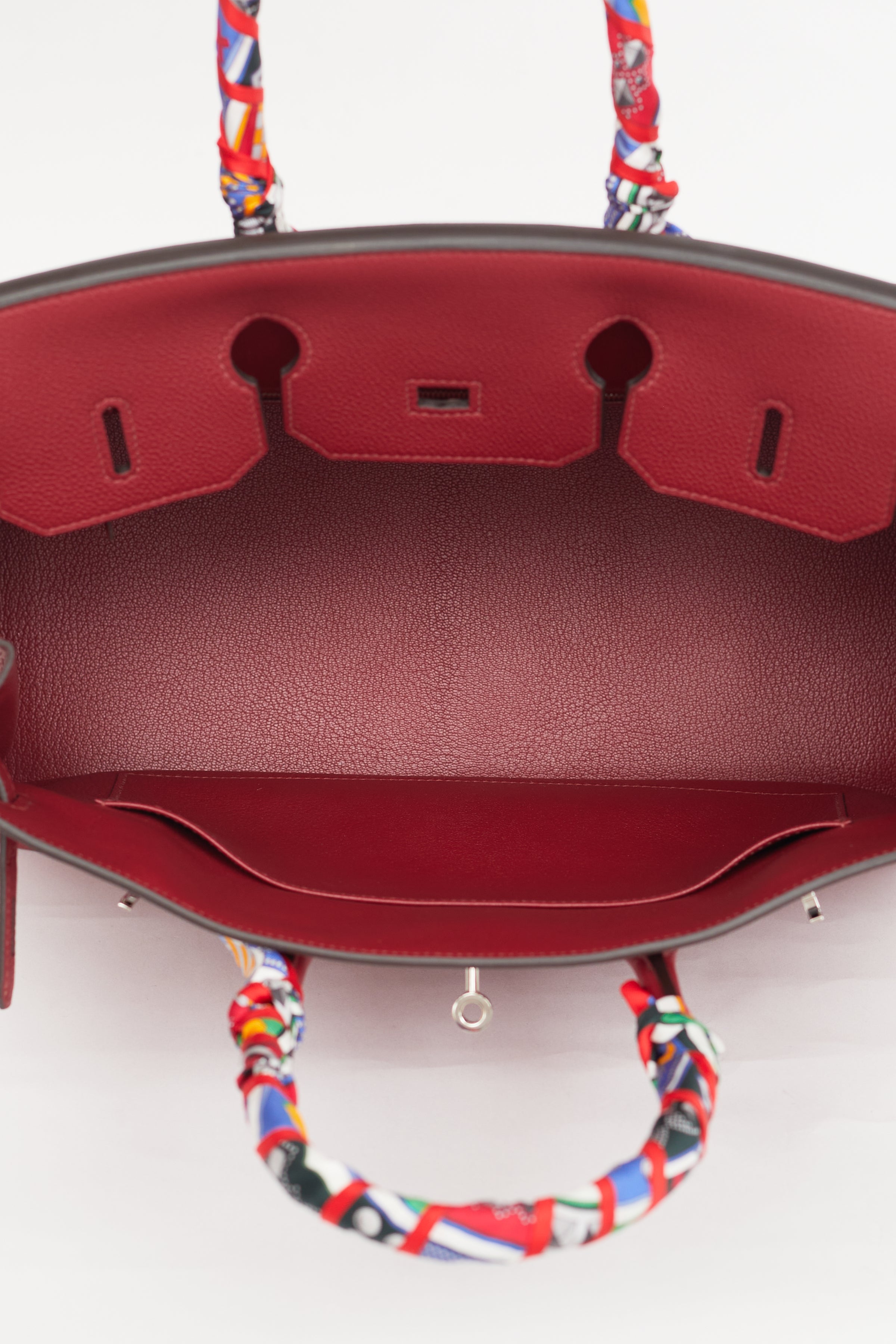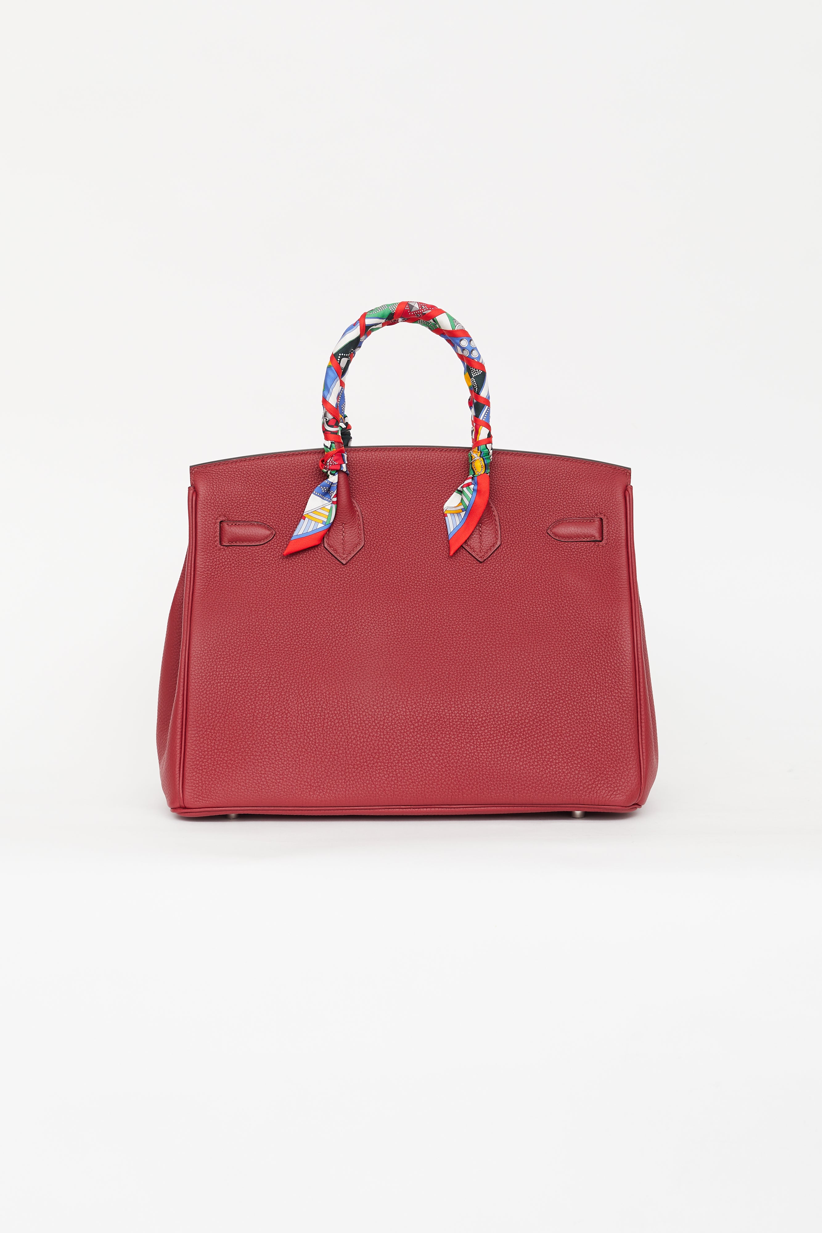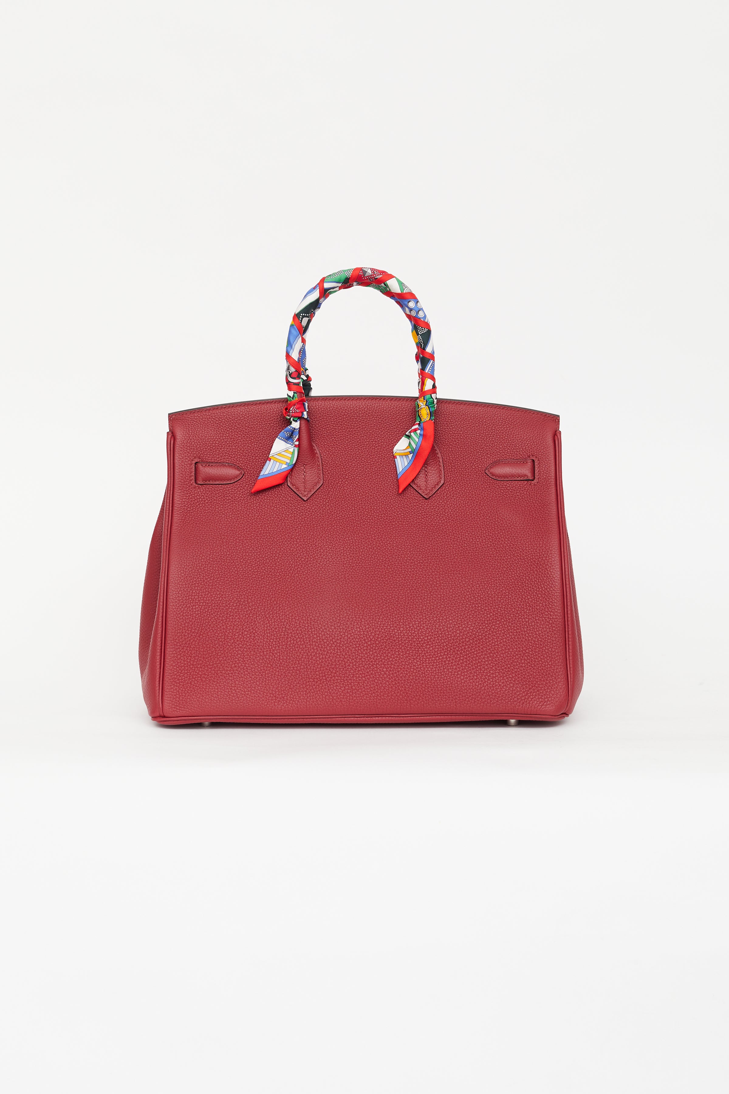 Pre-owned 2016 Hermès Birkin 35 bag in Rouge Grenat Togo leather featuring Palladium hardware, silver stamped logo under flap, rolled top handles, tonal leather interior, four clou, contrast stitching, logo engraved plaque, clochette and lock, and slip and zip pocket at interior. Comes with twilly, original dust bag, box, and rain cover. Original receipt available upon request.
