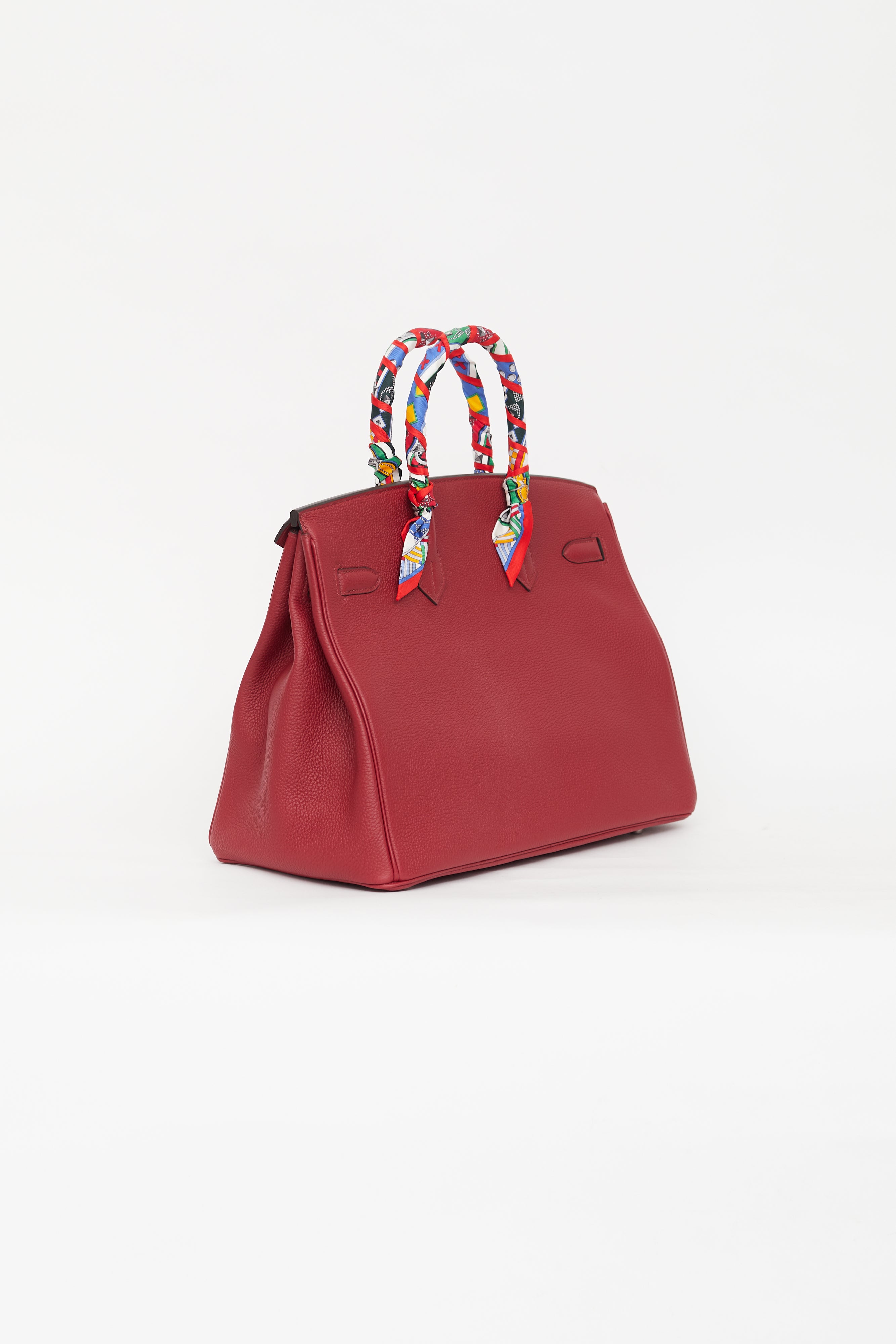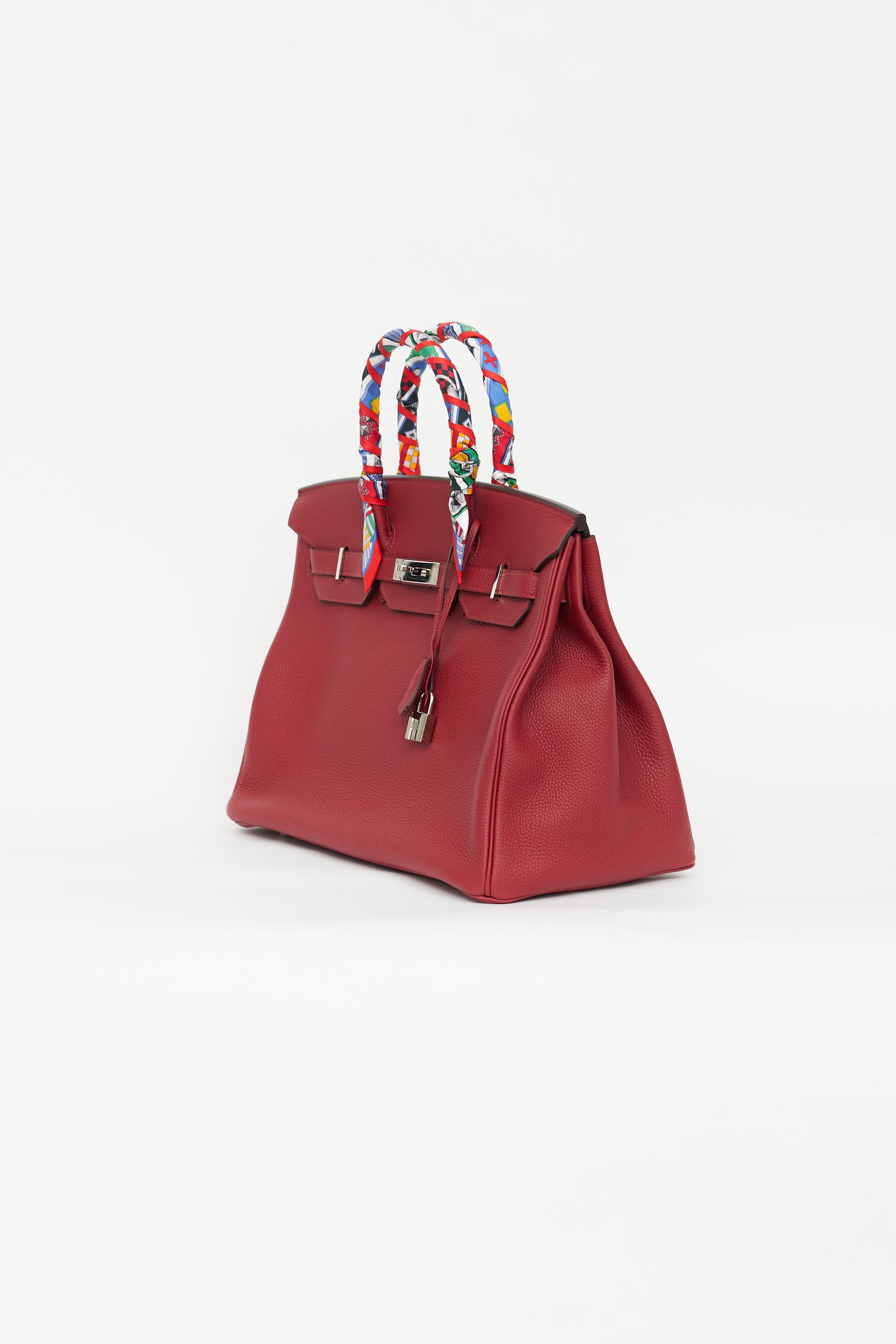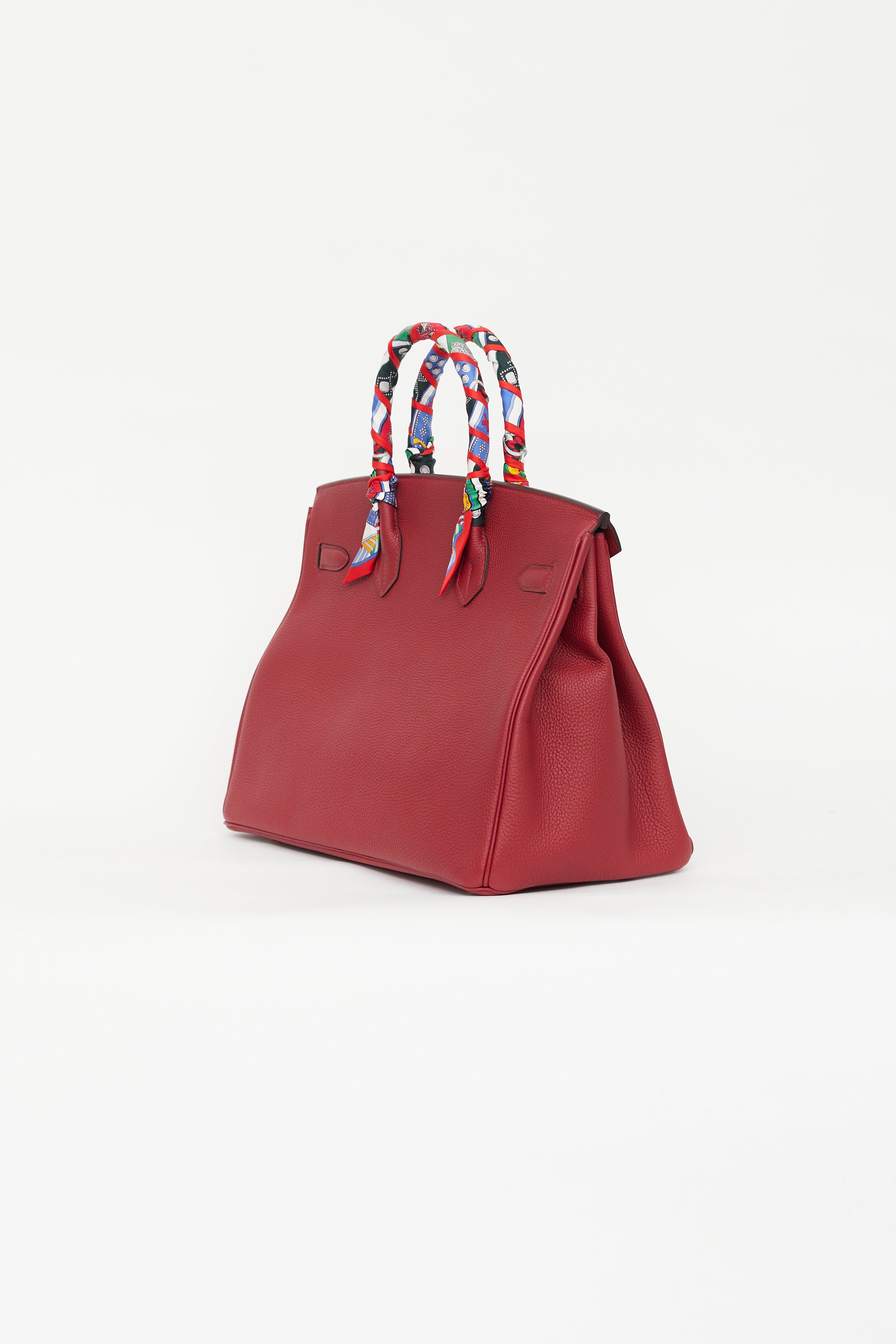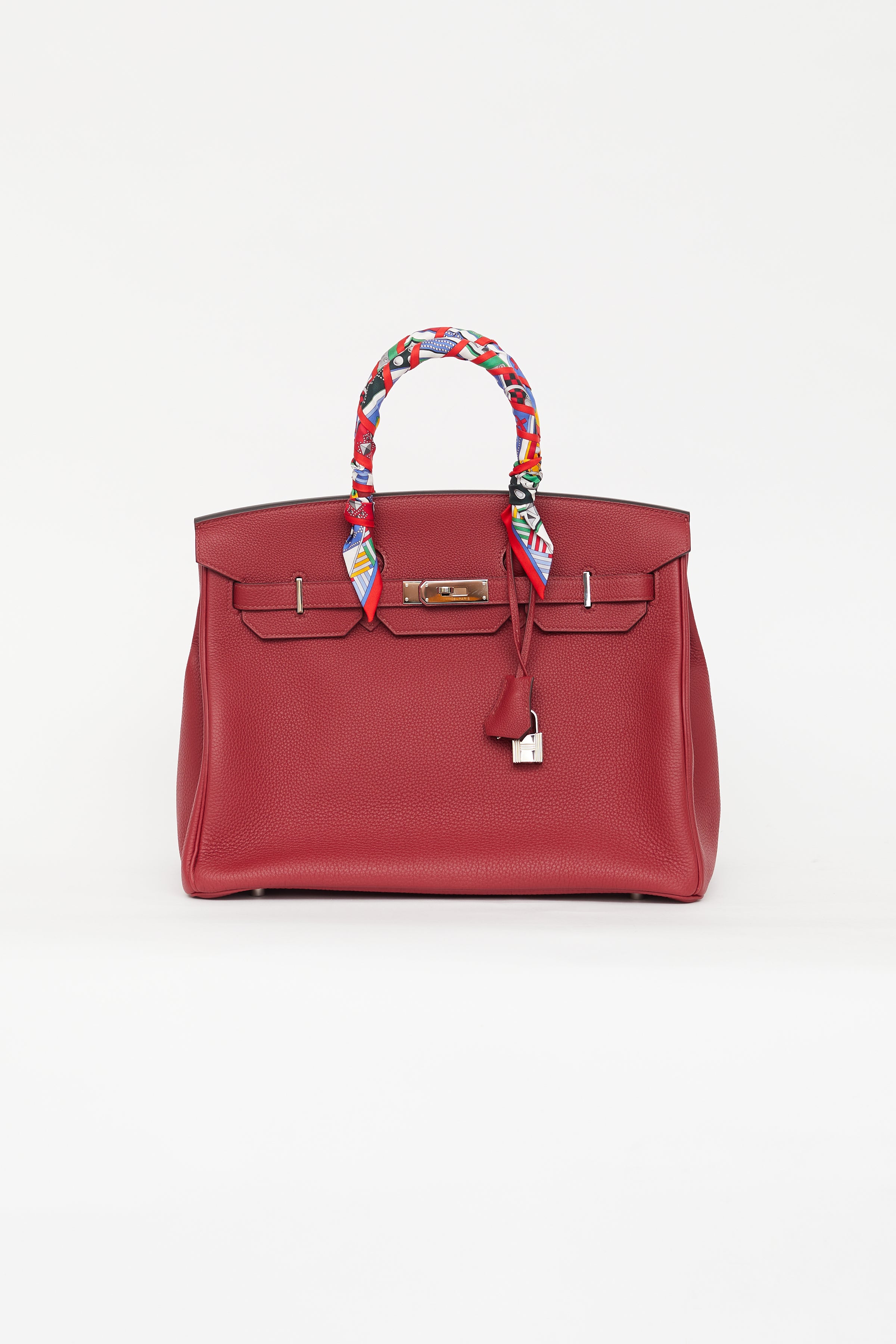 Pre-owned 2016 Hermès Birkin 35 bag in Rouge Grenat Togo leather featuring Palladium hardware, silver stamped logo under flap, rolled top handles, tonal leather interior, four clou, contrast stitching, logo engraved plaque, clochette and lock, and slip and zip pocket at interior. Comes with twilly, original dust bag, box, and rain cover. Original receipt available upon request.