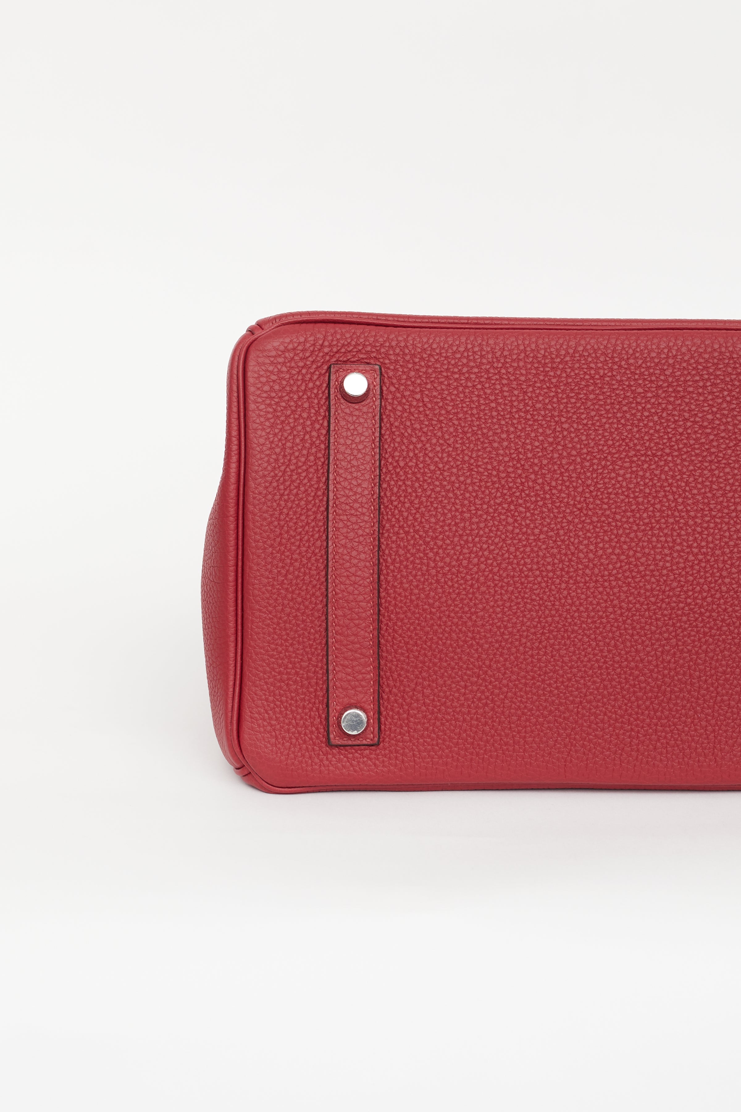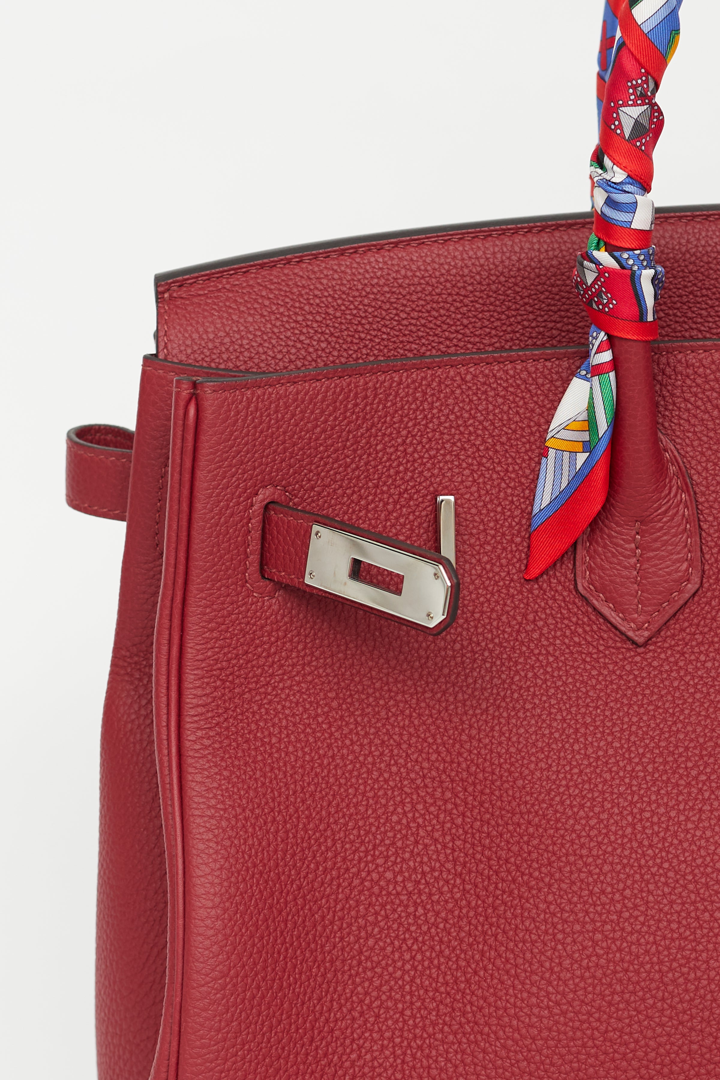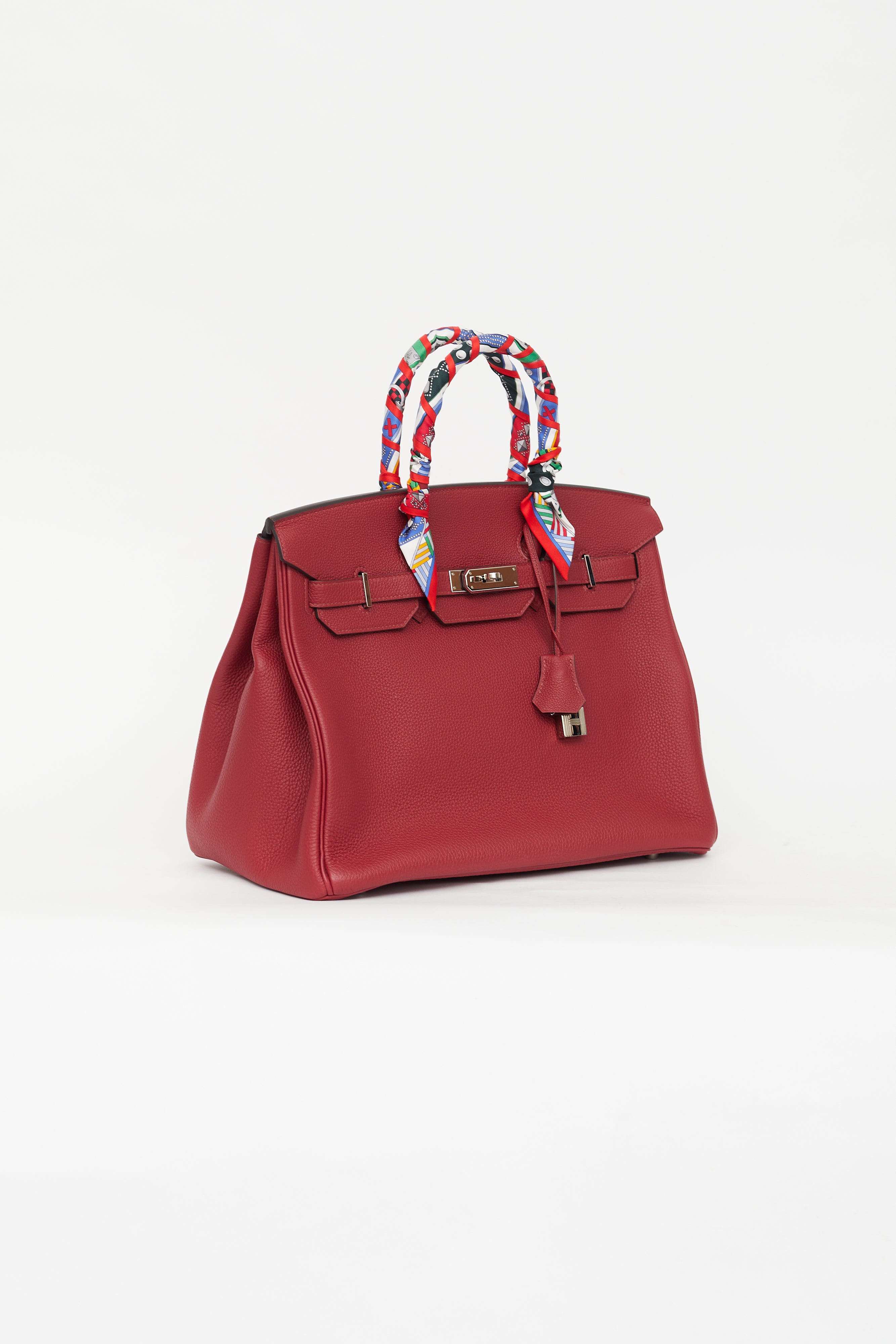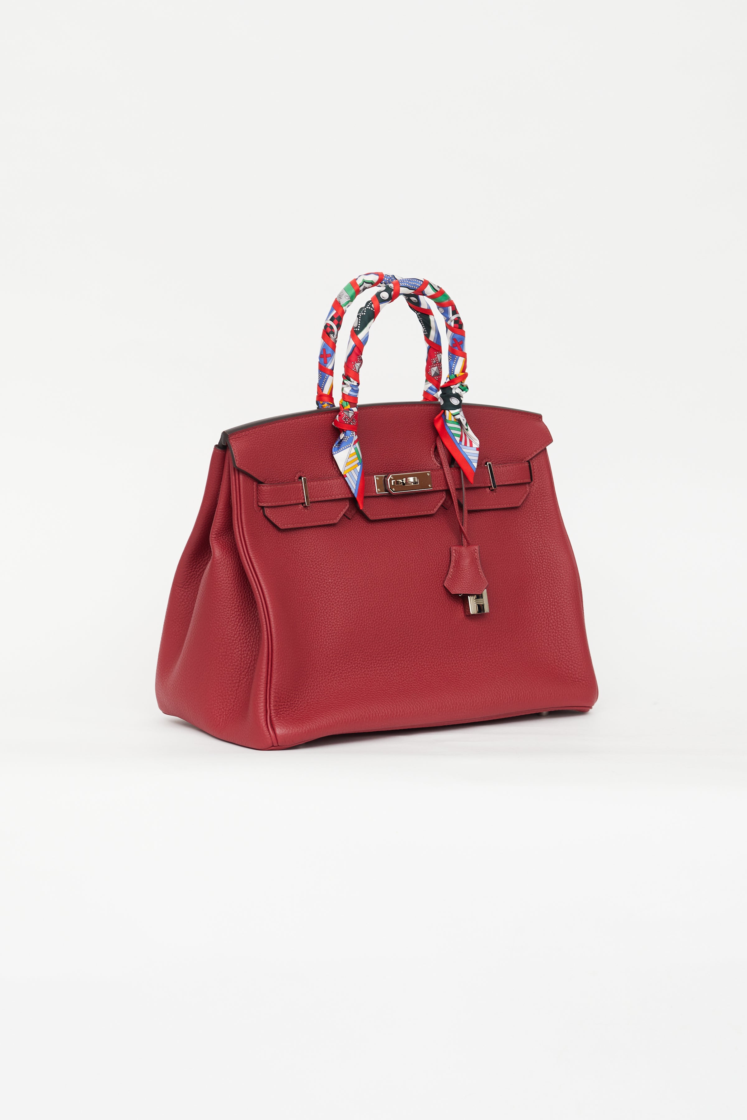 Pre-owned 2016 Hermès Birkin 35 bag in Rouge Grenat Togo leather featuring Palladium hardware, silver stamped logo under flap, rolled top handles, tonal leather interior, four clou, contrast stitching, logo engraved plaque, clochette and lock, and slip and zip pocket at interior. Comes with twilly, original dust bag, box, and rain cover. Original receipt available upon request.
