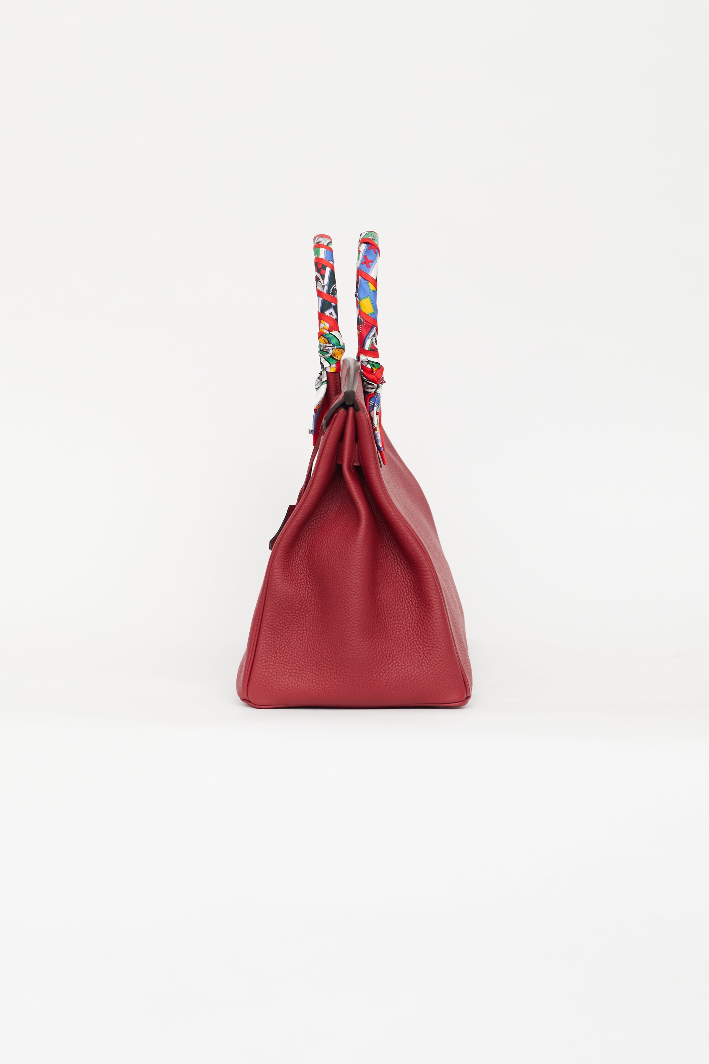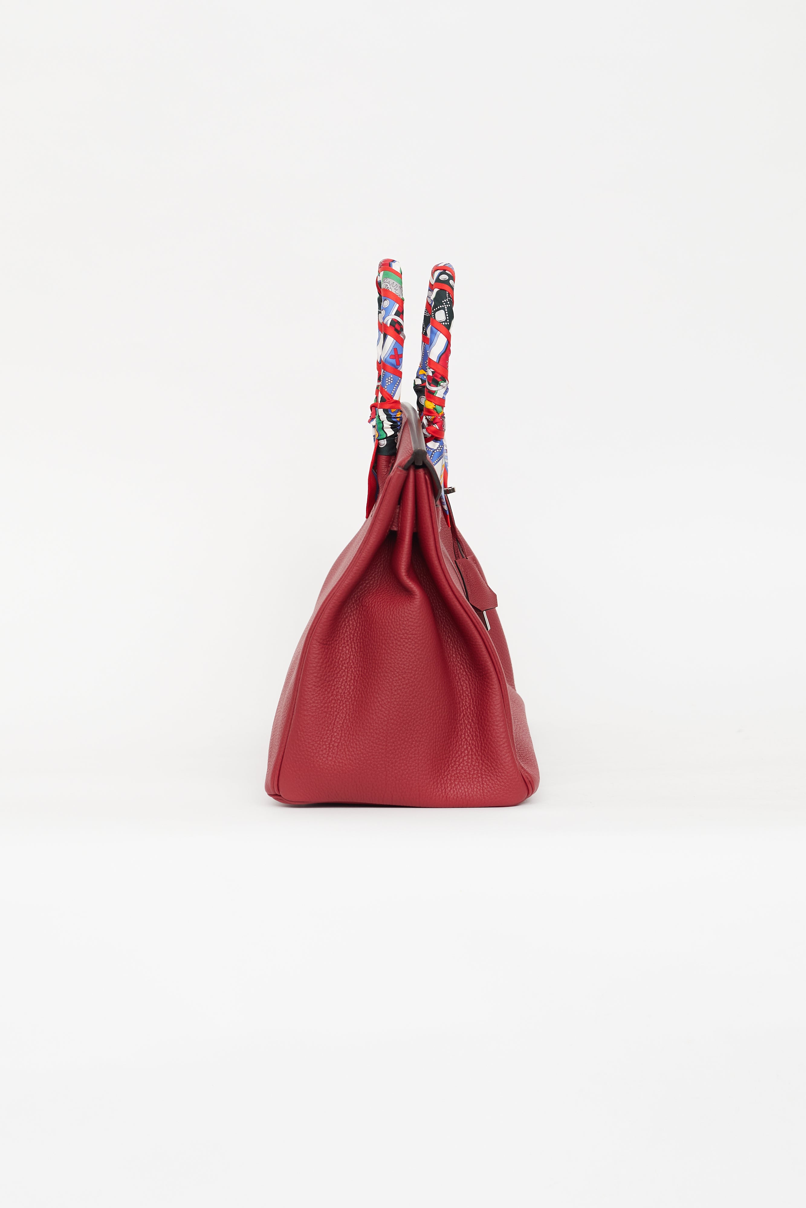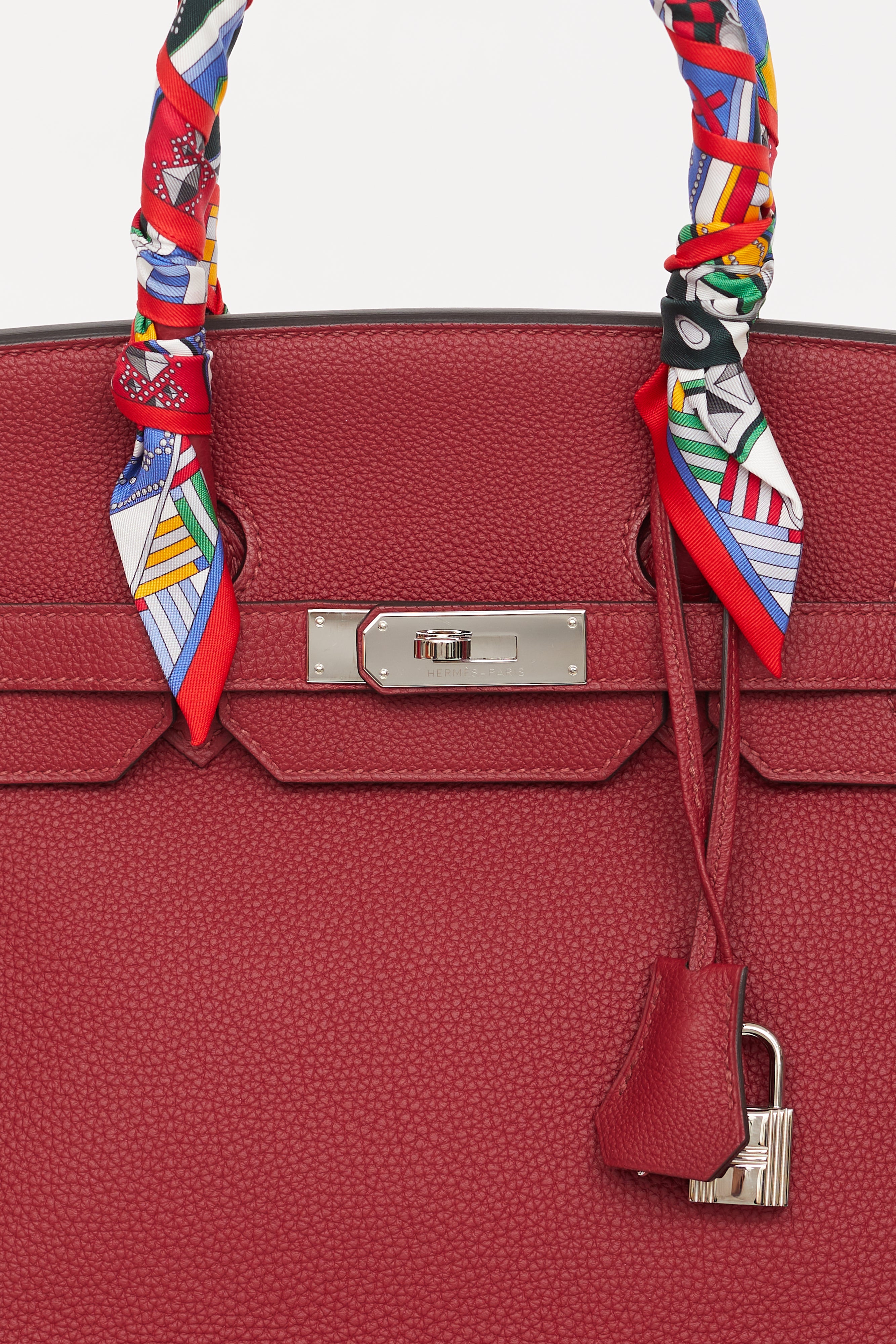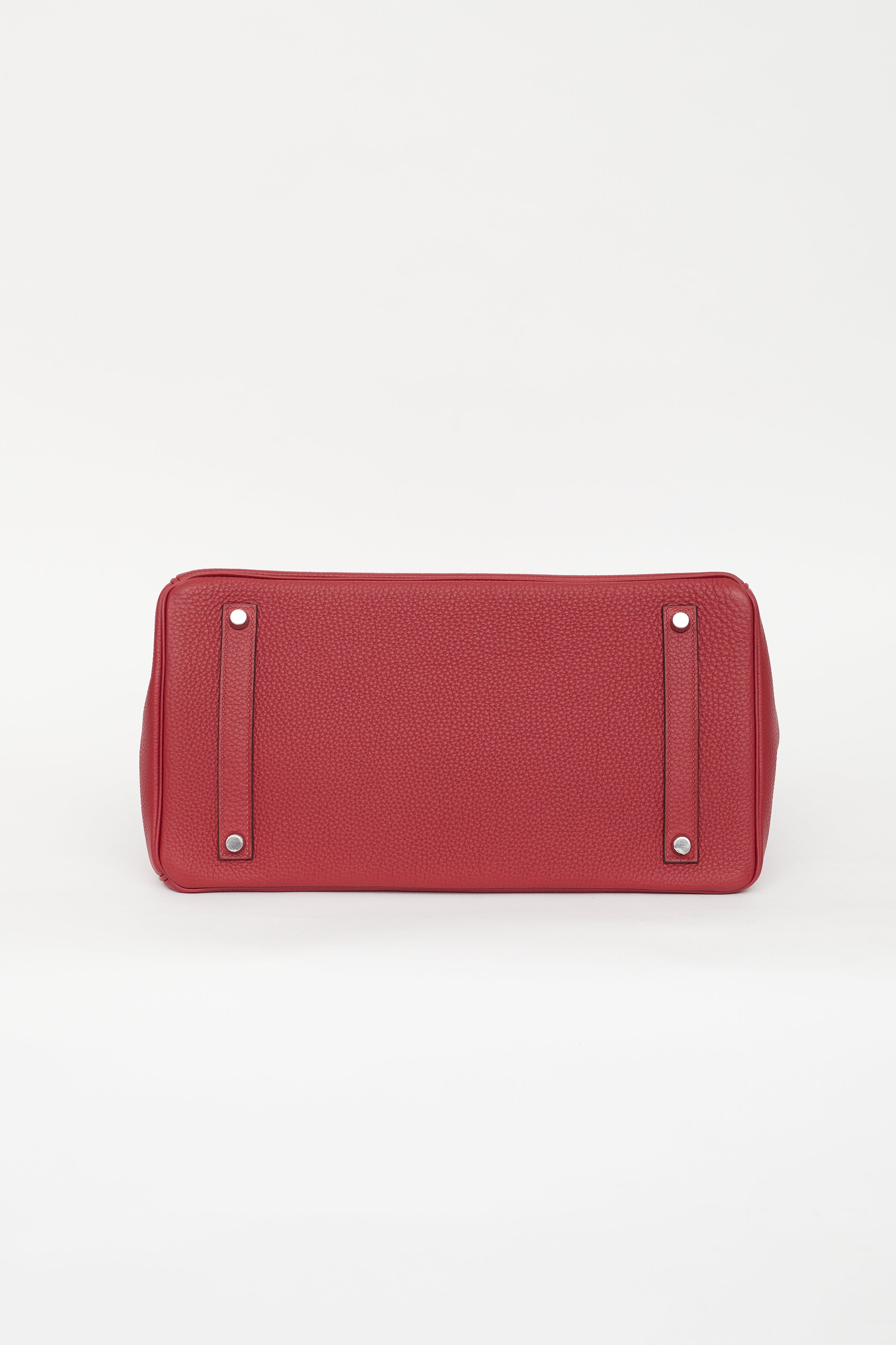 Pre-owned 2016 Hermès Birkin 35 bag in Rouge Grenat Togo leather featuring Palladium hardware, silver stamped logo under flap, rolled top handles, tonal leather interior, four clou, contrast stitching, logo engraved plaque, clochette and lock, and slip and zip pocket at interior. Comes with twilly, original dust bag, box, and rain cover. Original receipt available upon request.