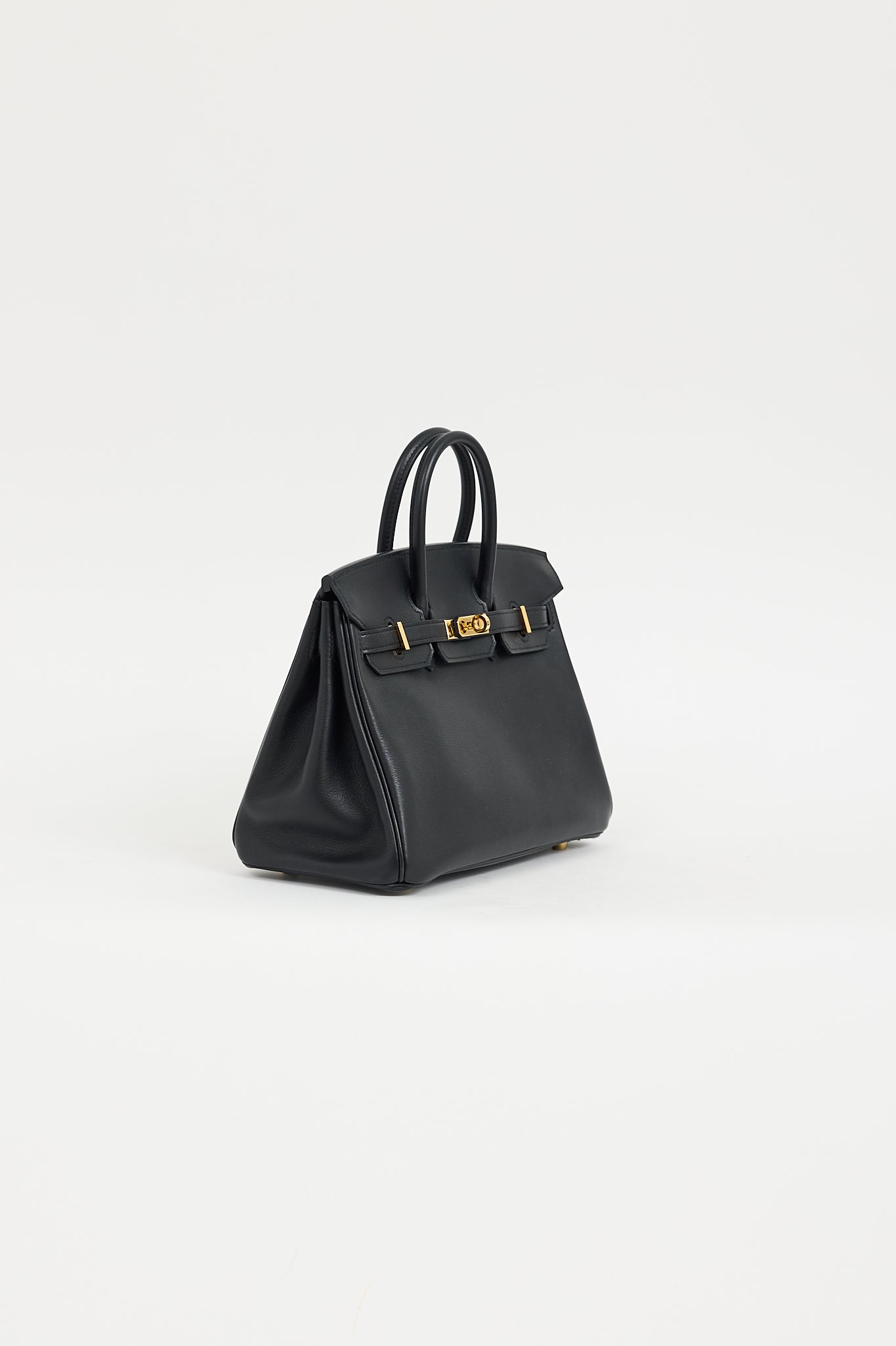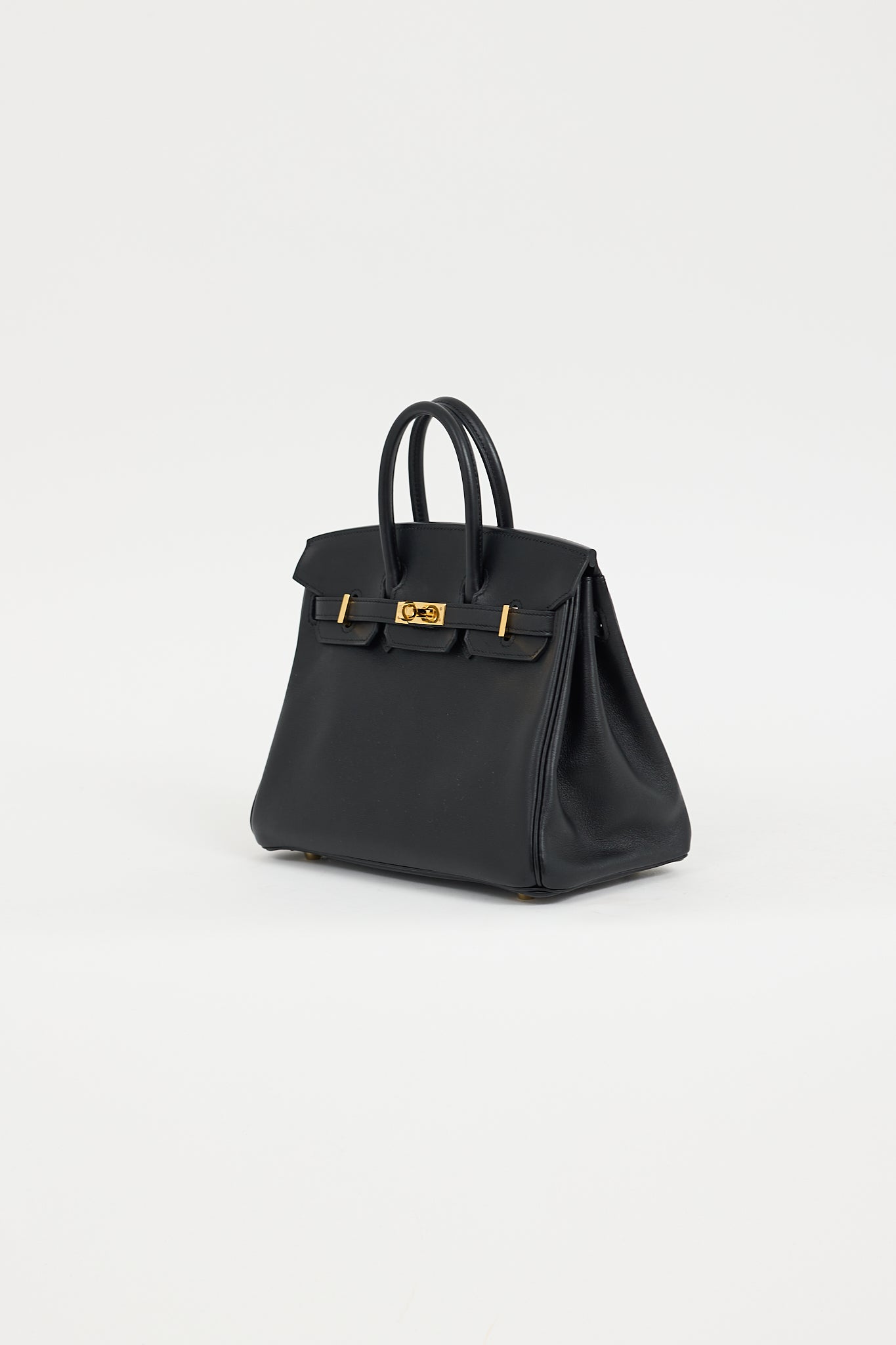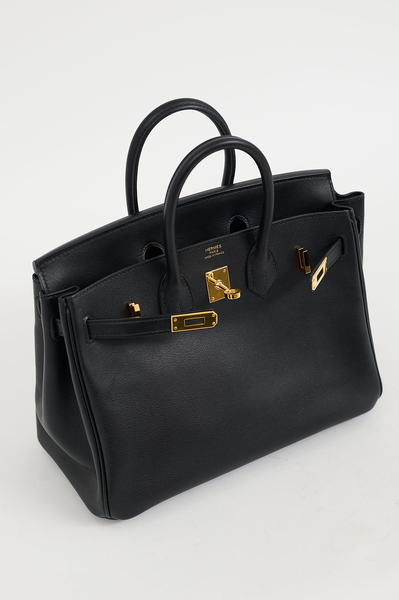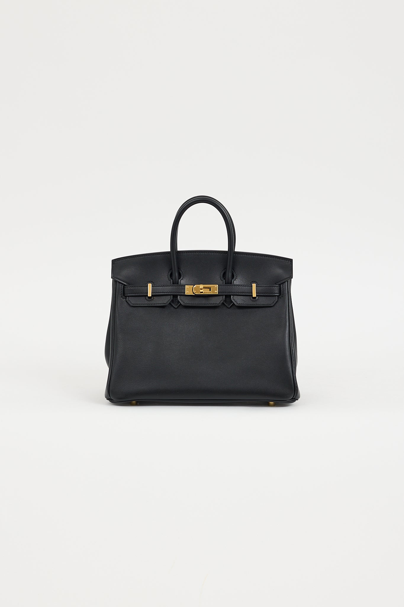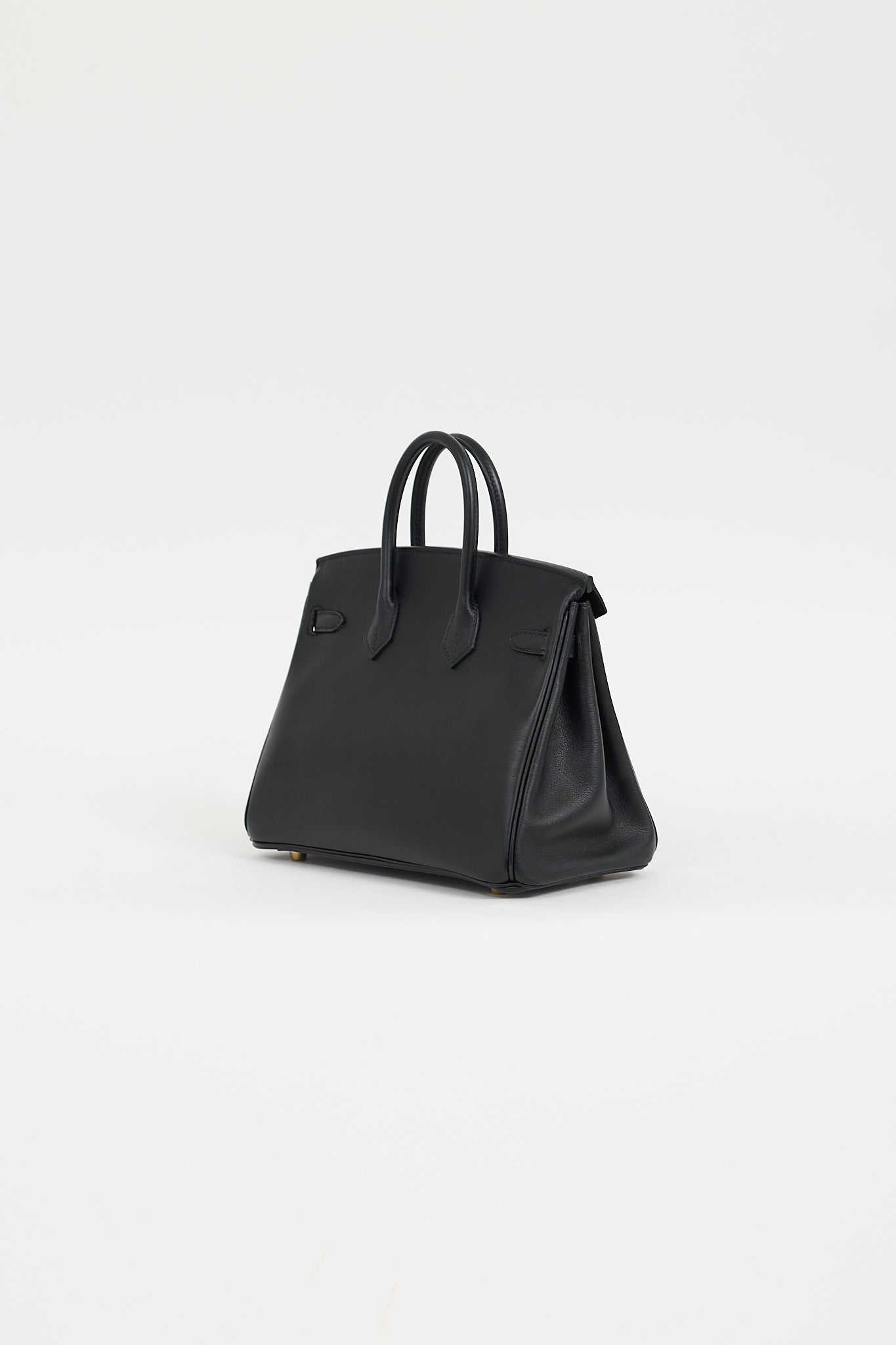 Pre-owned Hermès 2017 Birkin 25 bag in Noir featuring Swift leather, dual rolled top handles, gold plated Palladium hardware, sangles and pontet, detachable lock and clochette, signature twist lock touret closure, gold stamped logo under top flap, four clou, one main compartment, and one zip and slip pockets inside. Comes with original dust bag, box, rain cover, leather care booklet, and copy of original receipt.