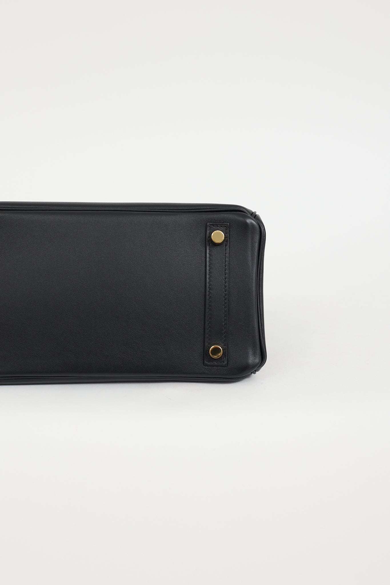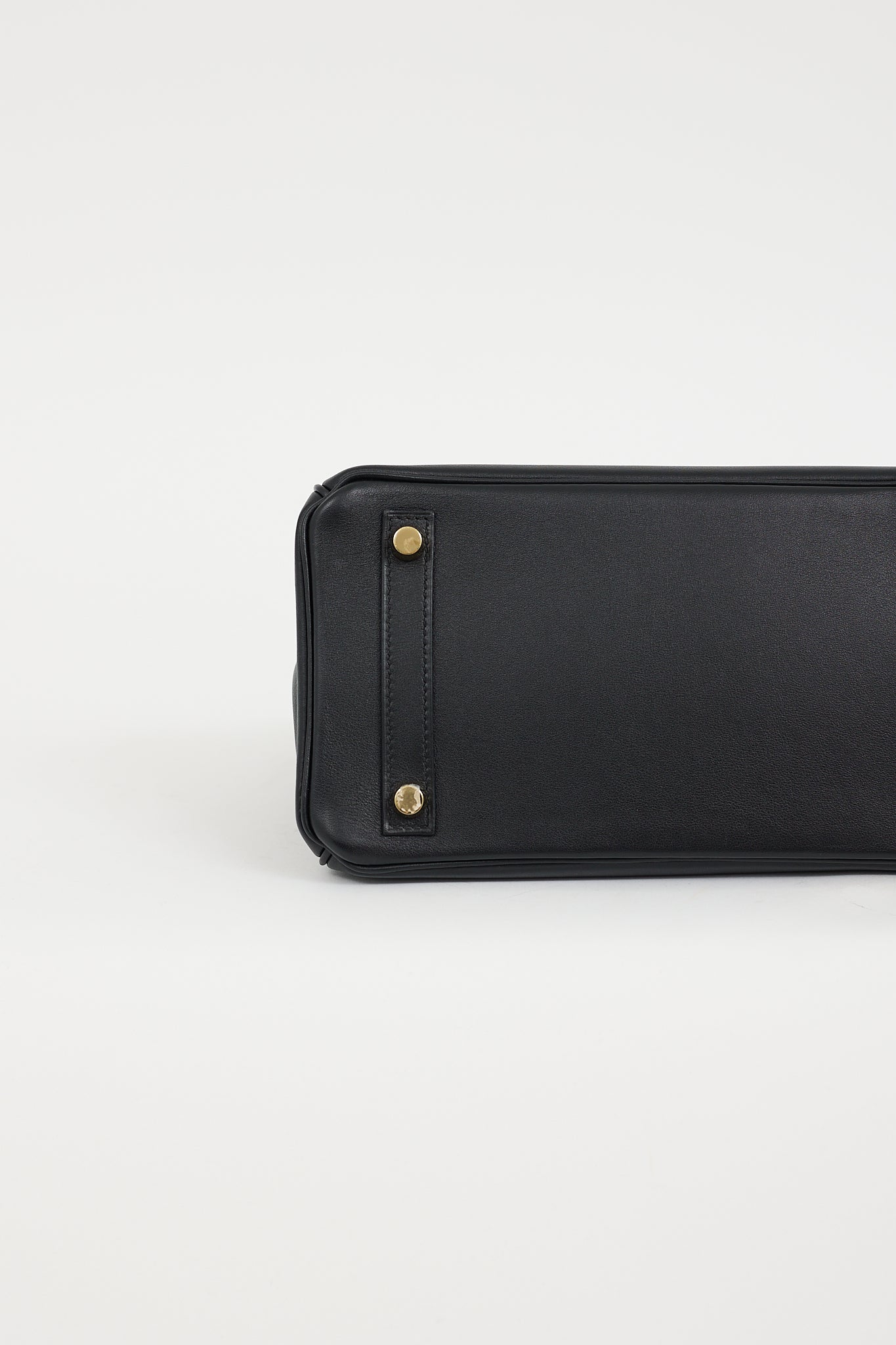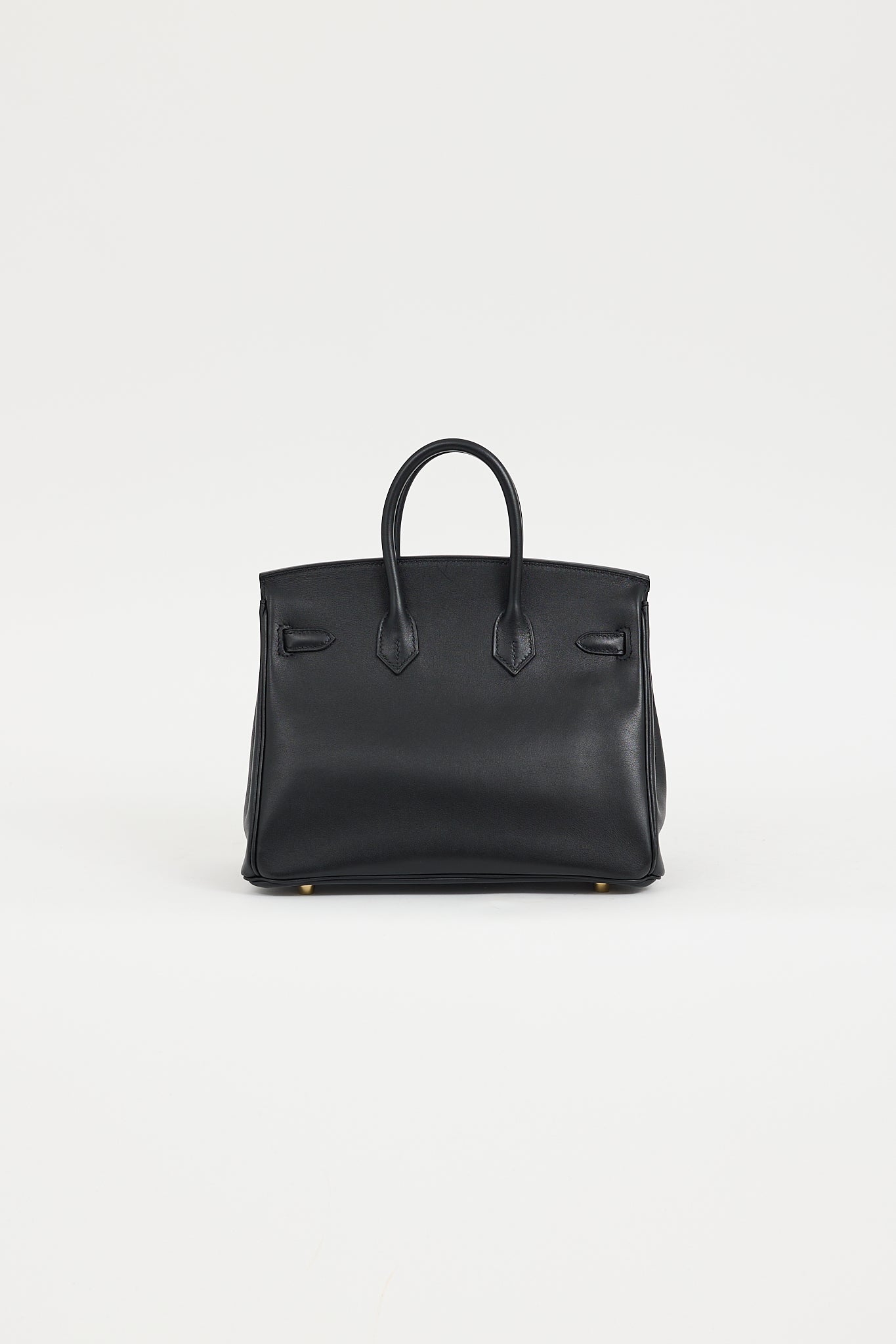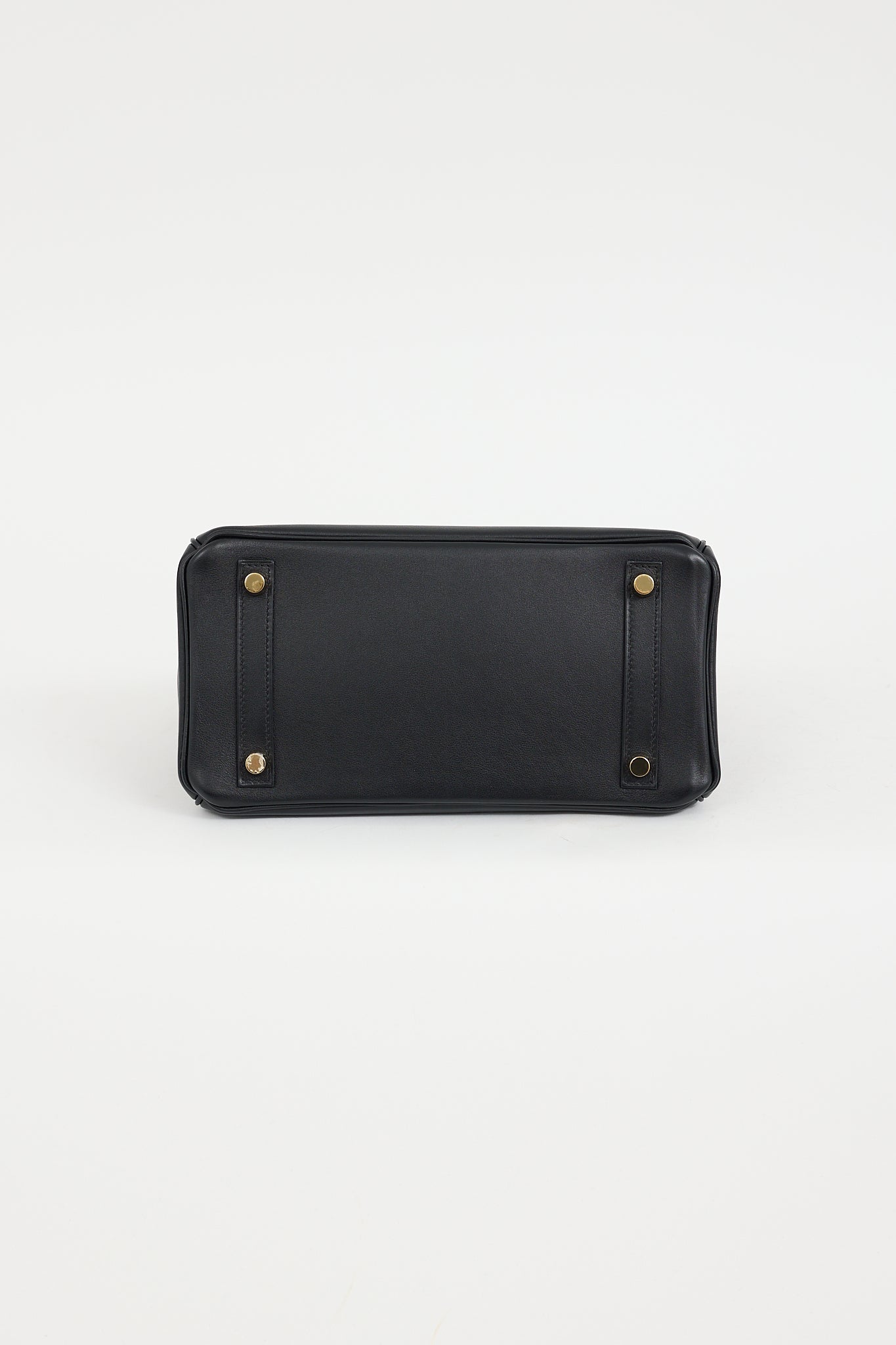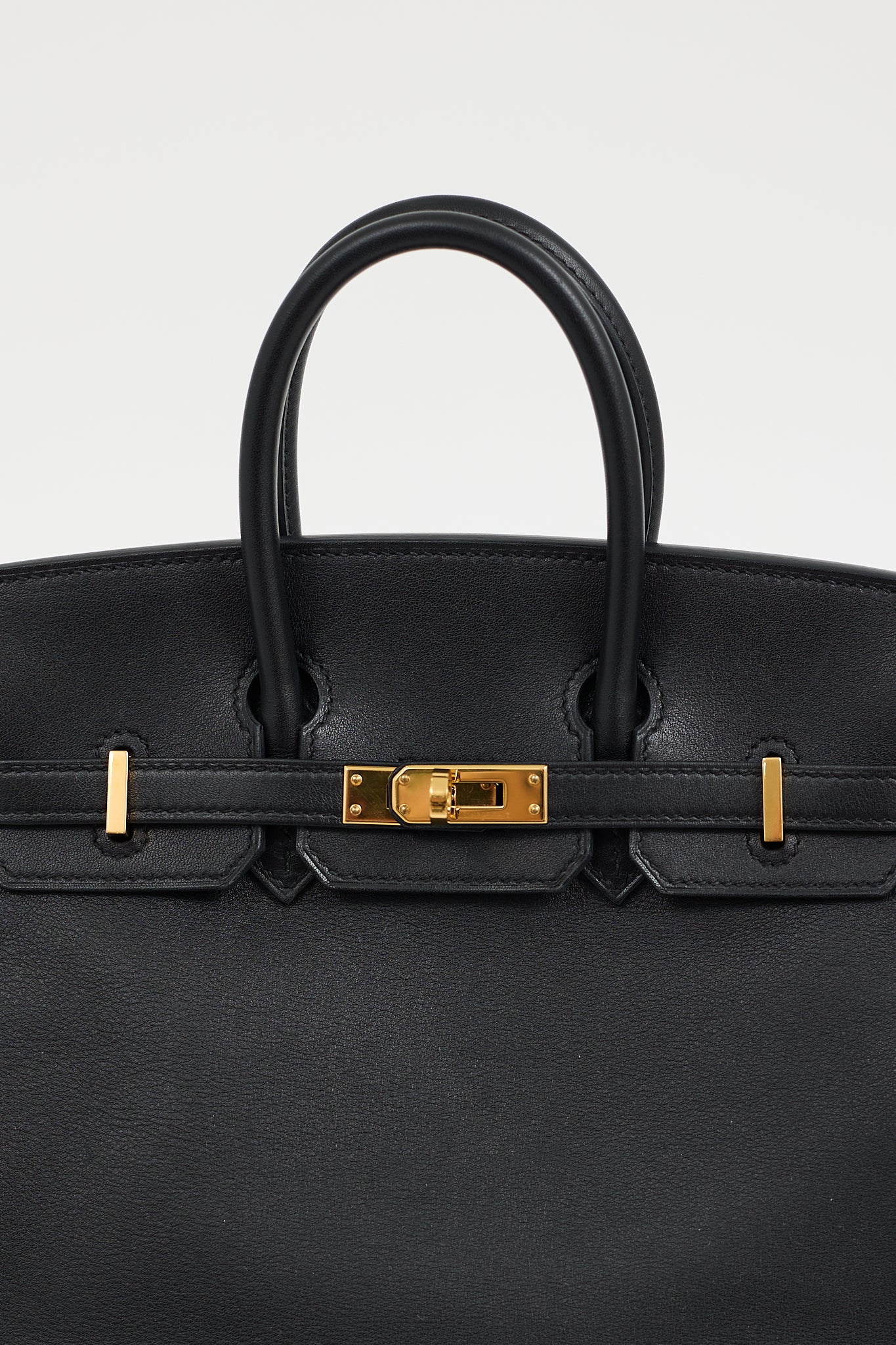 Pre-owned Hermès 2017 Birkin 25 bag in Noir featuring Swift leather, dual rolled top handles, gold plated Palladium hardware, sangles and pontet, detachable lock and clochette, signature twist lock touret closure, gold stamped logo under top flap, four clou, one main compartment, and one zip and slip pockets inside. Comes with original dust bag, box, rain cover, leather care booklet, and copy of original receipt.
