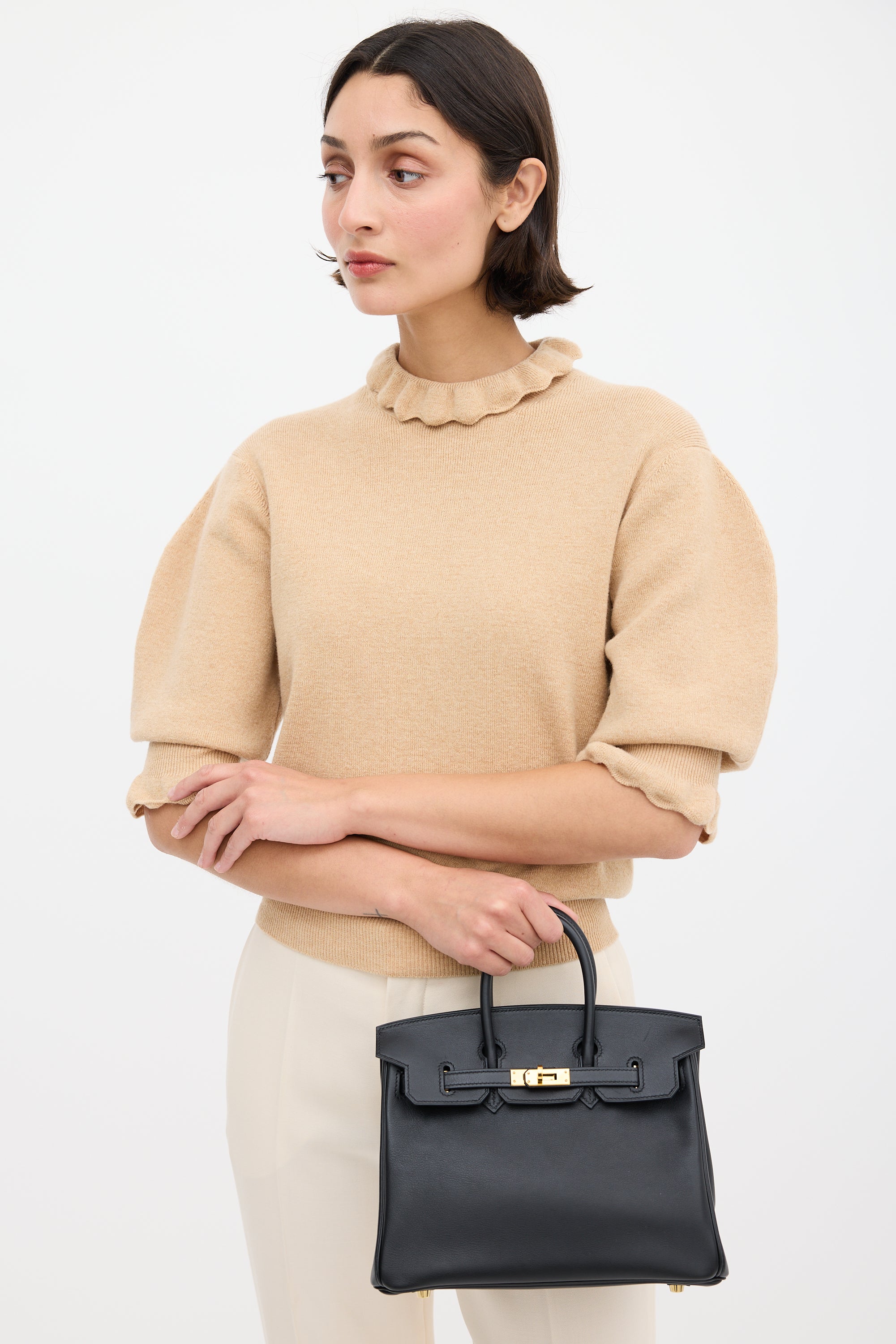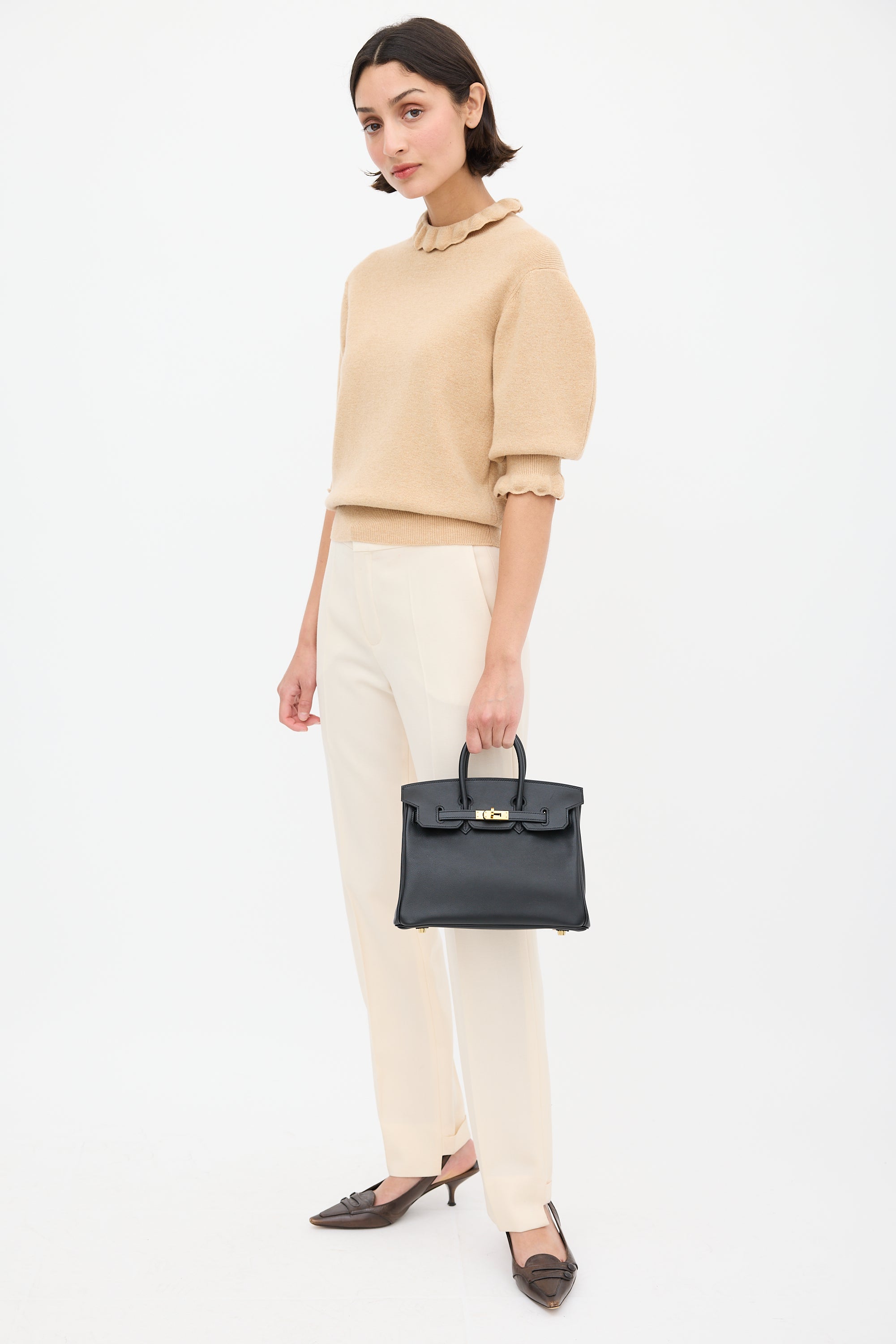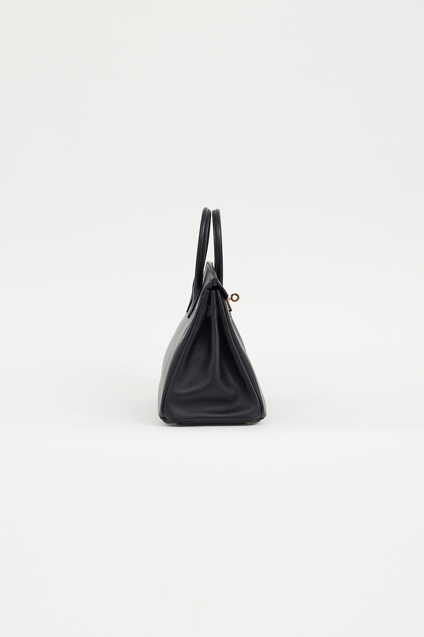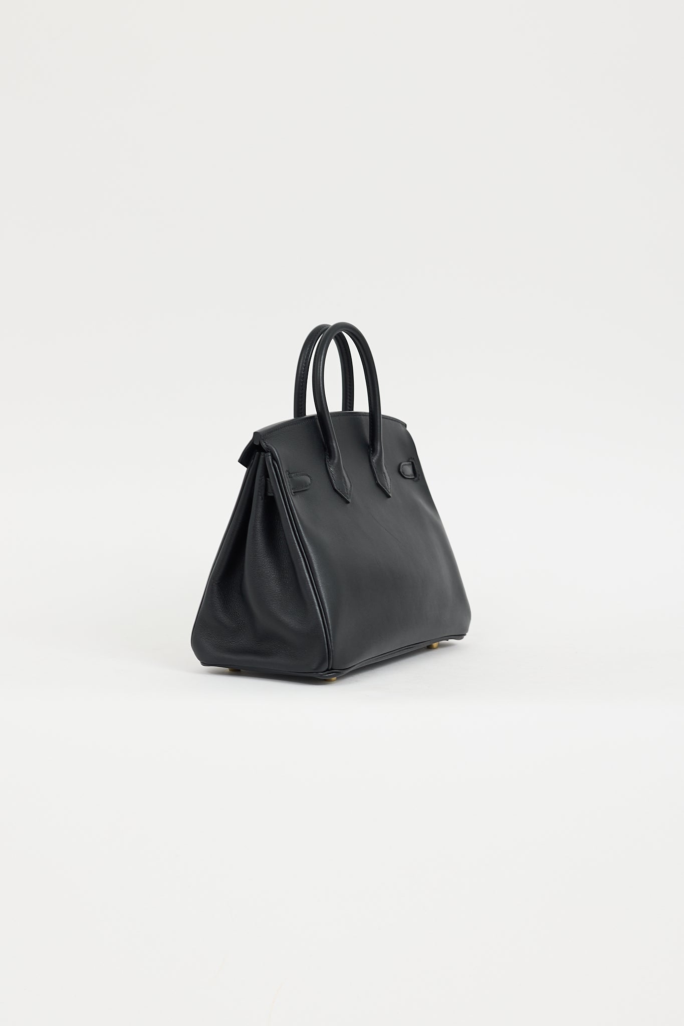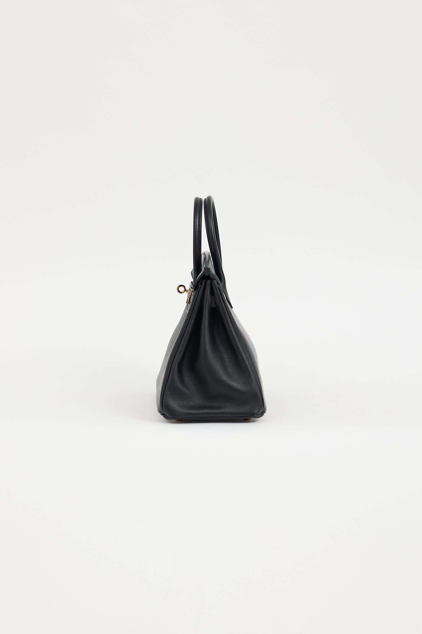 Pre-owned Hermès 2017 Birkin 25 bag in Noir featuring Swift leather, dual rolled top handles, gold plated Palladium hardware, sangles and pontet, detachable lock and clochette, signature twist lock touret closure, gold stamped logo under top flap, four clou, one main compartment, and one zip and slip pockets inside. Comes with original dust bag, box, rain cover, leather care booklet, and copy of original receipt.