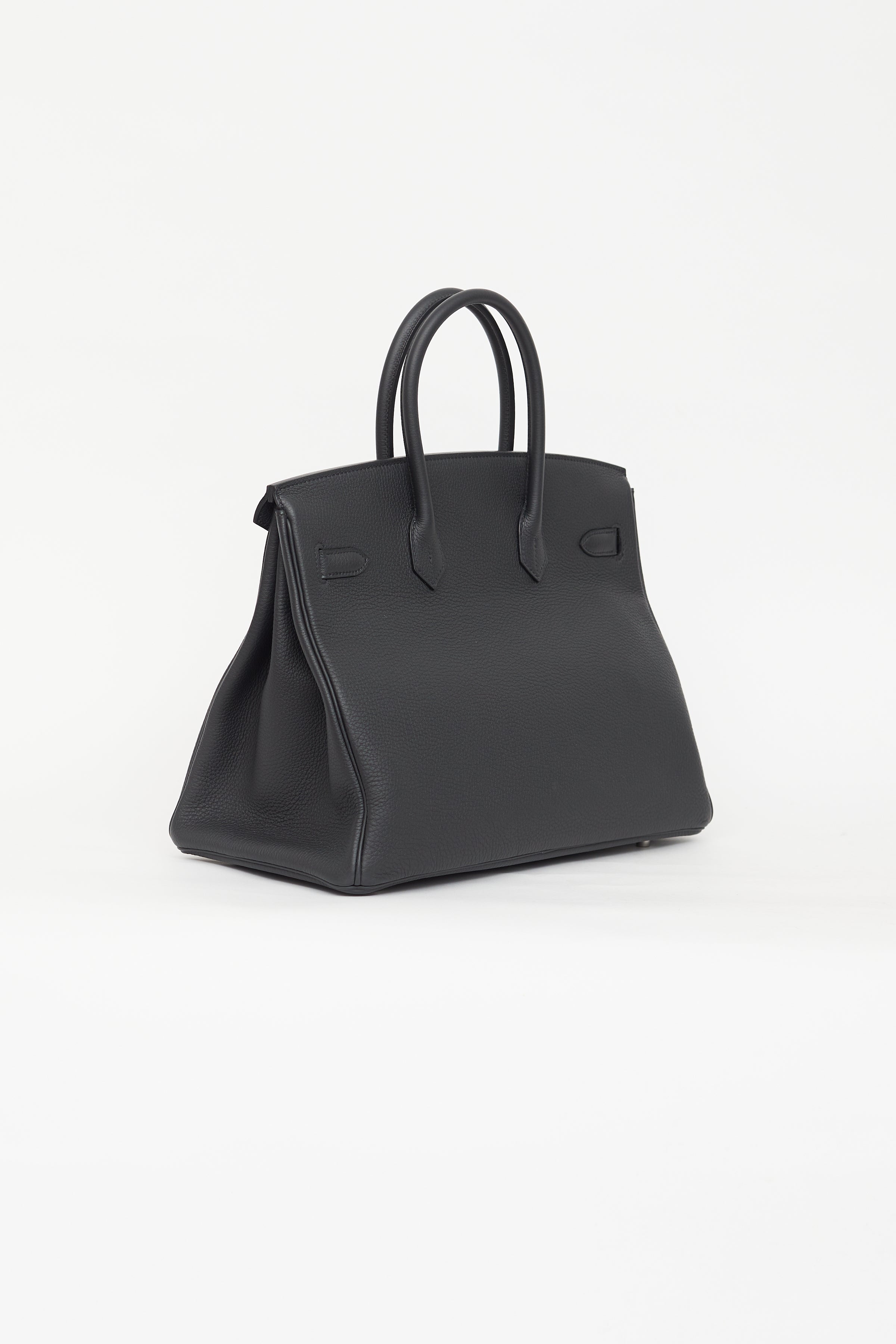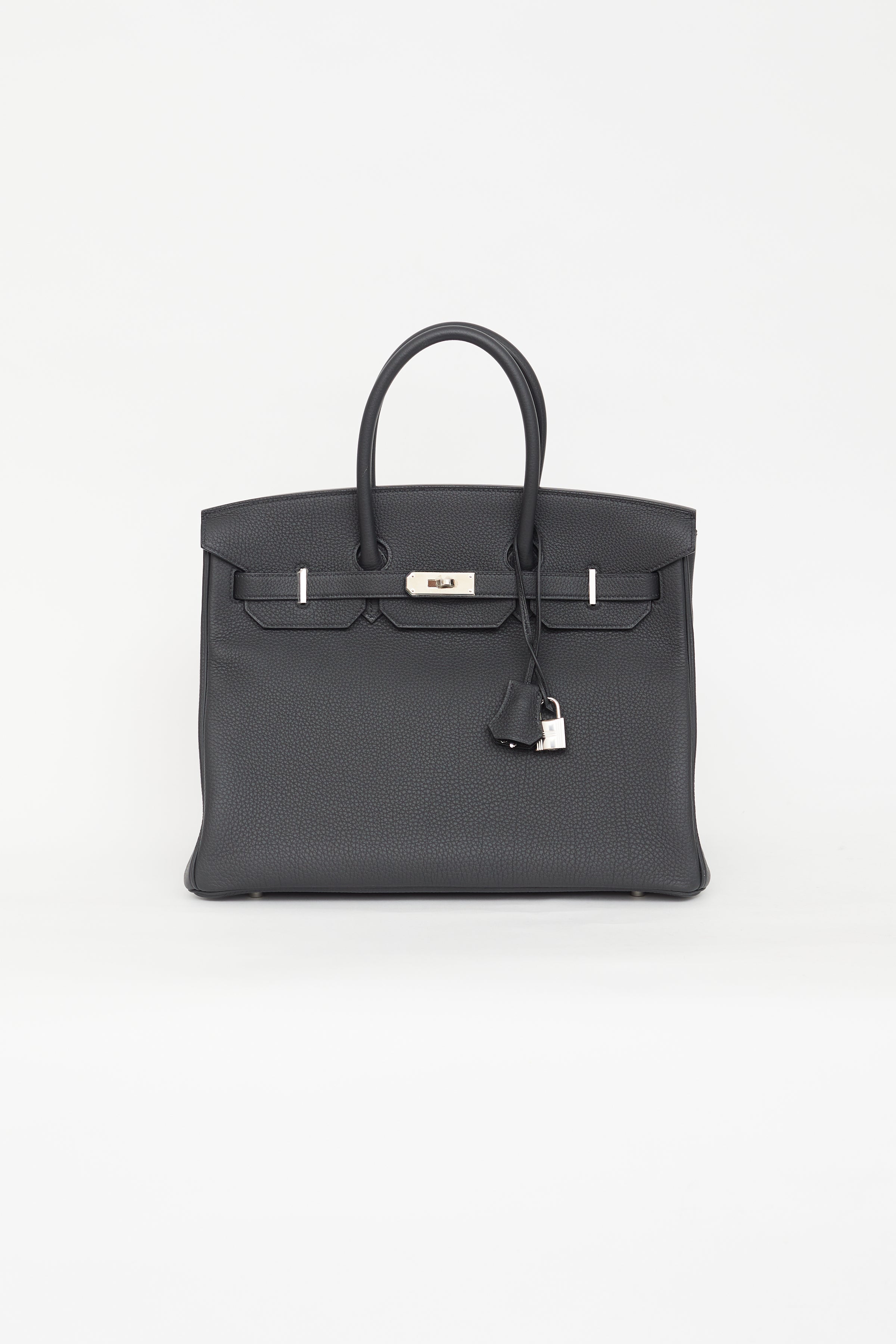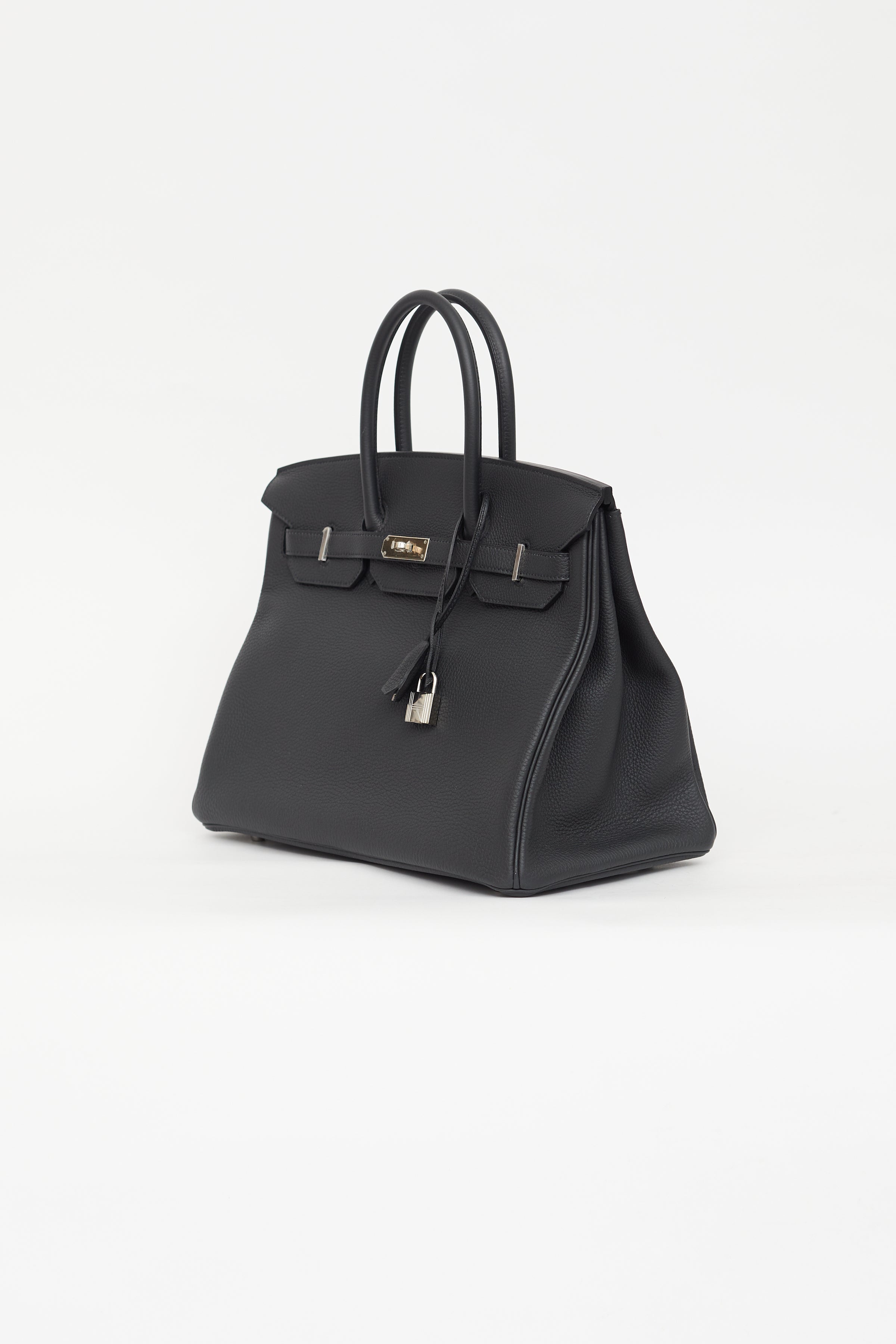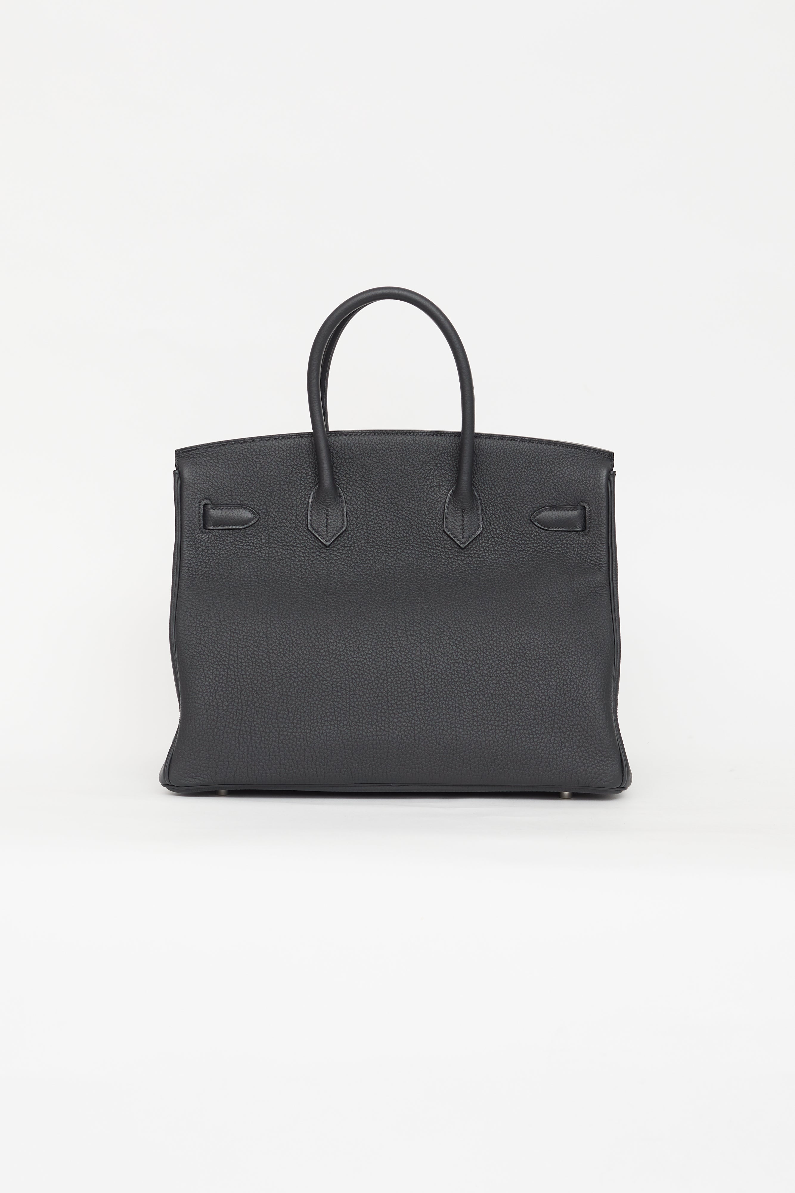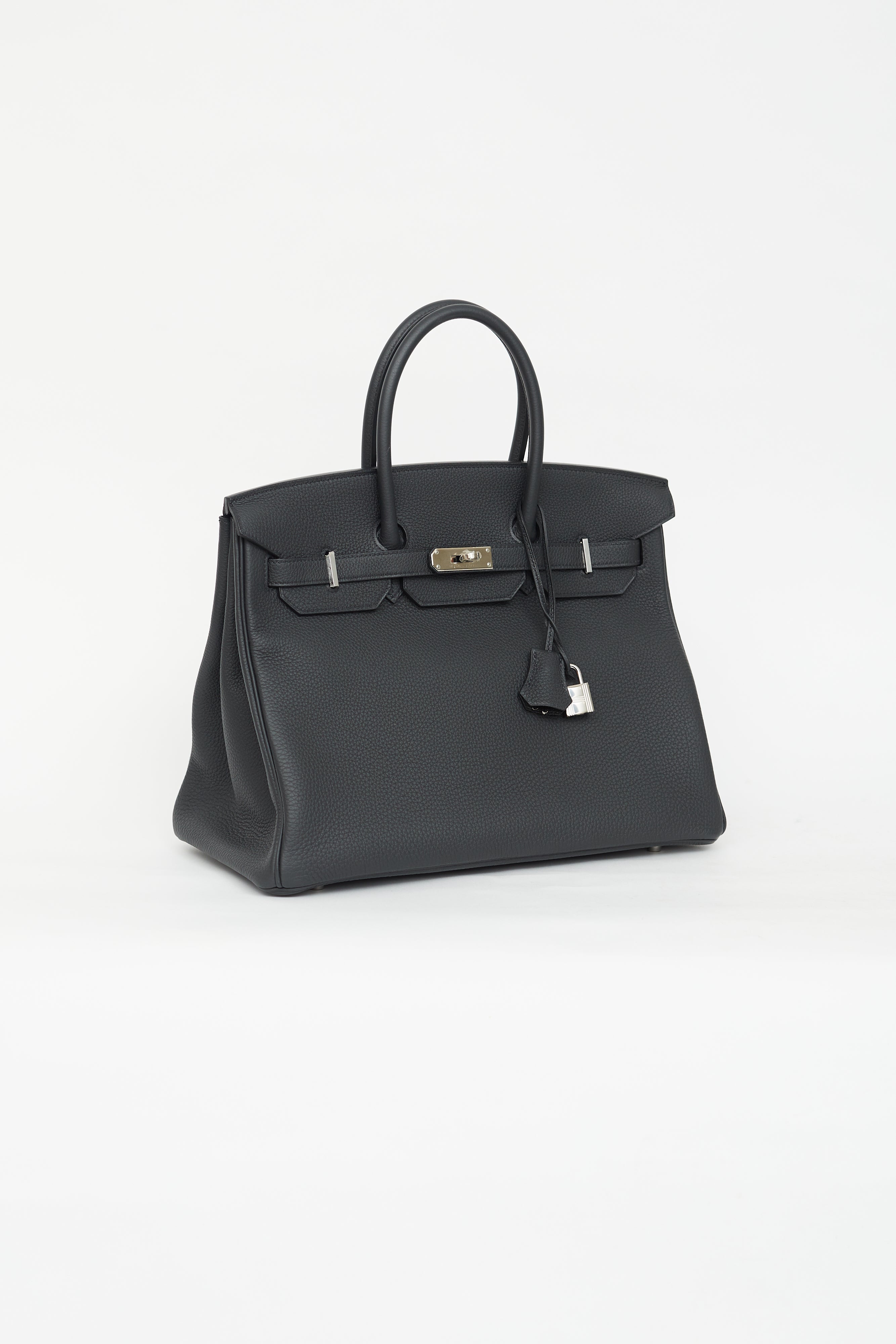 Pre-owned 2020 Hermès Birkin 35 bag in Bleu Nuit Togo leather featuring Palladium hardware, silver stamped logo under flap, rolled top handles, tonal leather interior, four clou, contrast stitching, logo engraved plaque, clochette and lock, and slip and zip pocket at interior. Comes with original dust bags, box, and rain cover.