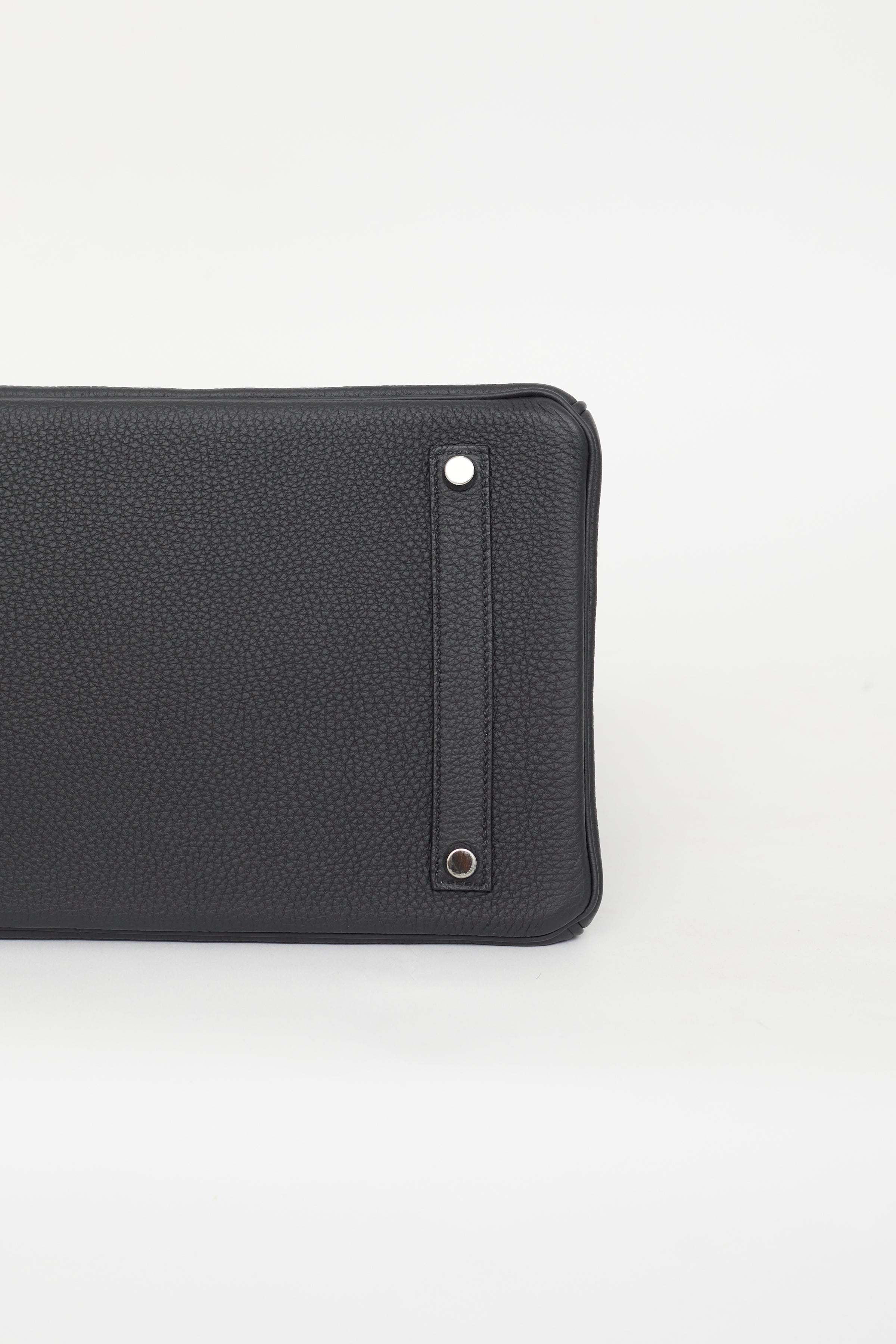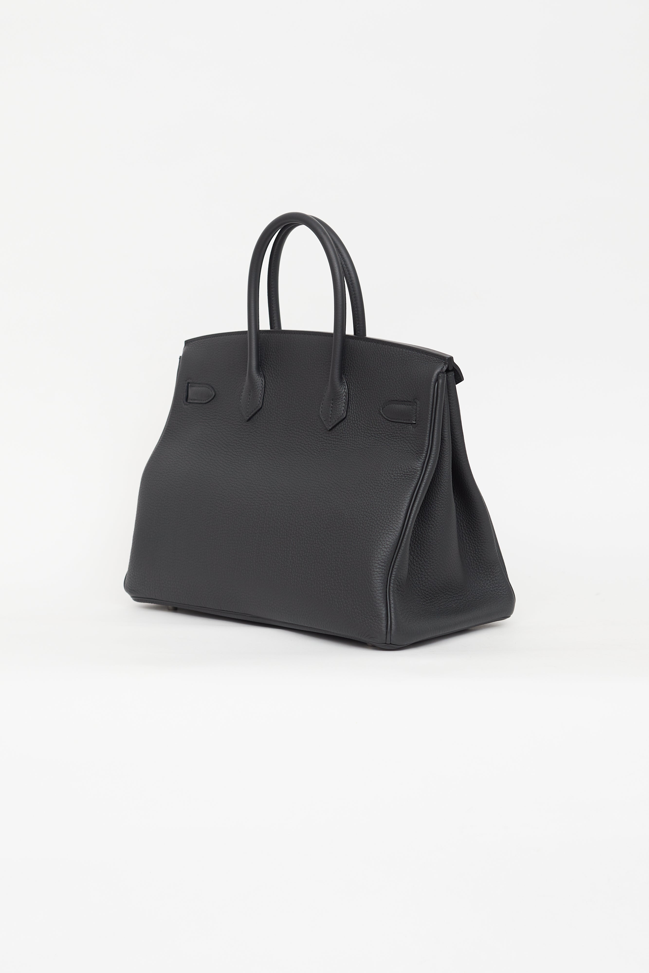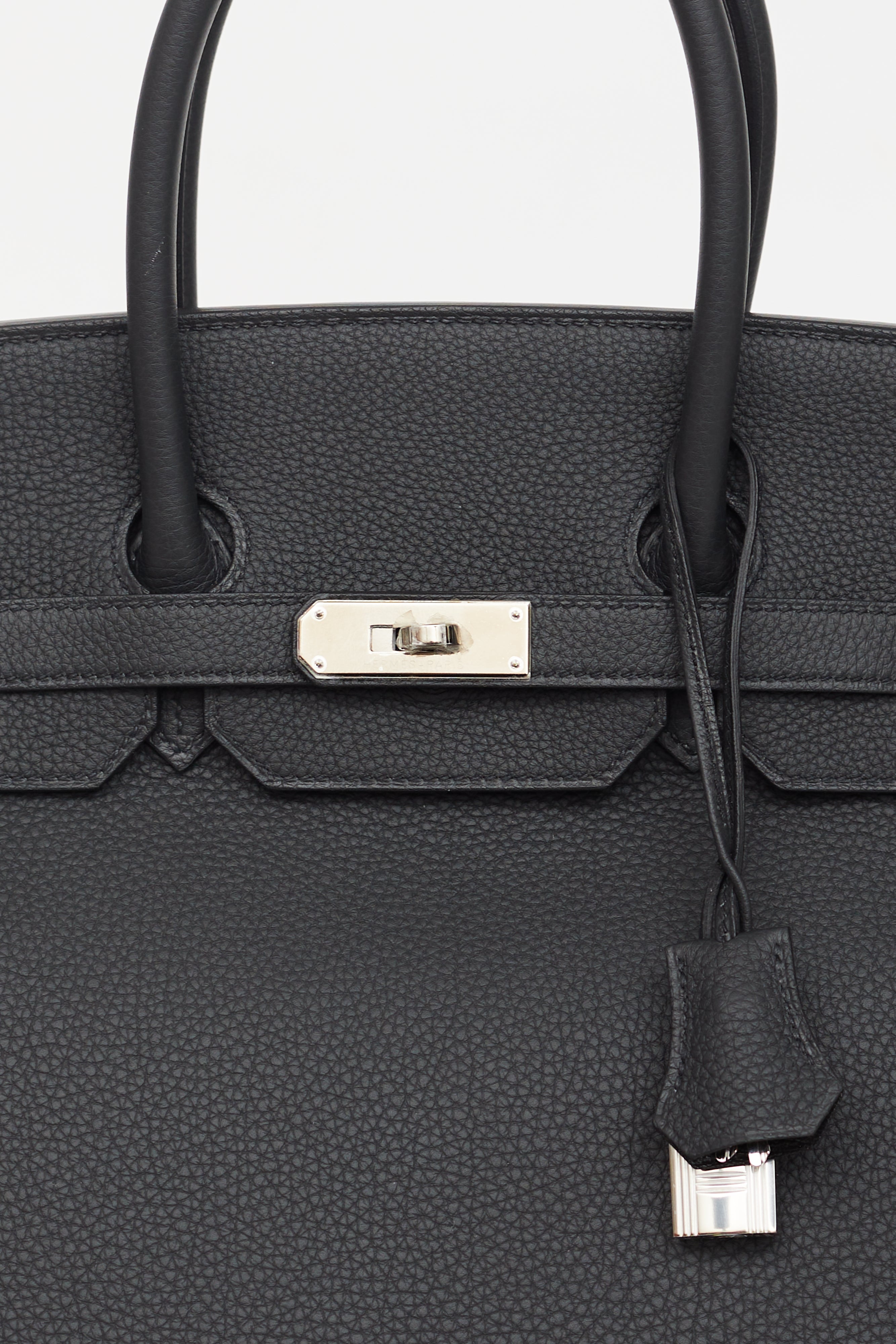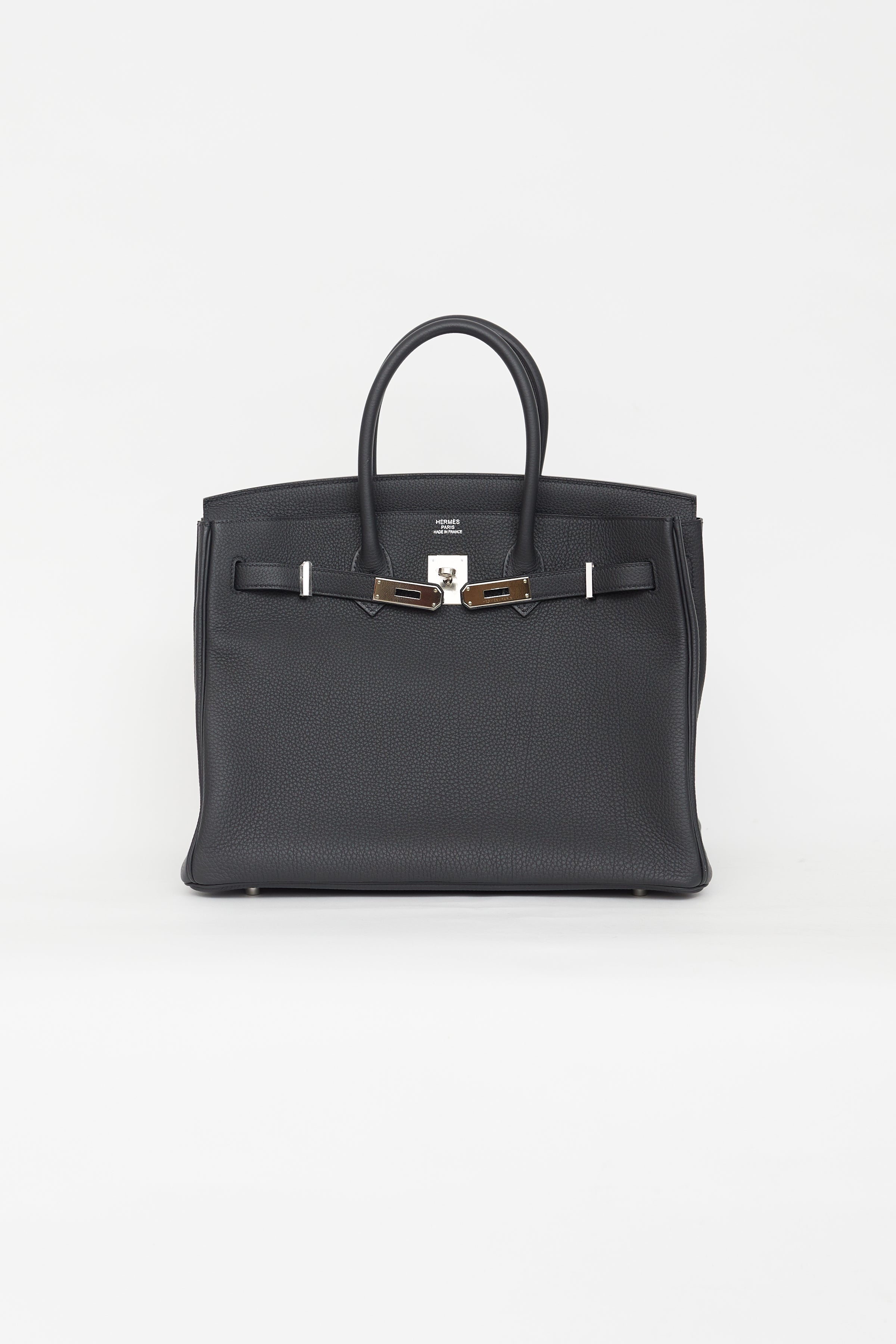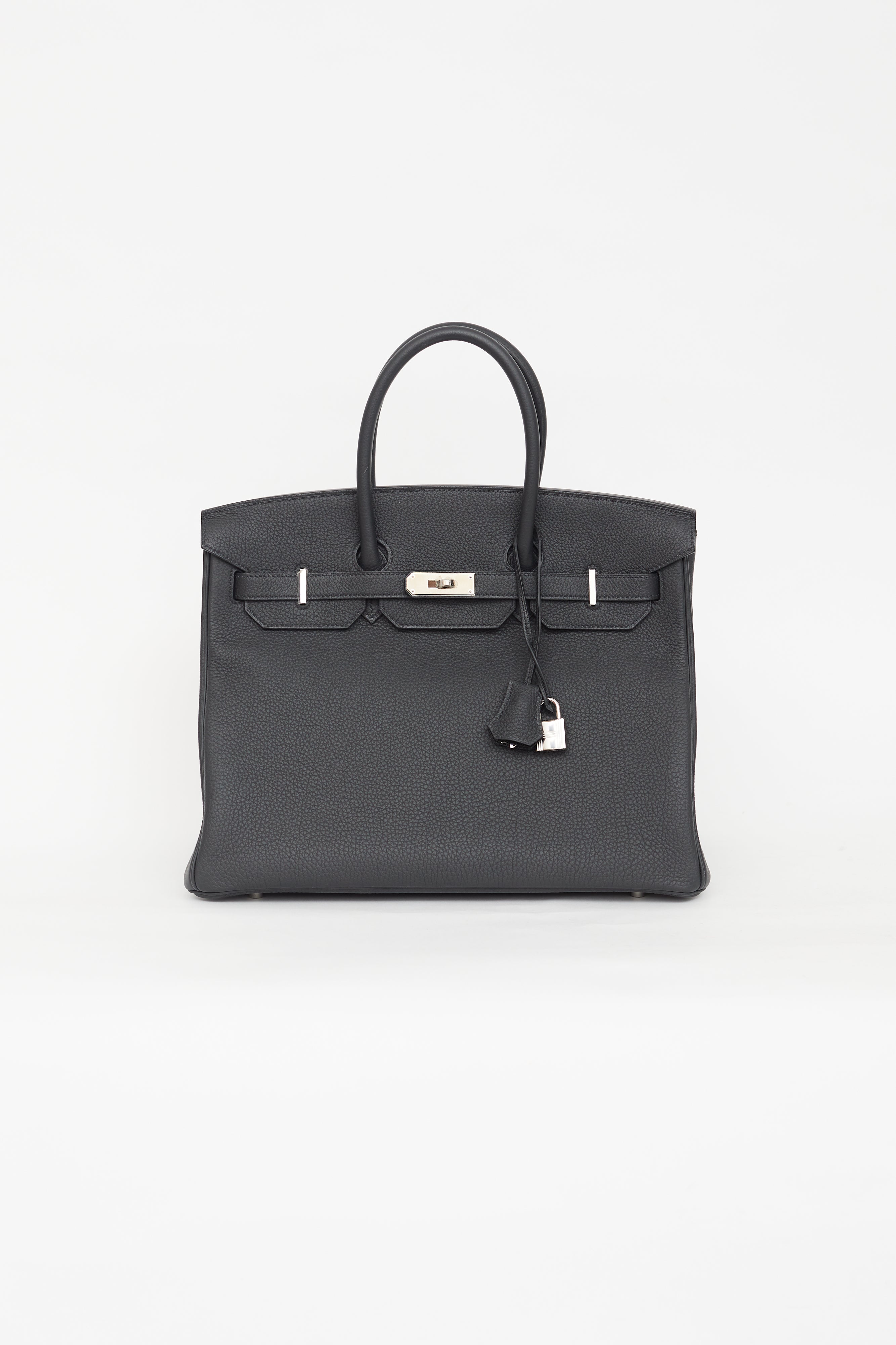 Pre-owned 2020 Hermès Birkin 35 bag in Bleu Nuit Togo leather featuring Palladium hardware, silver stamped logo under flap, rolled top handles, tonal leather interior, four clou, contrast stitching, logo engraved plaque, clochette and lock, and slip and zip pocket at interior. Comes with original dust bags, box, and rain cover.