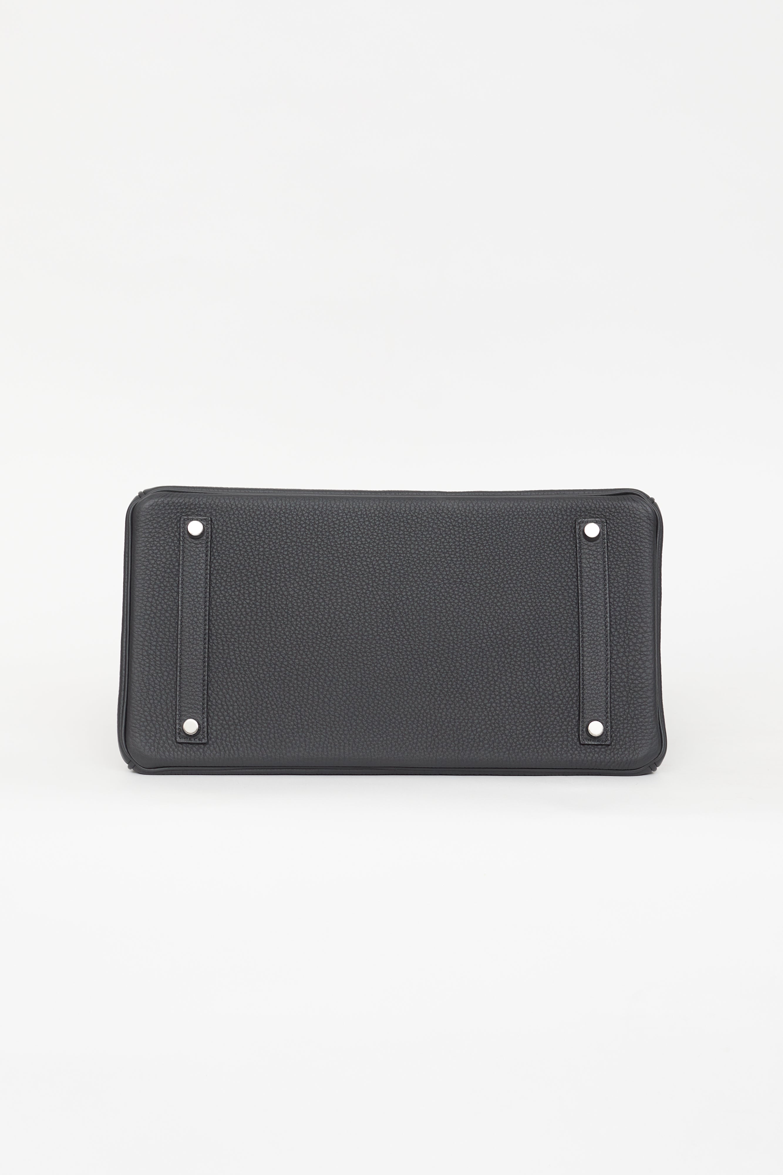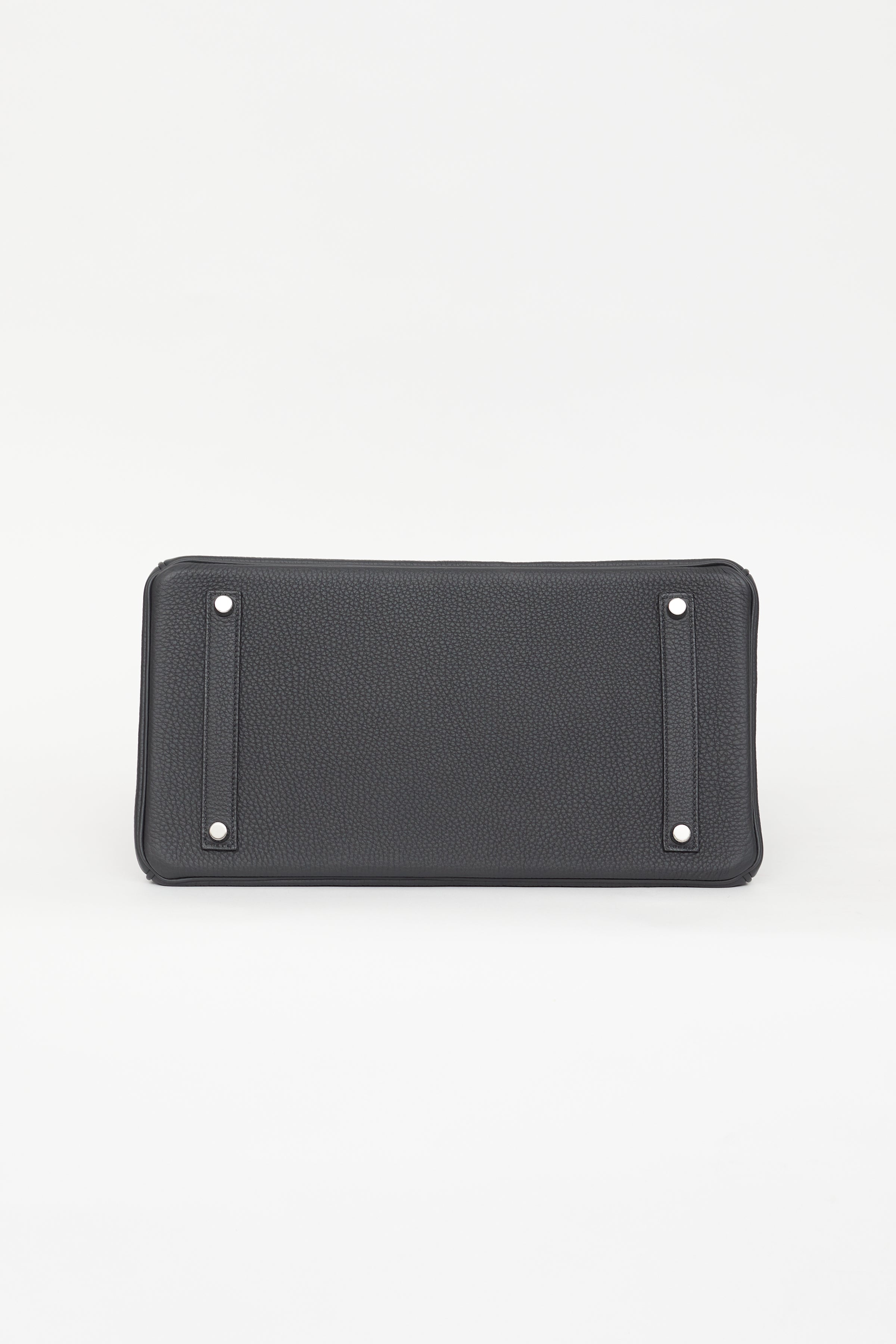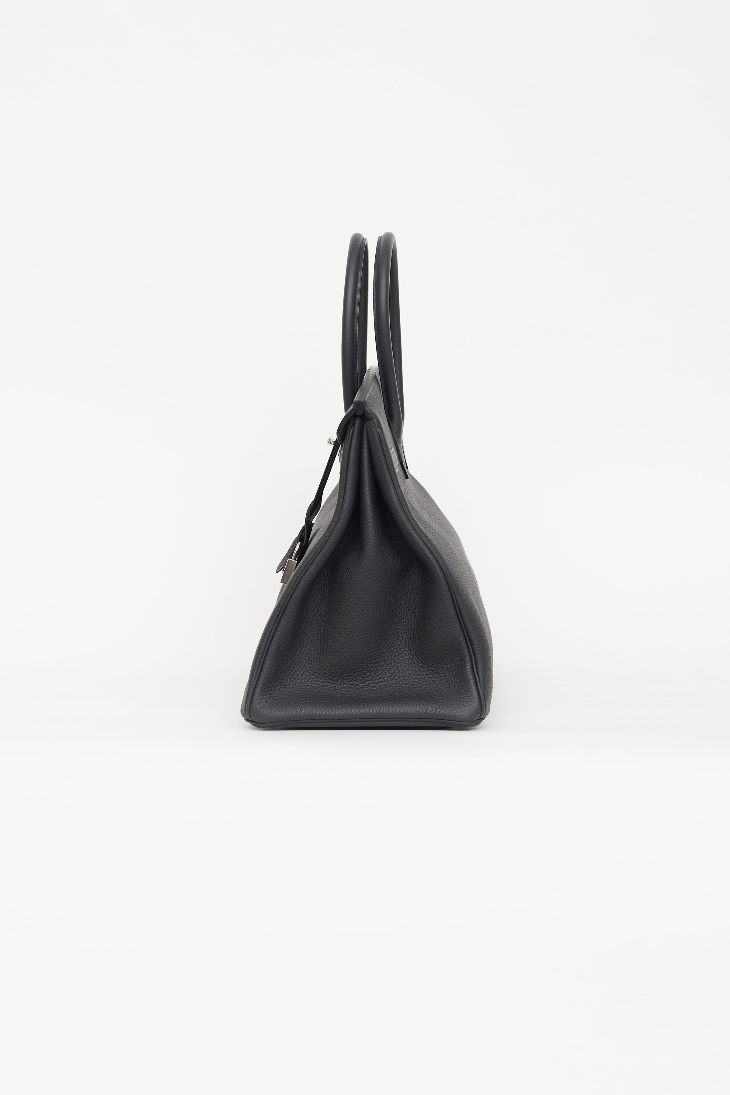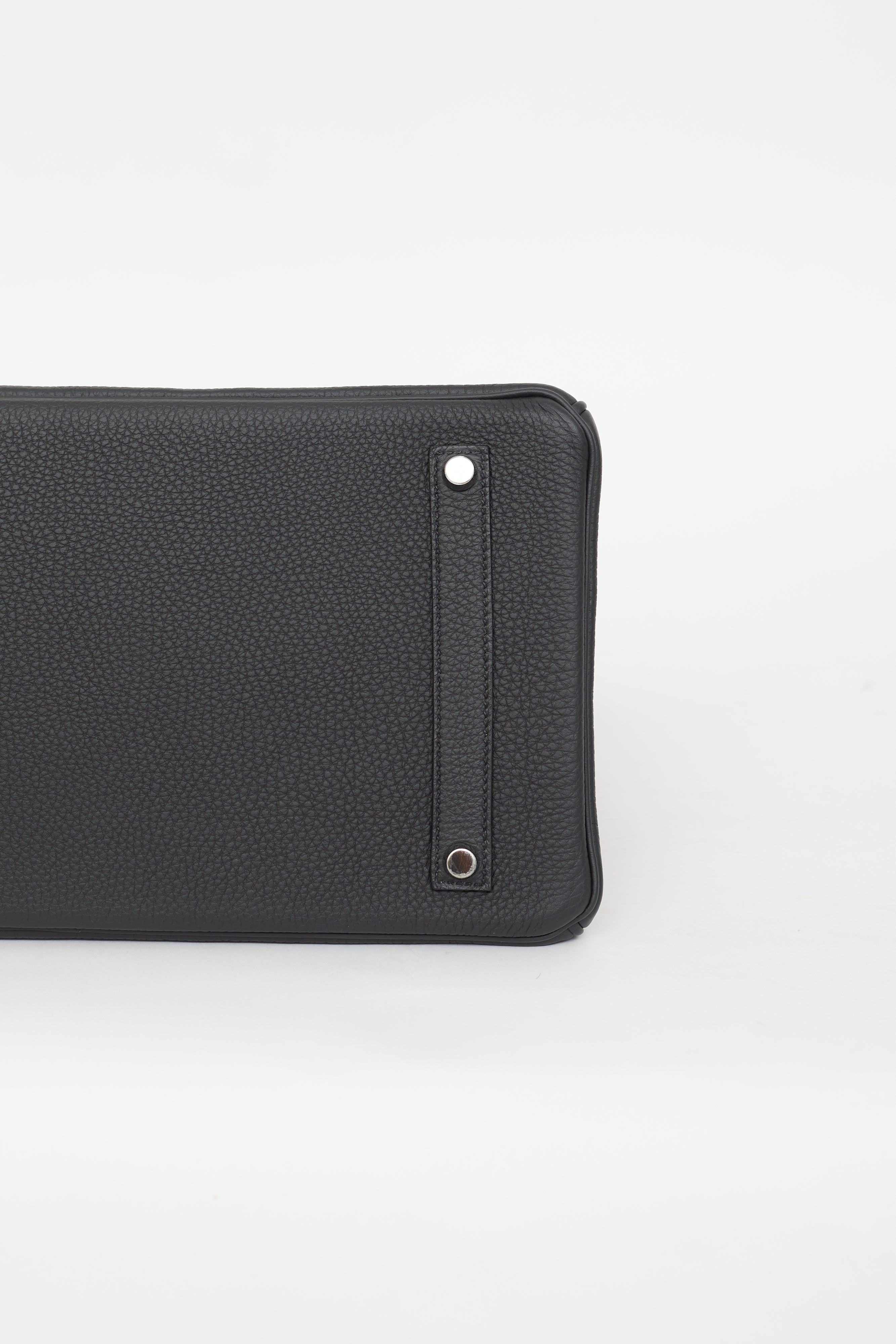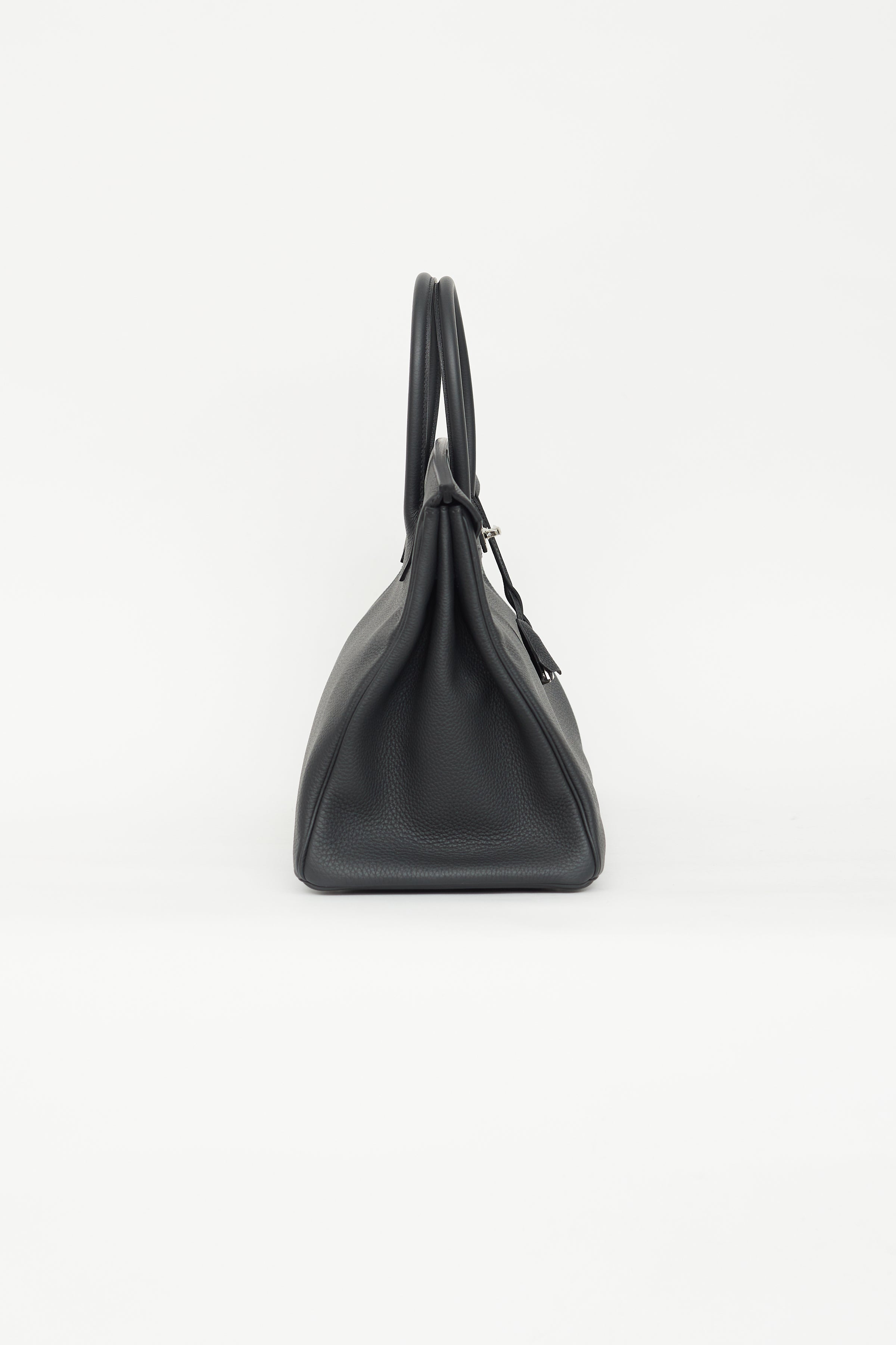 Pre-owned 2020 Hermès Birkin 35 bag in Bleu Nuit Togo leather featuring Palladium hardware, silver stamped logo under flap, rolled top handles, tonal leather interior, four clou, contrast stitching, logo engraved plaque, clochette and lock, and slip and zip pocket at interior. Comes with original dust bags, box, and rain cover.