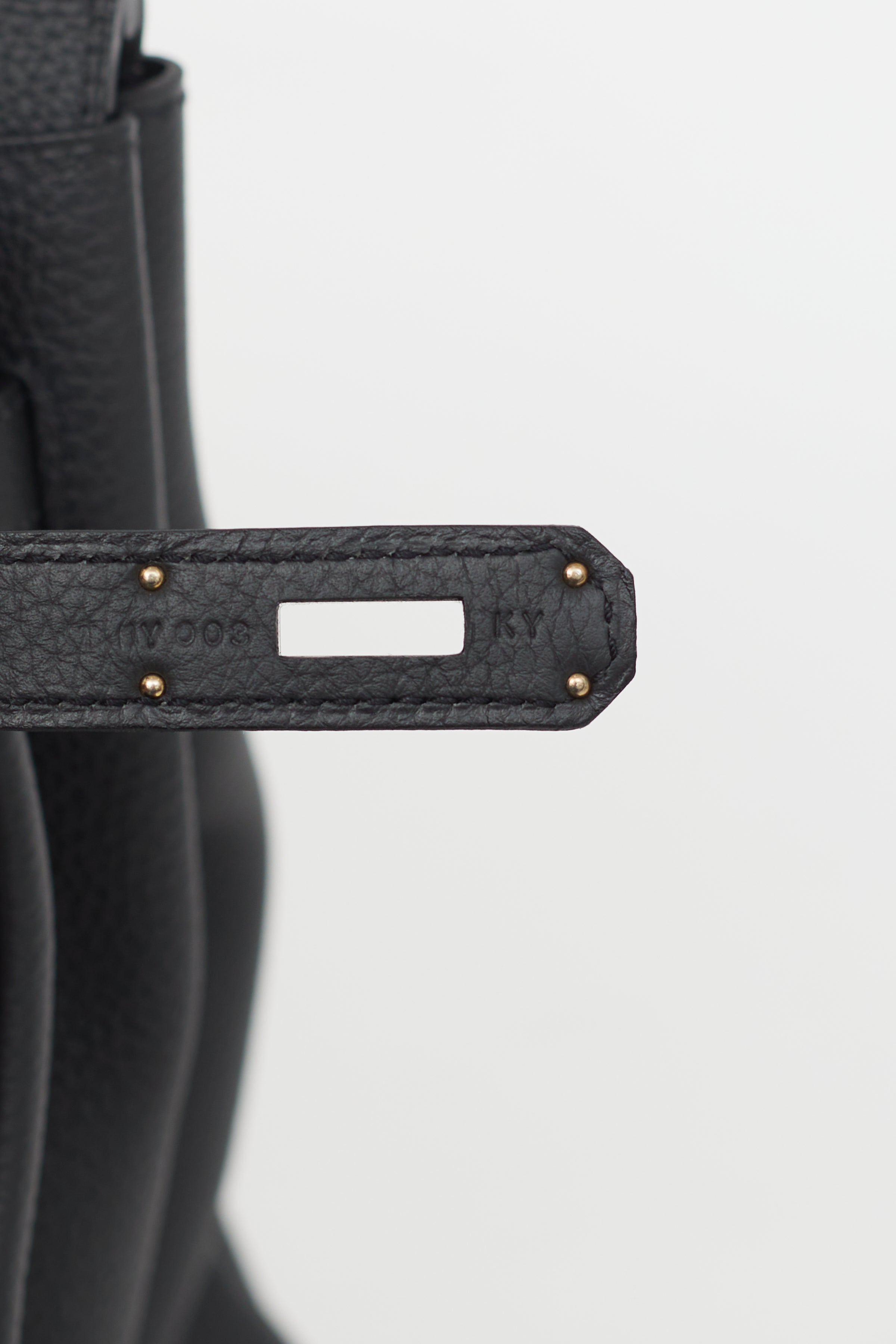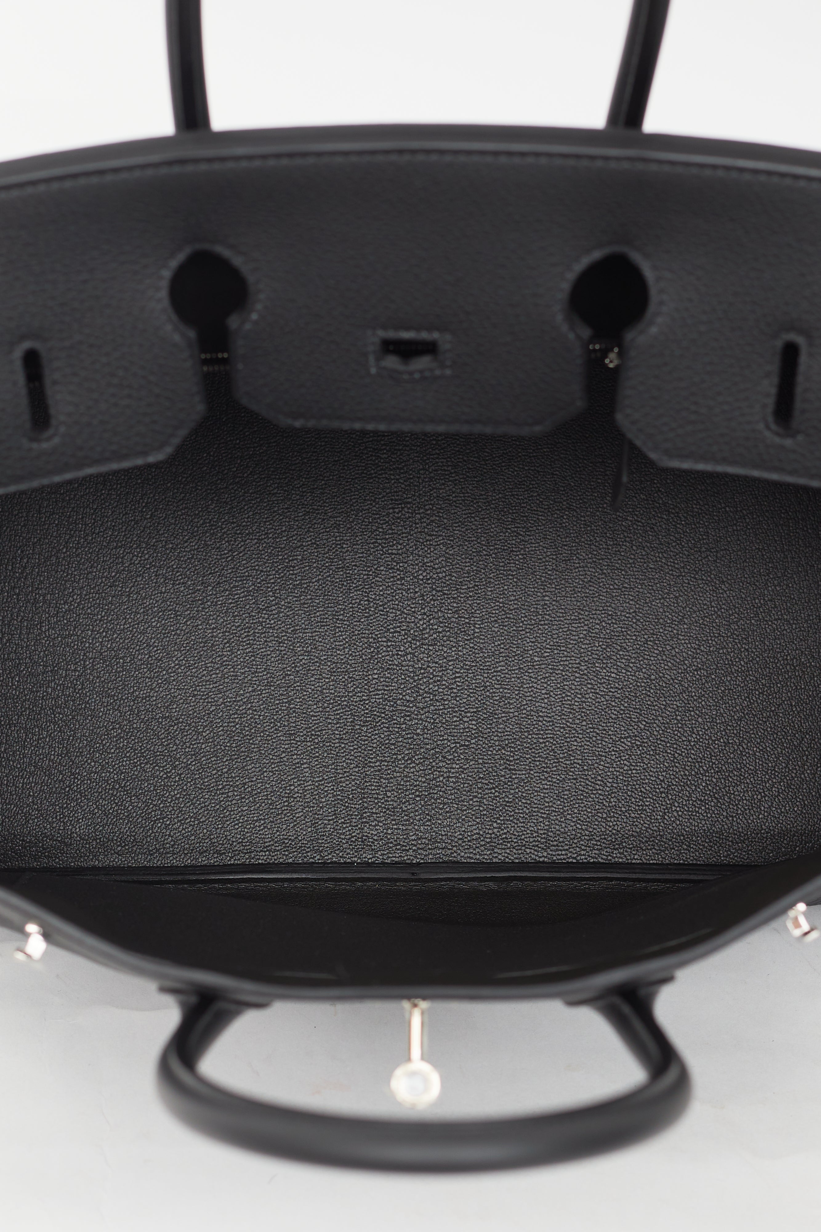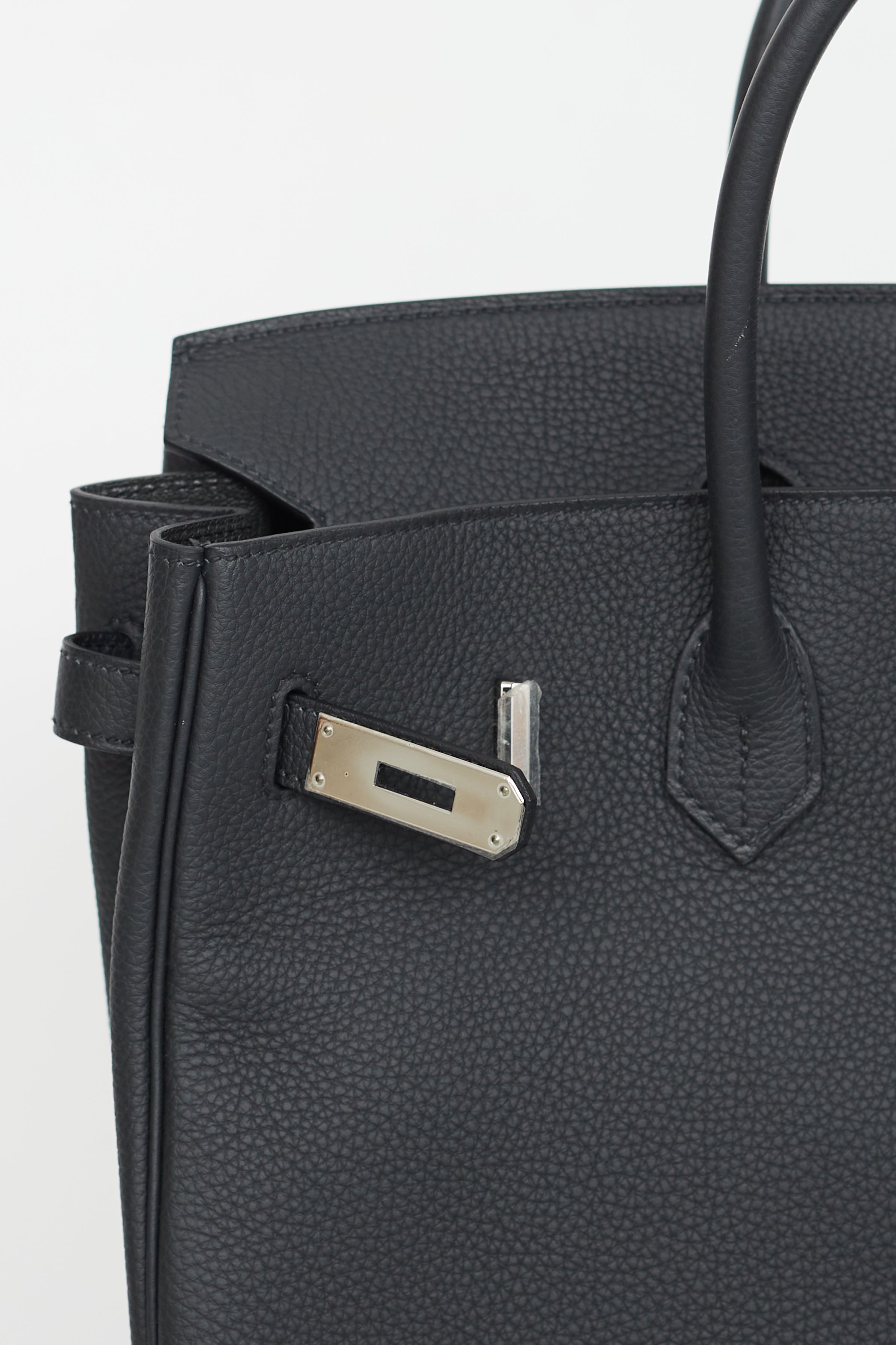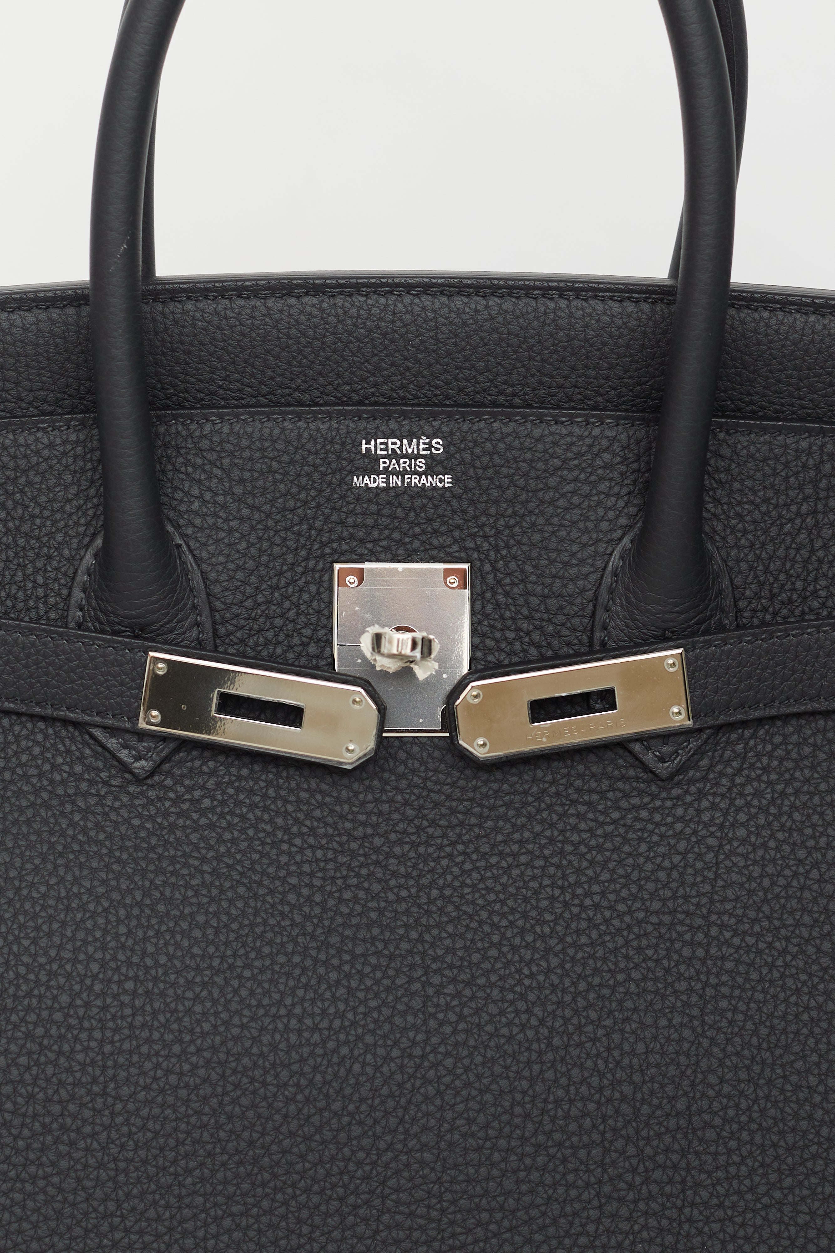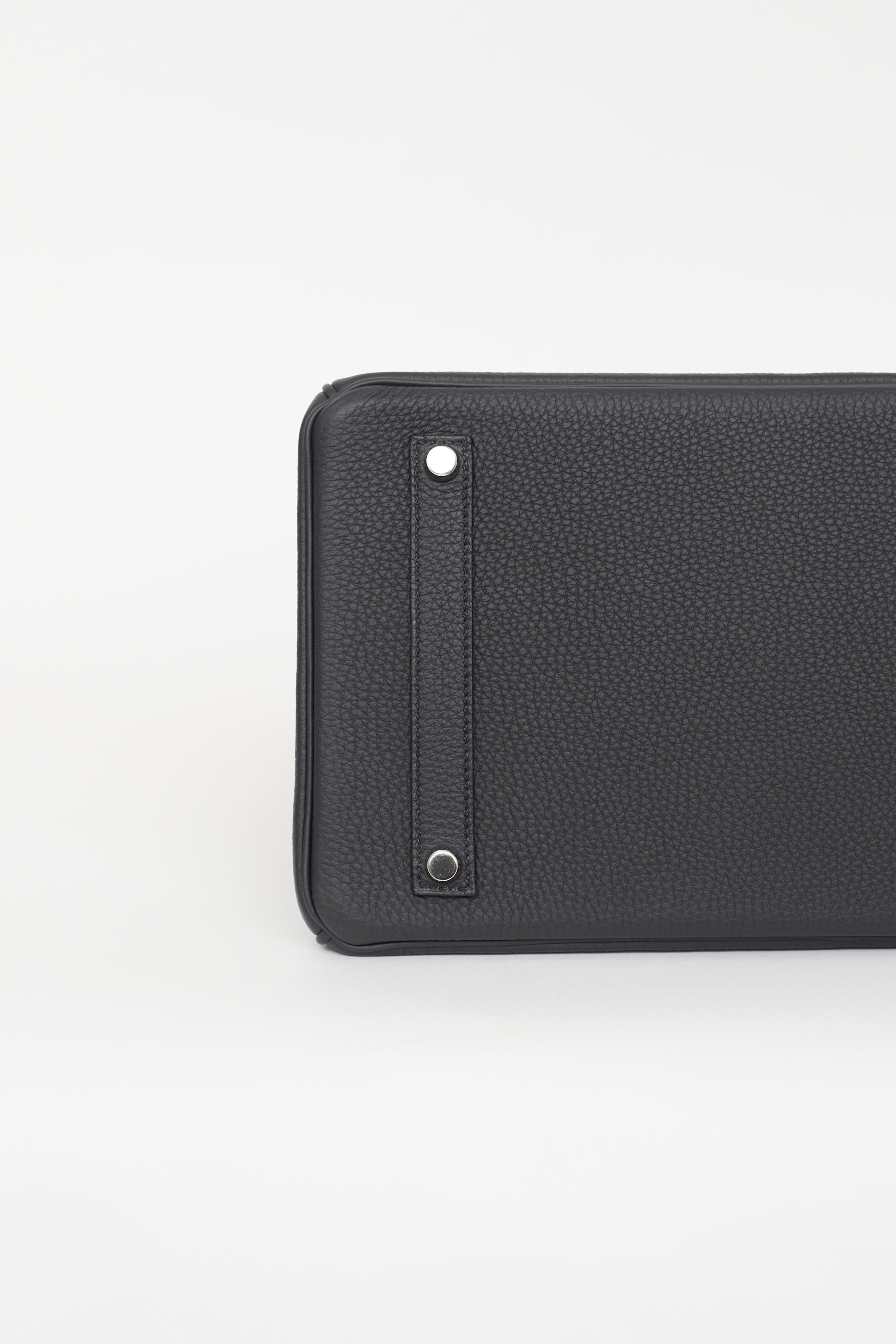 Pre-owned 2020 Hermès Birkin 35 bag in Bleu Nuit Togo leather featuring Palladium hardware, silver stamped logo under flap, rolled top handles, tonal leather interior, four clou, contrast stitching, logo engraved plaque, clochette and lock, and slip and zip pocket at interior. Comes with original dust bags, box, and rain cover.