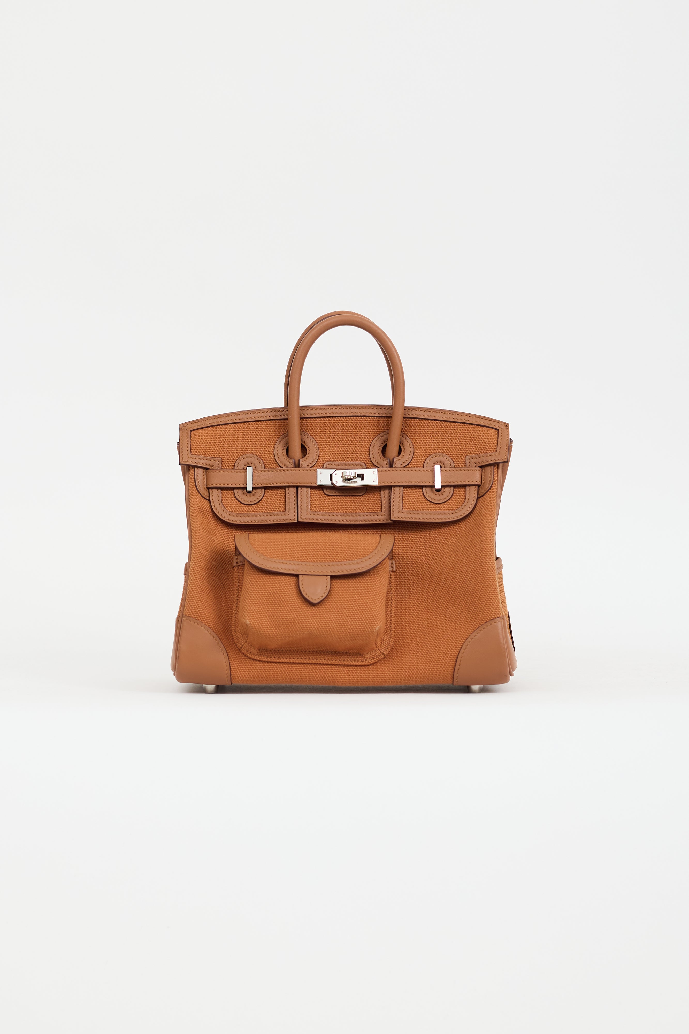 Pre-owned Hermès 2022 Birkin Cargo 25 bag in Gold featuring Toile Goeland exterior, Swift leather trim, dual rolled top handles, Palladium hardware, top flap with signature touret closure and sangles, detachable lock and clochette, snap buttoned pocket at front with cardholder inside, four slip pockets at sides, one cardholder pocket at back, silver stamped logo under top flap, and one main compartment. Comes with original dust bags and box.