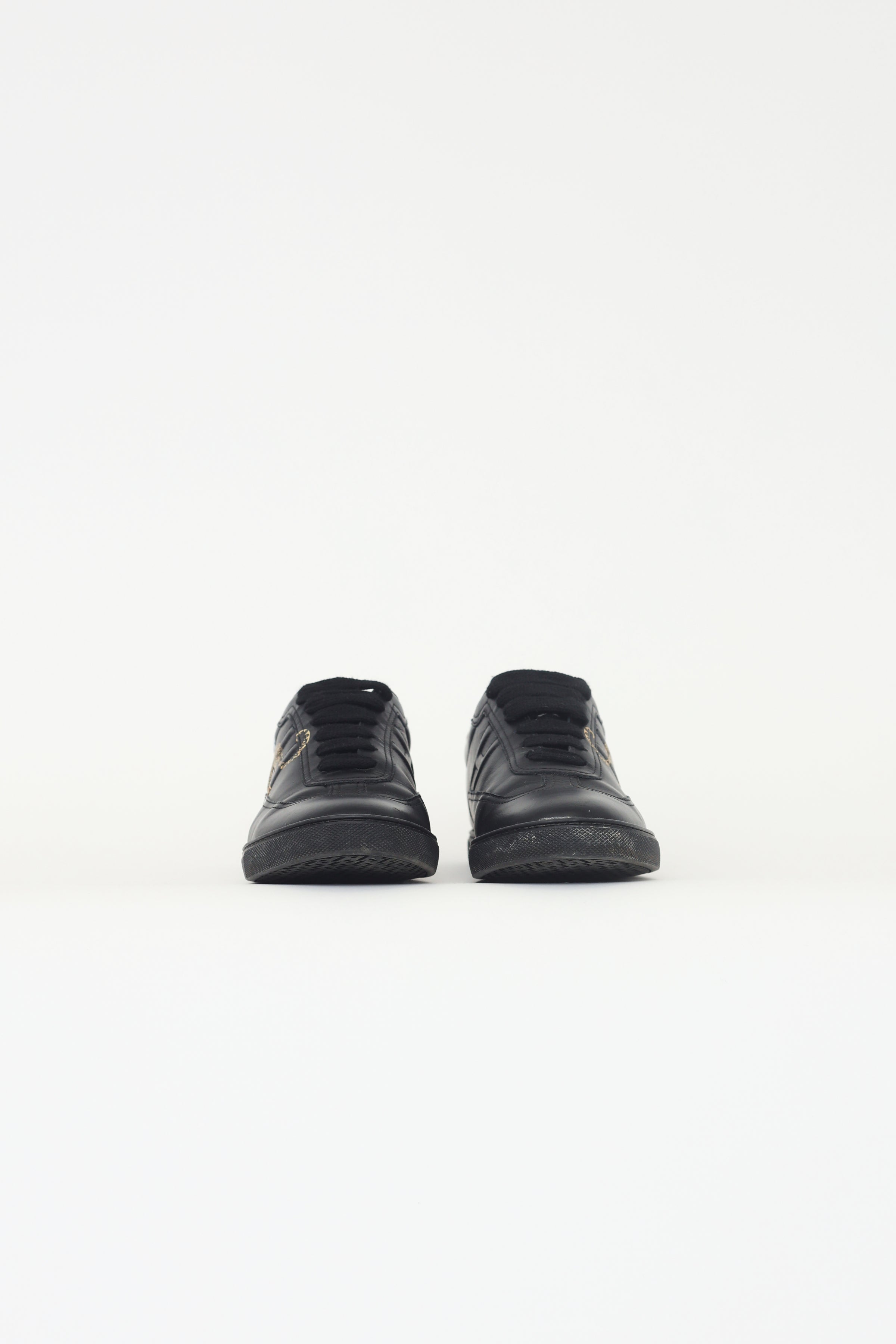 Pre-owned Hermès Quicker Jungle Love sneakers in black featuring black calfskin upper with "Jungle Love" print, iconic "H" detail quilted on outer and inner sides, rounded toe, lace up vamp, brown leather back tab, rubber midsole and outsole.