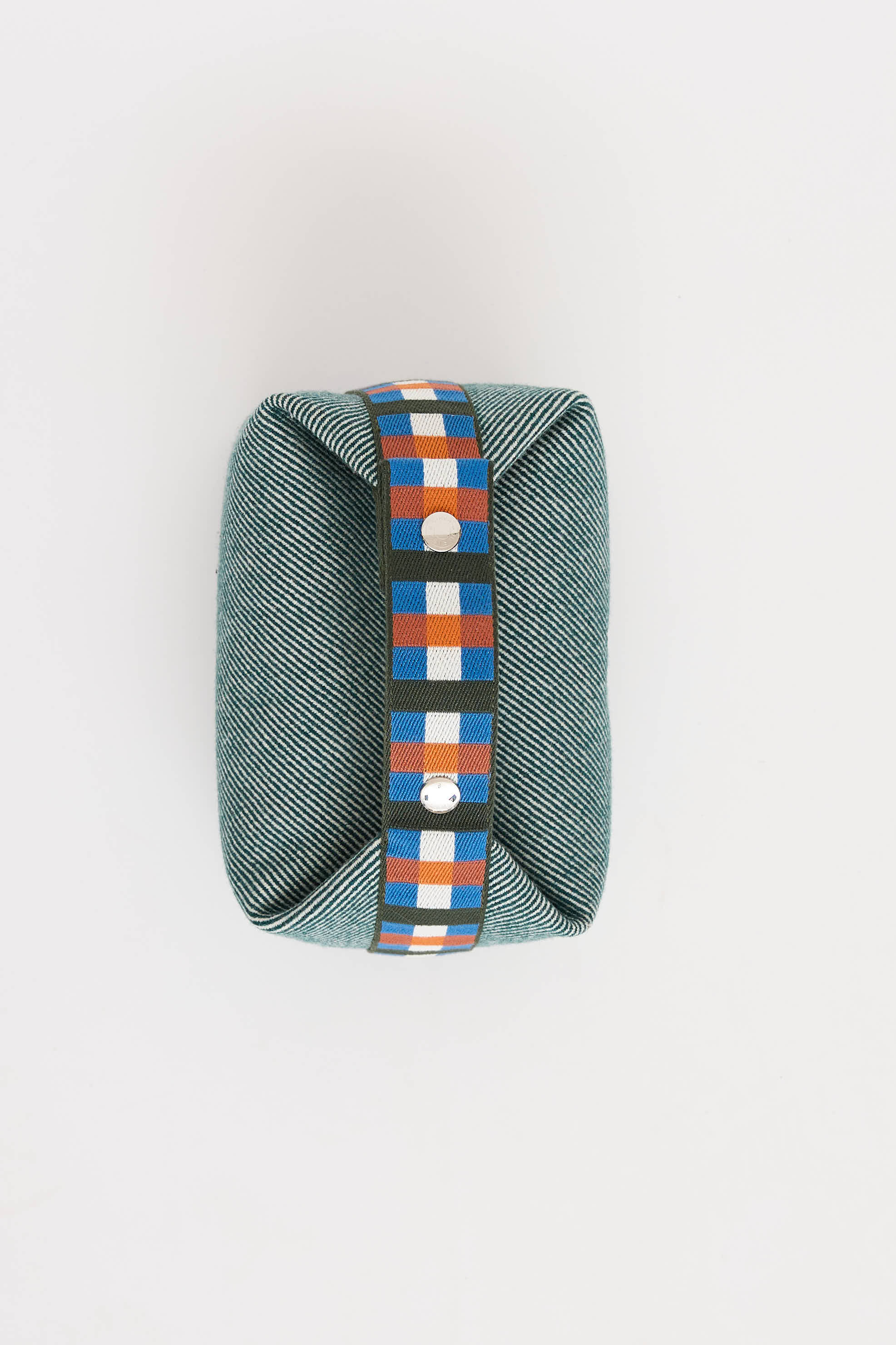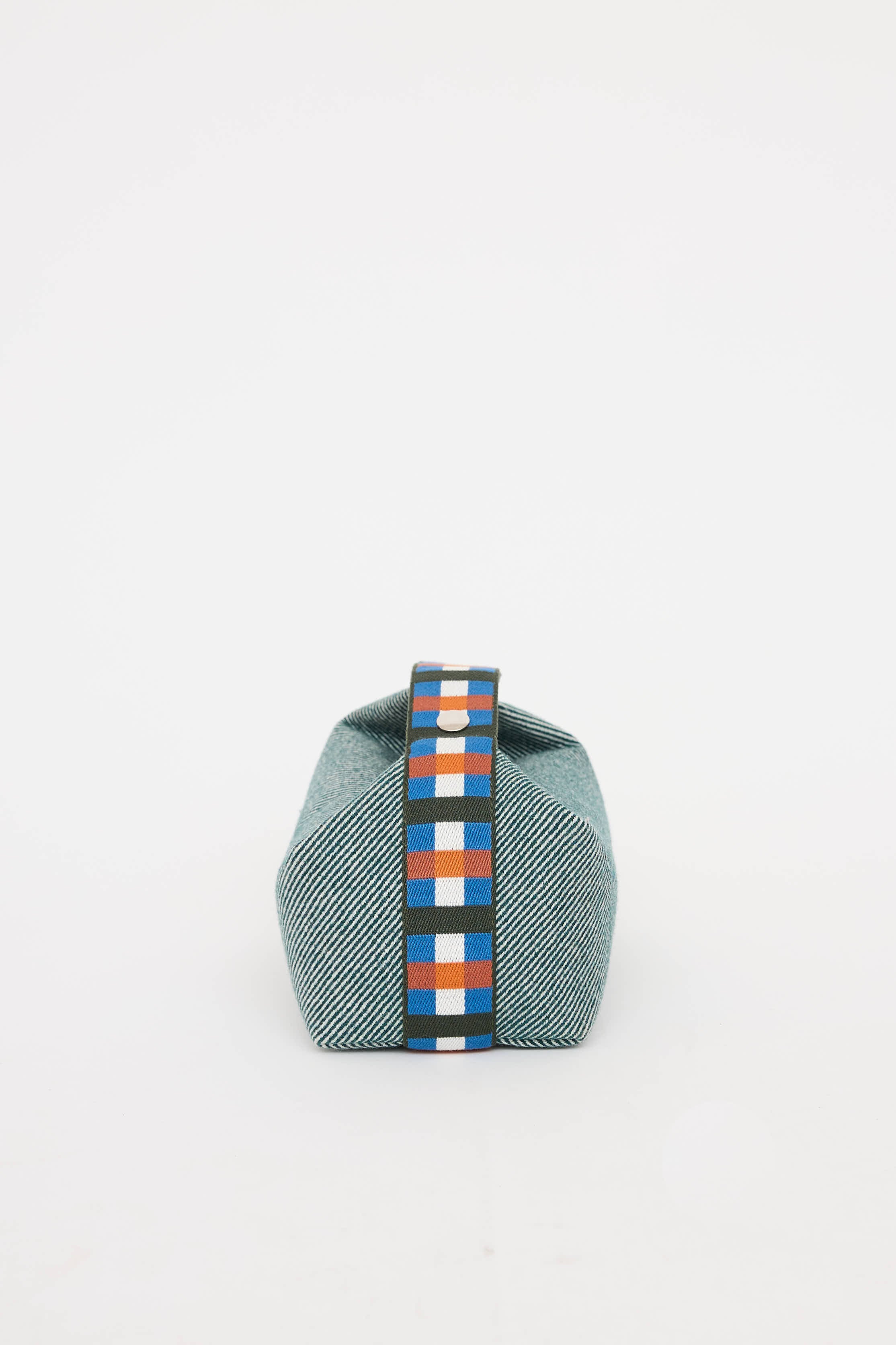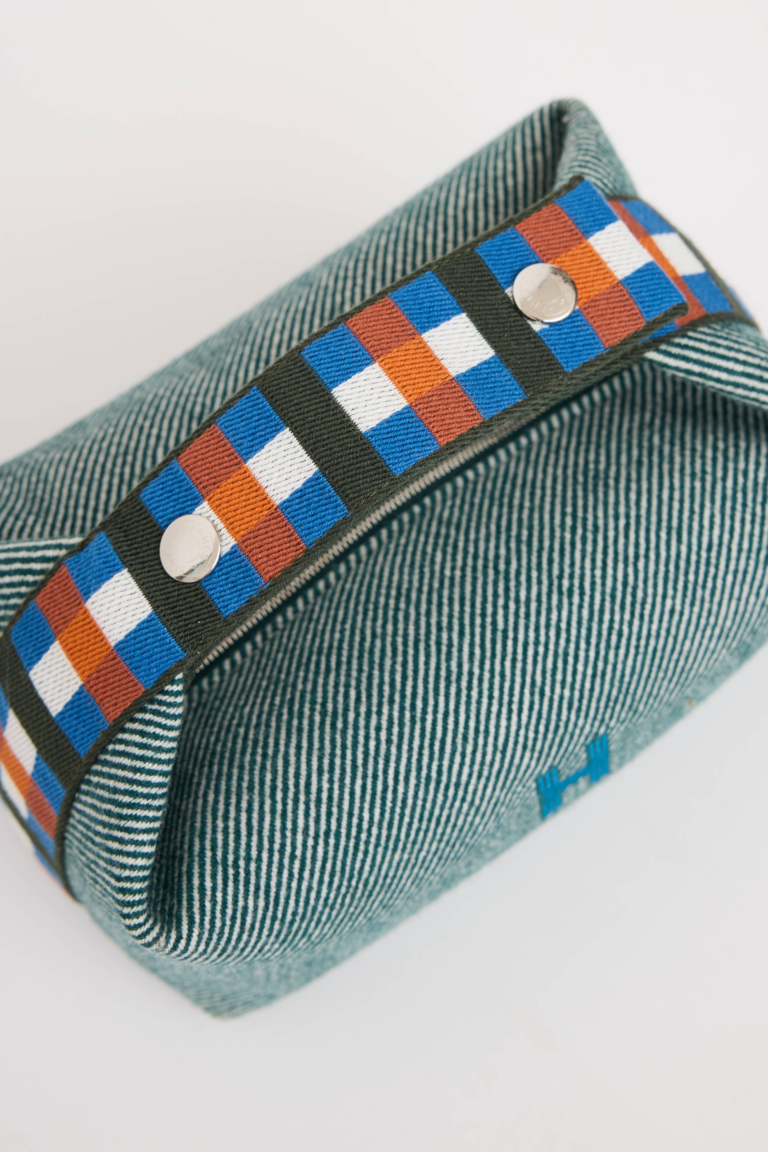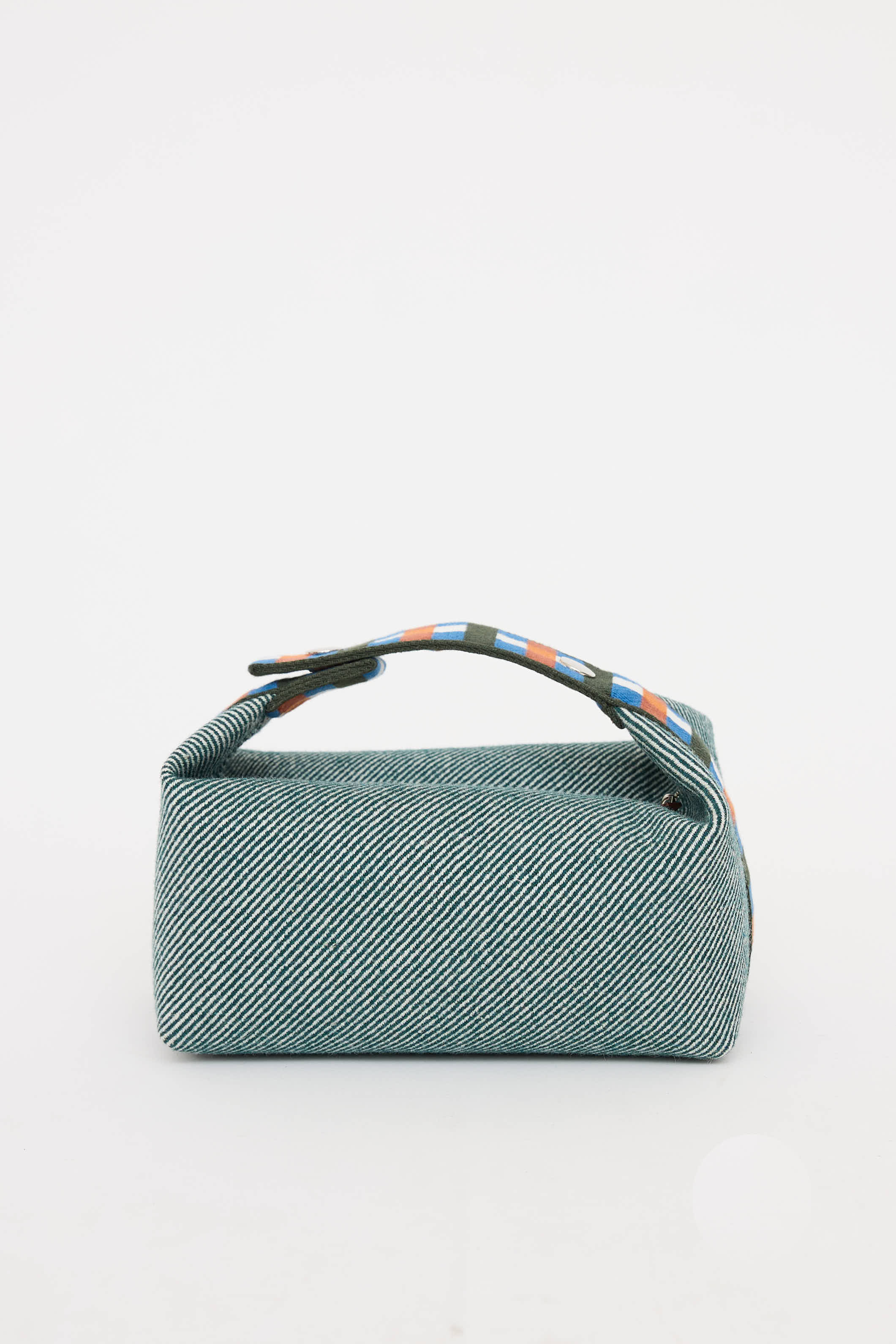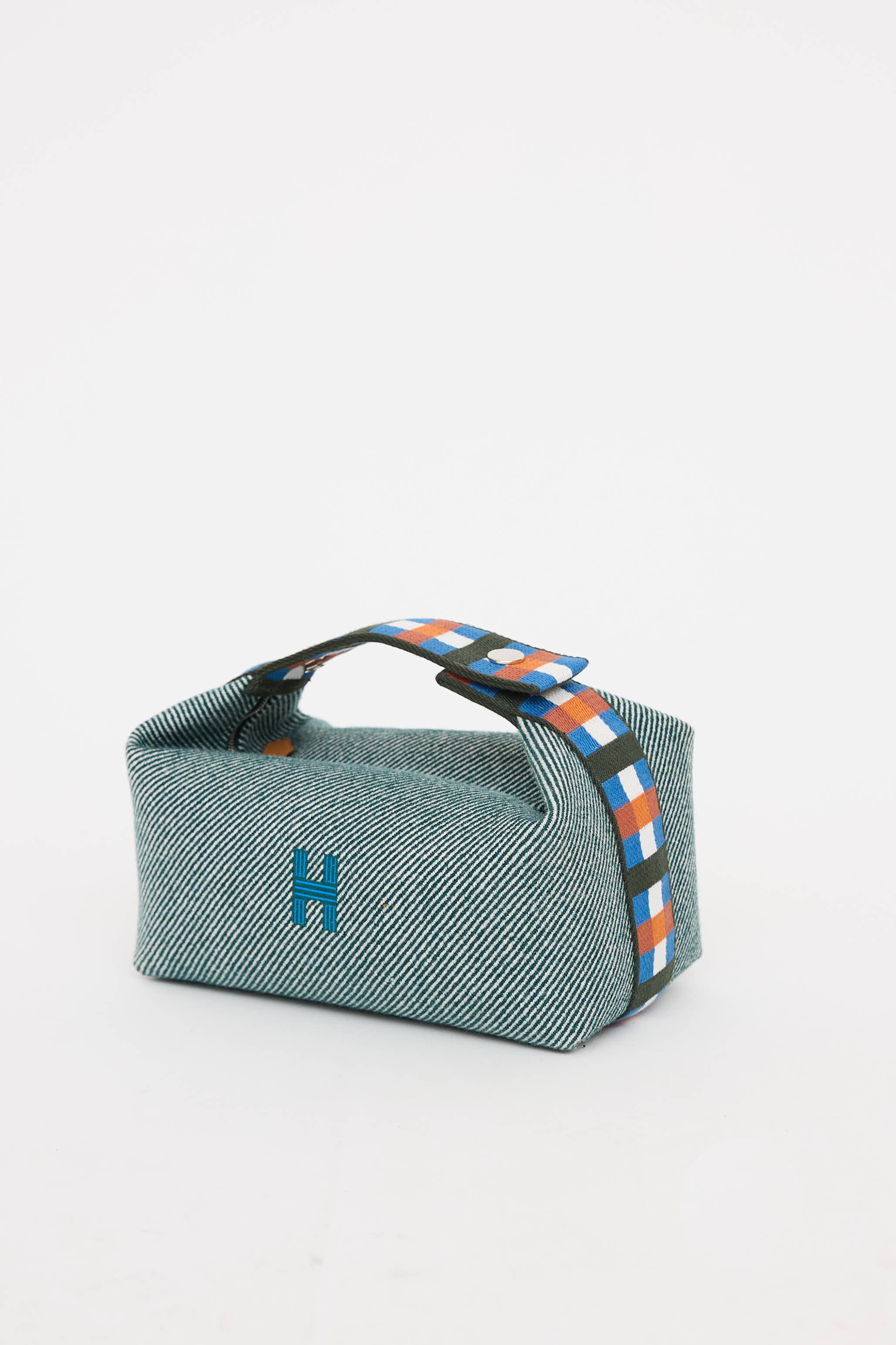 Pre-owned Hermès green and multicolor Bride A Brac Au Carre case featuring flat singular top handle with silver tone snap closure, tonal stitching, embroidered initial at front, top zip closure with one main compartment, and three interior slip pockets.