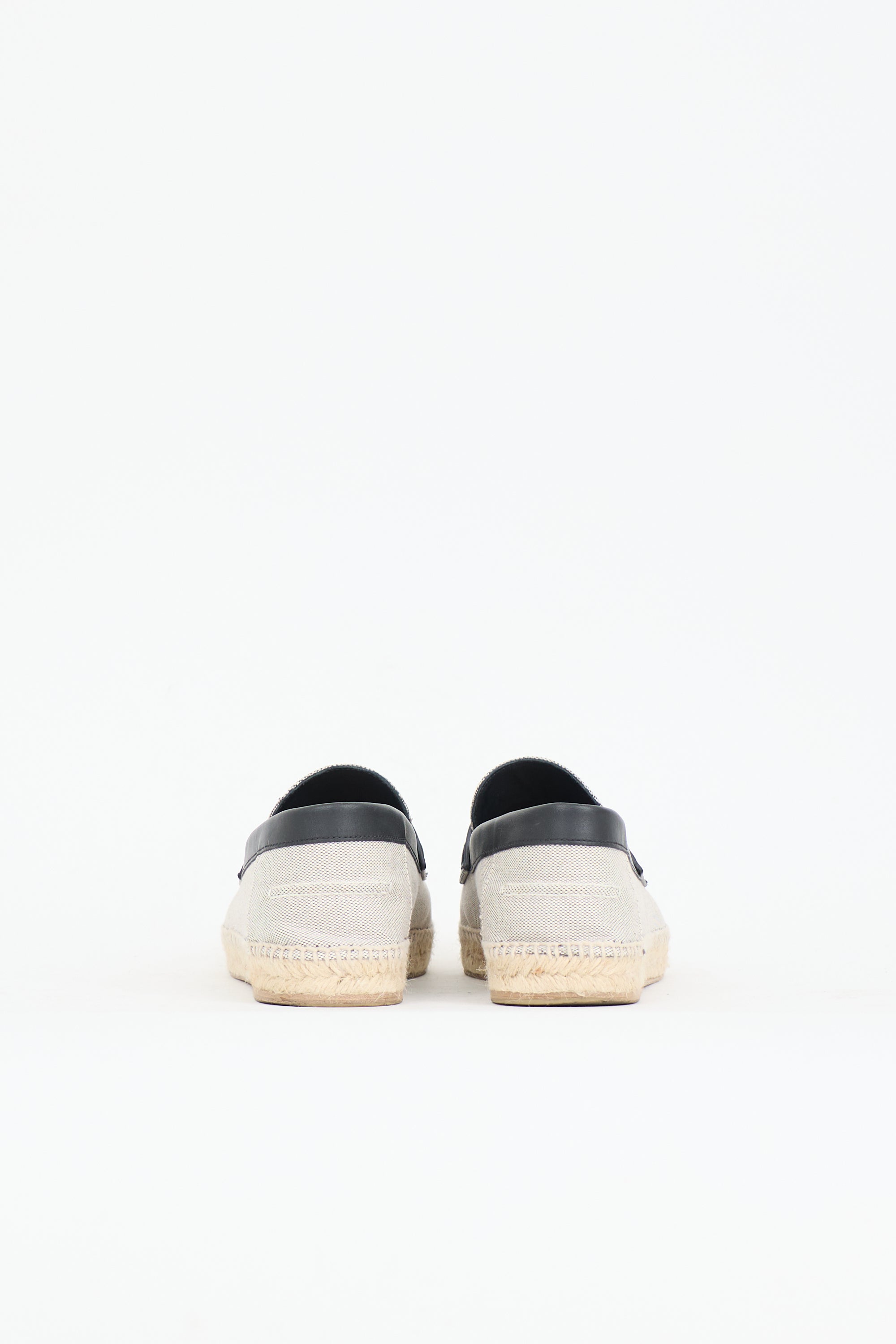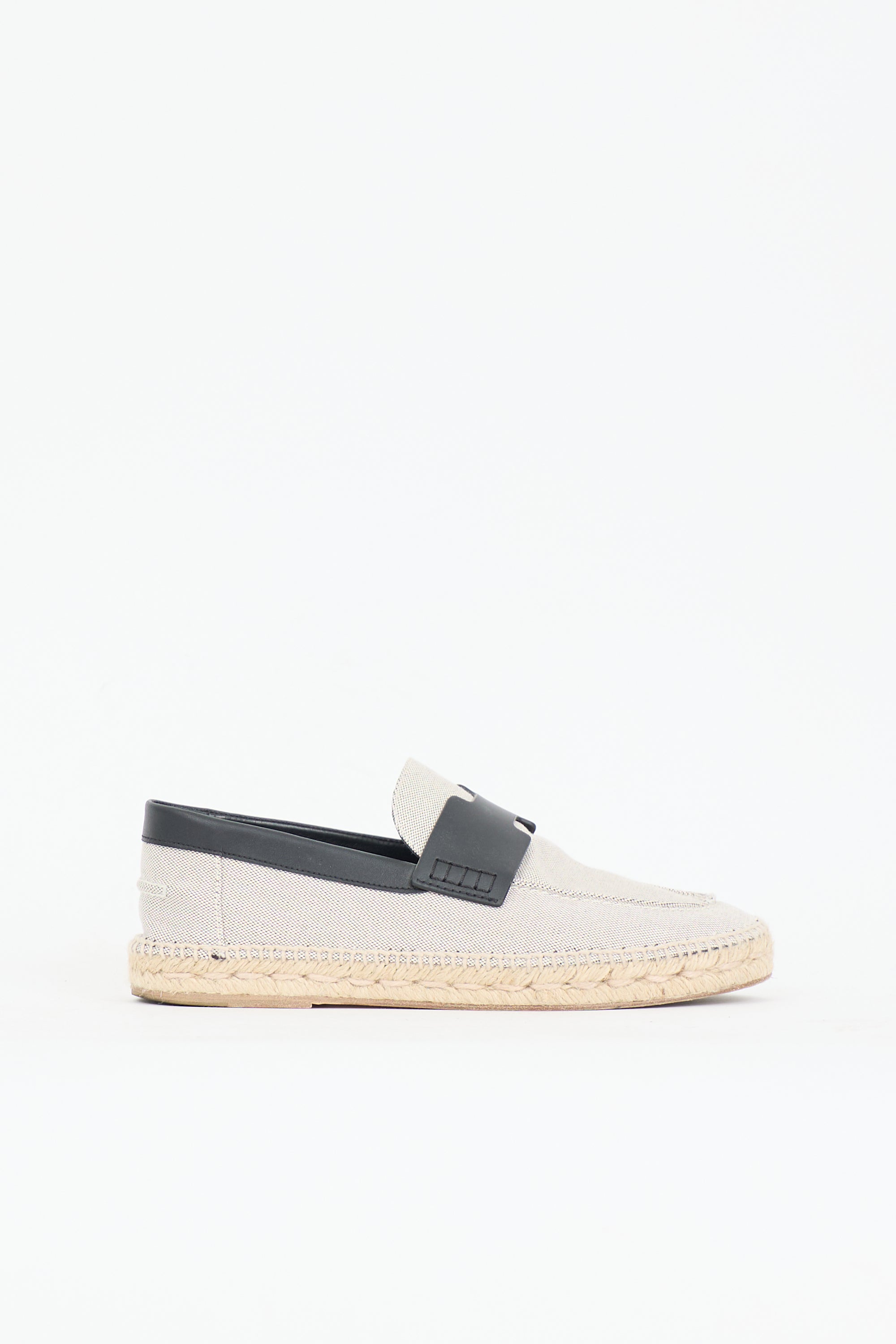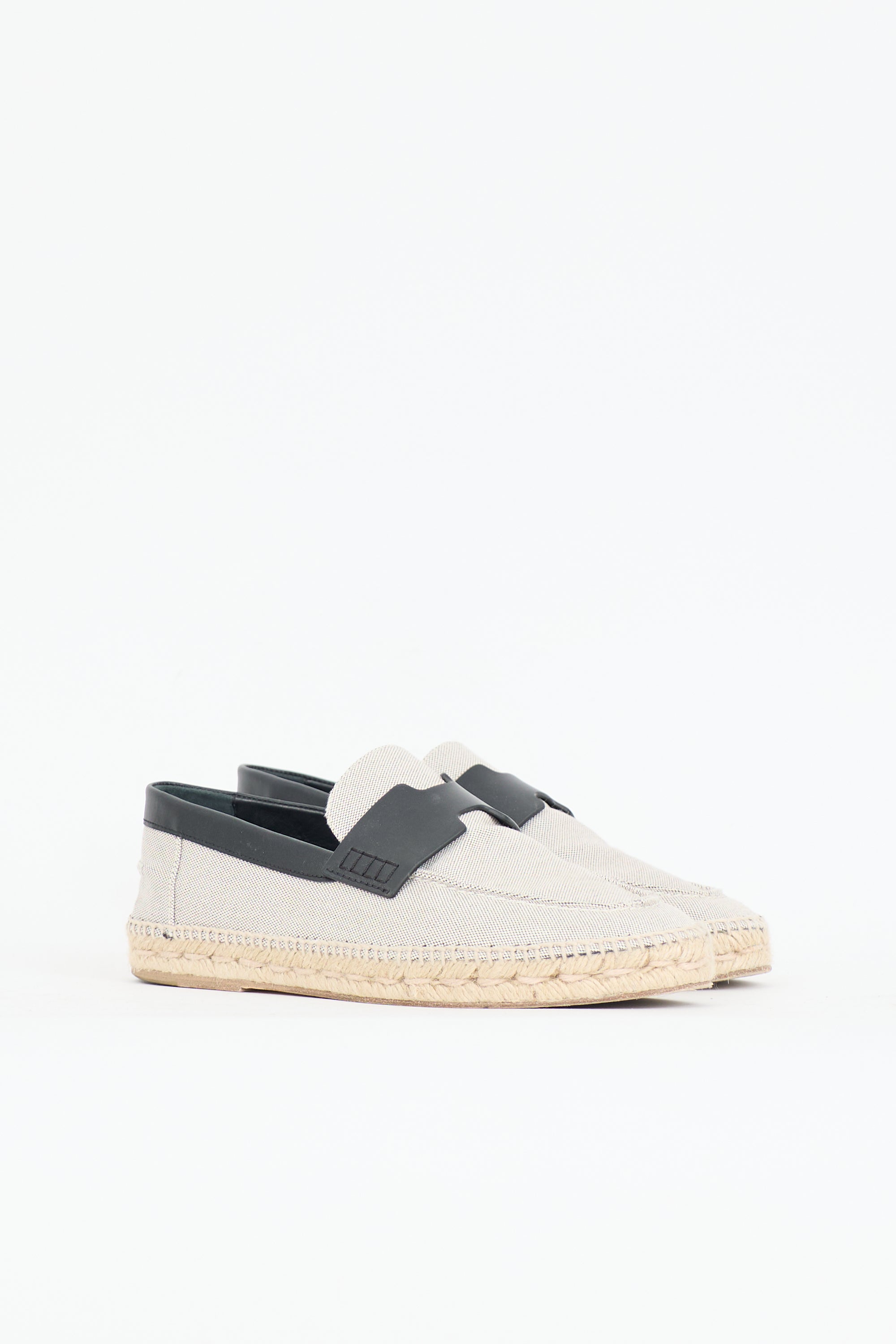Pre-owned Hermès grey canvas Trip espadrille flats featuring a rounded toe, woven Jute trim, black leather H strap at vamp, slip on entry, and rubber sole.