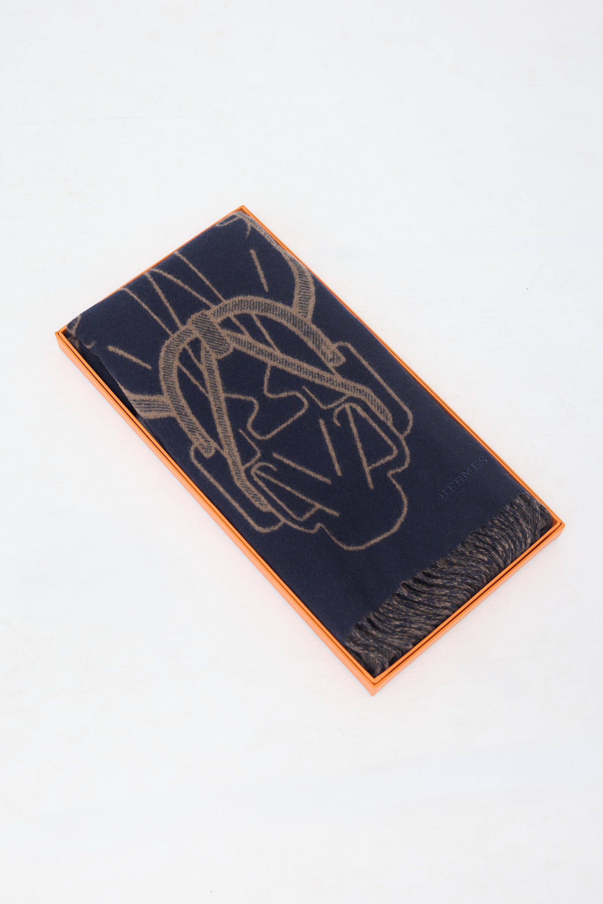 Pre-owned Hermès Bleu Marine and Étoupe cashmere scarf featuring Tete-a-Tete Equestre intarsia design by Anne-Margot Ramstein, tonal logo embroidery, and fringed ends. Comes with original box.