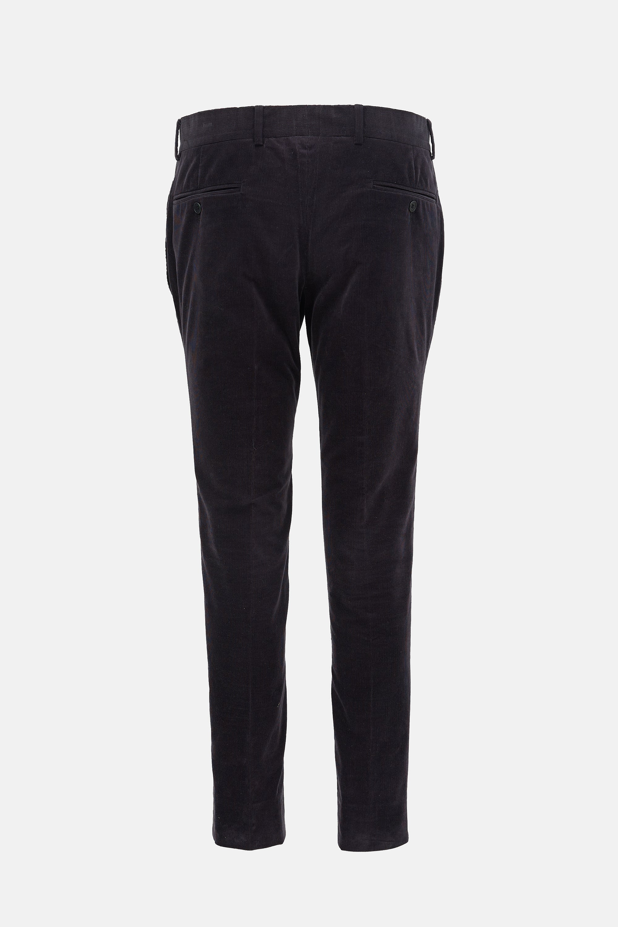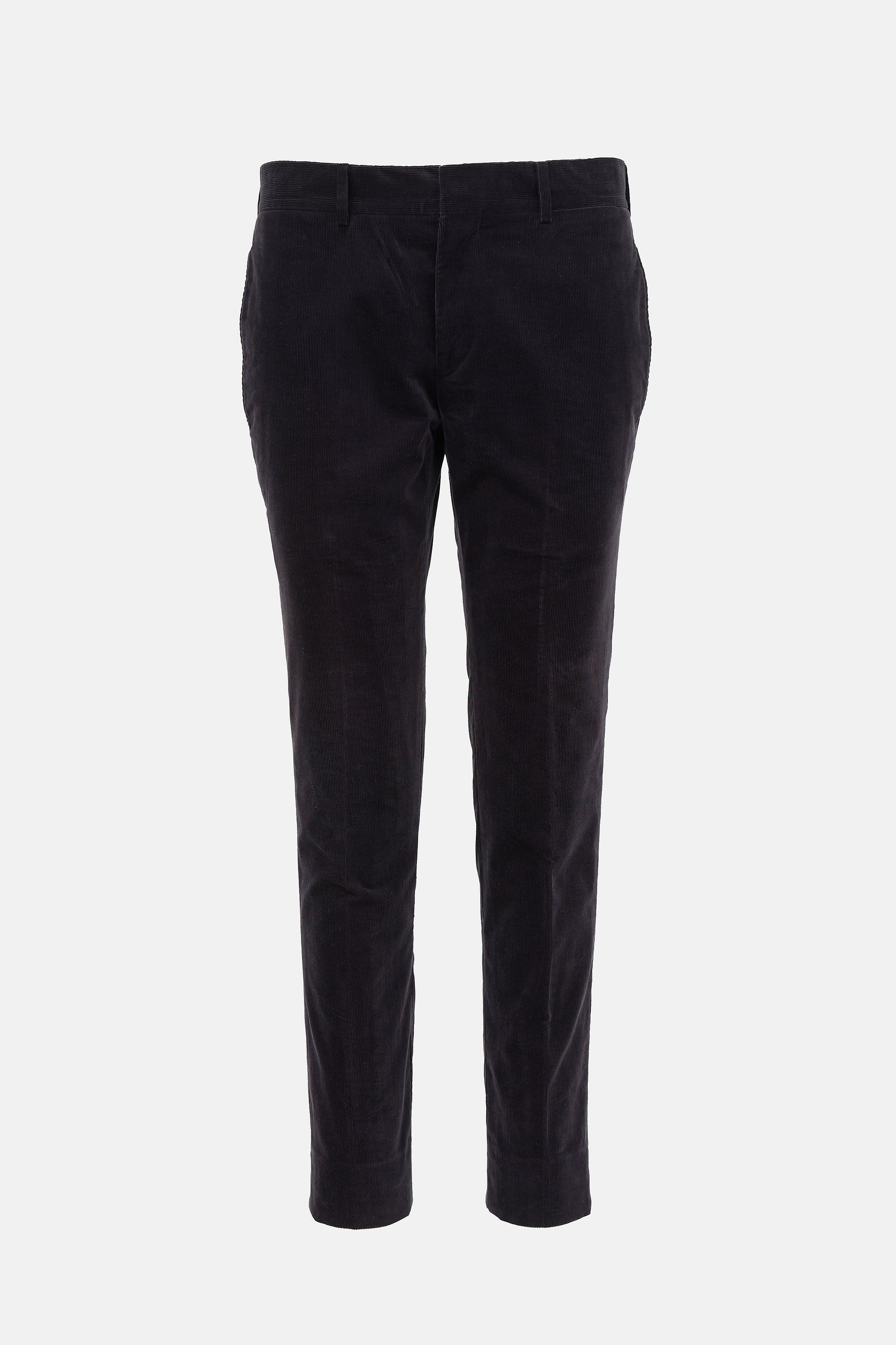 Pre-owned Hermès black corduroy trousers featuring slim leg with creases, four pocket styling, and zip fly. Lined.