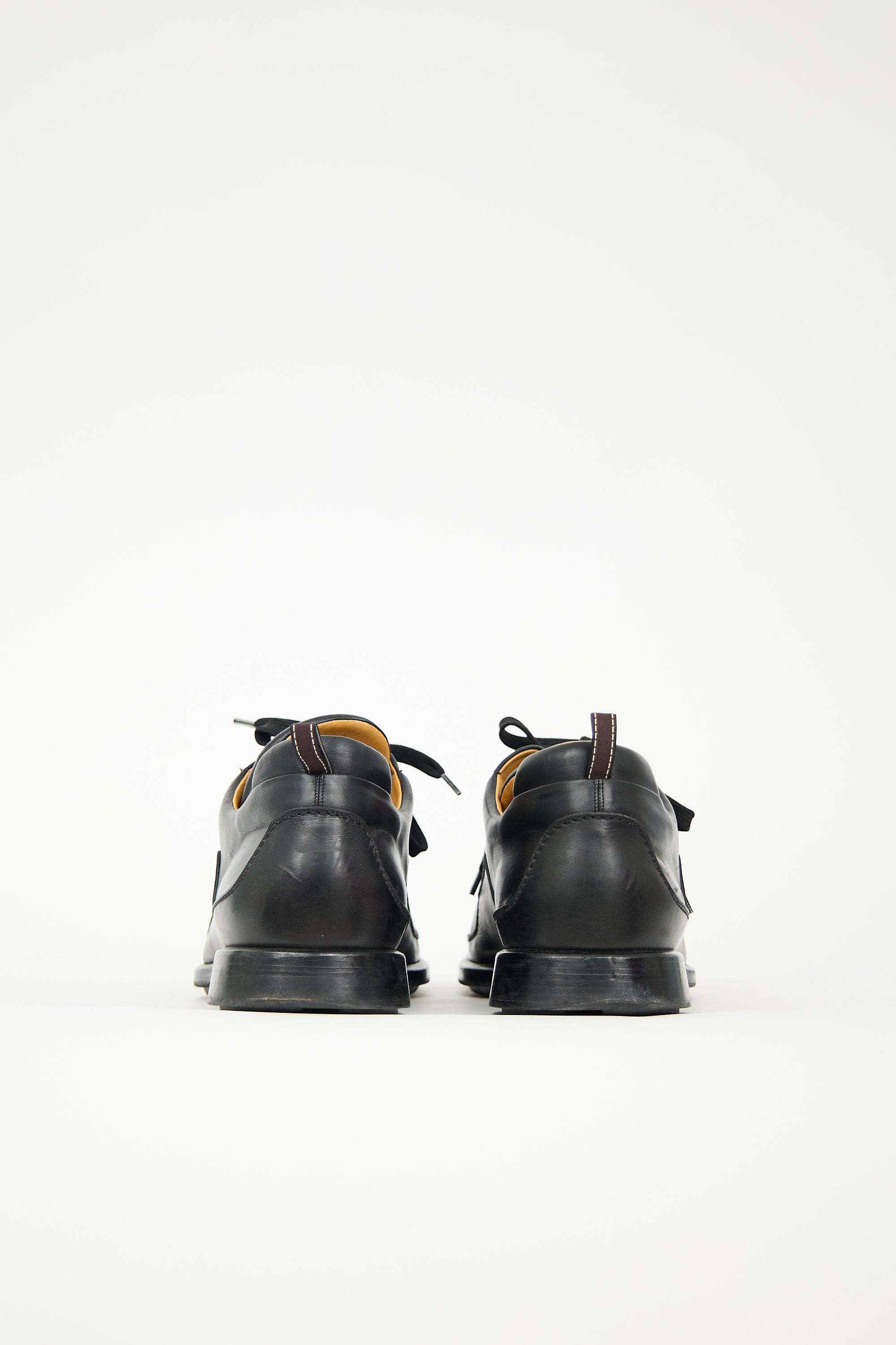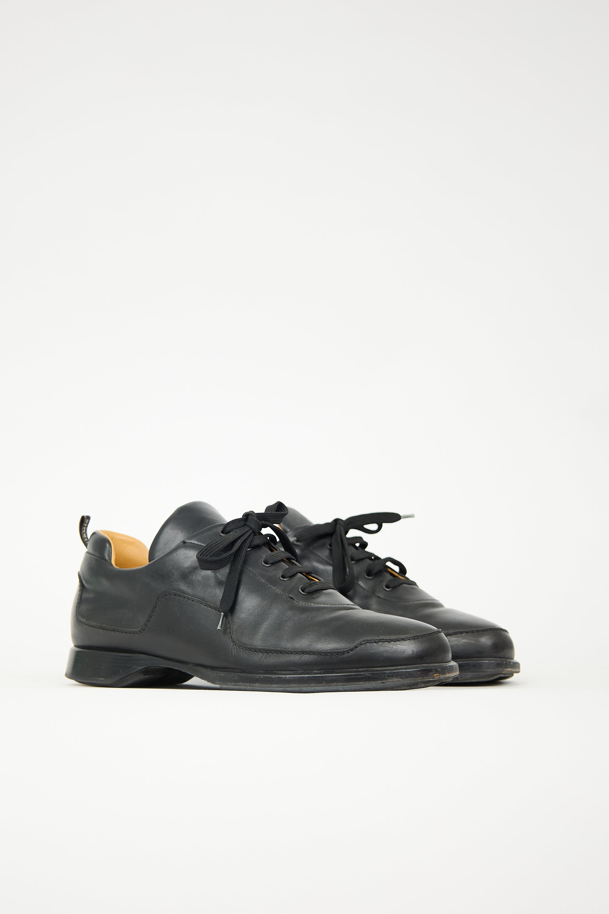 Pre-owned Hermès black leather sneakers featuring rounded toe, lace up front, pull tab at back, and split stacked sole.
