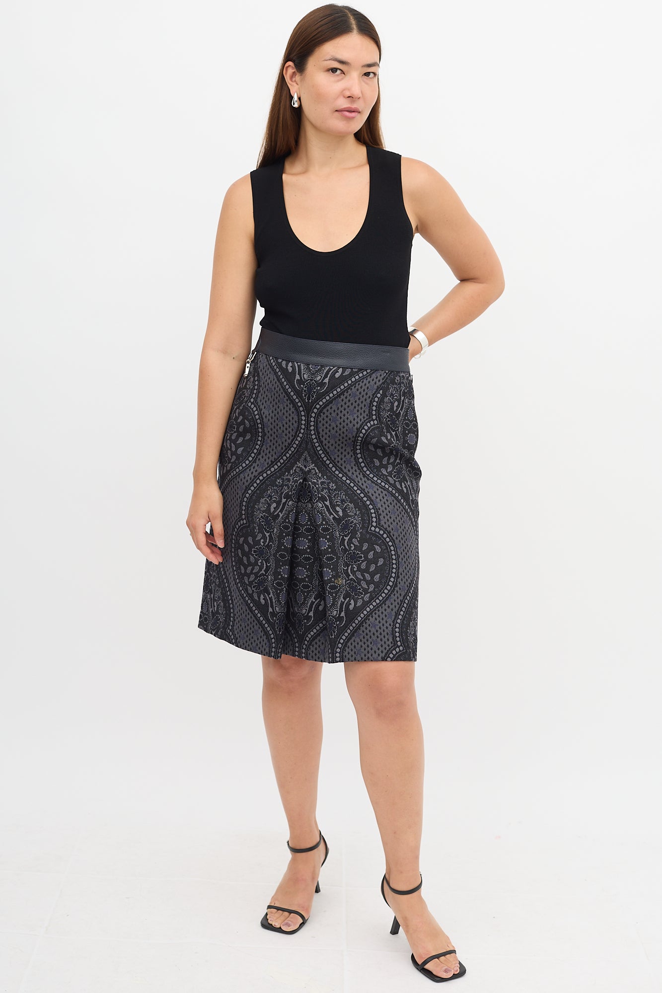 Pre-owned Hermès navy midi skirt featuring paisley bandana jacquard, leather waistband with Palladium lobster clasp, front box pleat, and concealed side zip with logo snap button closure. Lined.