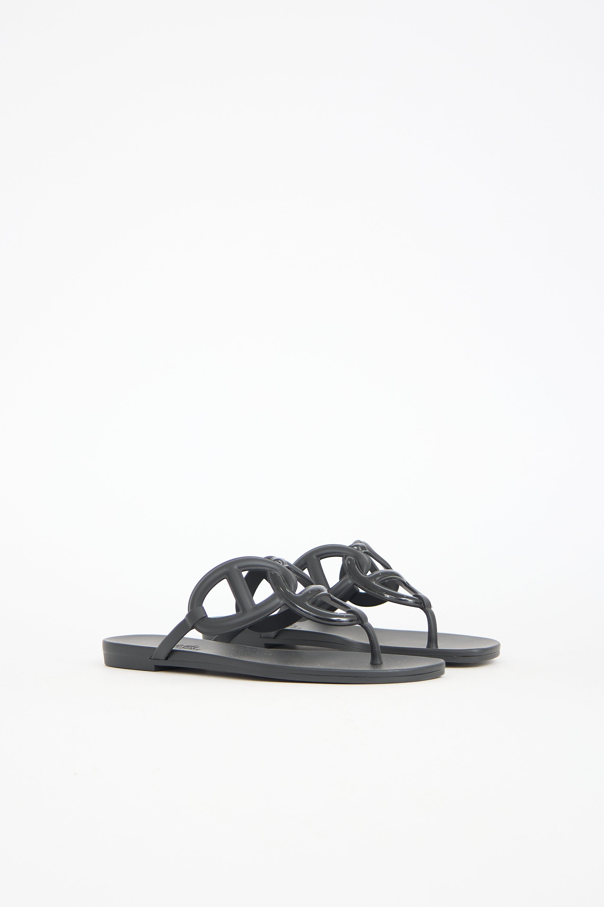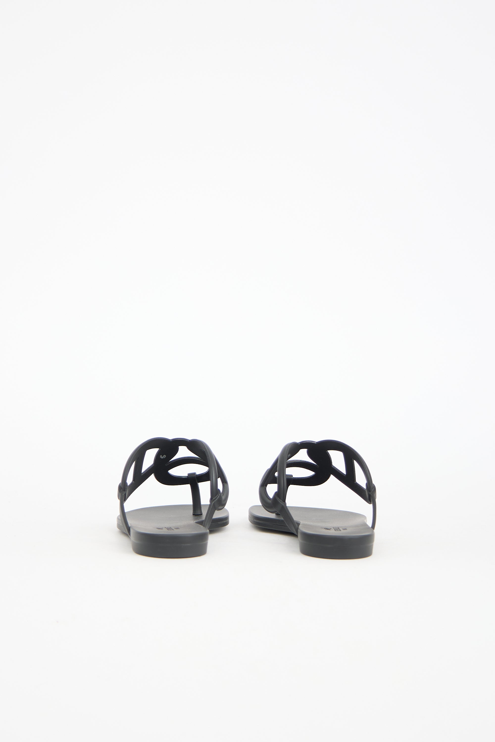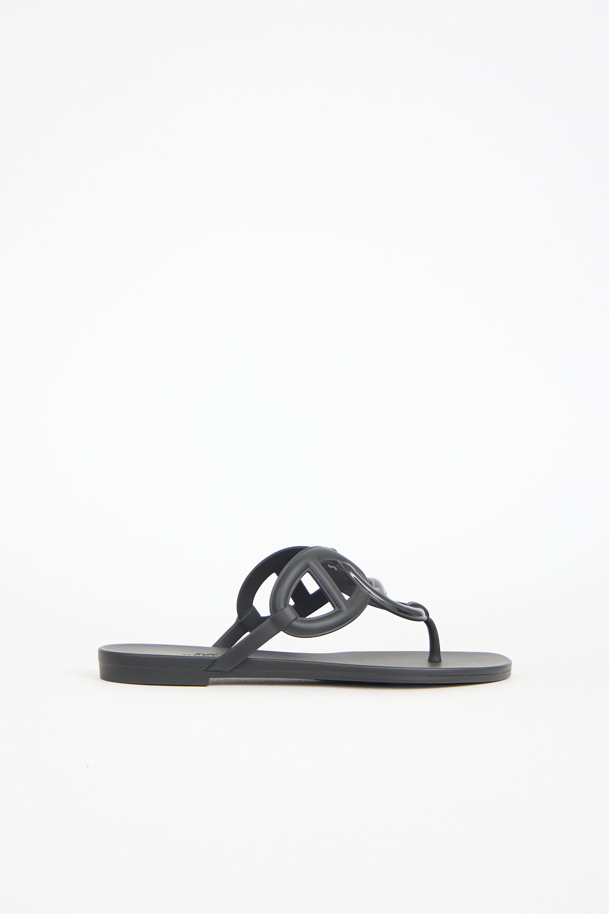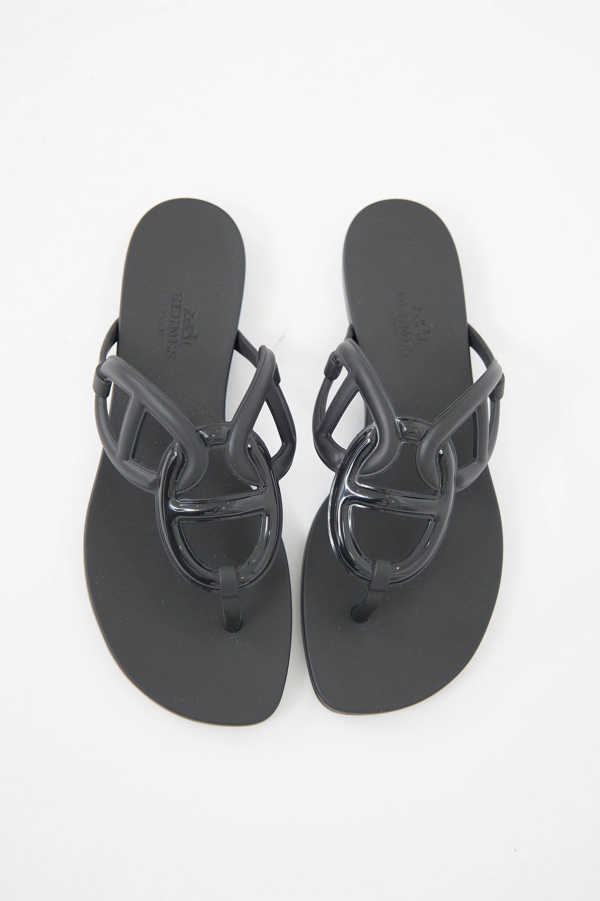 Pre-owned Hermès black rubber Egerie sandals featuring rounded toe and Chaine d'Ancre motif strap. Comes with original box and dust bag.