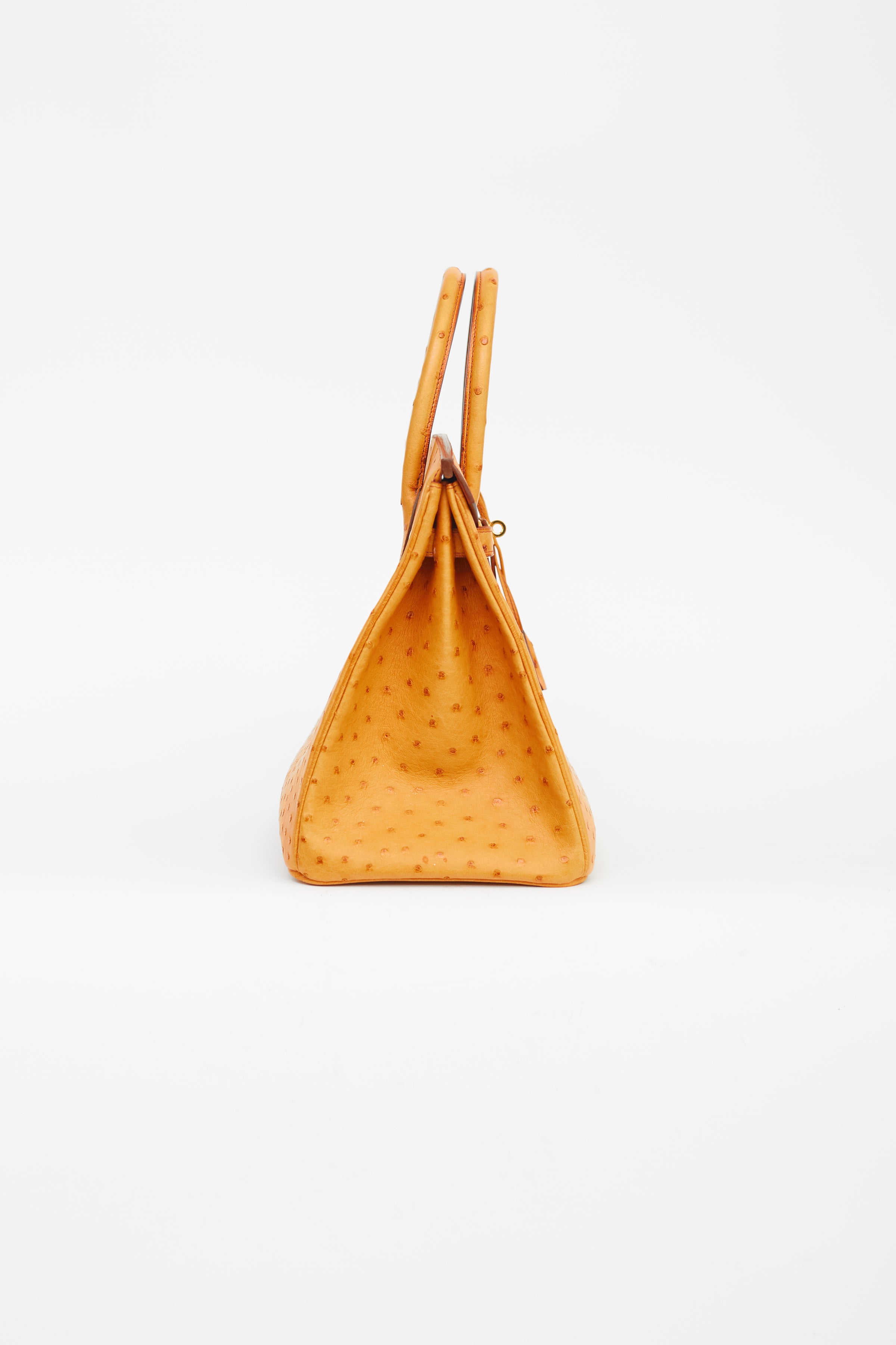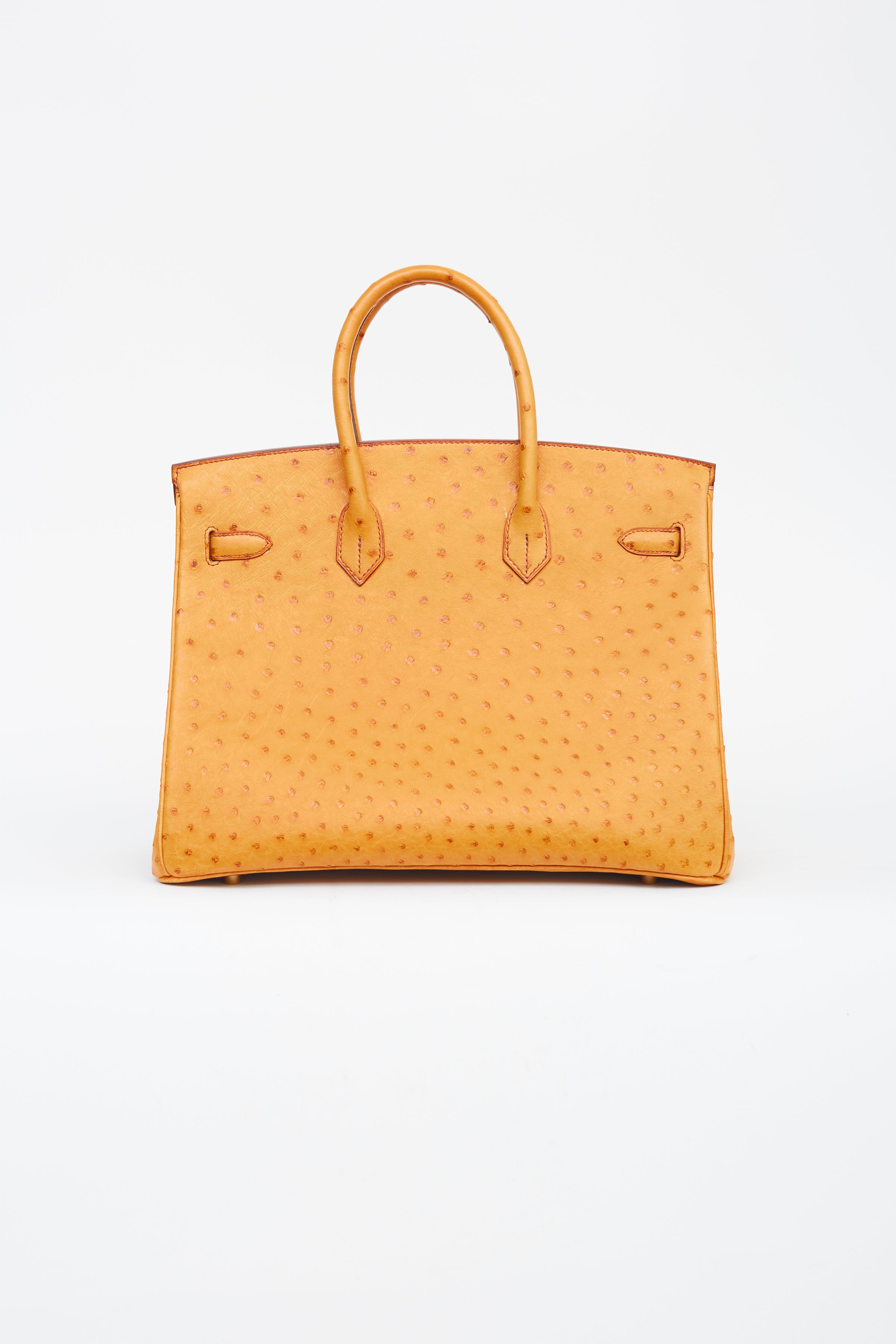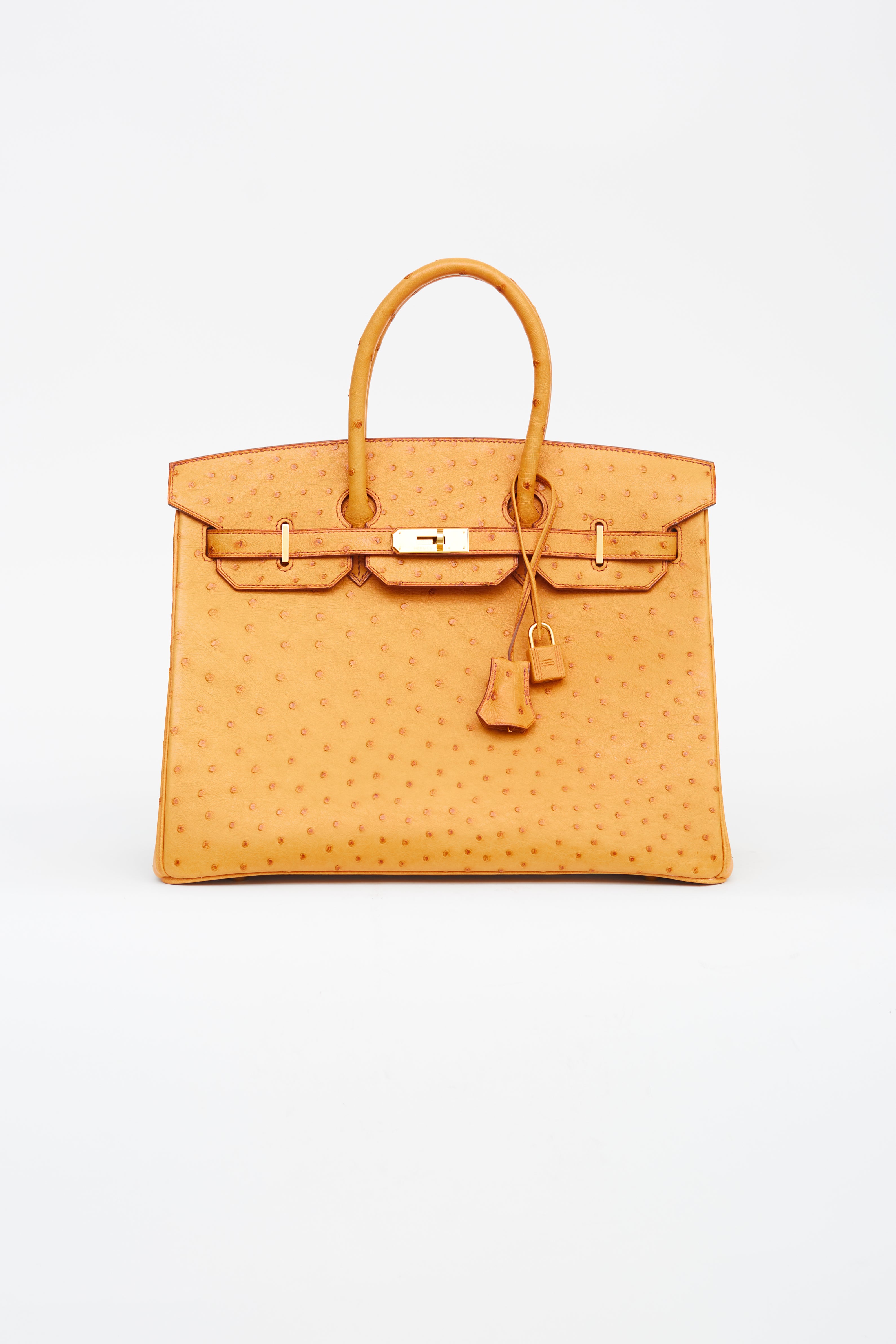 Pre-owned Hermès 2007 Birkin 35 in Saffron ostrich leather featuring two rolled top handles, brown stitching and glazing, gold-tone hardware, top flap with side straps, twist closure, protective metal feet at bottom, key and padlock attachment, single compartment and one slip and zip pocket.