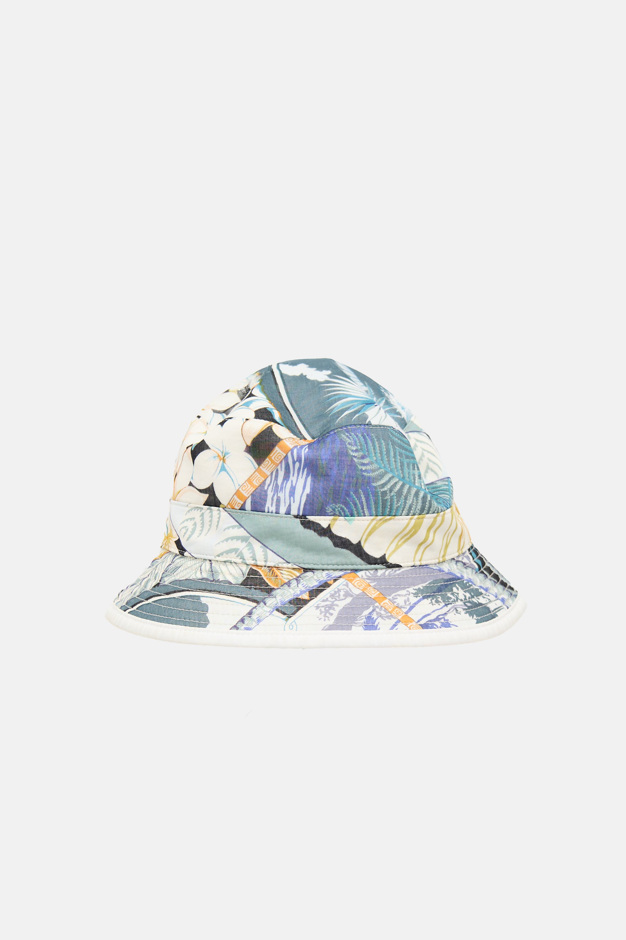 Pre-owned Hermès blue and multicolour bucket hat featuring tropical print, white topstitch, and white brim trim.