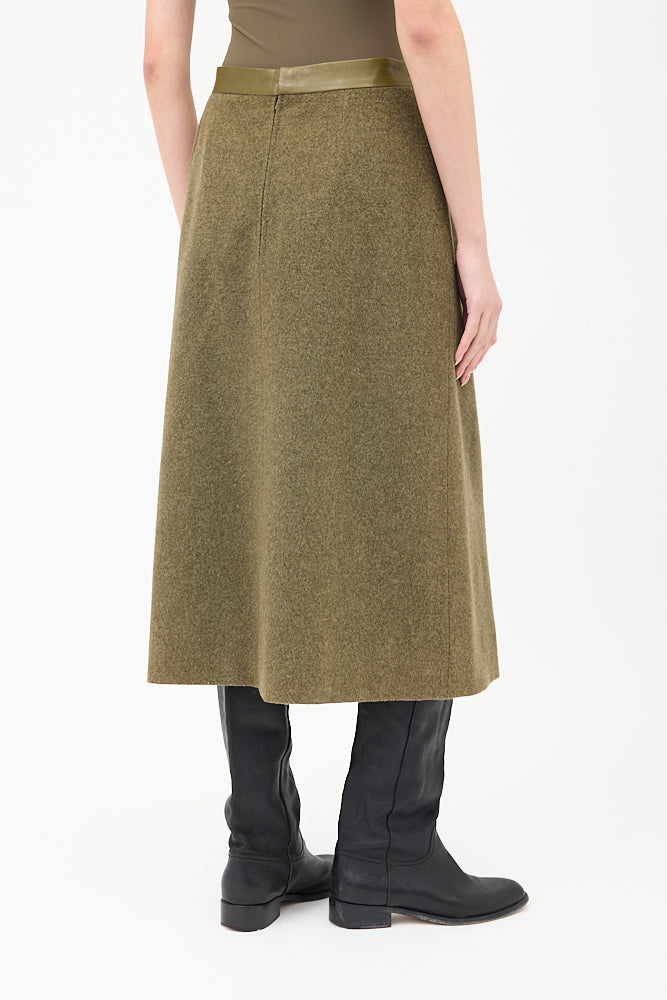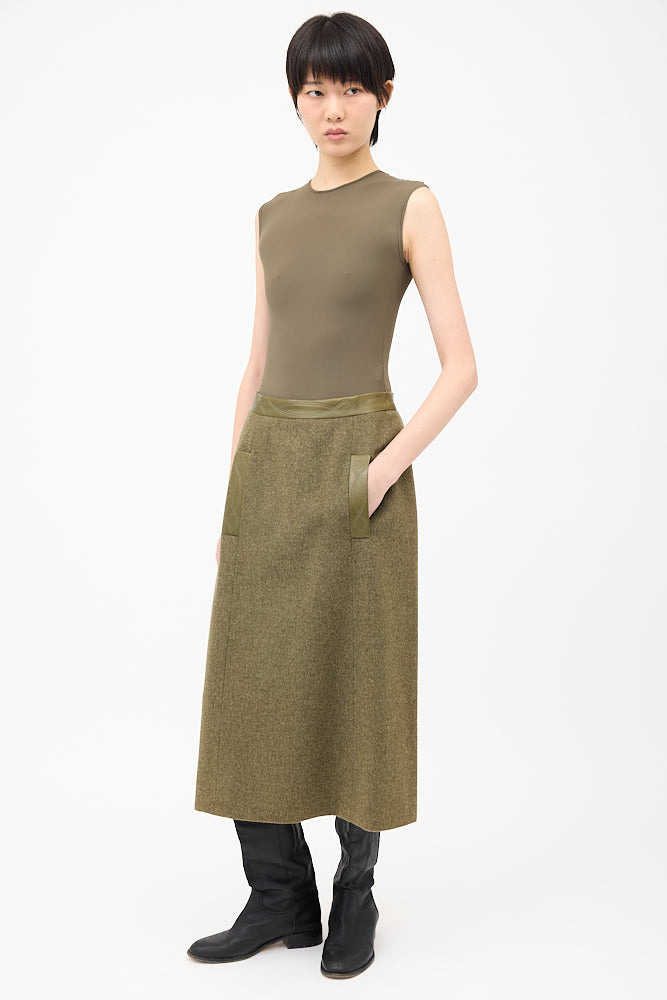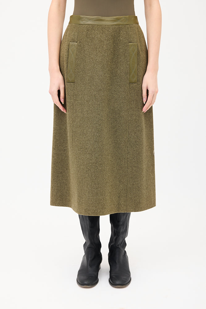 Pre-owned Hermès vintage wool and cashmere blend midi skirt featuring a high waist, two front welt pockets, tonal embroidered leather panelling at waist, and back zip closure. Lined. c. 1980s.