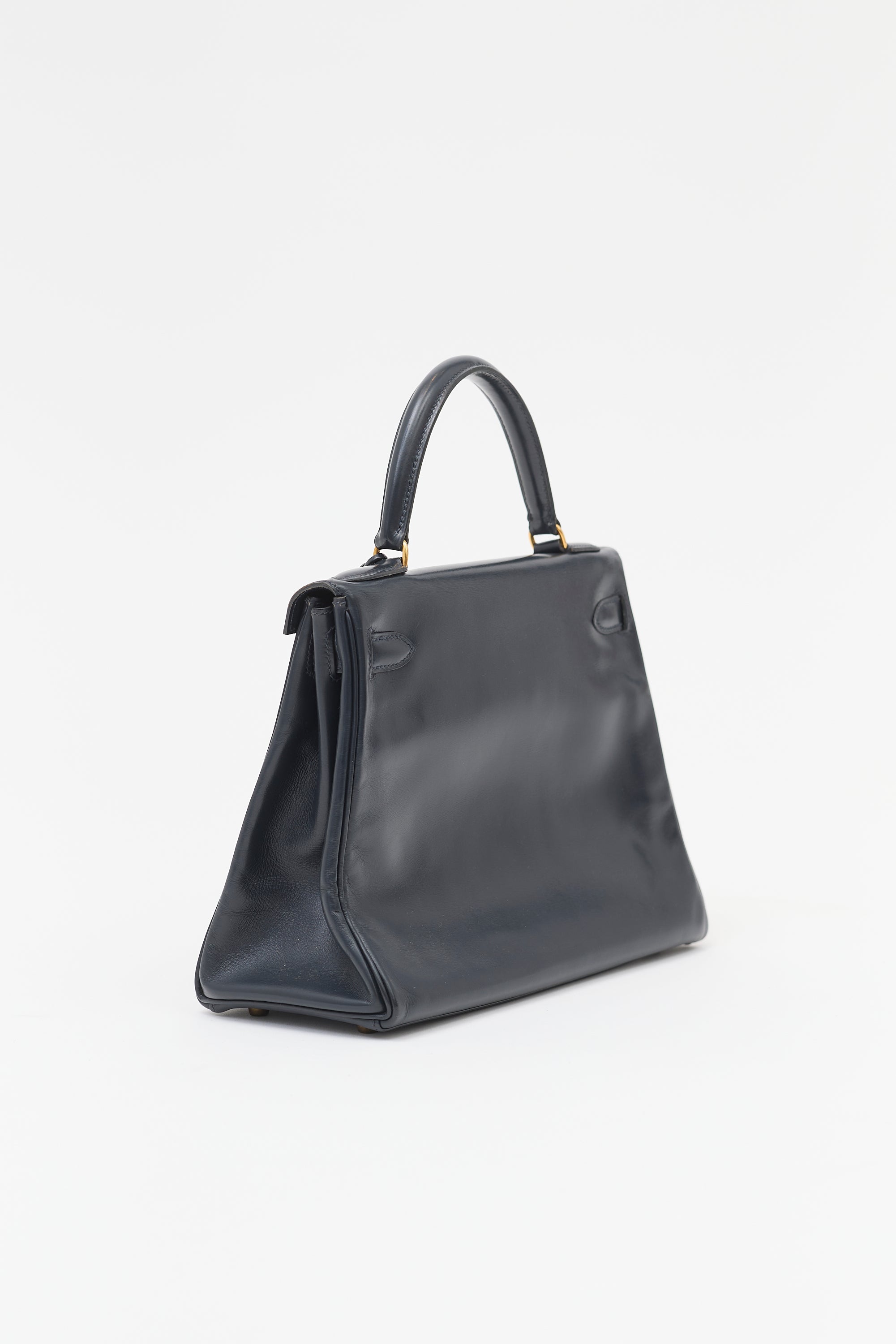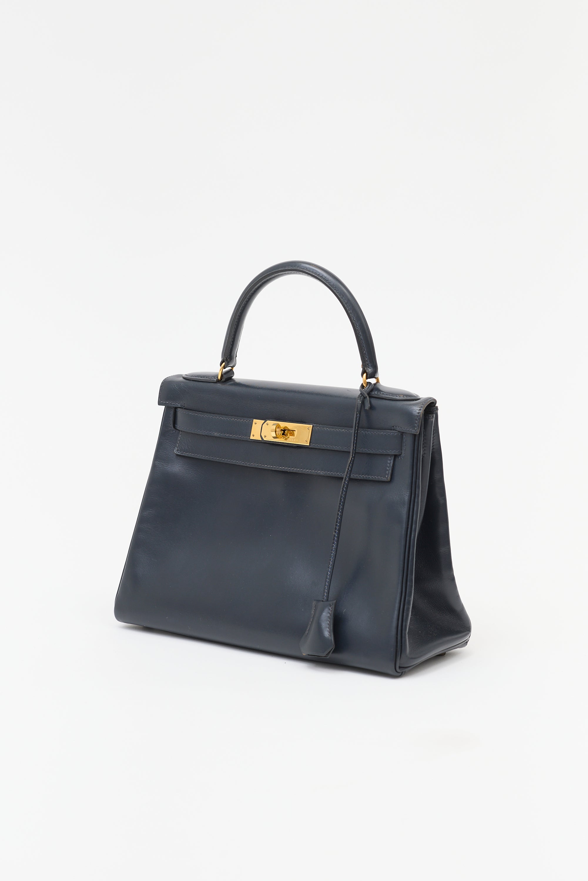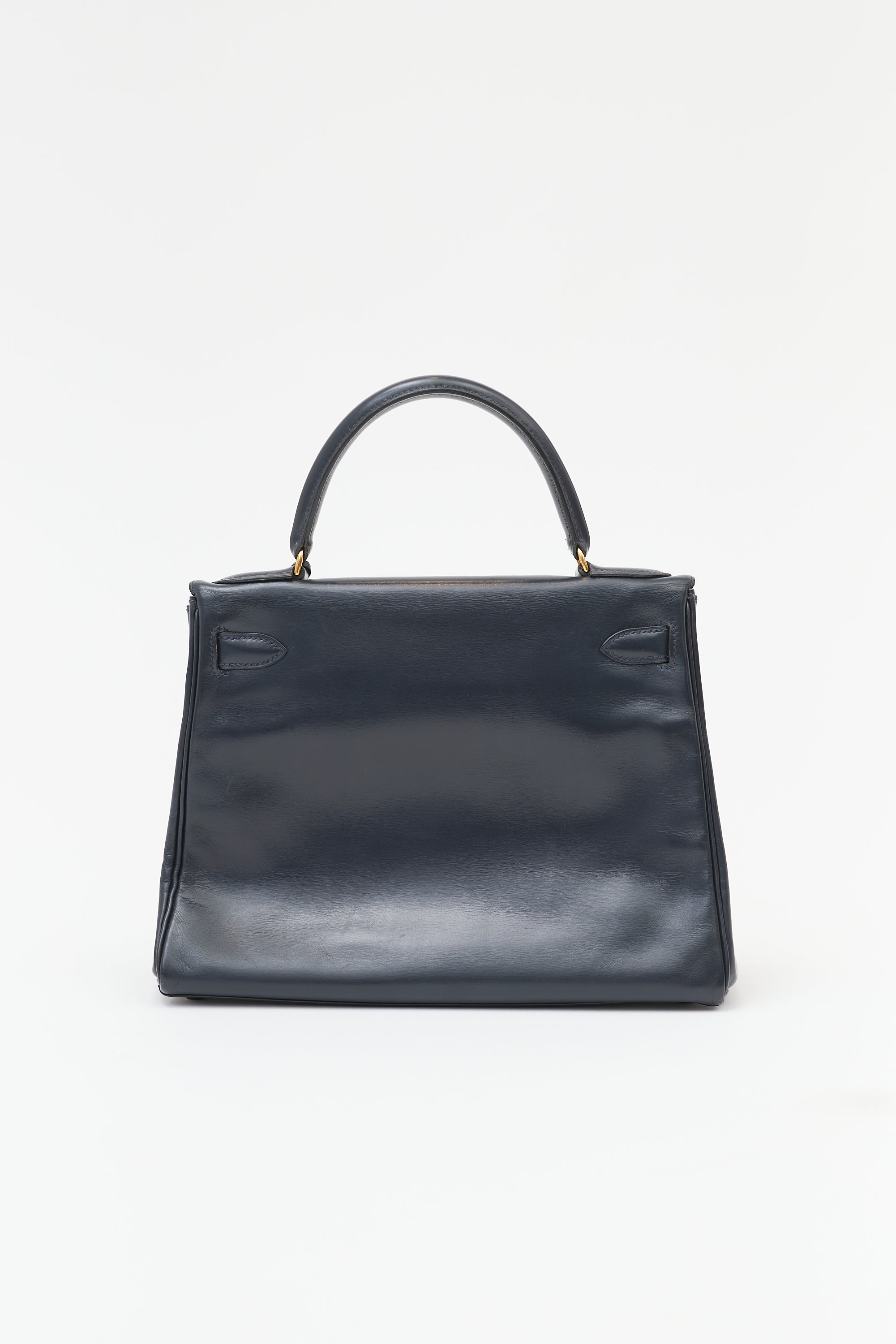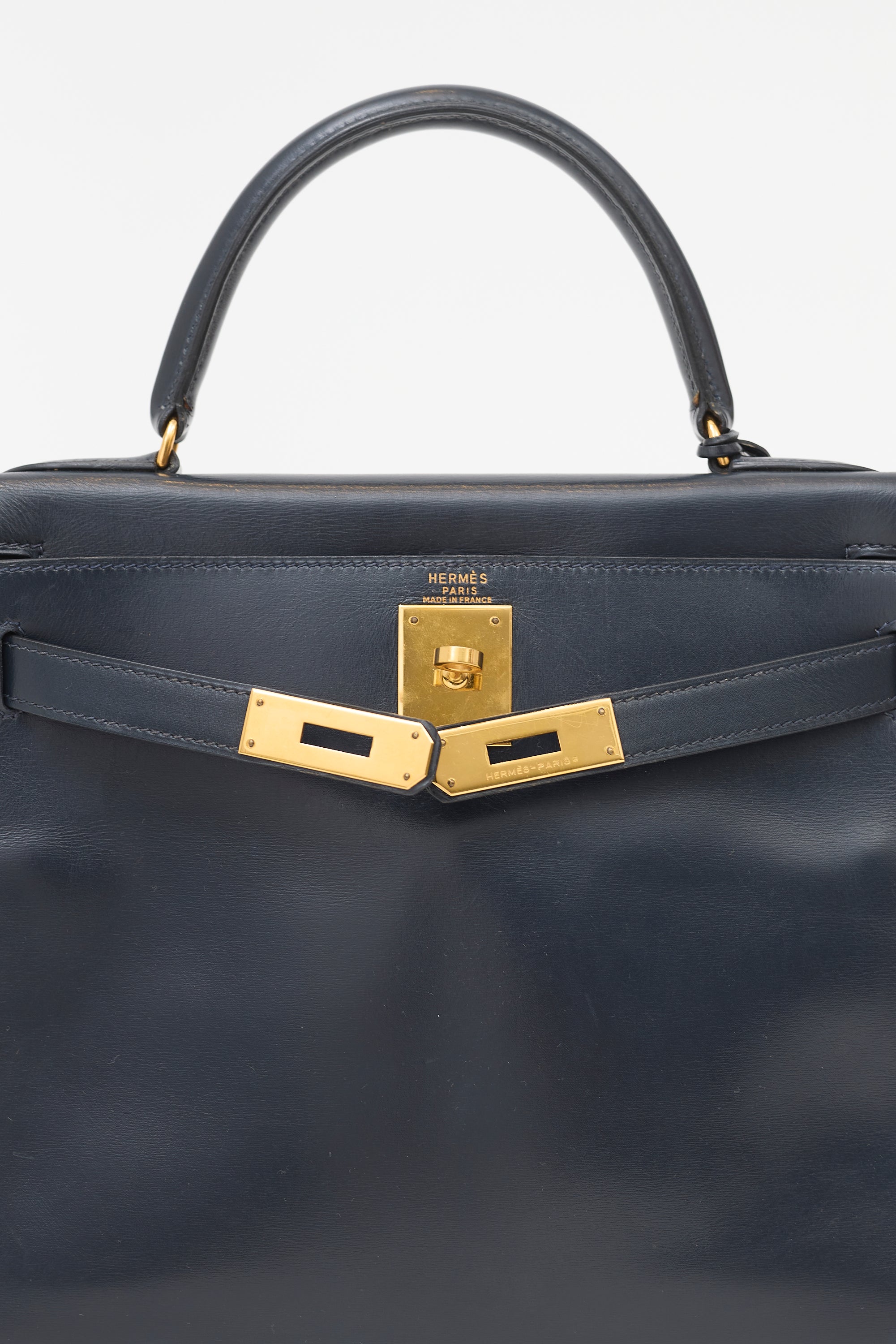 Pre-owned Hermès vintage Kelly Retourne 28 bag in Navy Box leather featuring single rolled top handle, gold plated hardware, gold stamped logo under flap, side belt detail, signature twist lock closure, logo engraved plaque, four clou, detachable keys and clochette, and one main compartment with two slip pockets and one zip pocket.
