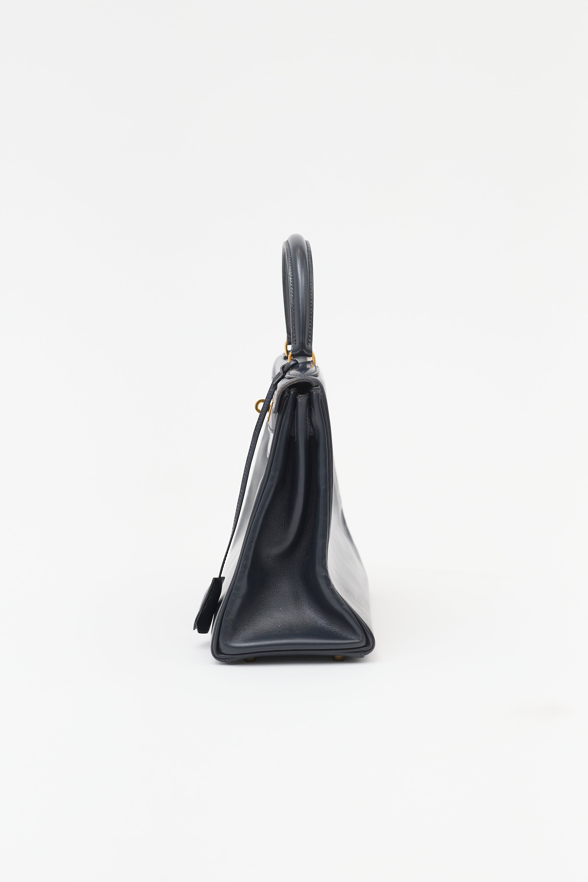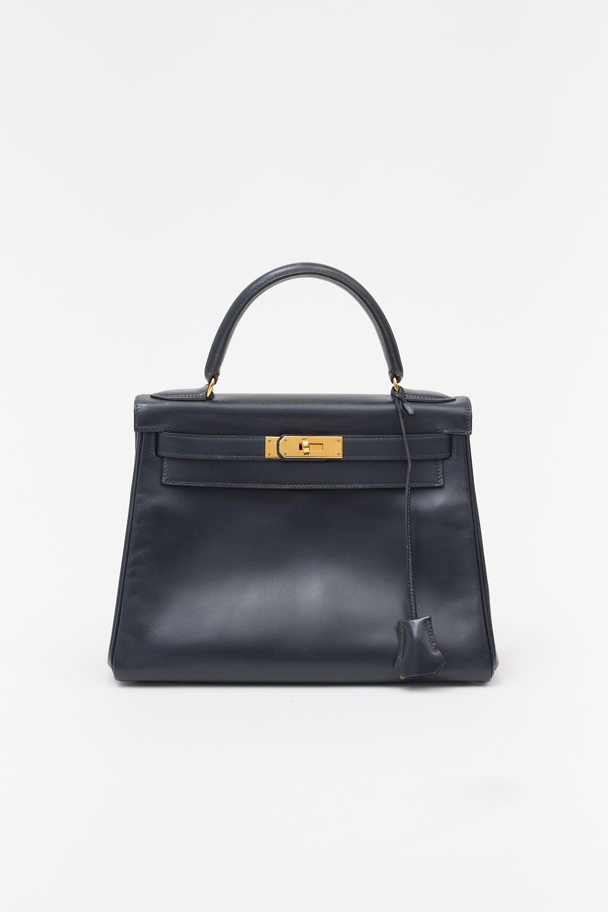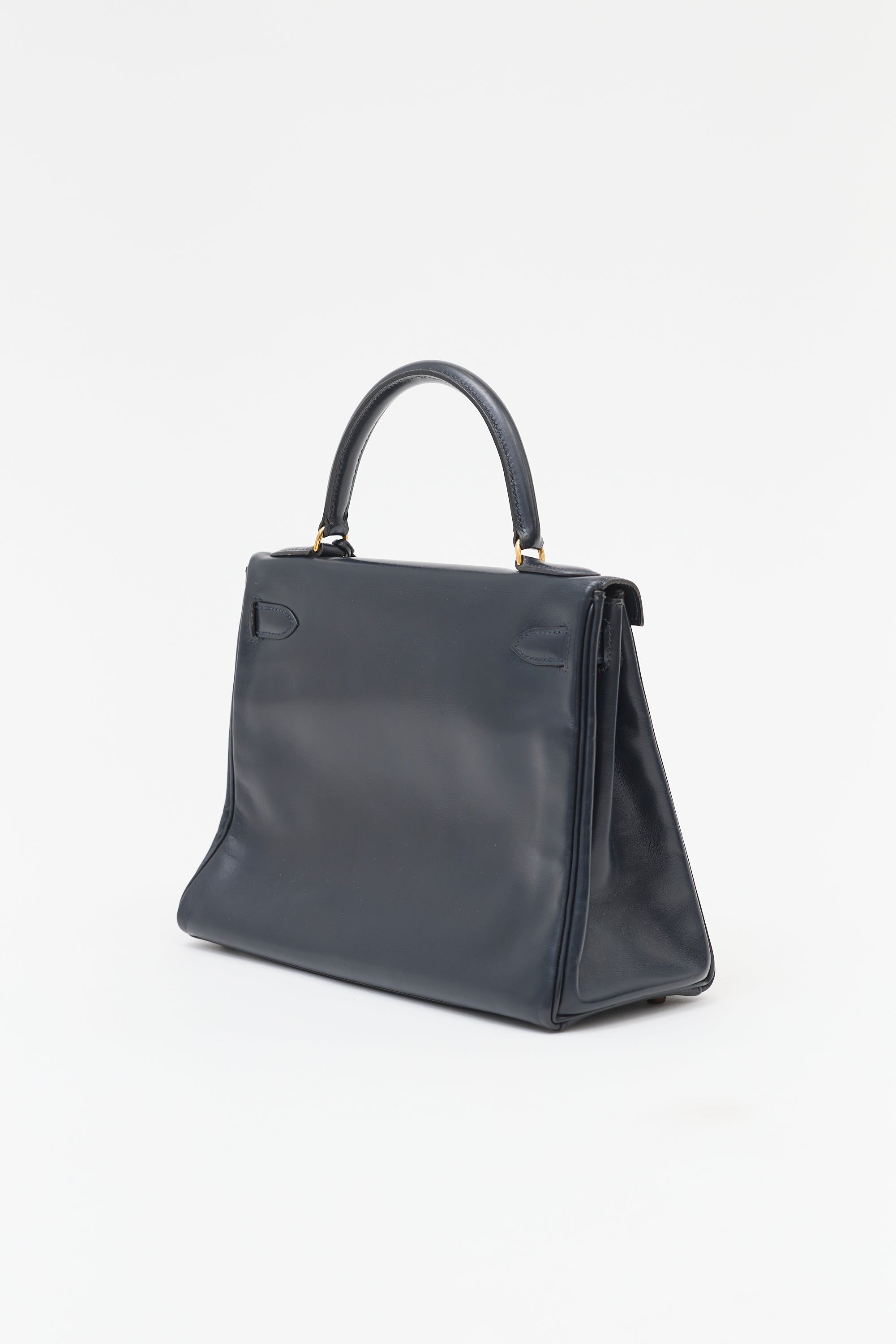 Pre-owned Hermès vintage Kelly Retourne 28 bag in Navy Box leather featuring single rolled top handle, gold plated hardware, gold stamped logo under flap, side belt detail, signature twist lock closure, logo engraved plaque, four clou, detachable keys and clochette, and one main compartment with two slip pockets and one zip pocket.