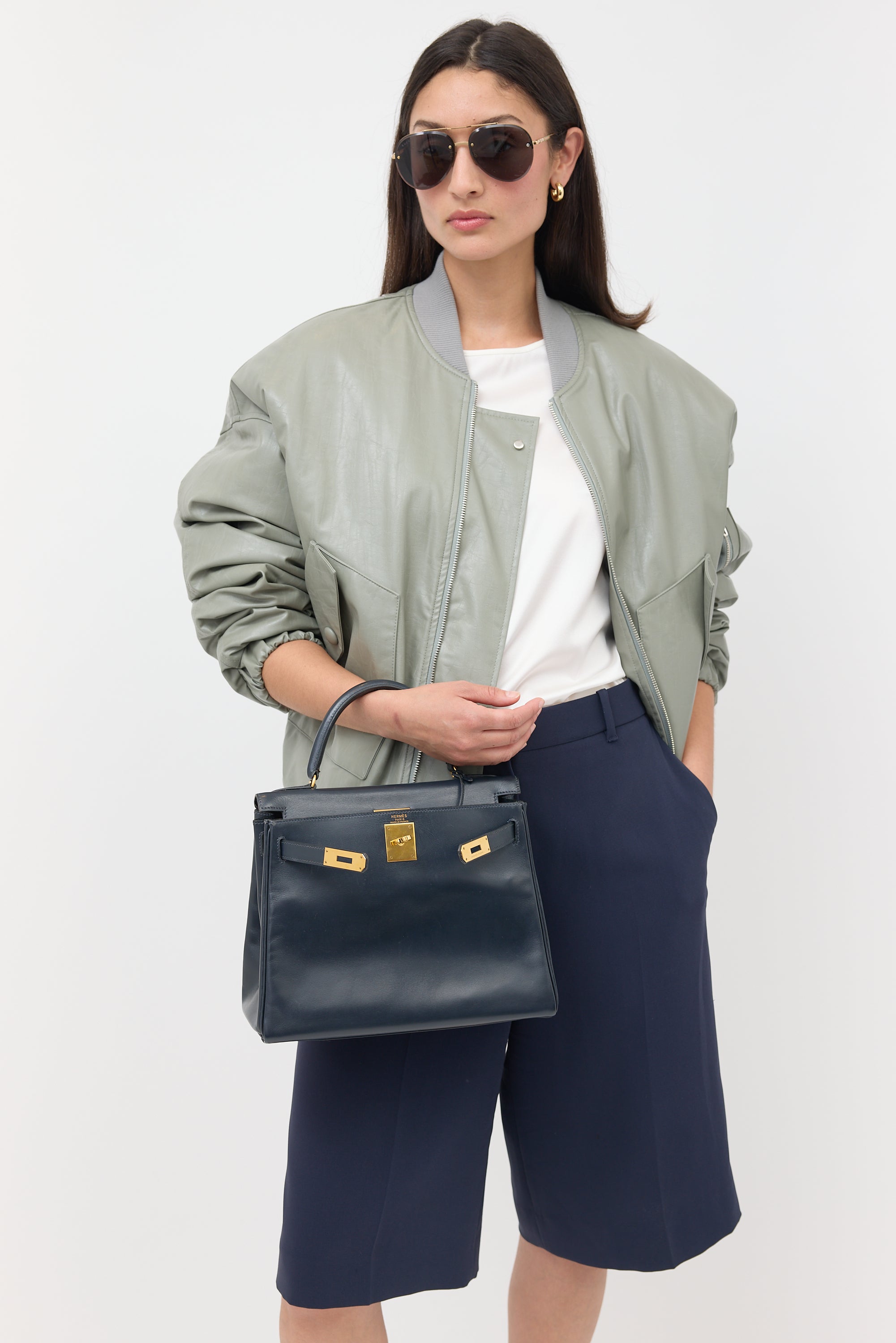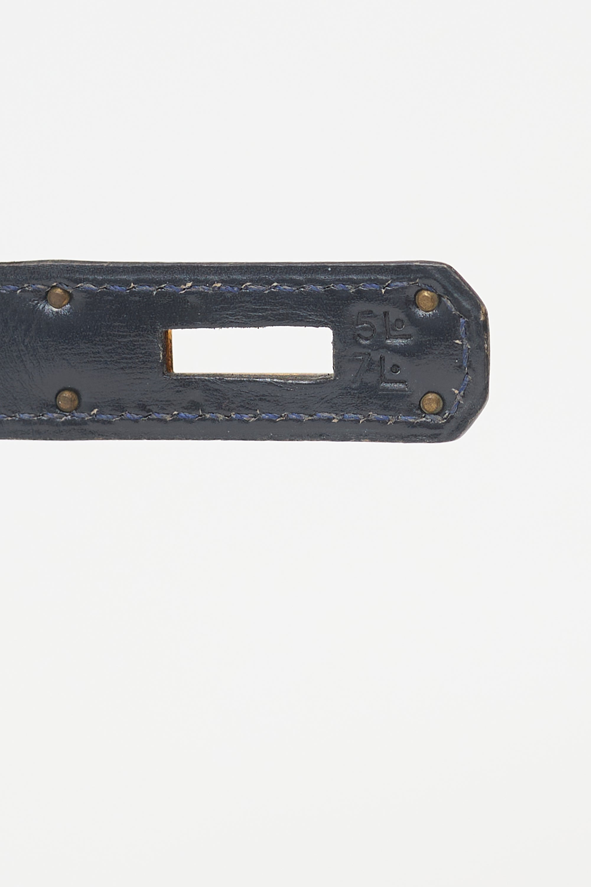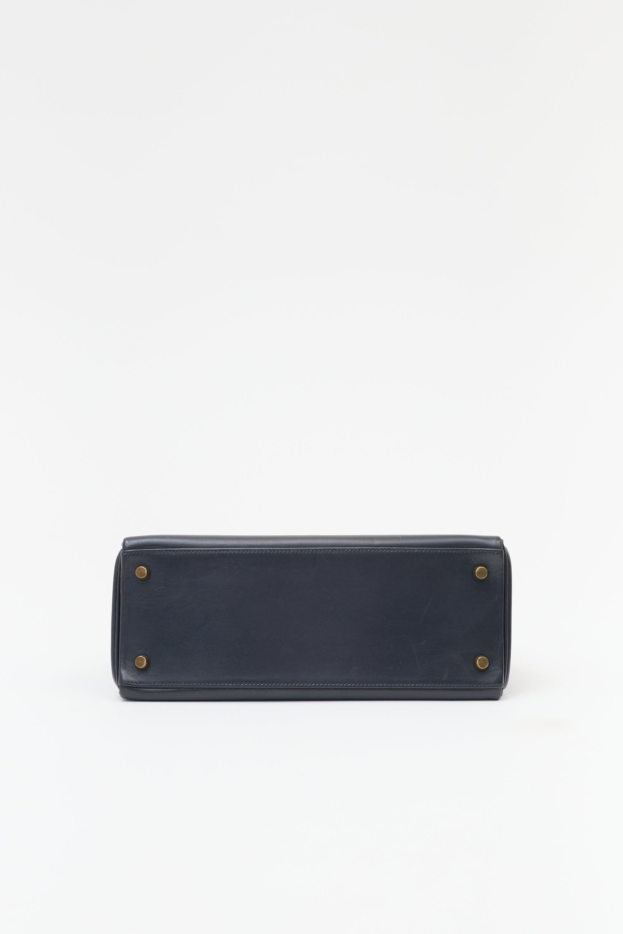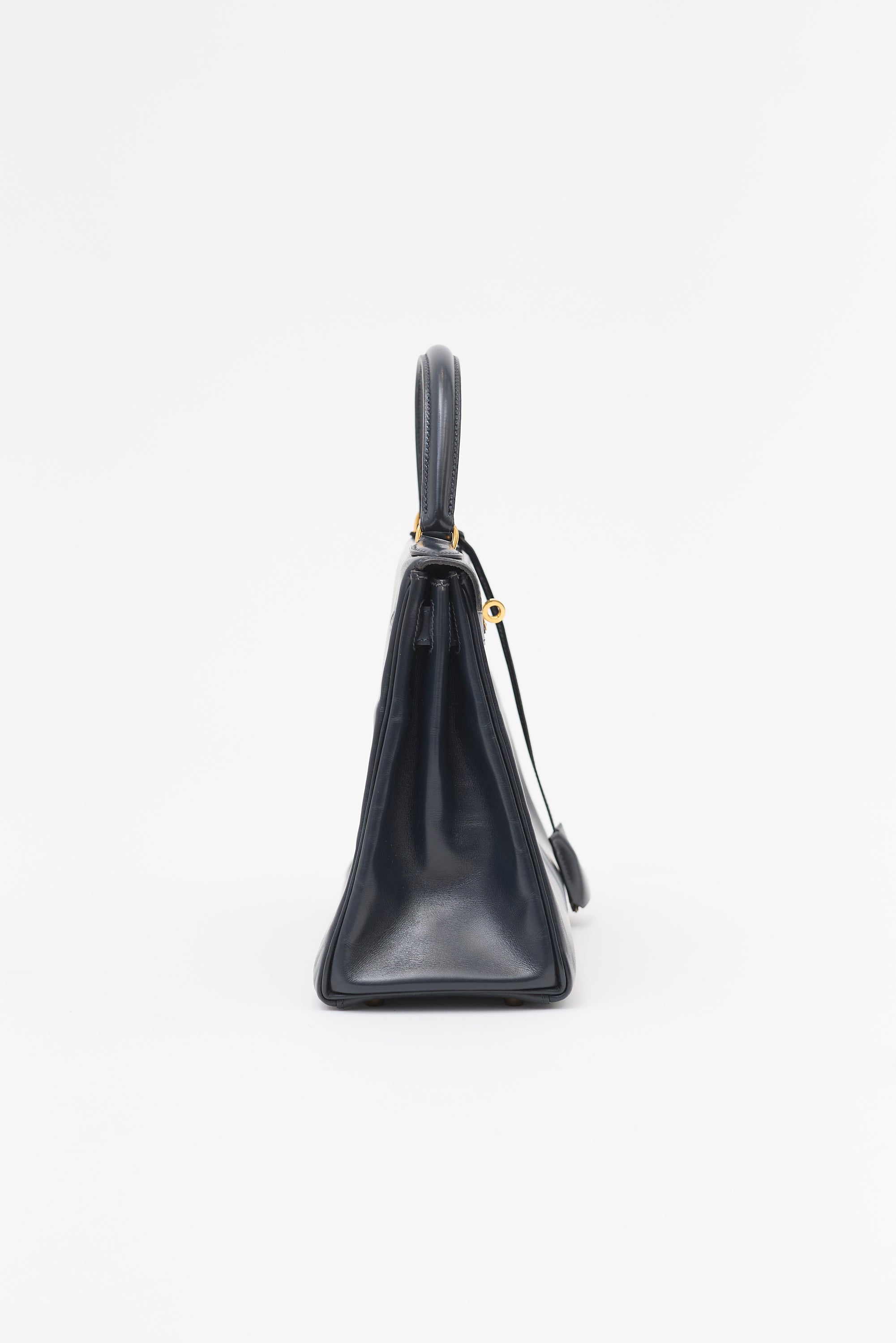Pre-owned Hermès vintage Kelly Retourne 28 bag in Navy Box leather featuring single rolled top handle, gold plated hardware, gold stamped logo under flap, side belt detail, signature twist lock closure, logo engraved plaque, four clou, detachable keys and clochette, and one main compartment with two slip pockets and one zip pocket.