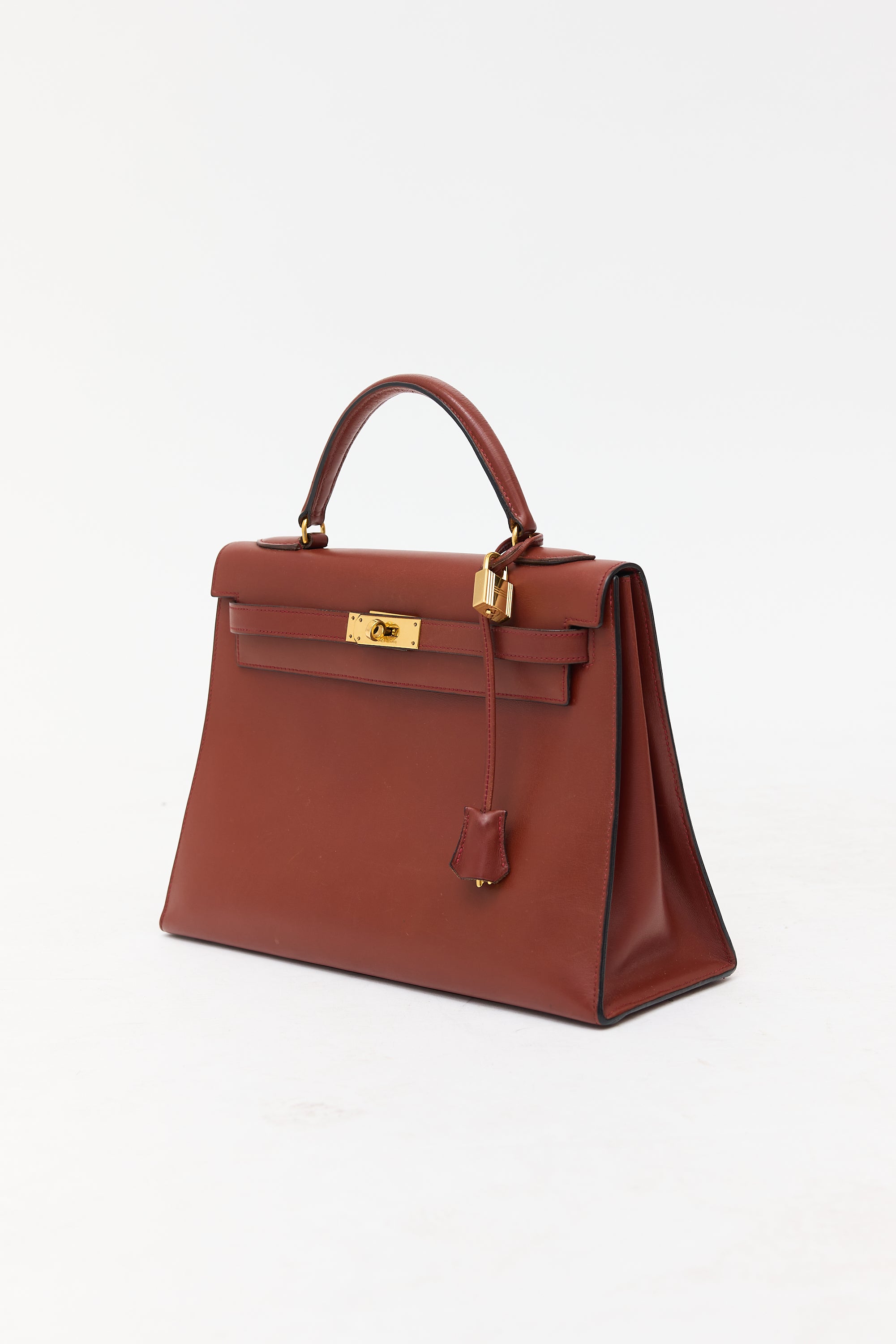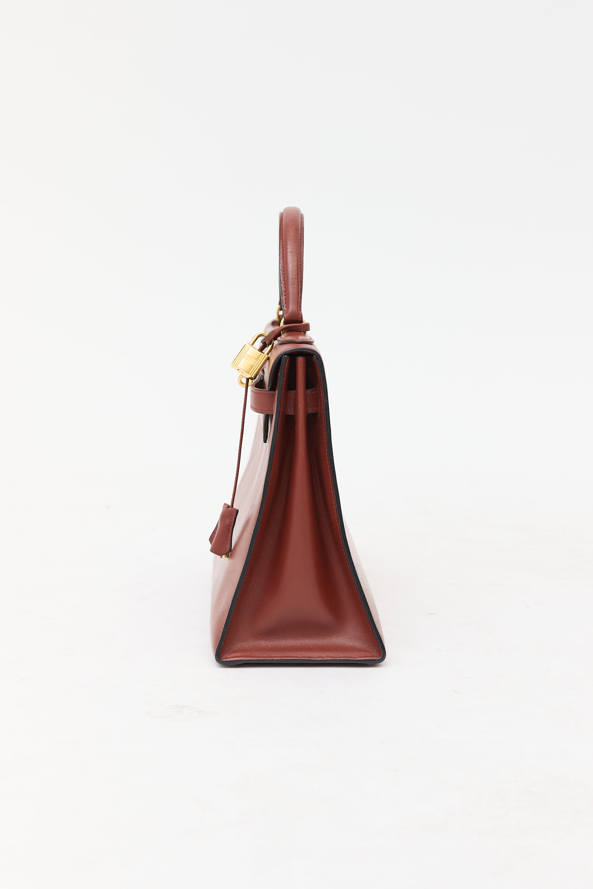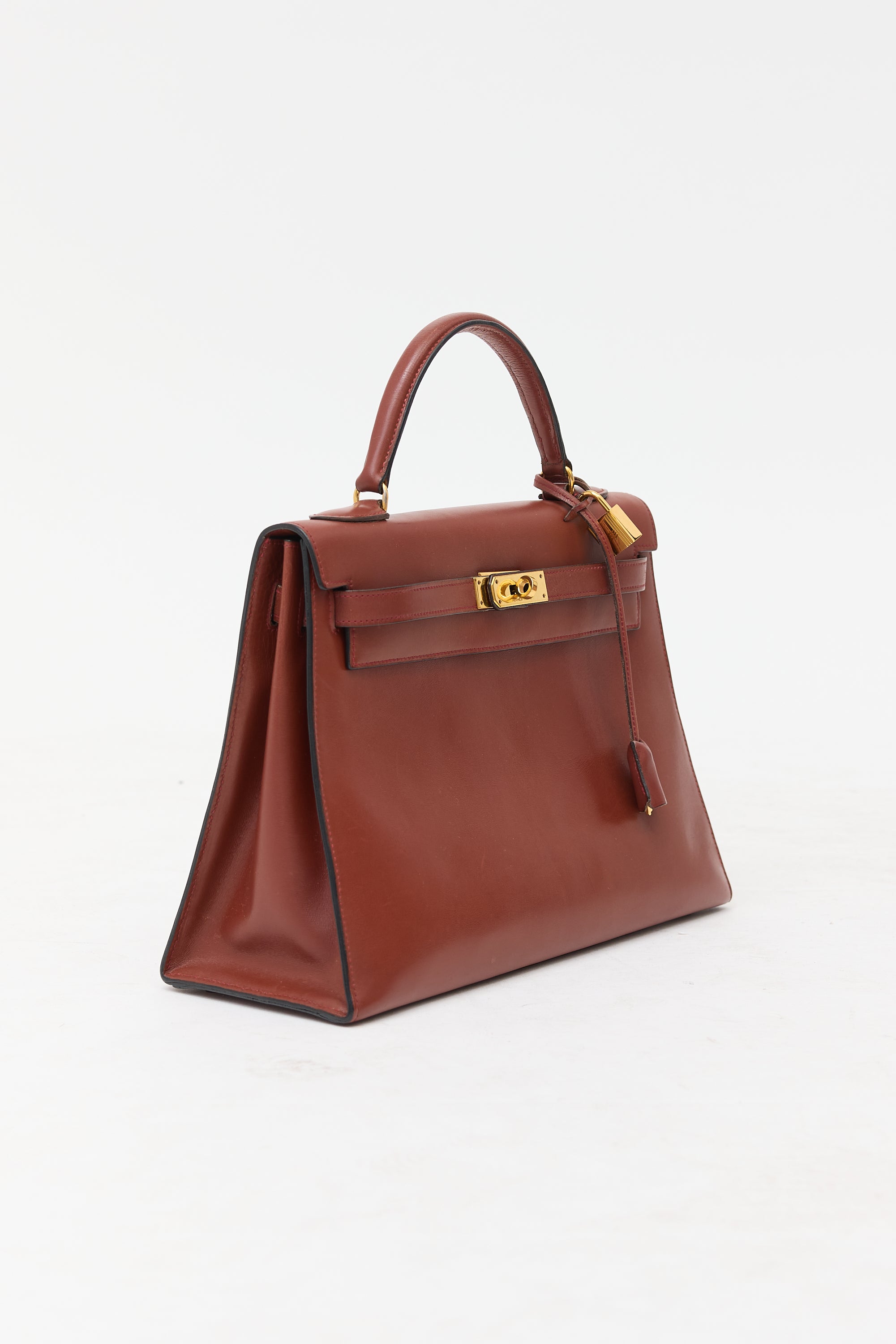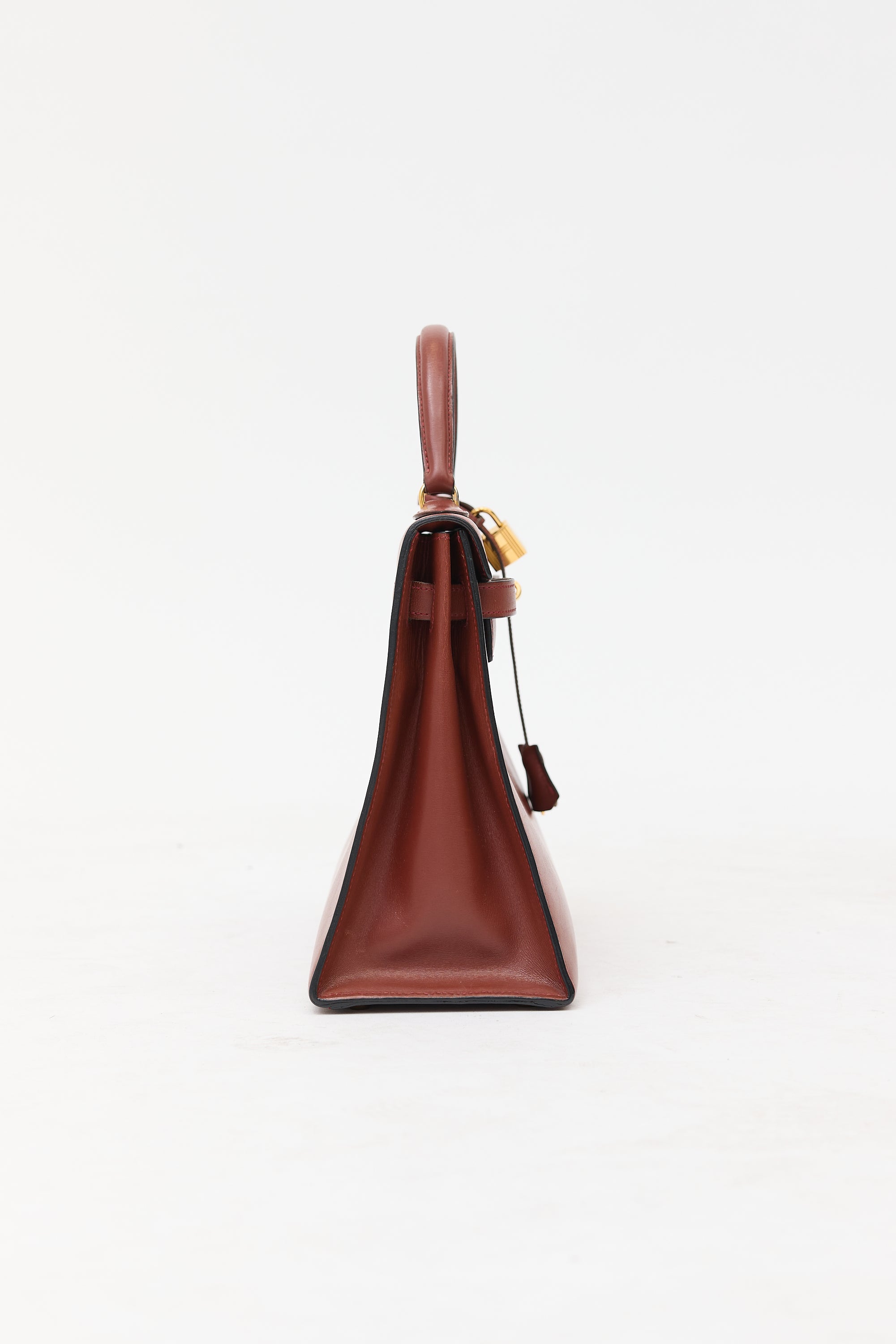 Pre-owned Hermès vintage Kelly Sellier 32 bag in Sienne Box leather featuring single rolled top handle, gold plated hardware, gold stamped logo under flap, side belt detail, signature twist lock closure, logo engraved plaque, four clou, detachable keys and clochette, Verso Canelle interior, and one main compartment with two slip pockets and one zip pocket.