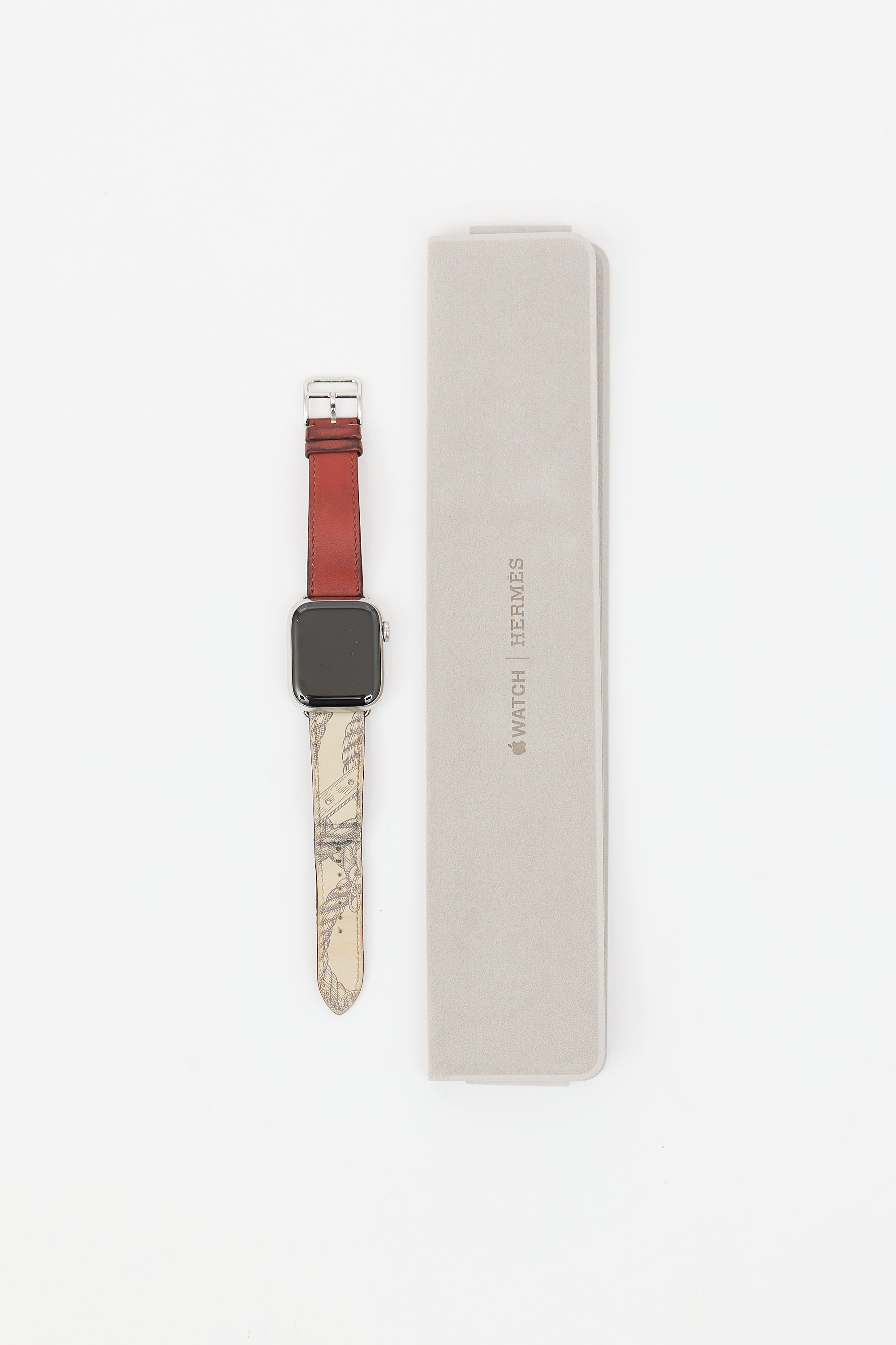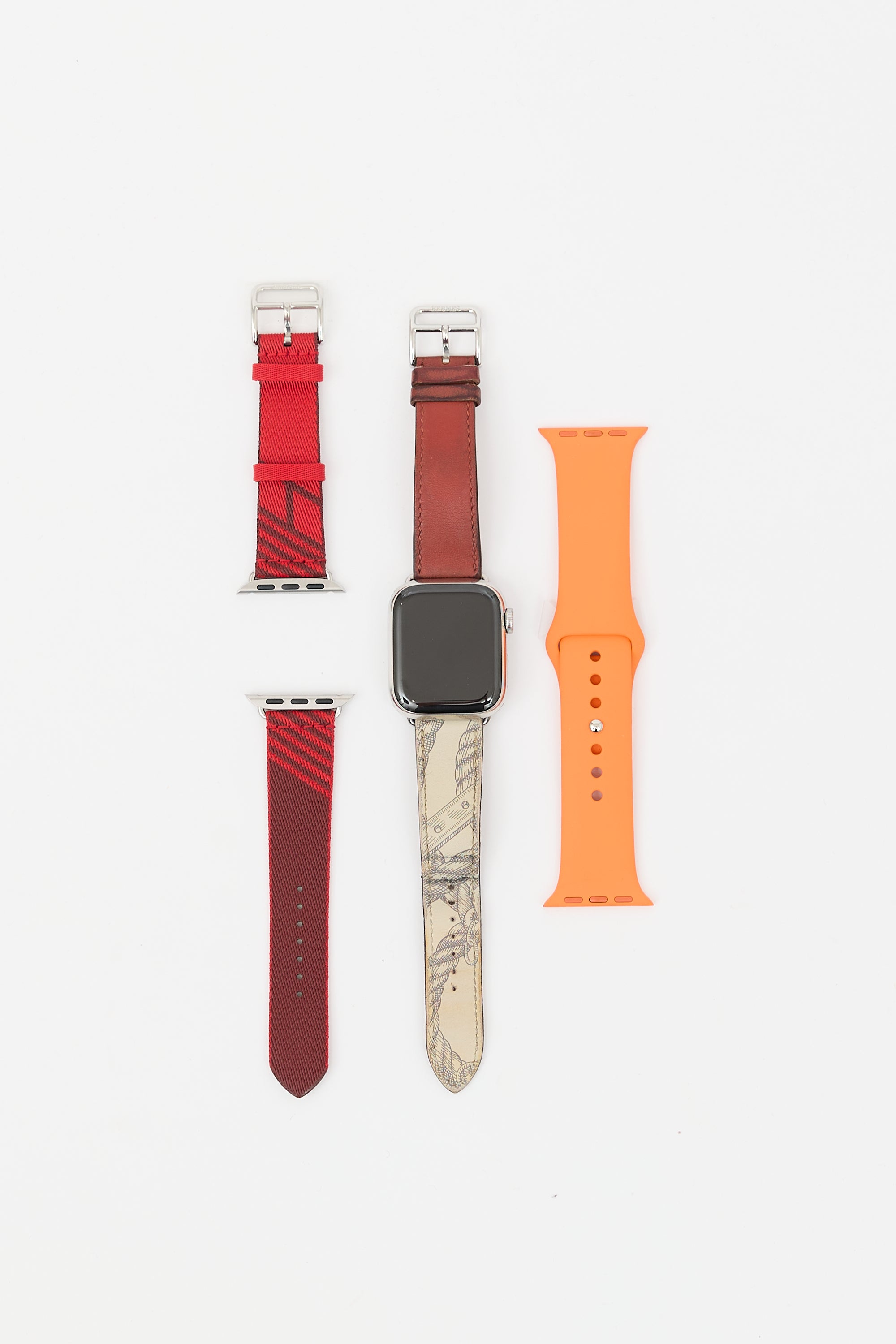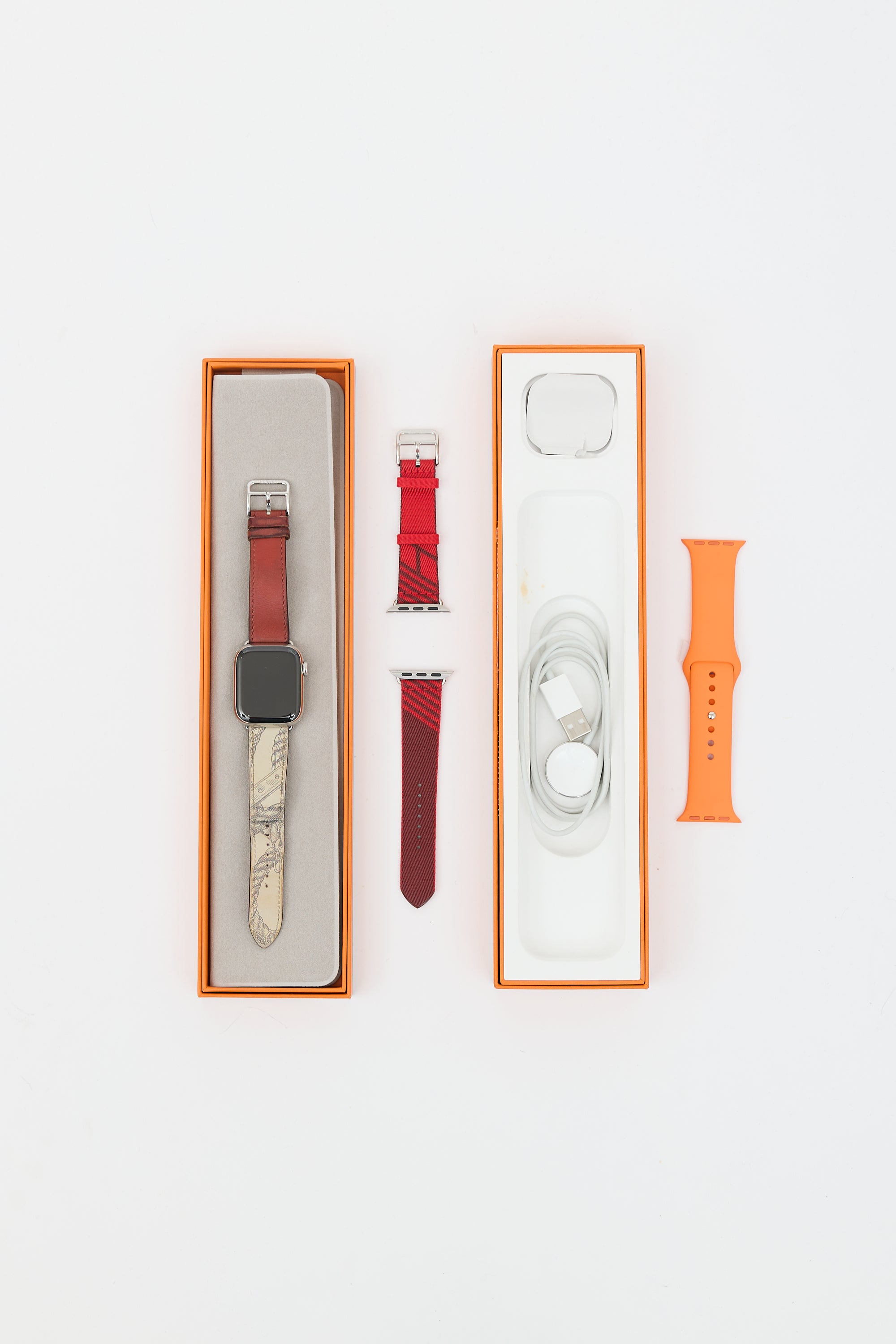 Pre-owned Apple x Hermès Series 7 41mm watch featuring stainless steel hardware, GPS, water resistant up to 50 metres, 64-bit dual-core processor, 32 GB memory, and W3 apple wireless chip. Kit includes brown and beige leather straps with rope motif, red printed canvas straps, soft pouch, orange rubber strap, and charging port with USB-A port. Comes with original box.
