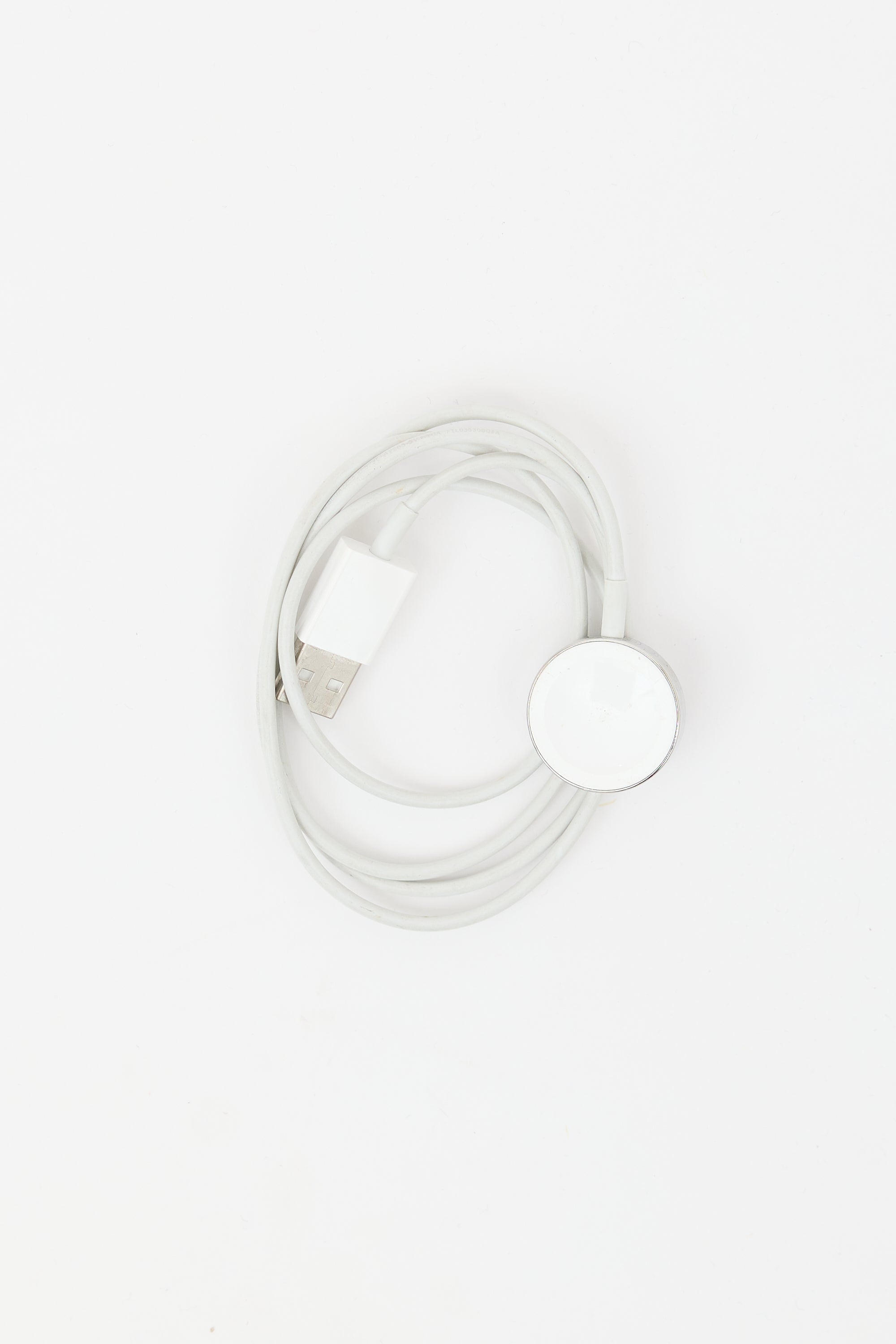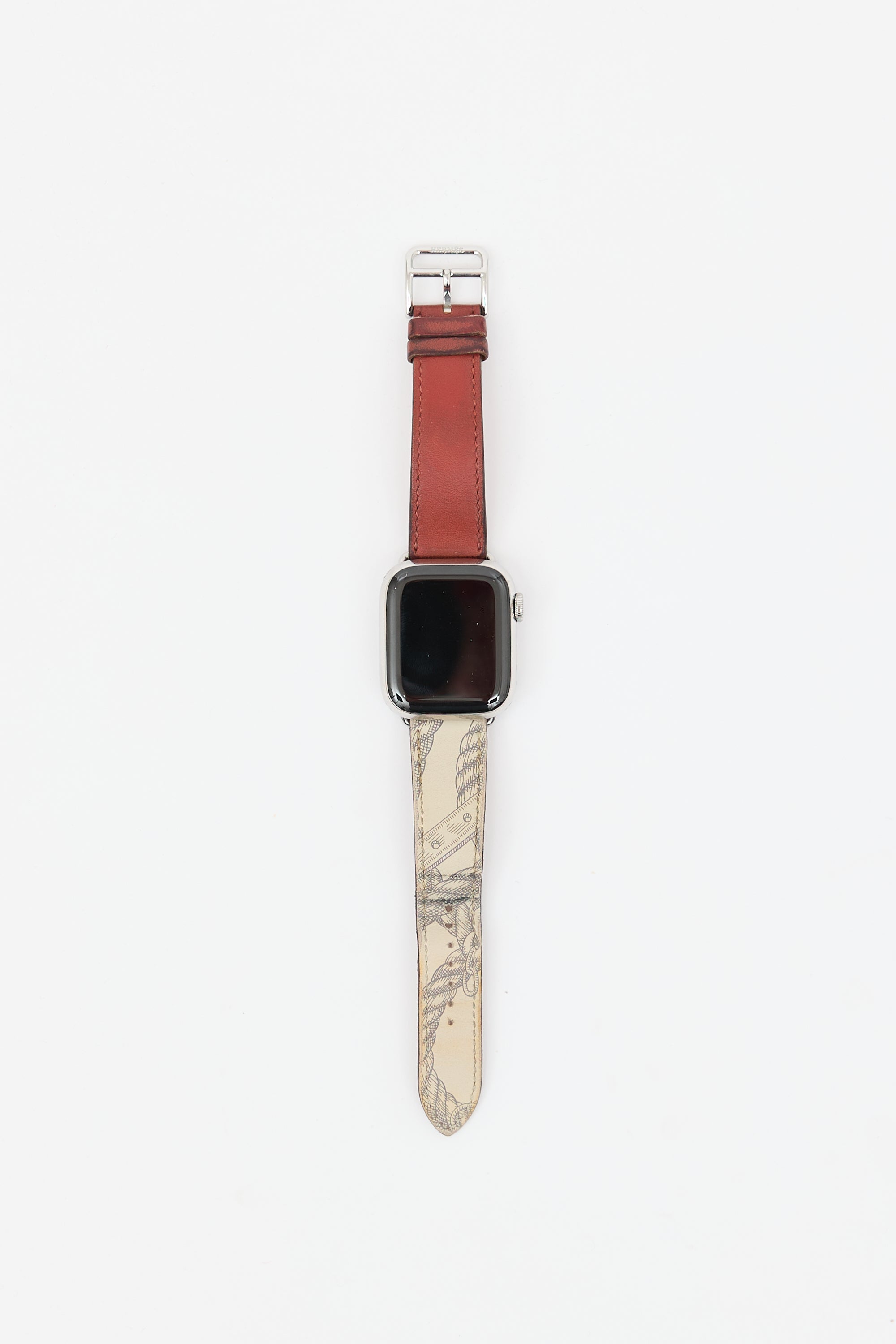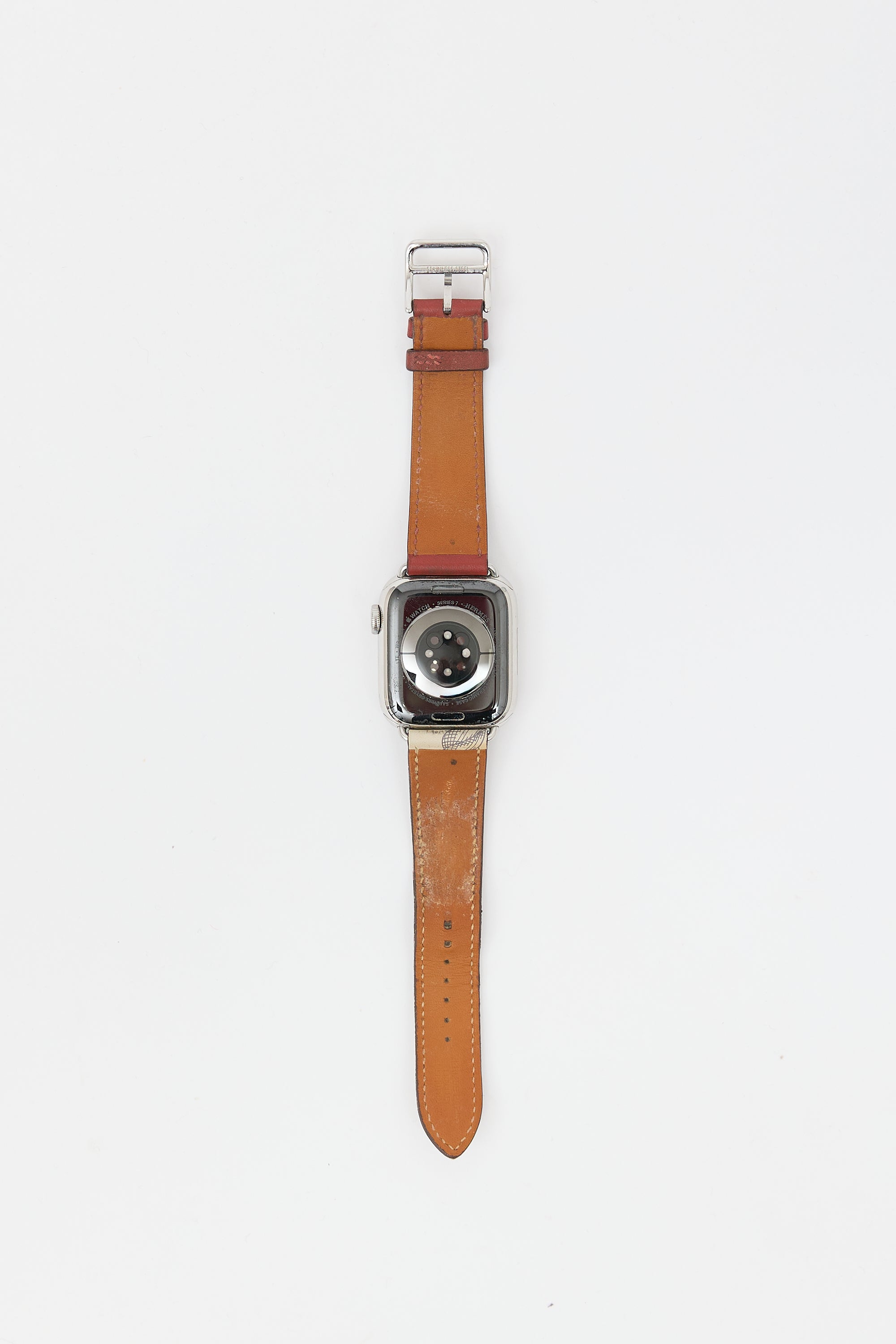 Pre-owned Apple x Hermès Series 7 41mm watch featuring stainless steel hardware, GPS, water resistant up to 50 metres, 64-bit dual-core processor, 32 GB memory, and W3 apple wireless chip. Kit includes brown and beige leather straps with rope motif, red printed canvas straps, soft pouch, orange rubber strap, and charging port with USB-A port. Comes with original box.
