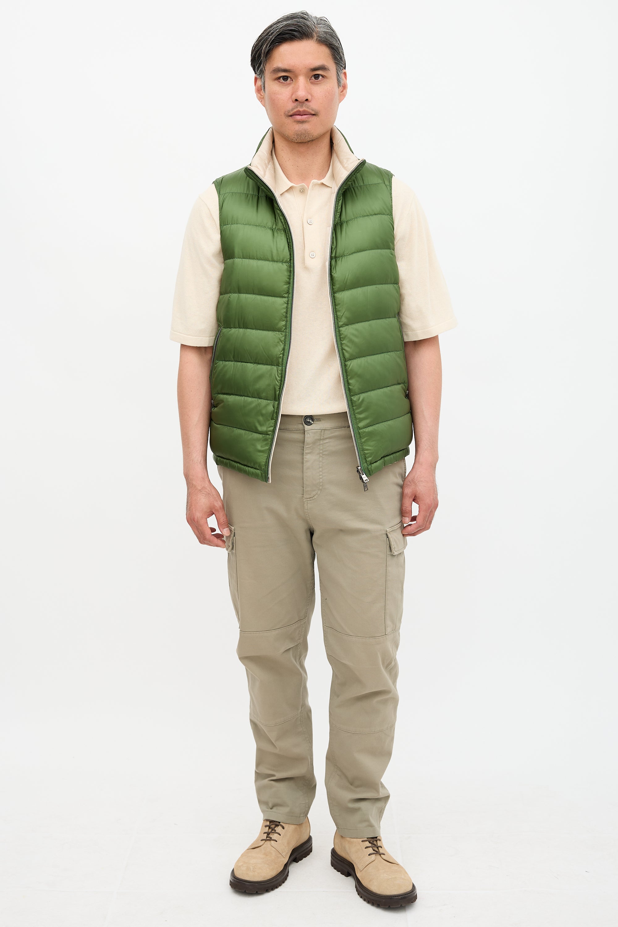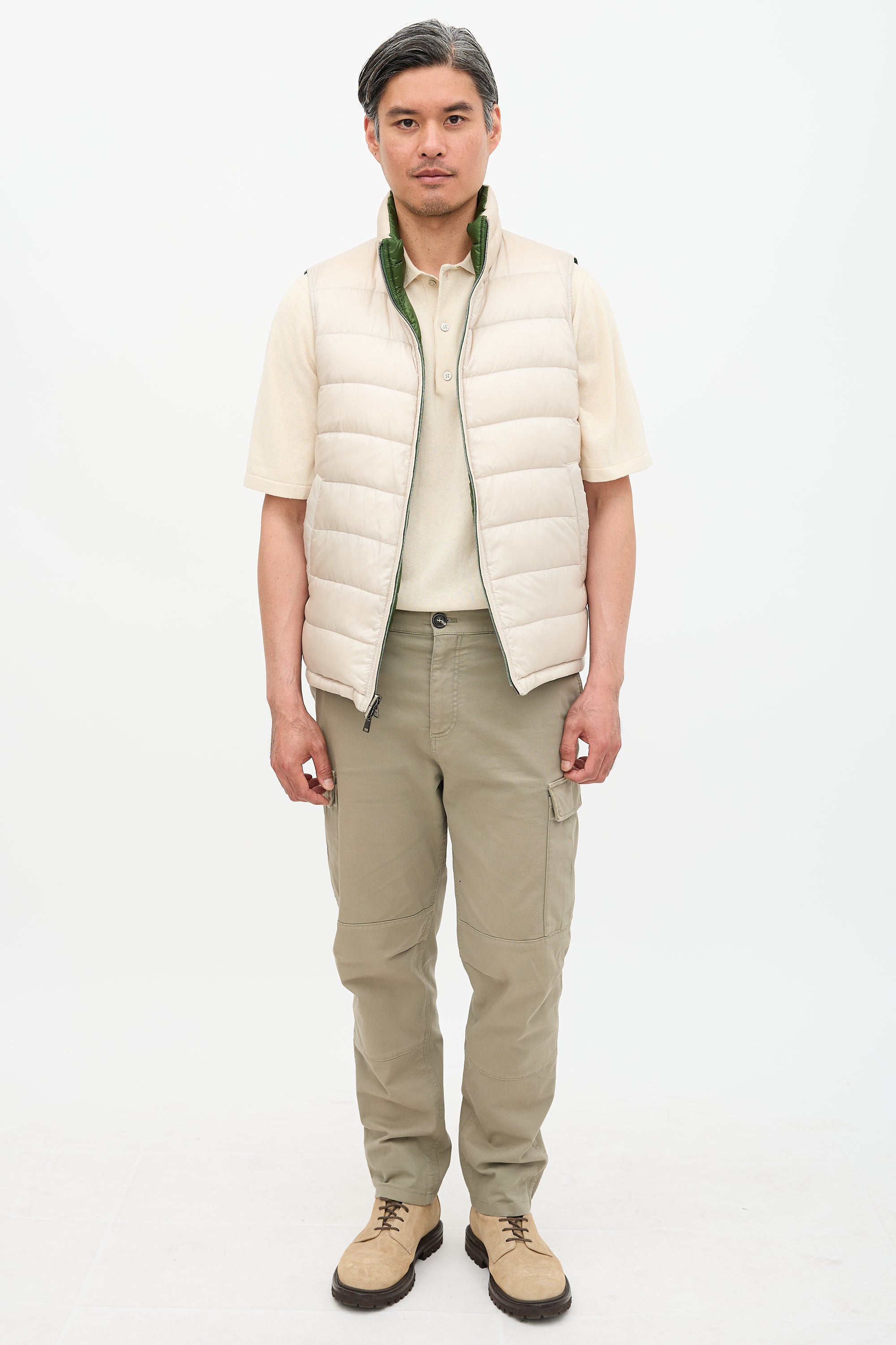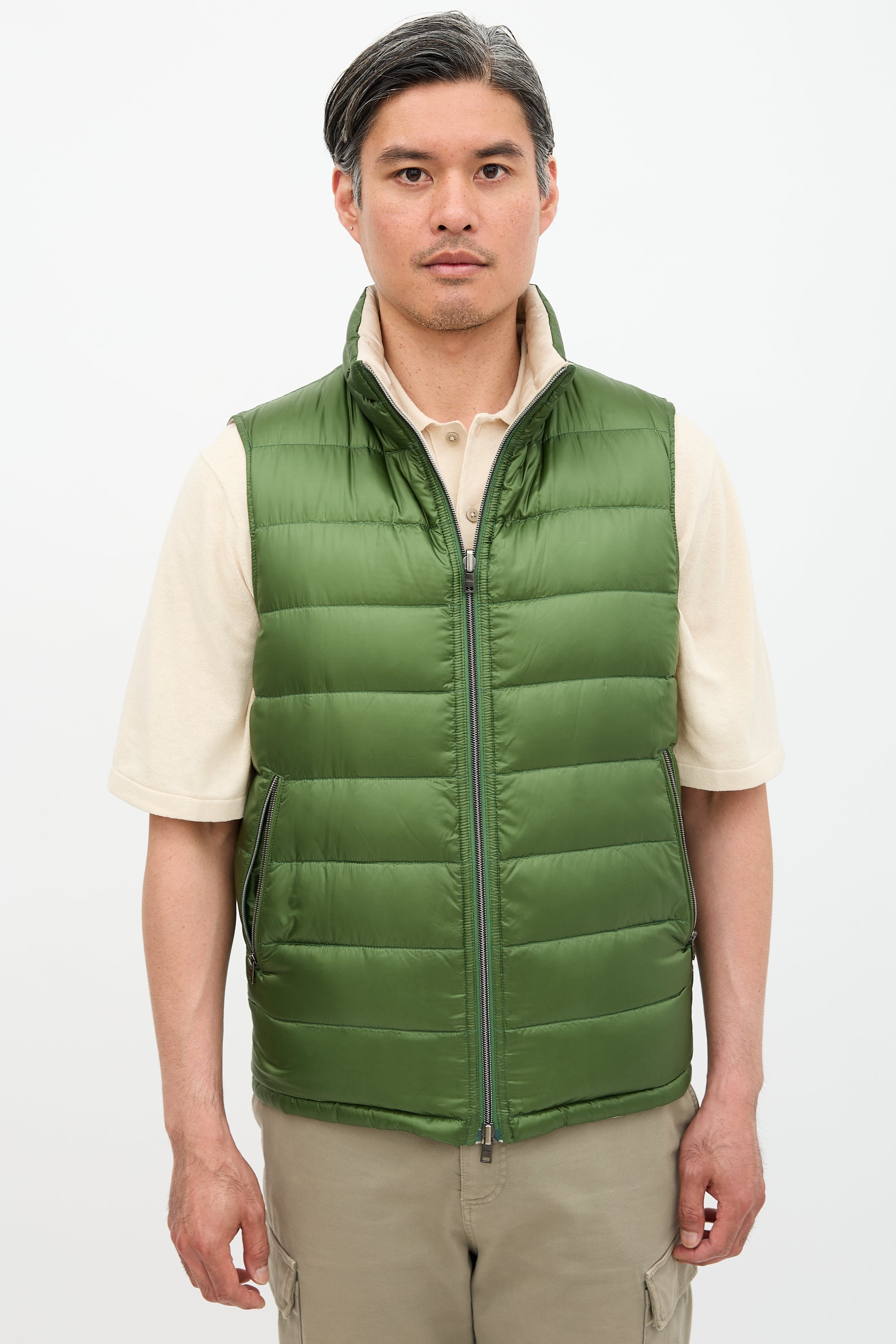 Pre-owned Herno beige and green reversible puffer vest featuring stand collar, double zip pockets, and two pockets at exterior and reverse. Padded and lined.