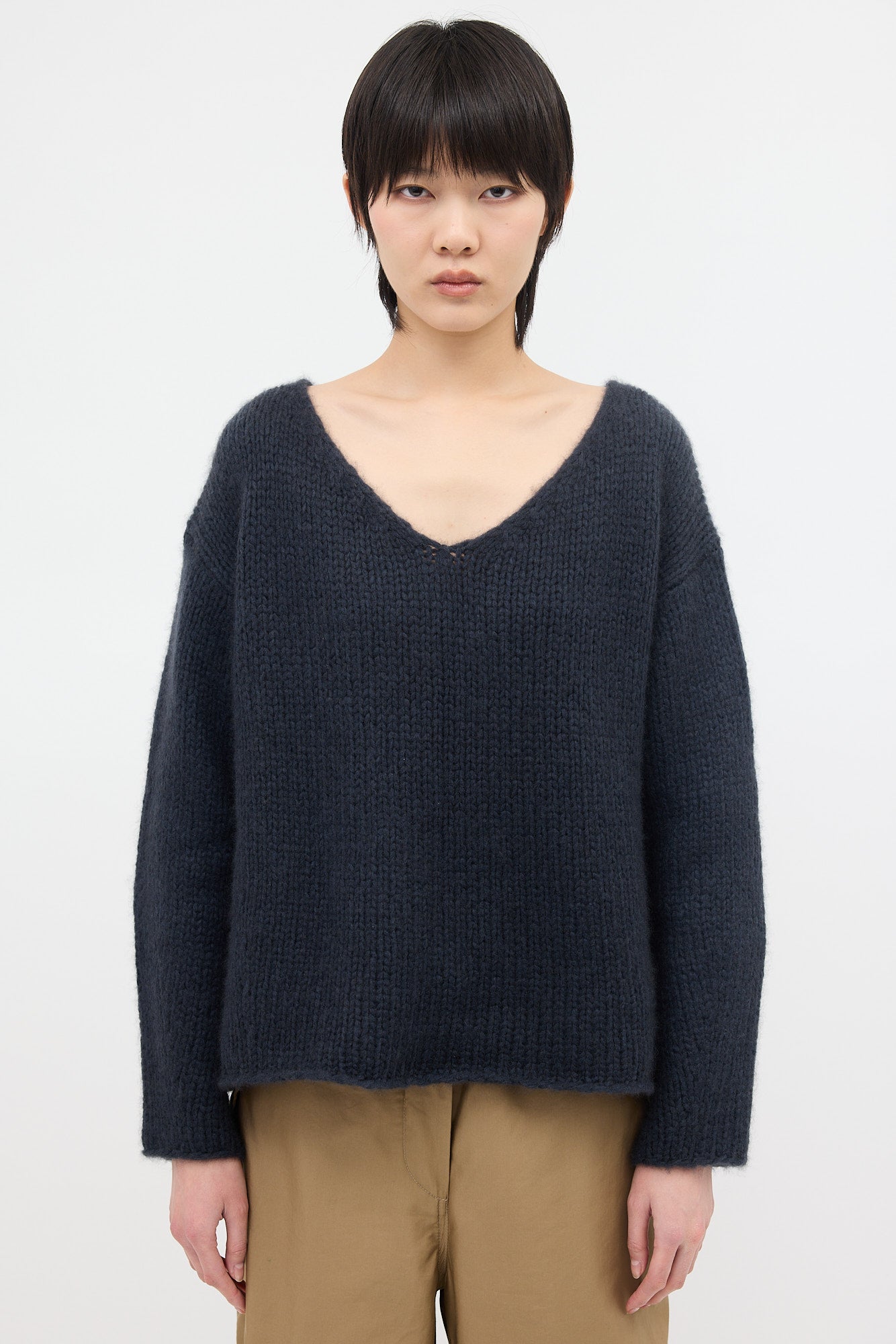 Pre-owned Iris Von Arnim navy cashmere and silk sweater featuring a V-neckline, dropped shoulder, and boxy silhouette.