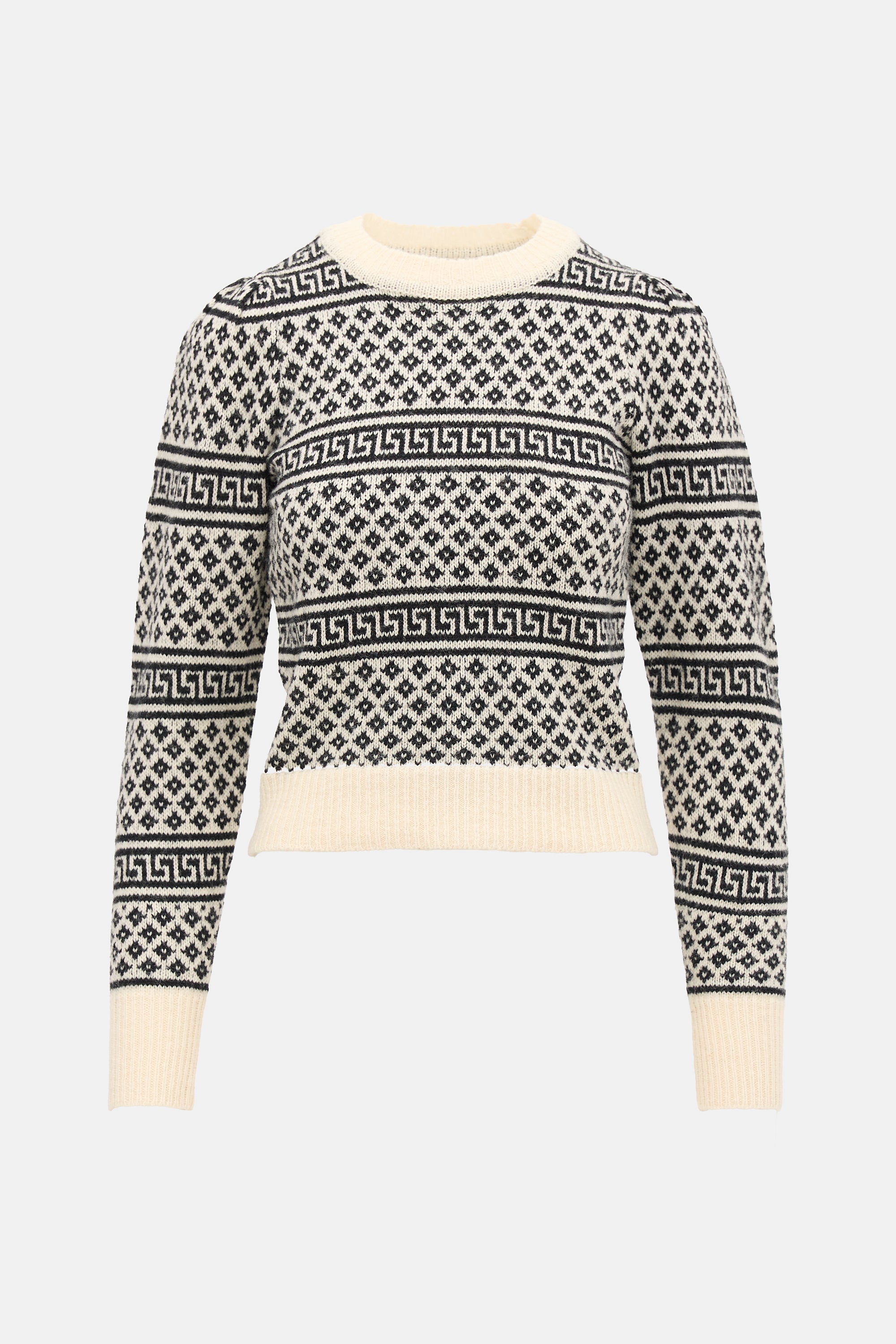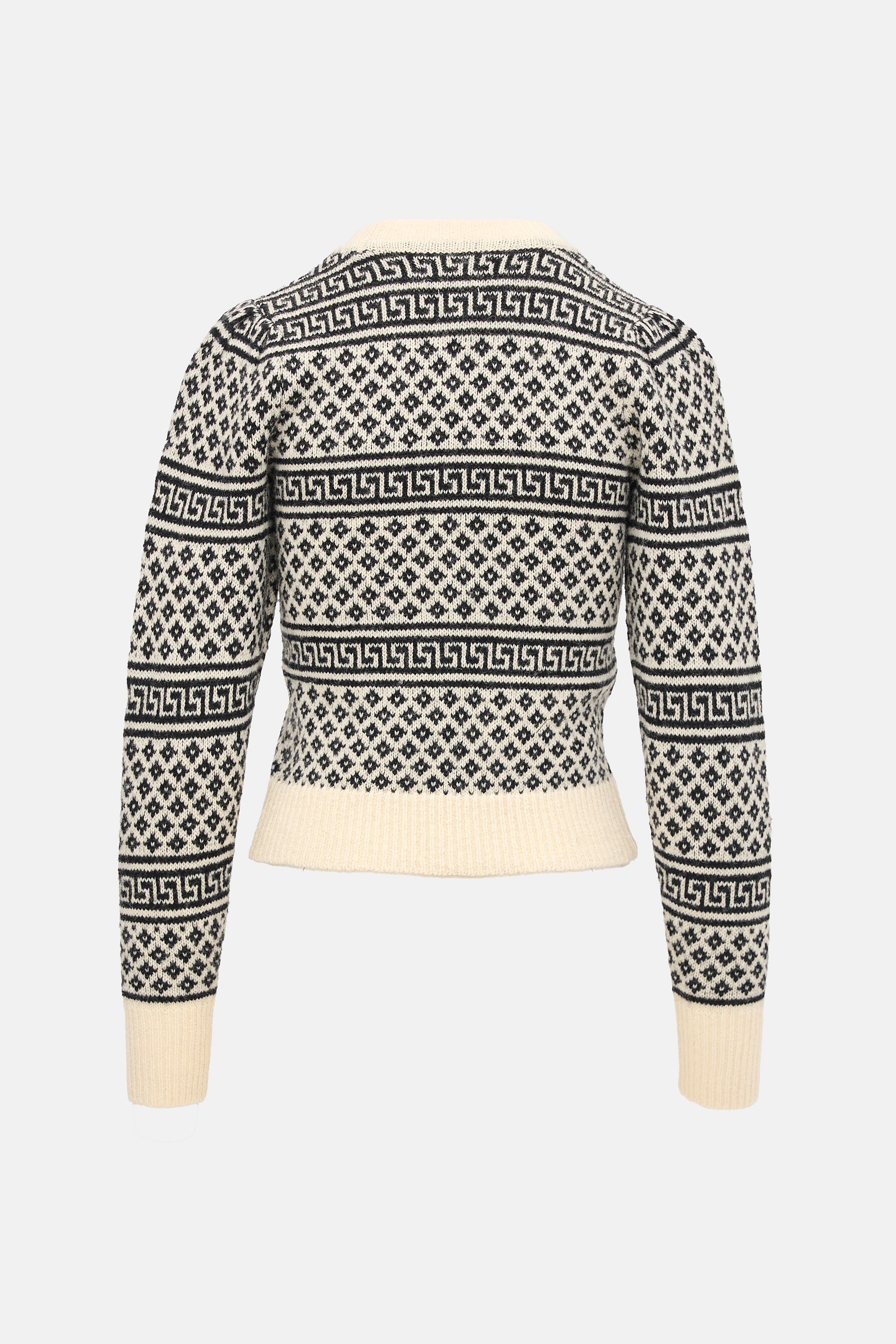 Pre-owned Isabel Marant Étoile black and cream wool Newton sweater featuring geometric intarsia pattern, shoulder pleat detail, and ribbed collar, hem, and cuffs.