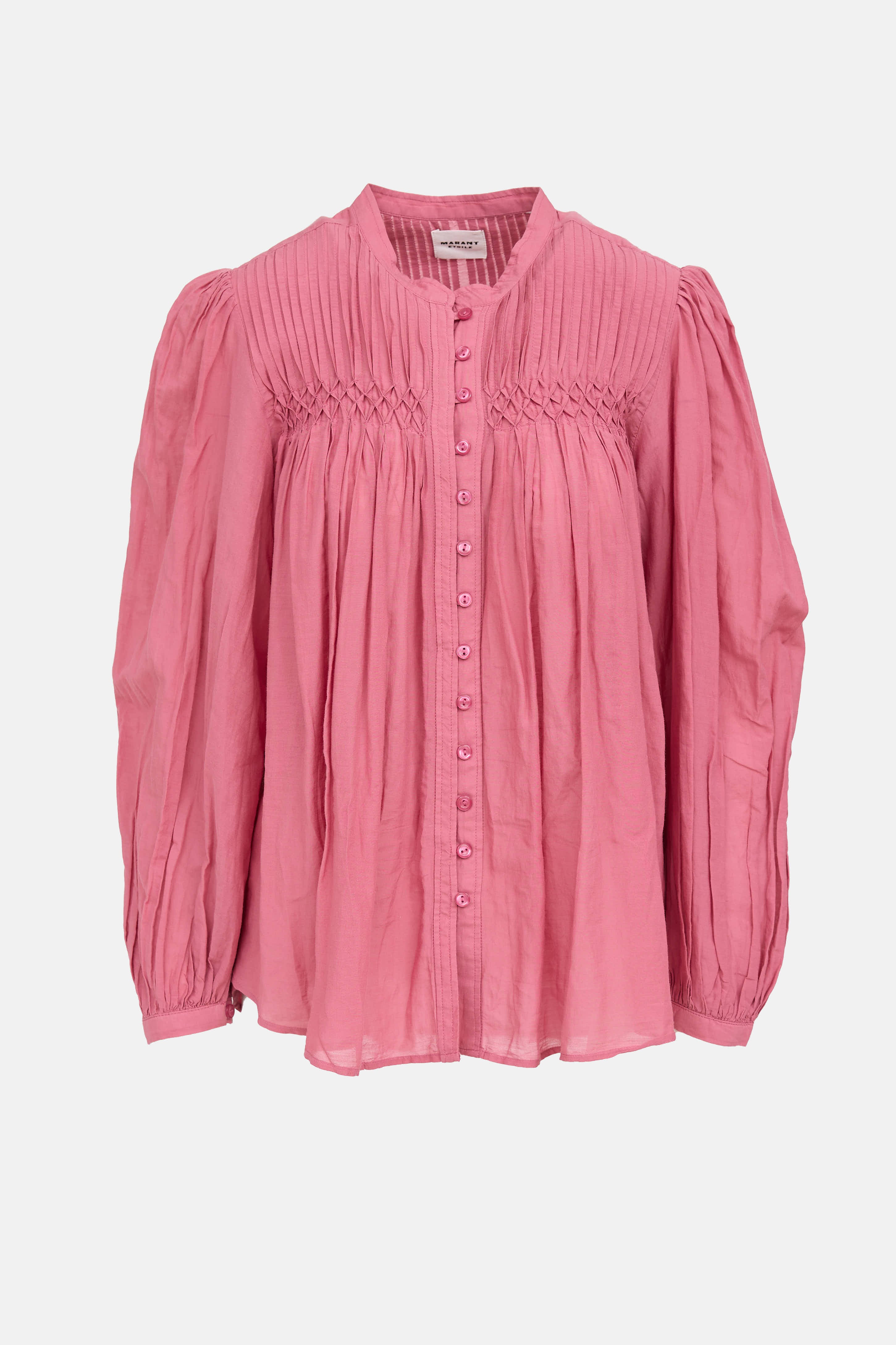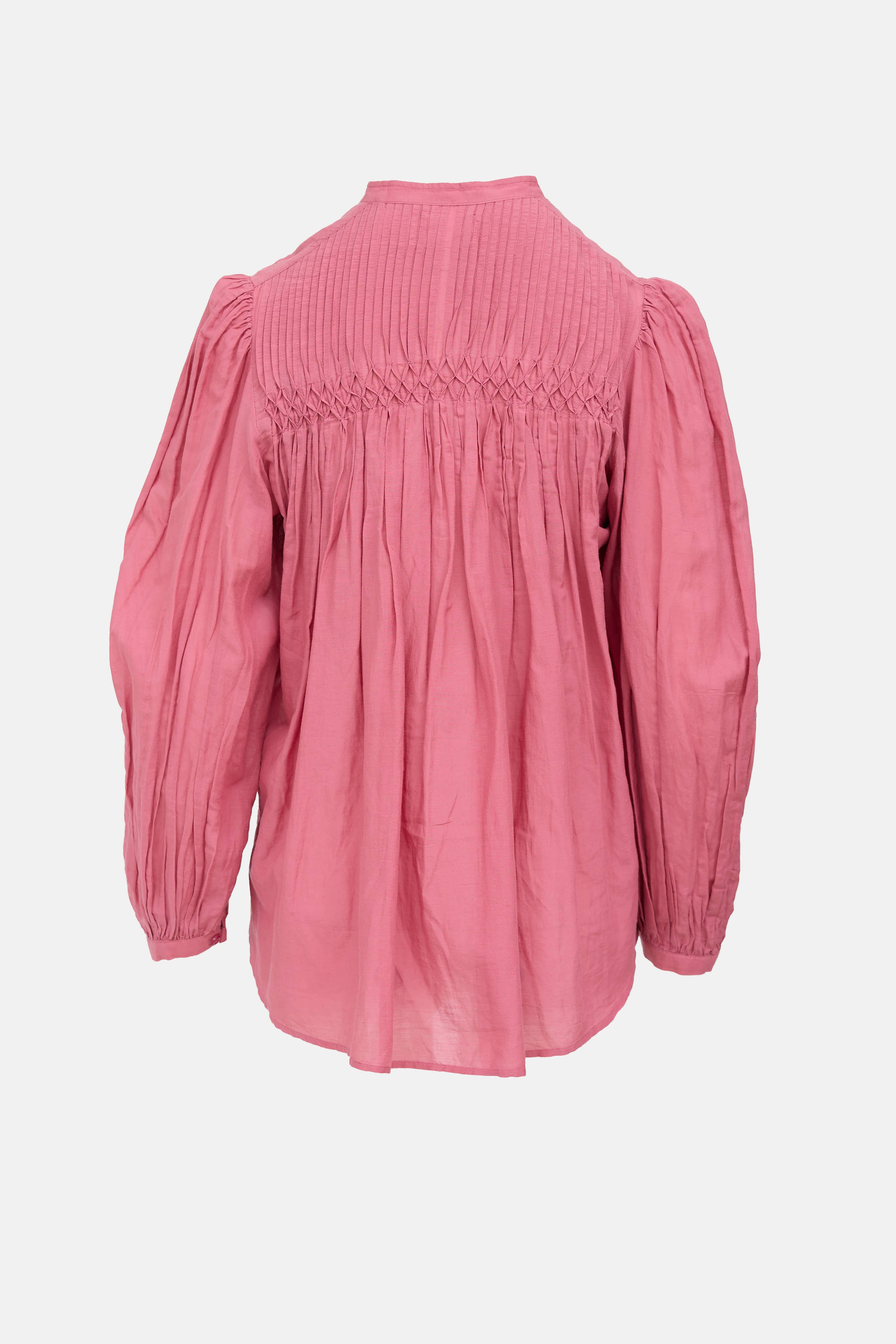 Pre-owned Isabel Marant Étoile pink top featuring a round neckline, long sleeves with gathered shoulders, pleated bust, and button up closure.