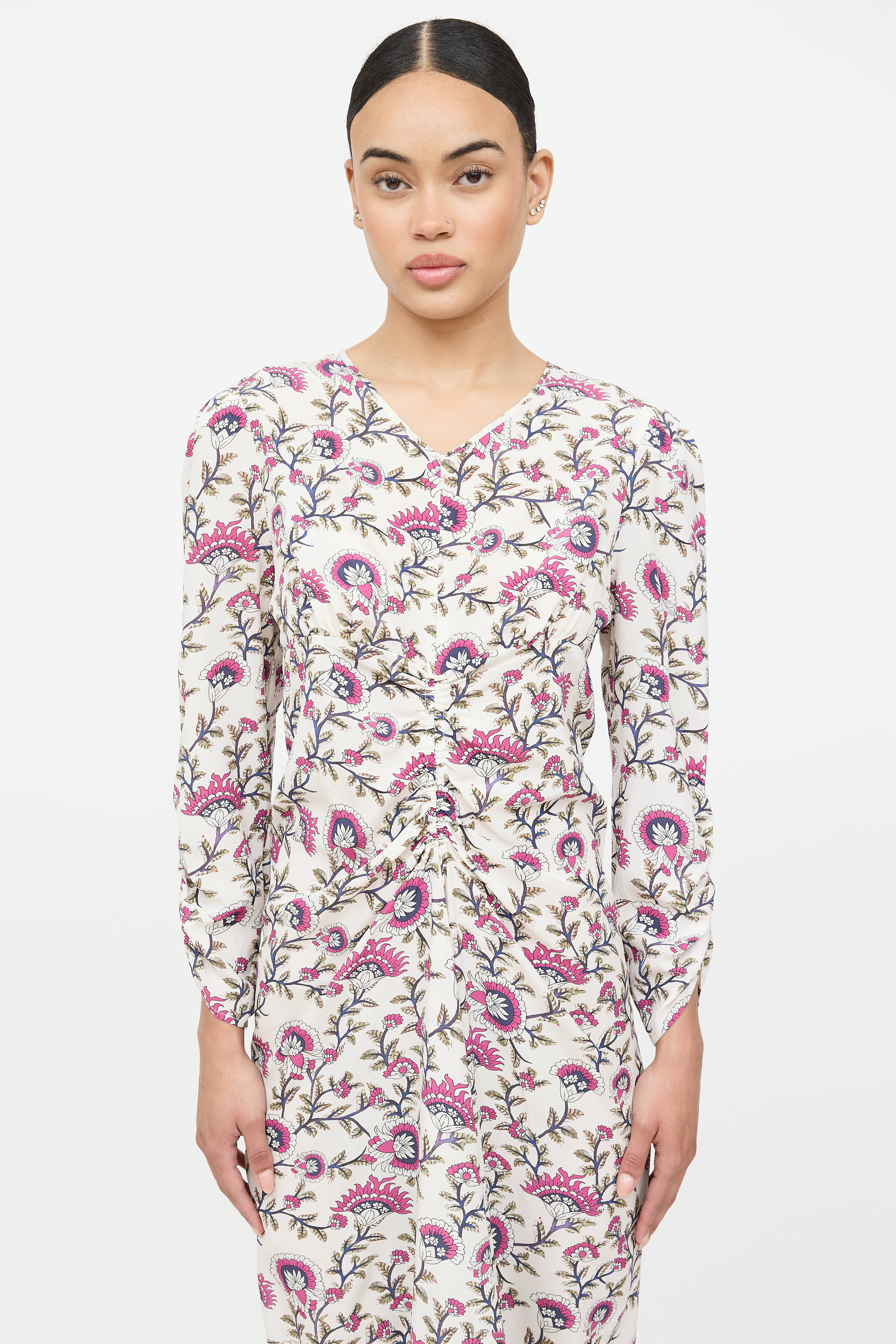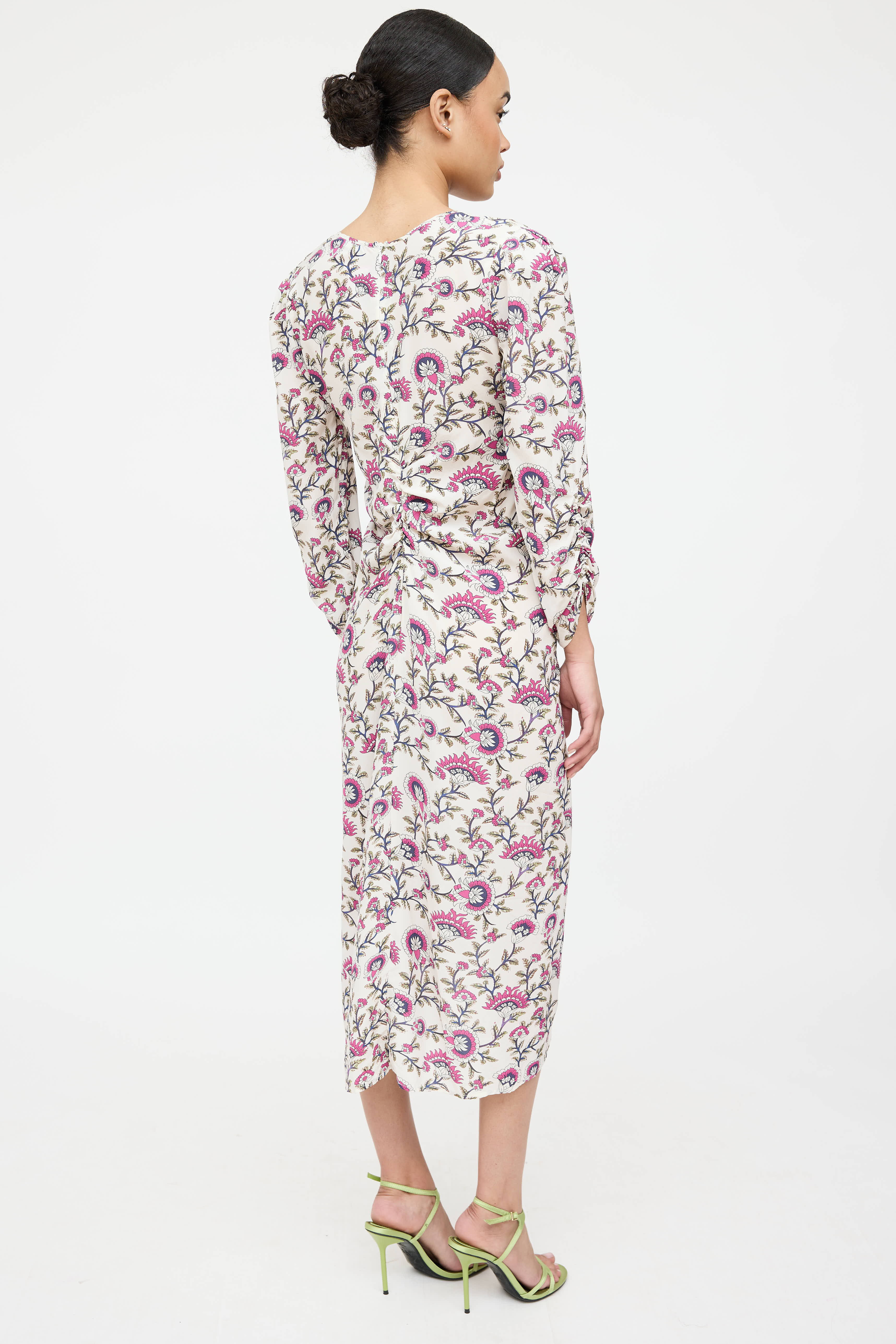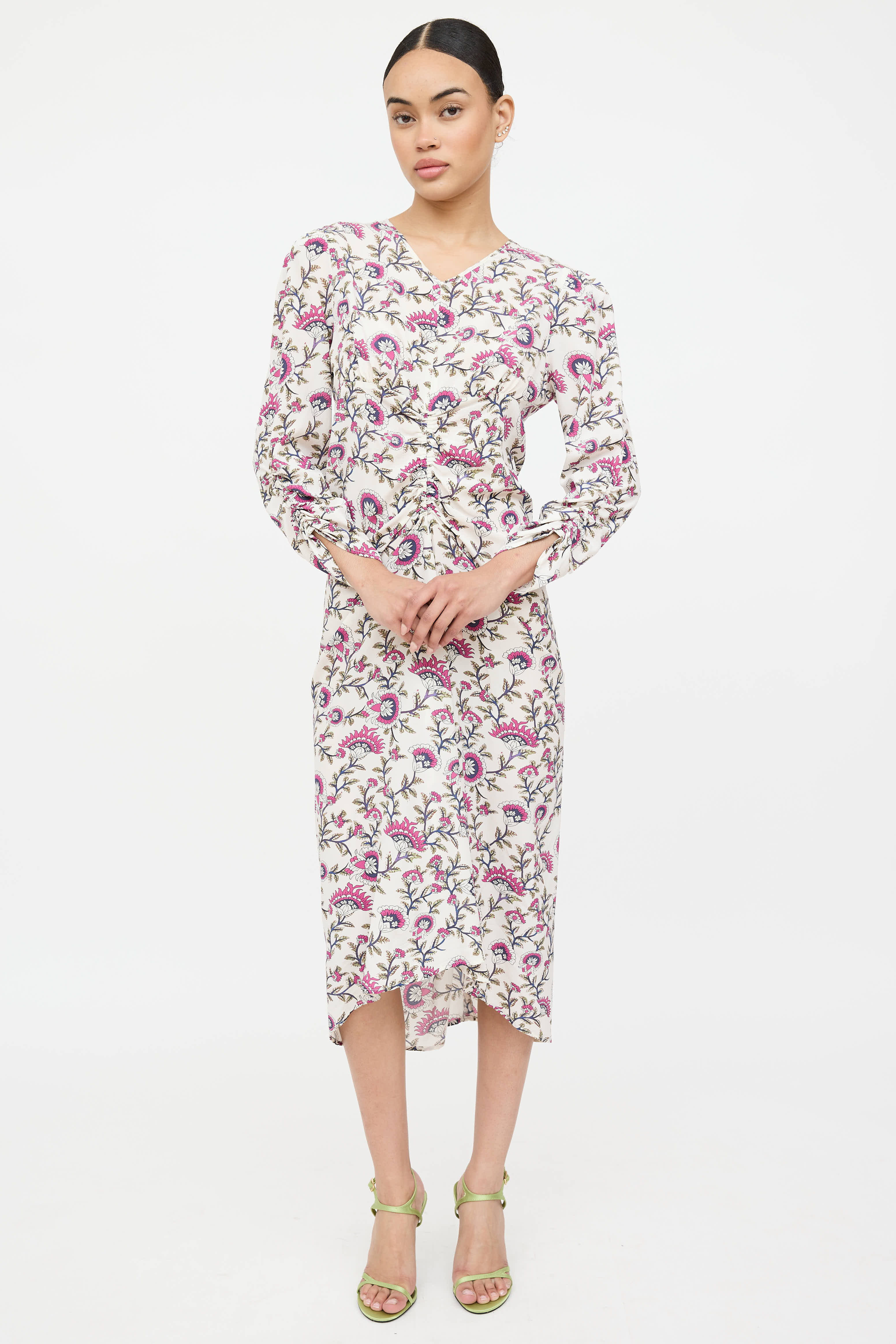 Pre-owned Zimmermann cream and multicolor floral Albini long sleeve dress featuring v-neckline, ruching at front, back and at sleeves, and concealed zip at back.