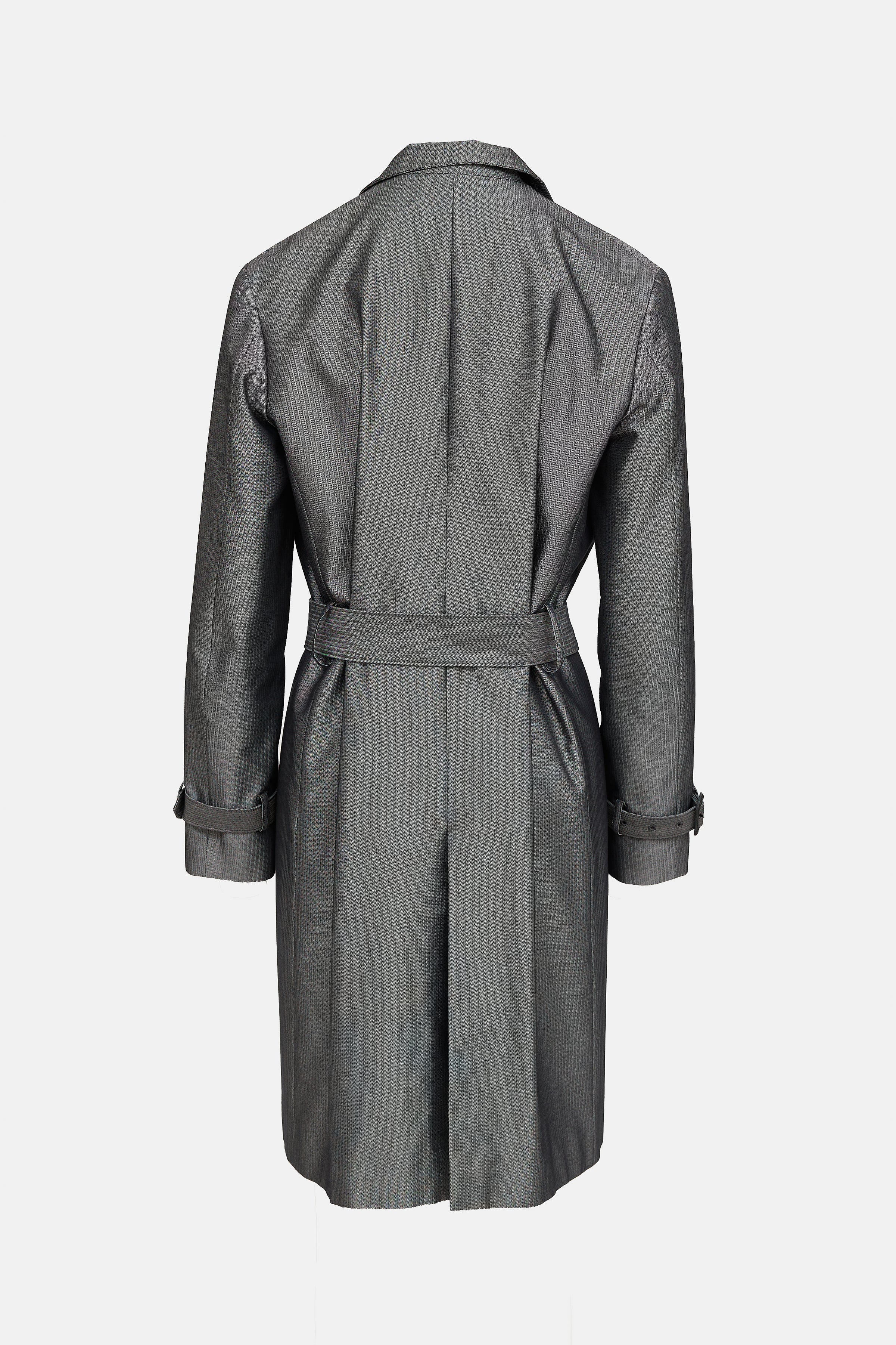 Issey Miyake Fete grey long sleeve coat featuring shawl collar, double breasted front, slip pocket at side, adjustable belt at waist, slit at back hemline, and straps at cuffs. Lined.
