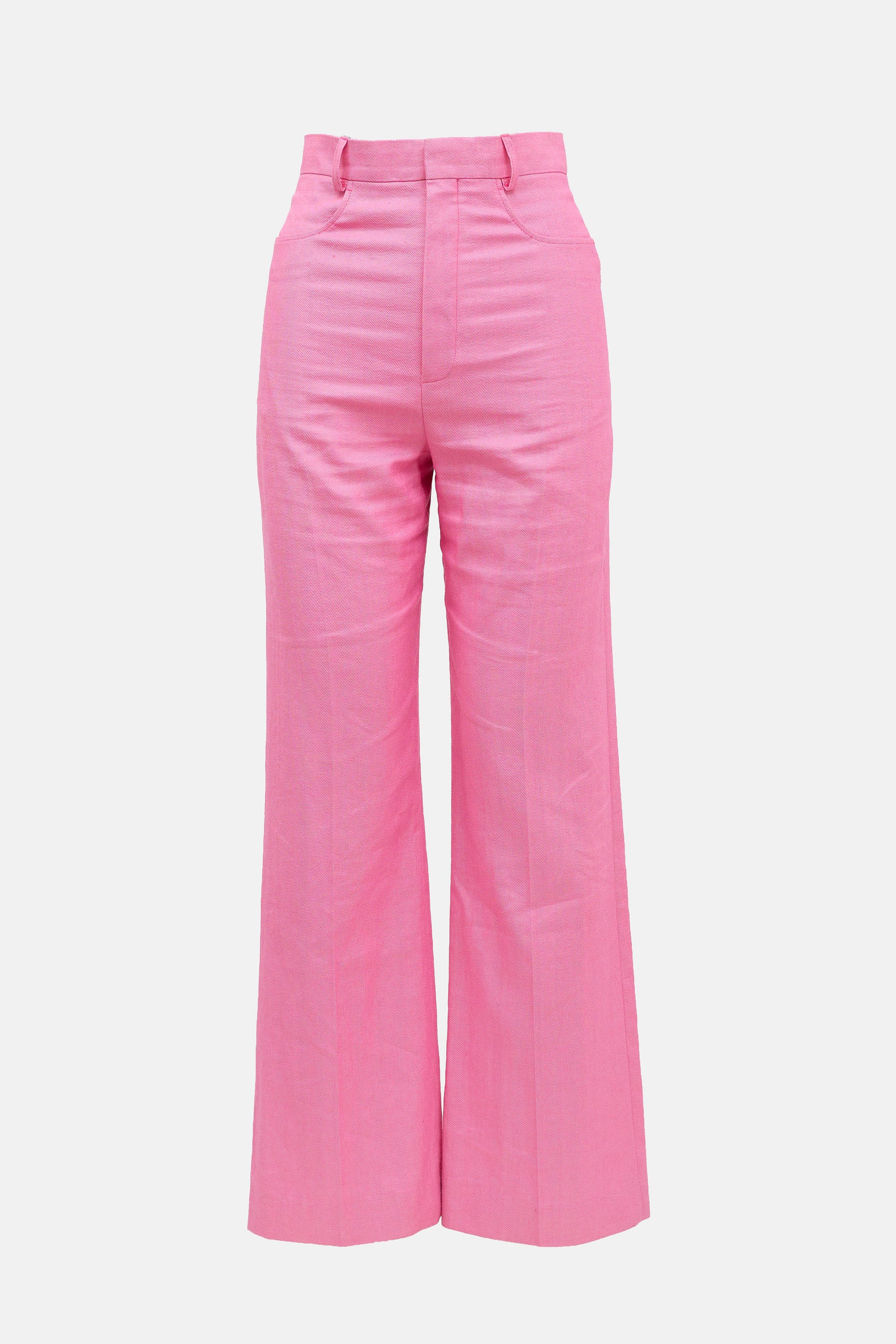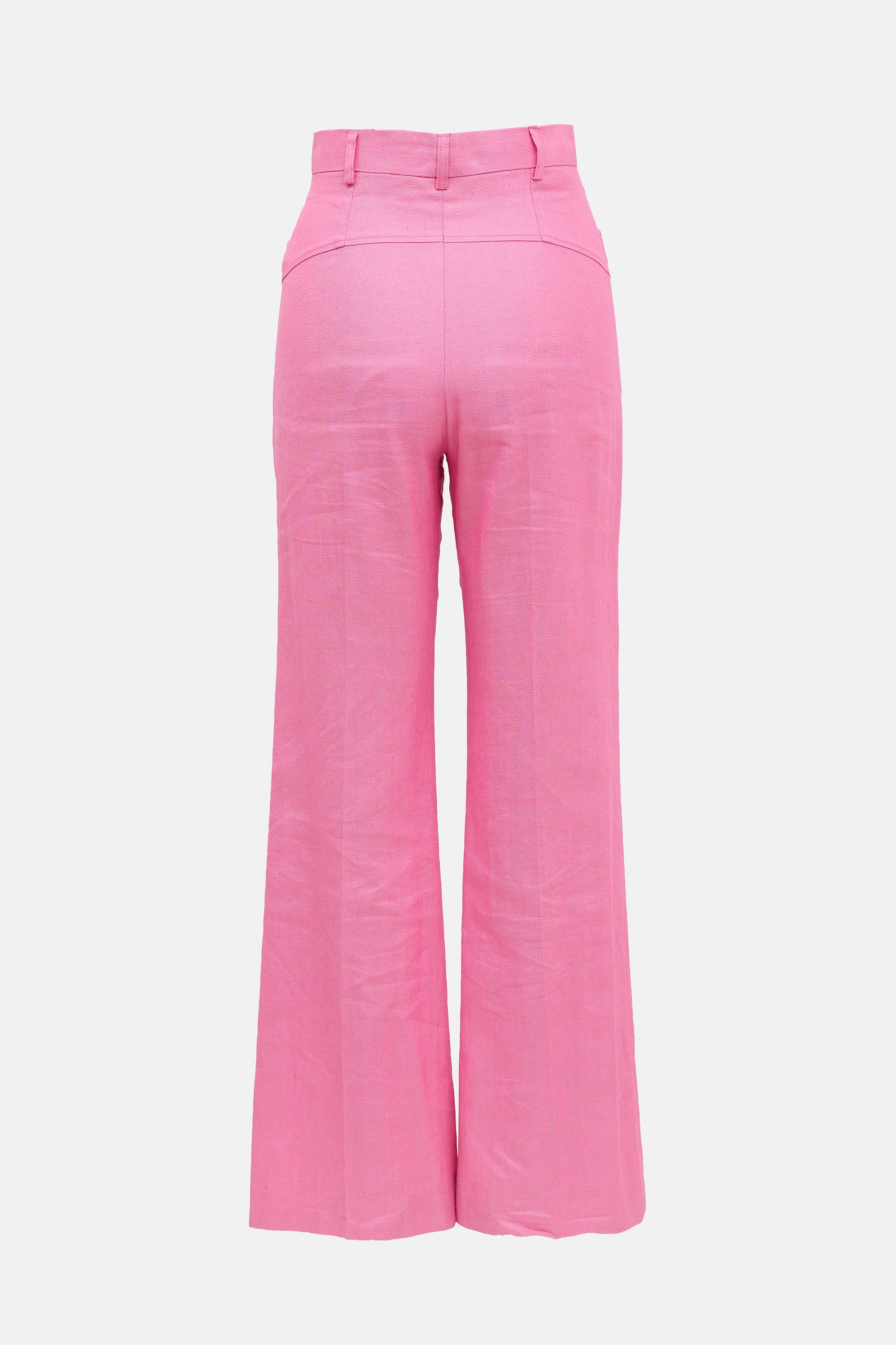Pre-owned Jacquemus pink linen blend Le Splash trousers featuring a high rise, zip fly with hook and eye fastening, two pocket styling, and wide leg.