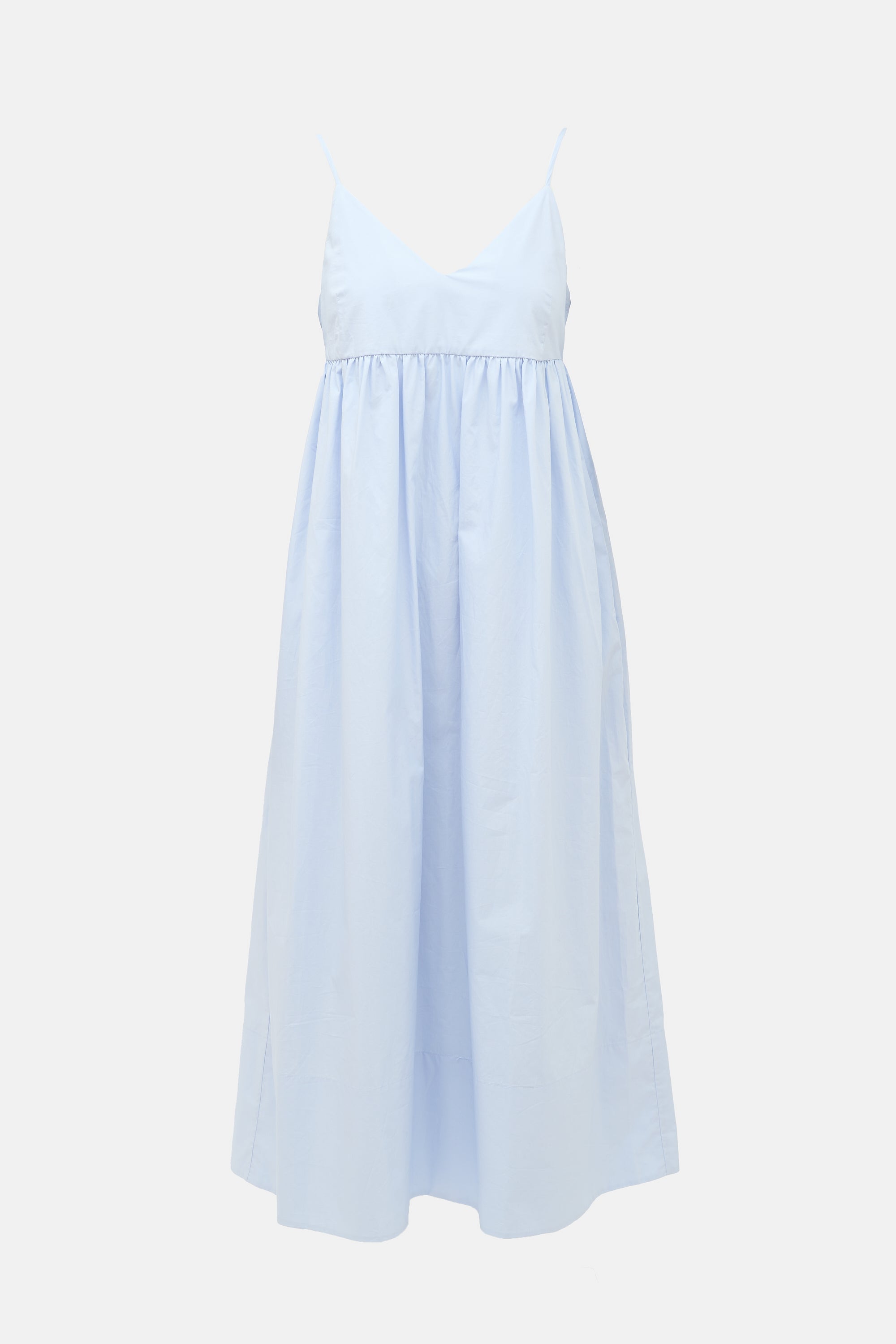Pre-owned Jenni Kayne light blue cotton Cove dress featuring adjustable spaghetti straps, V-neckline, gathered waist, and two inseam pockets at hip. Lined.