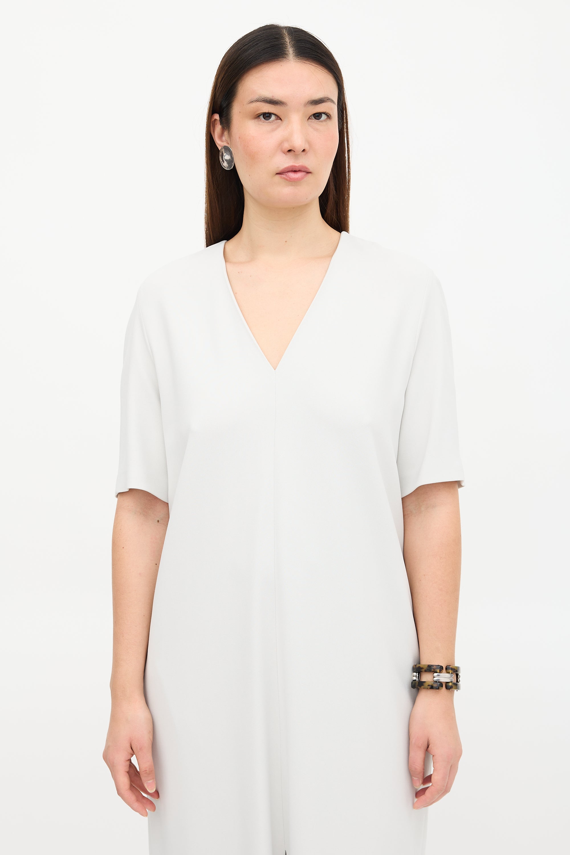 Pre-owned Joseph grey crepe midi dress featuring a V-neckline, cut-out at back, two inseam pockets, and centre front vent.