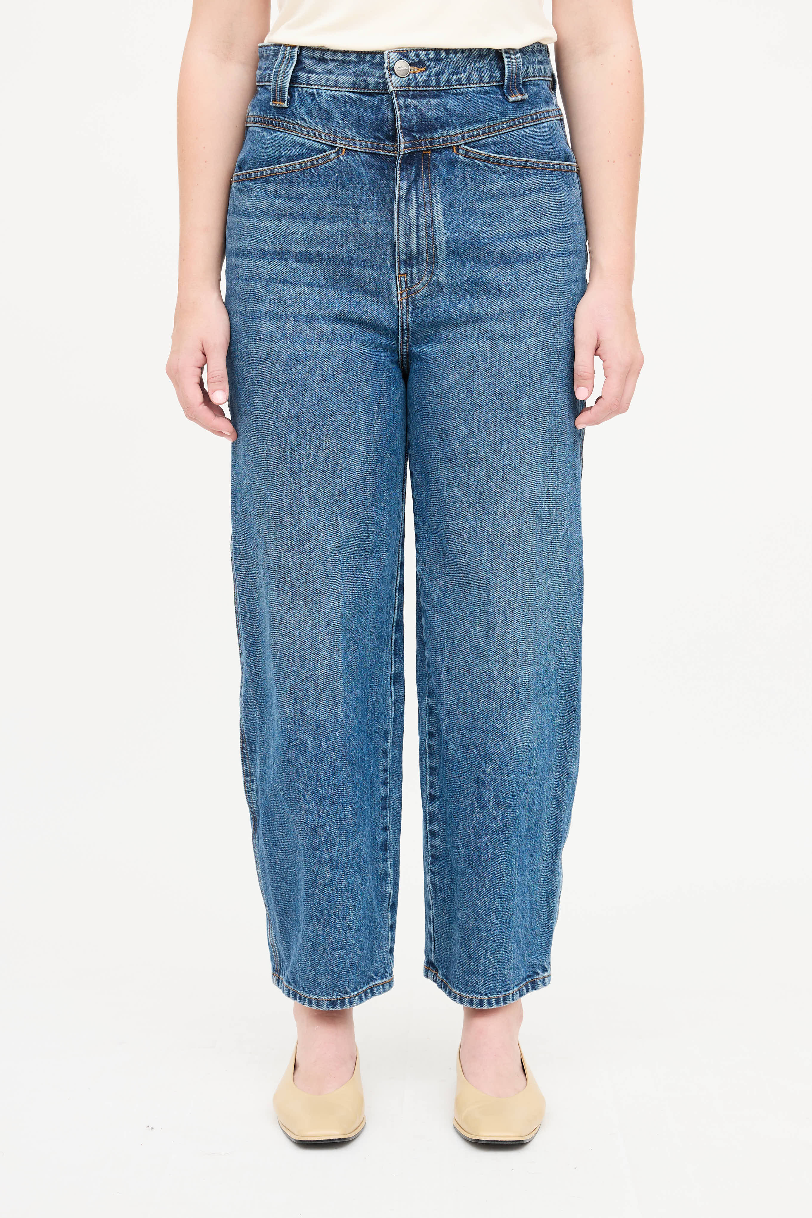 Pre-owned Khaite blue medium wash Preen jeans featuring zip fly, belt loops, paneled waist, slit pockets at front, and patch pockets at back.