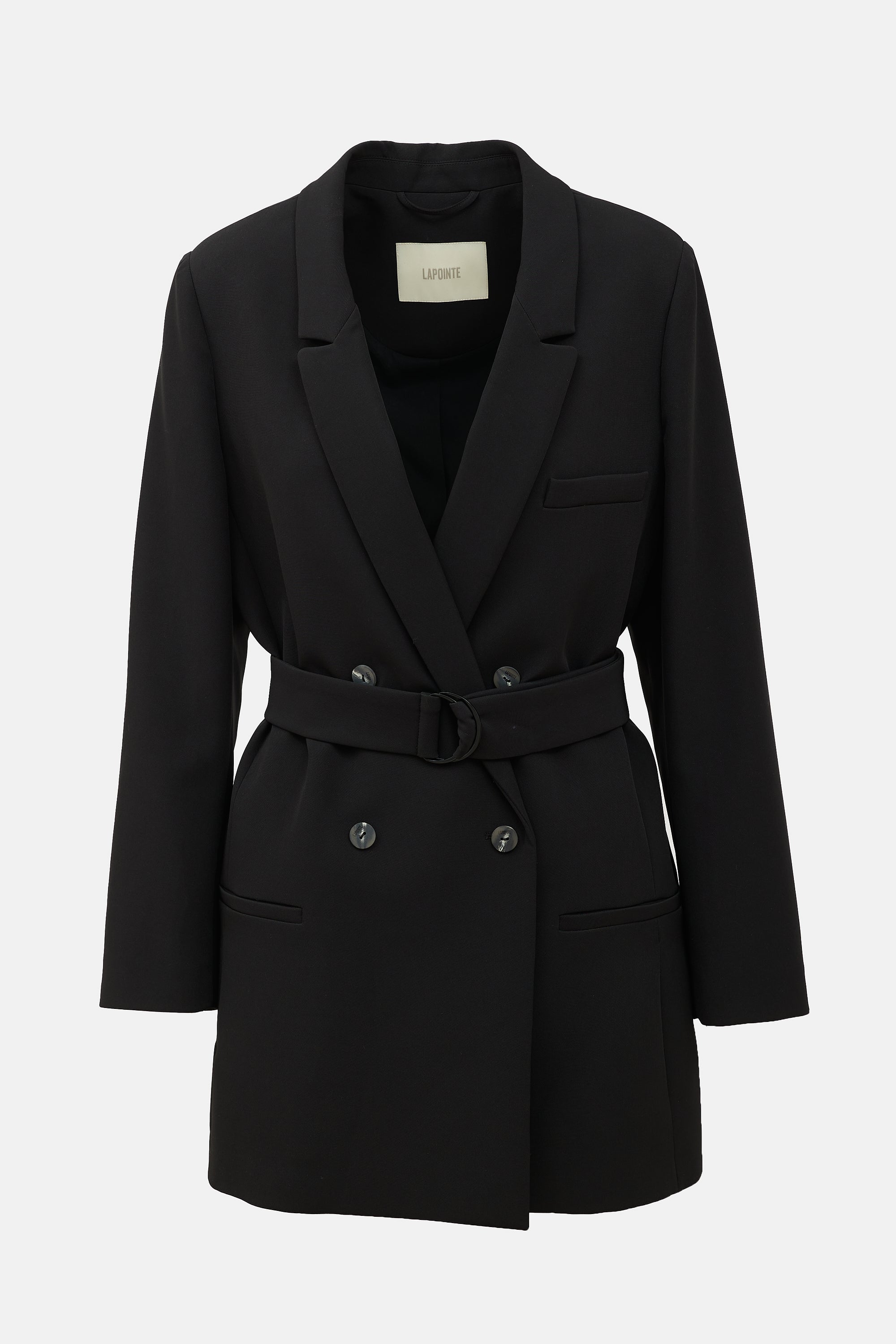 Pre-owned LAPOINTE black blazer featuring a peak lapel, padded shoulder, double breasted front, adjustable belt, and welt pockets. Lined.