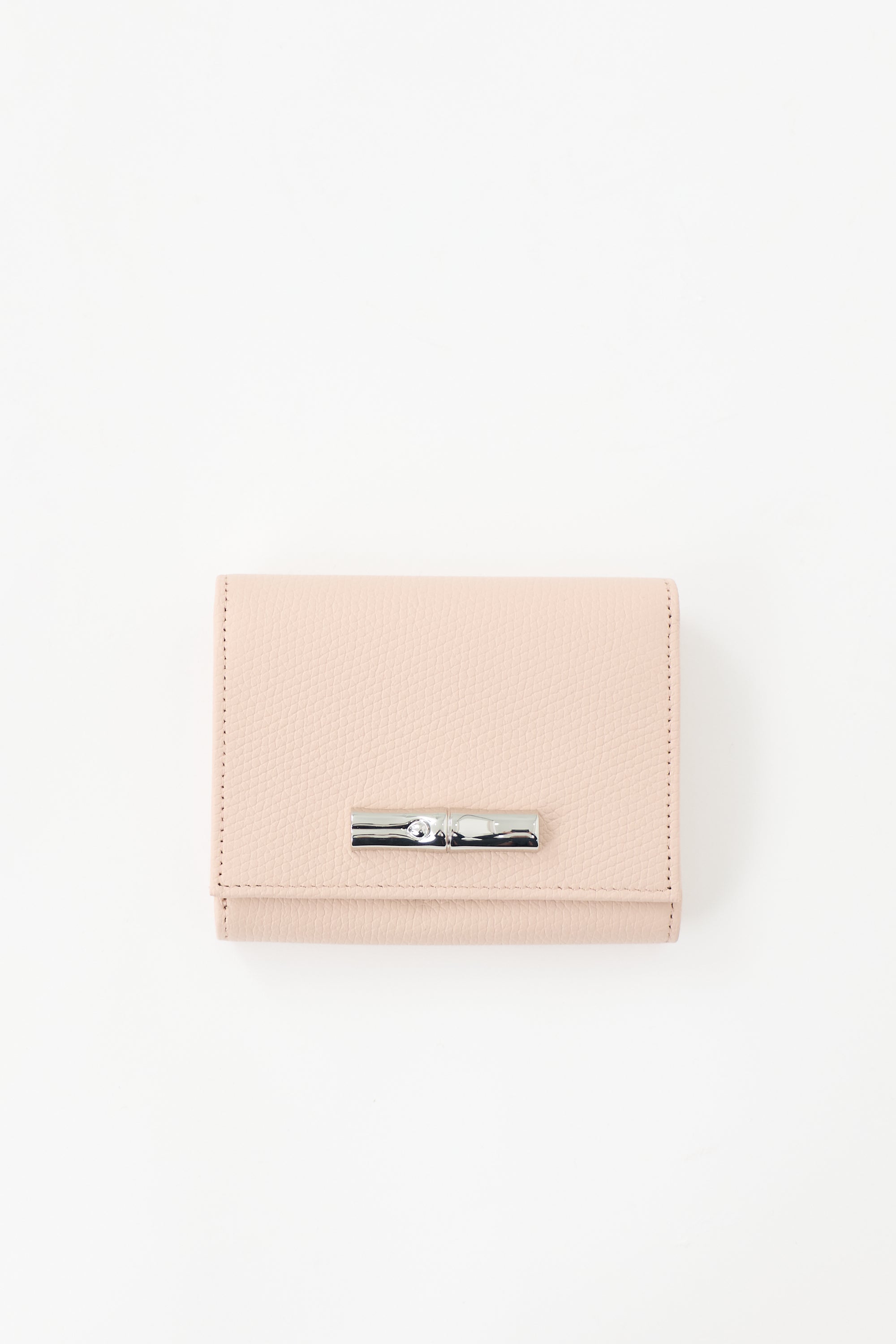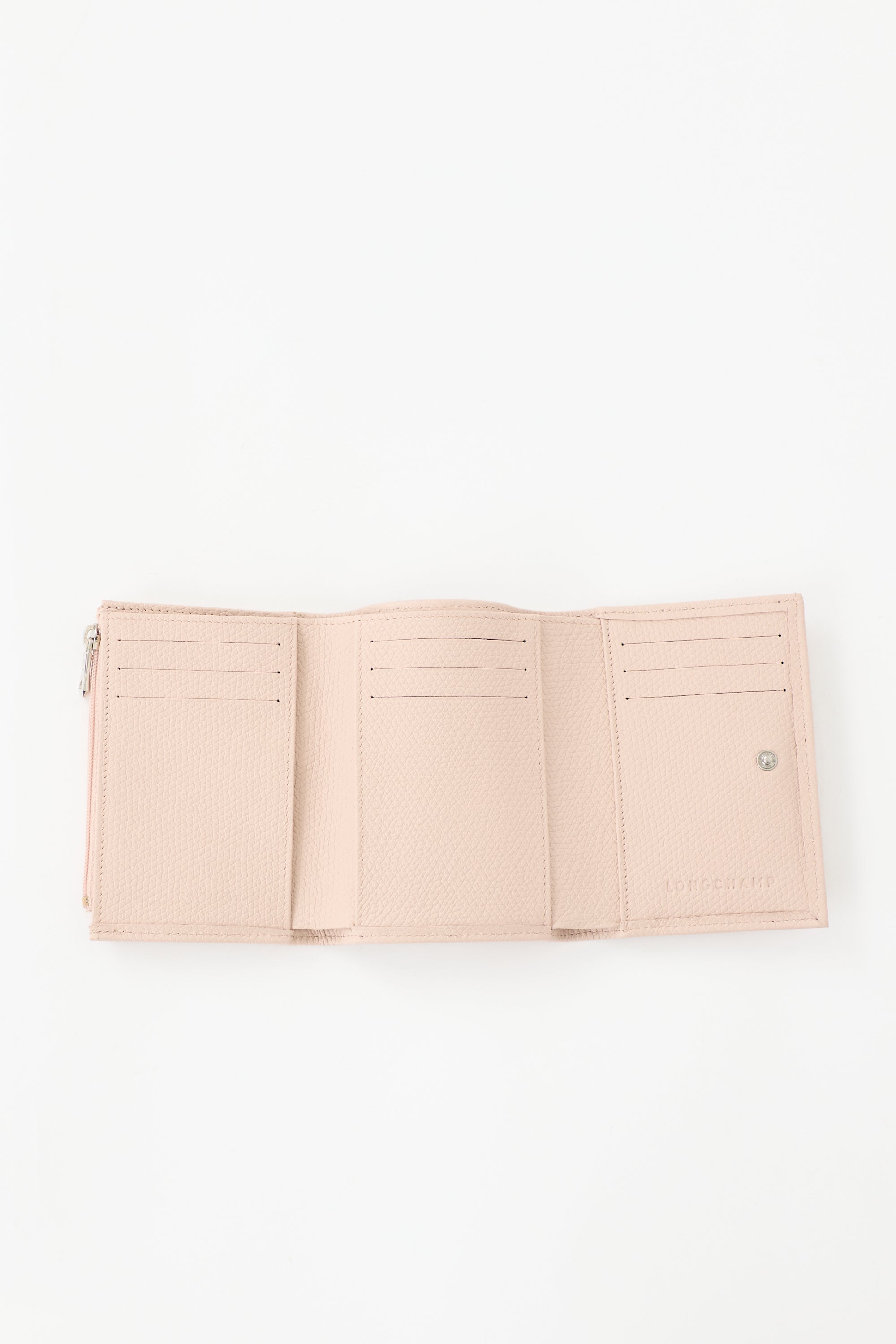 Longchamp pink leather Le Roseau wallet featuring silver tone hardware, snap button closure, one zip coin pouch, one bill pocket, and 11 card slots. Includes original box.