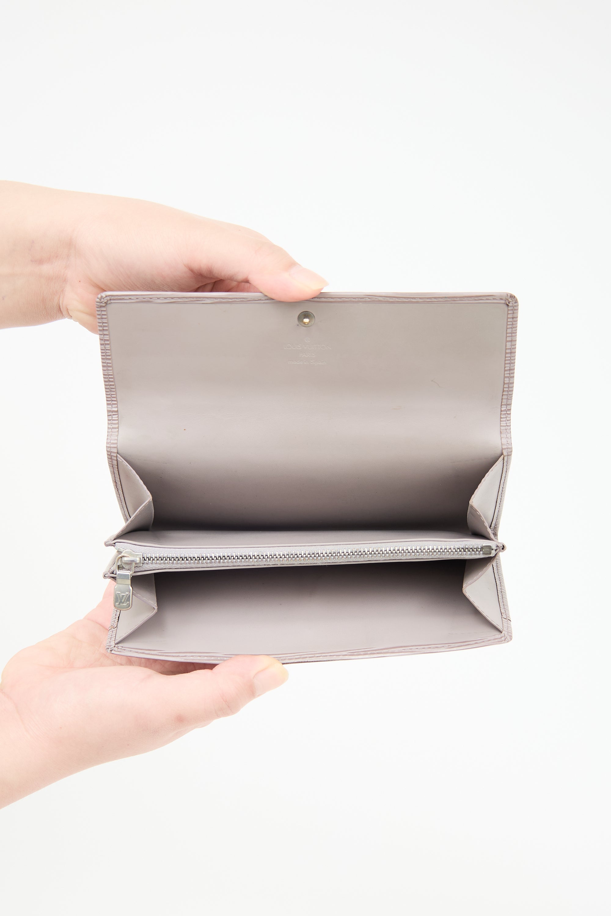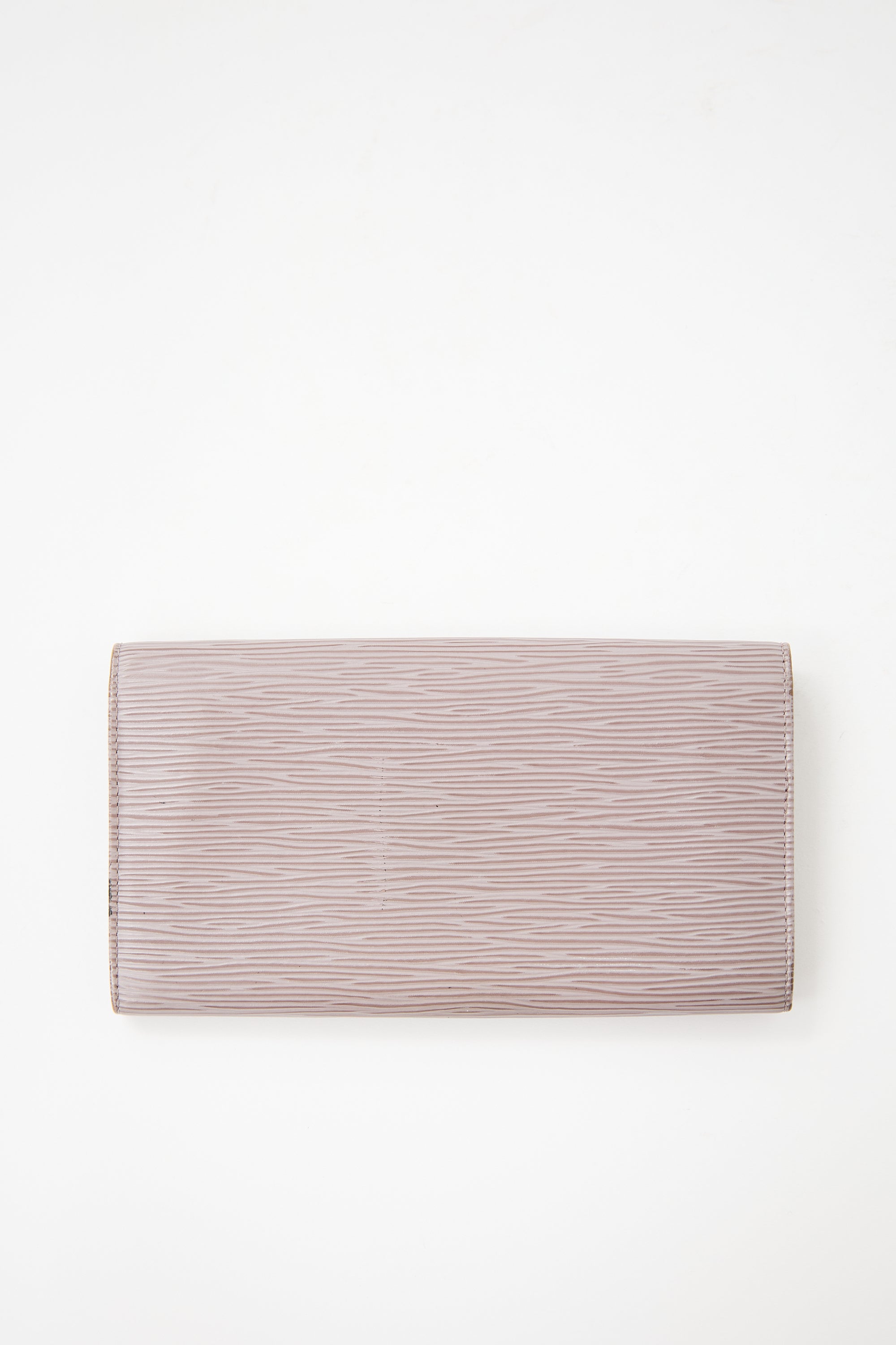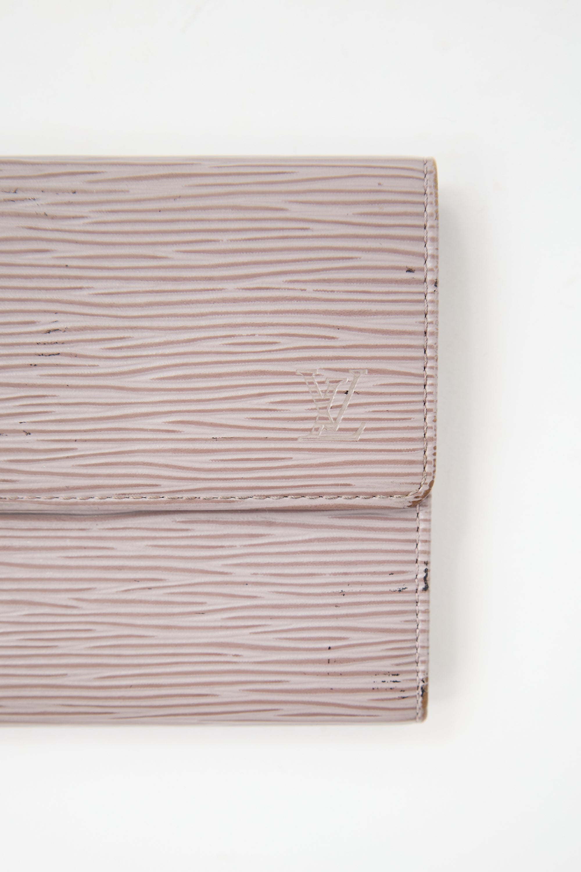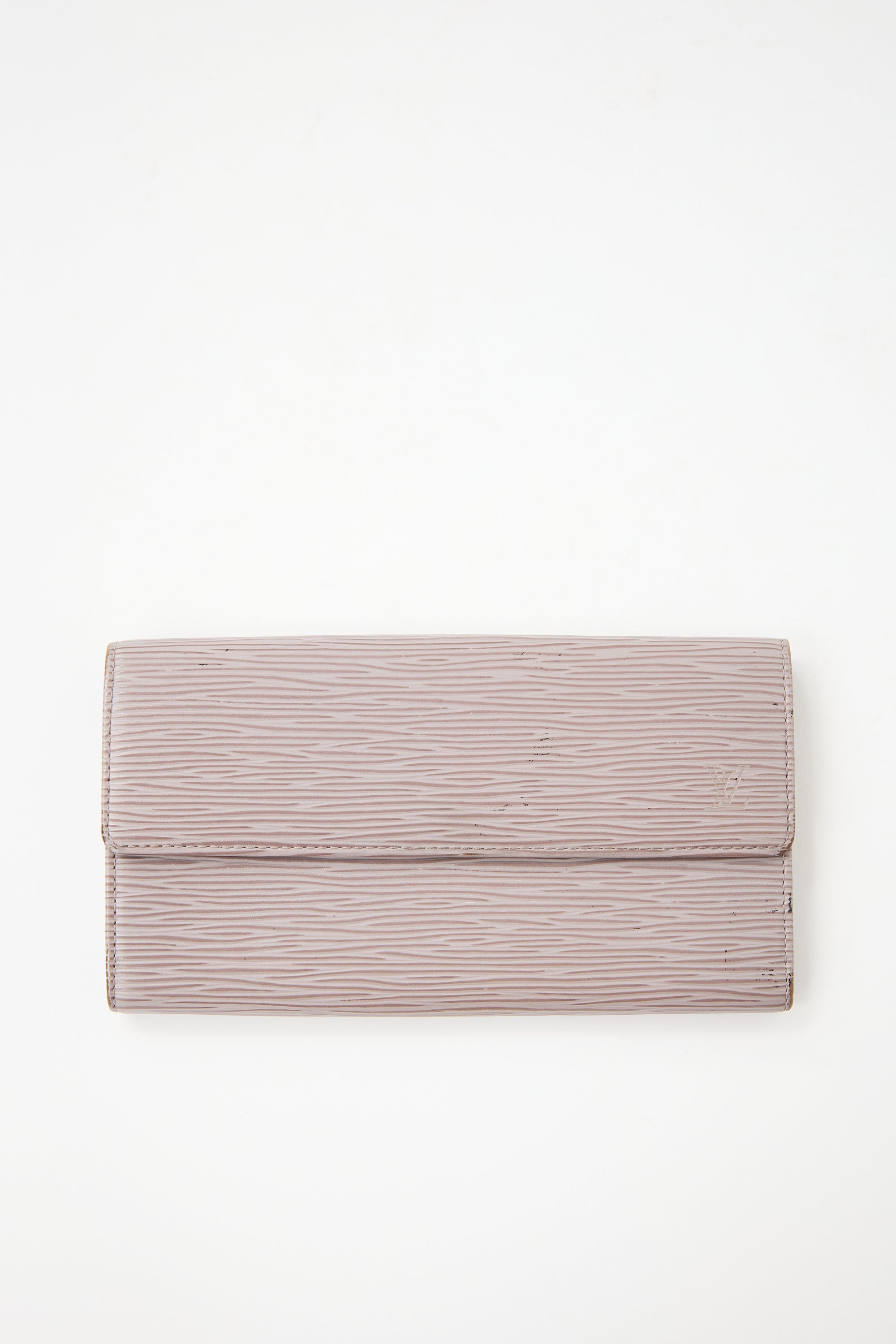 Pre-owned Louis Vuitton 2000 taupe Epi leather wallet featuring debossed logo at front, snap button closure, two main compartments, two card slots, and one zip pocket inside. Comes with original dust bag.