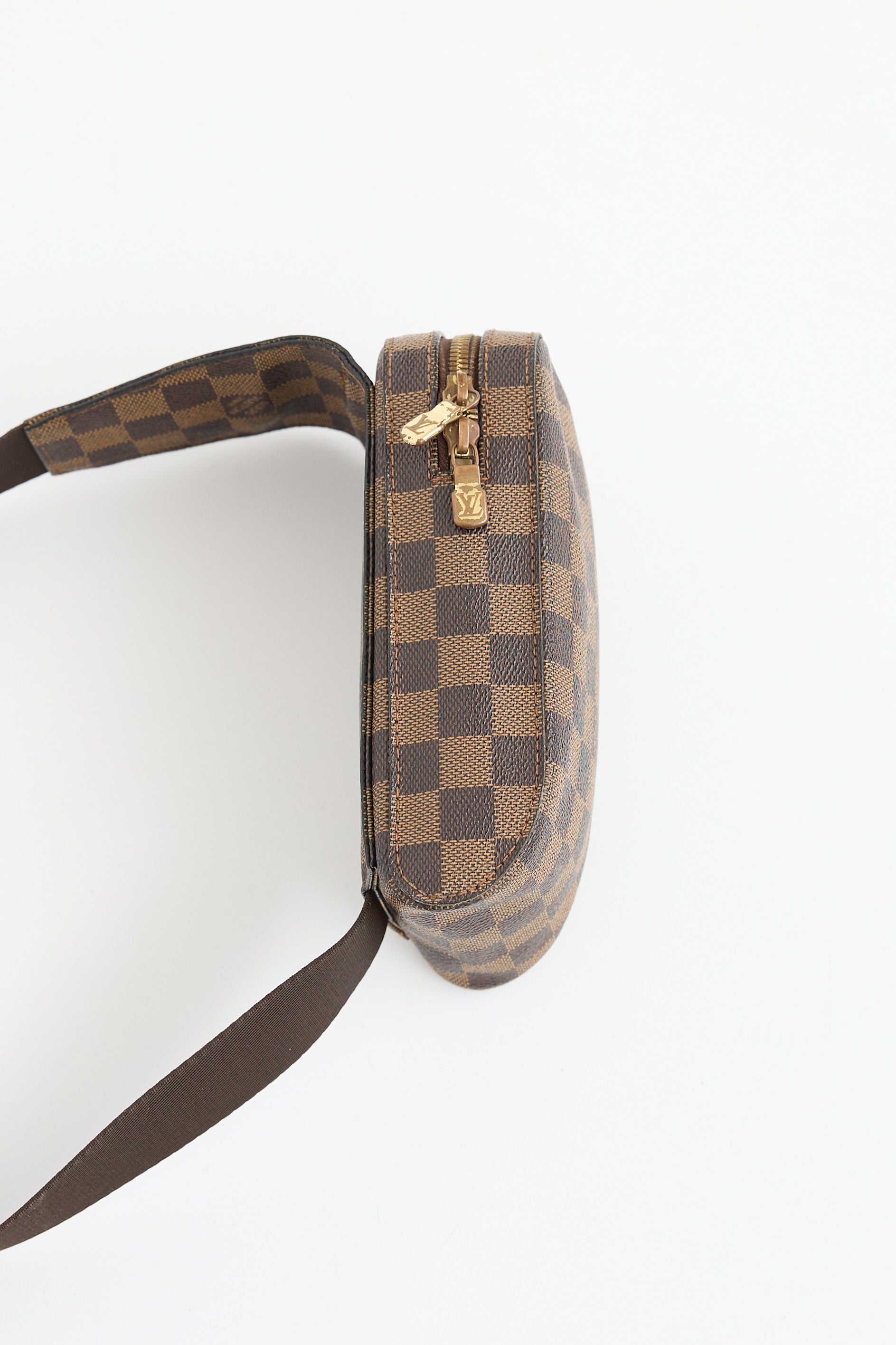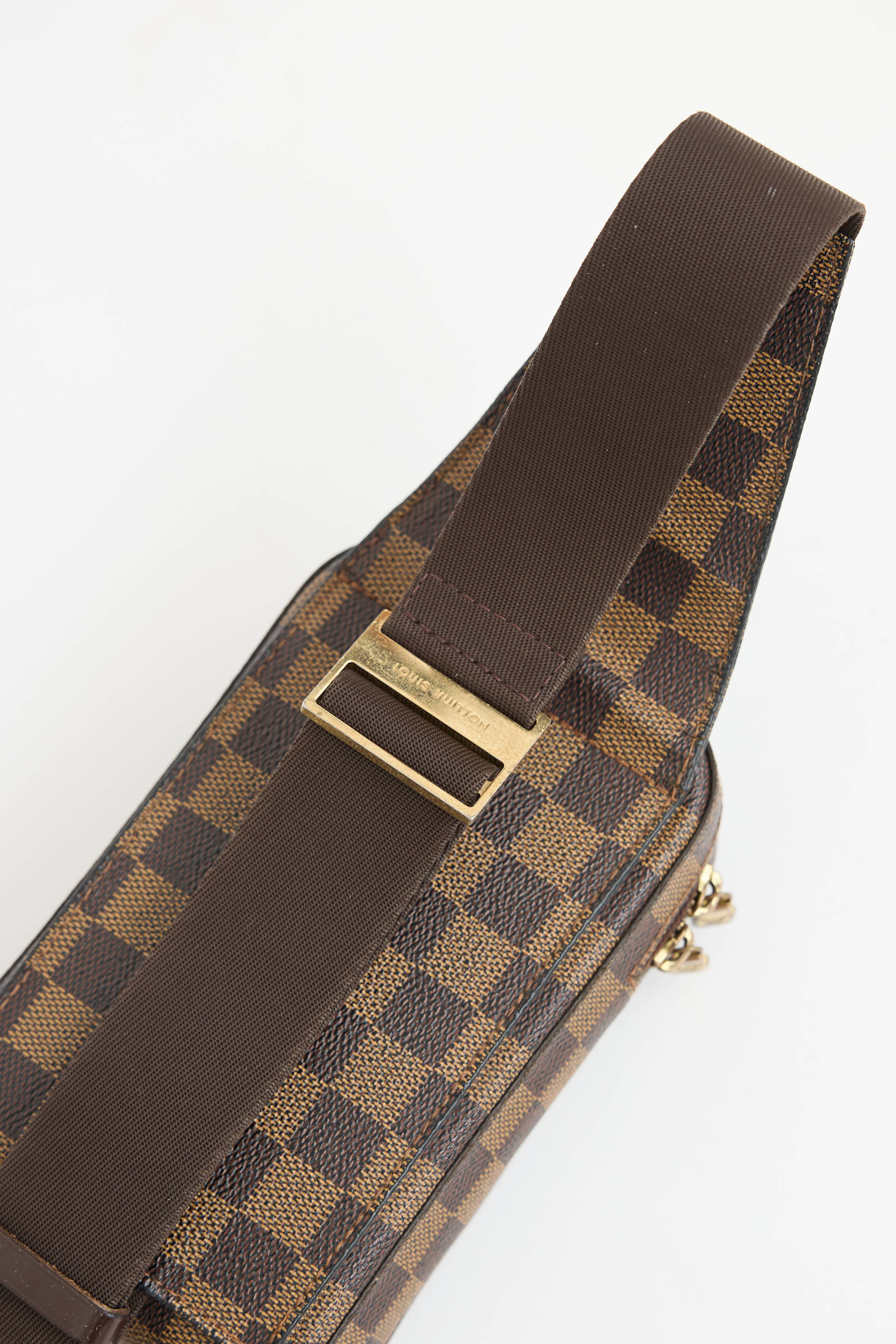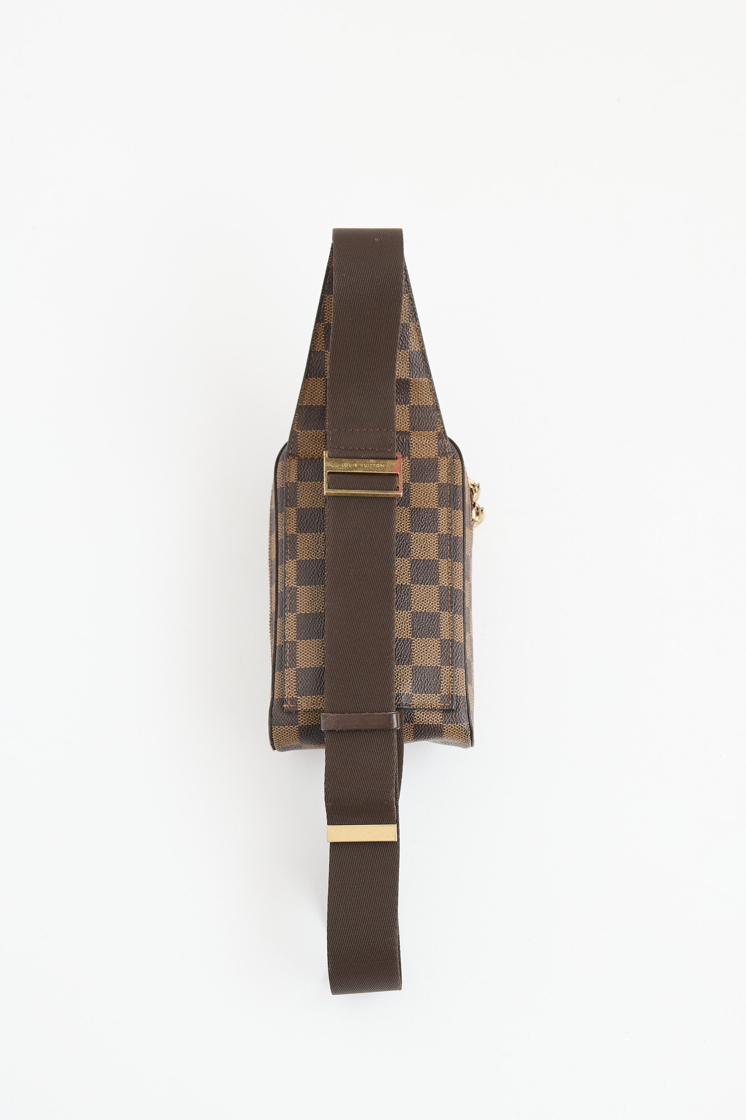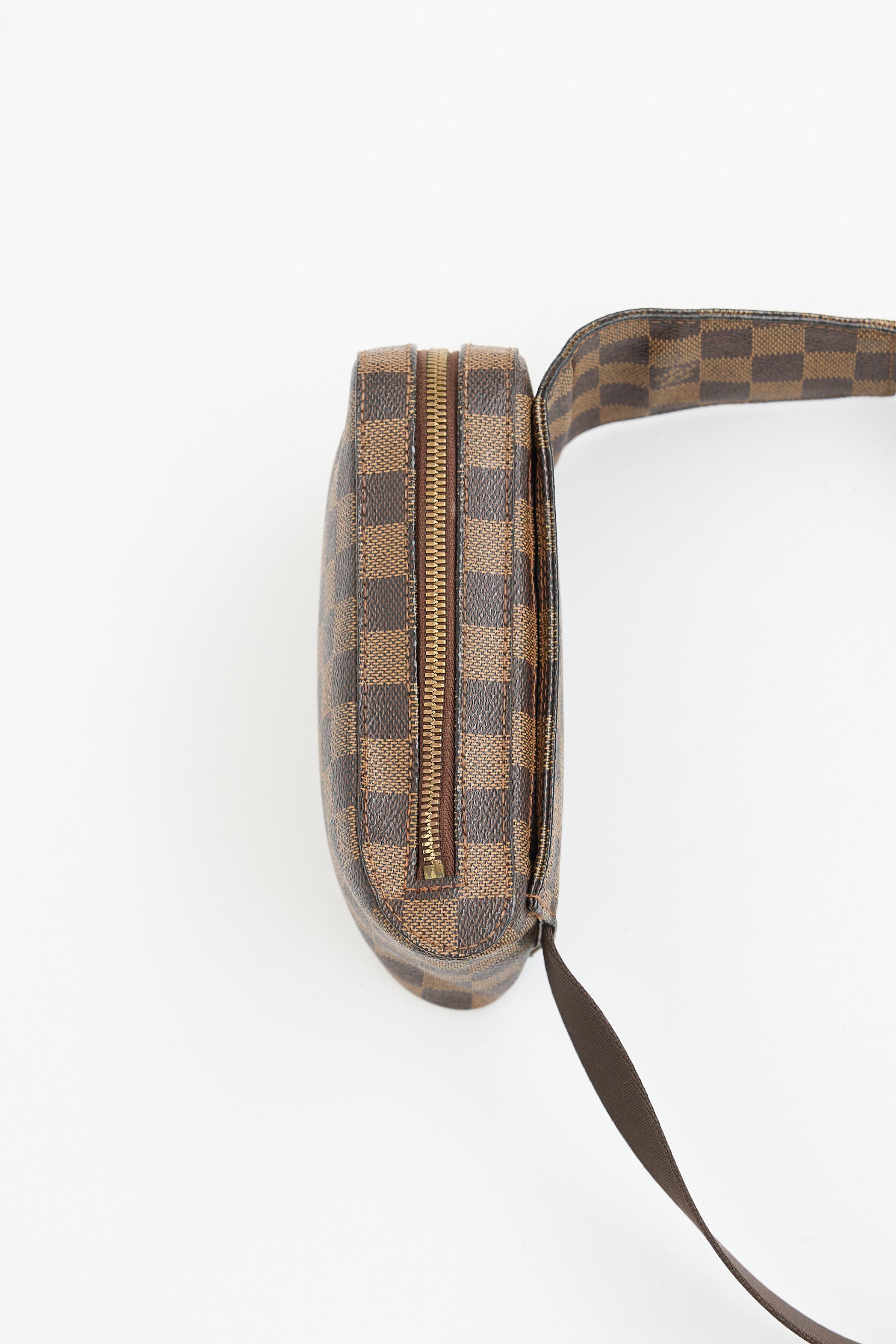 Pre-owned Louis Vuitton 2004 brown Damier Ebene Geronimo bag featuring webbed adjustable strap, gold tone hardware, exterior pocket with velcro closure, and one zip closure with one main compartment.