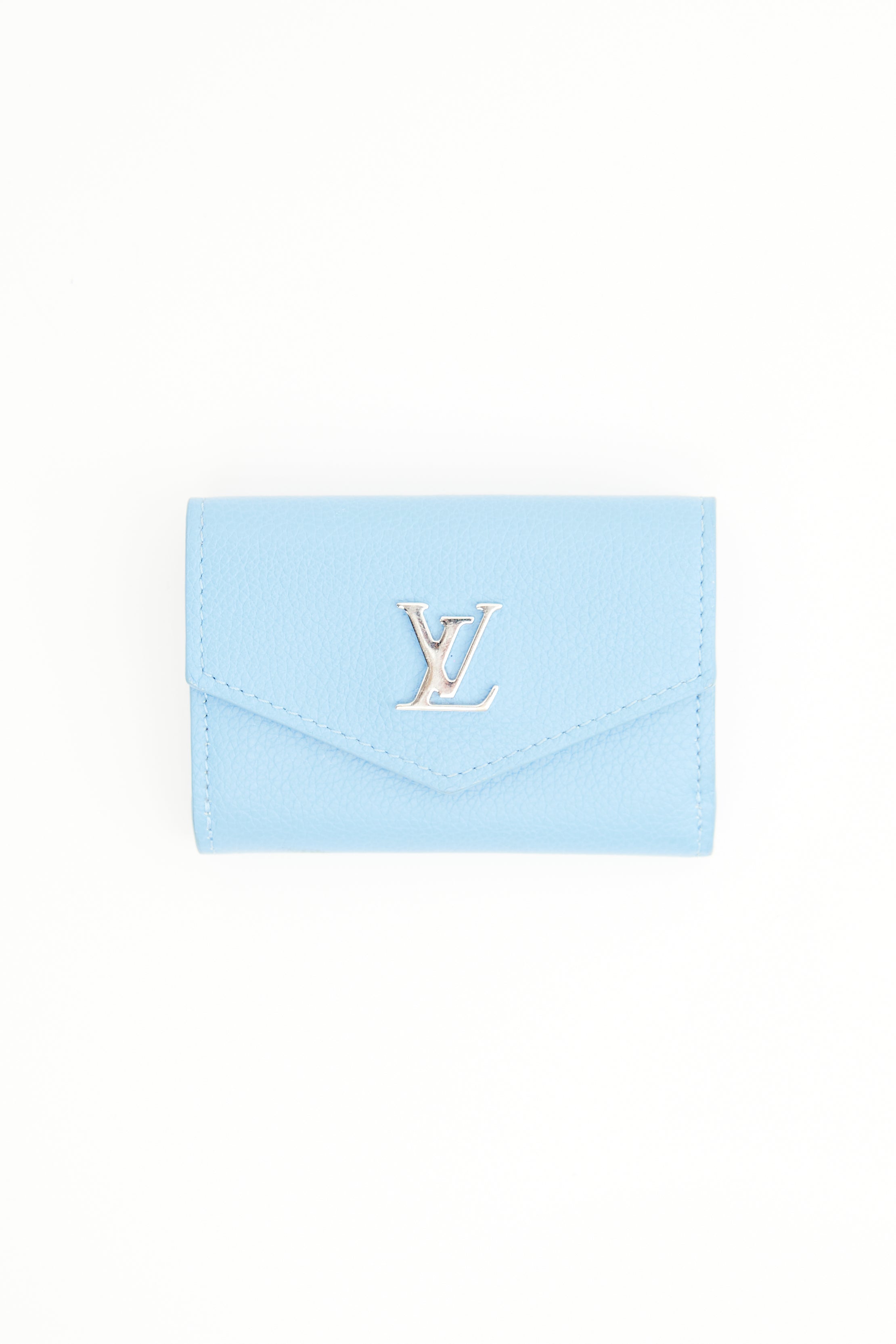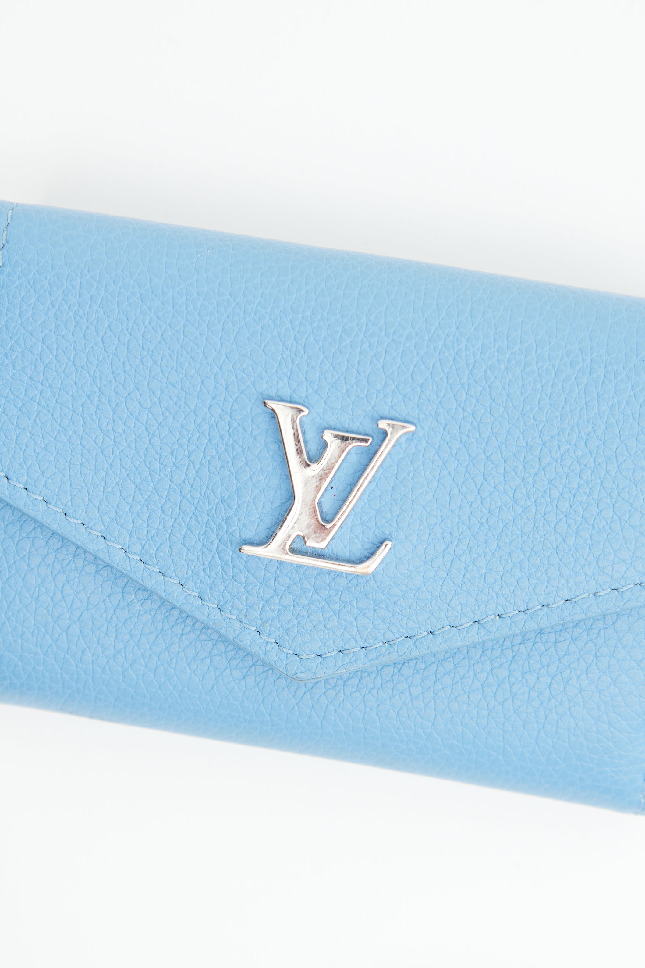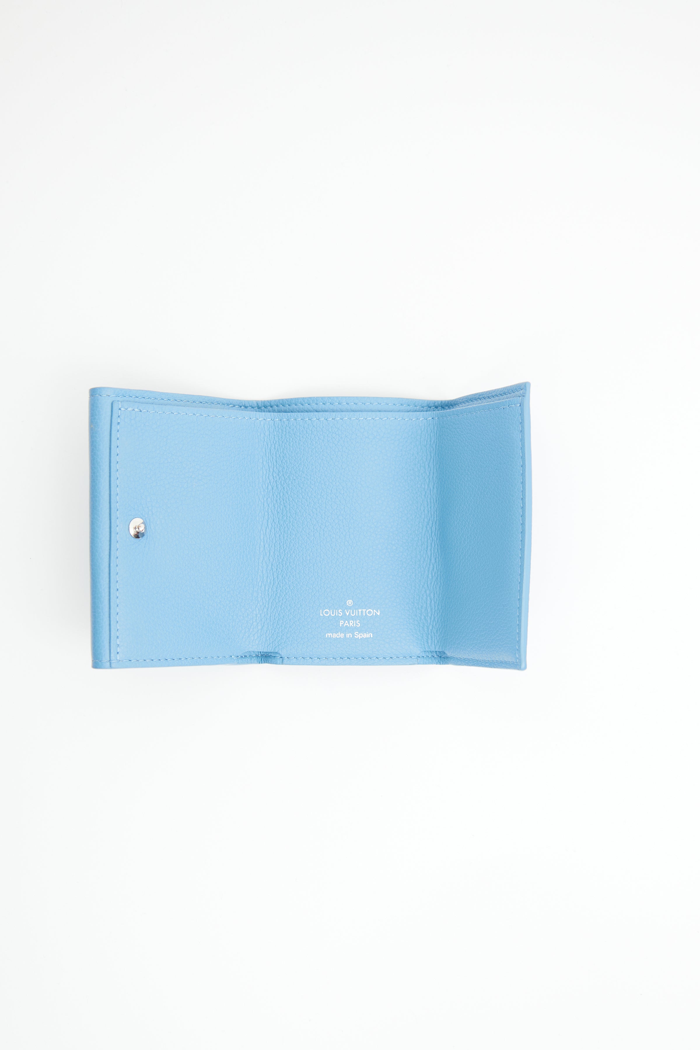 Pre-owned Louis Vuitton blue Portefeuille trifold wallet featuring pebbled leather, silver tone LV logo hardware on front, flap closure with snap button and one slip pocket. Snap button closure on back with one slip pocket. Includes original box and dust bag.
