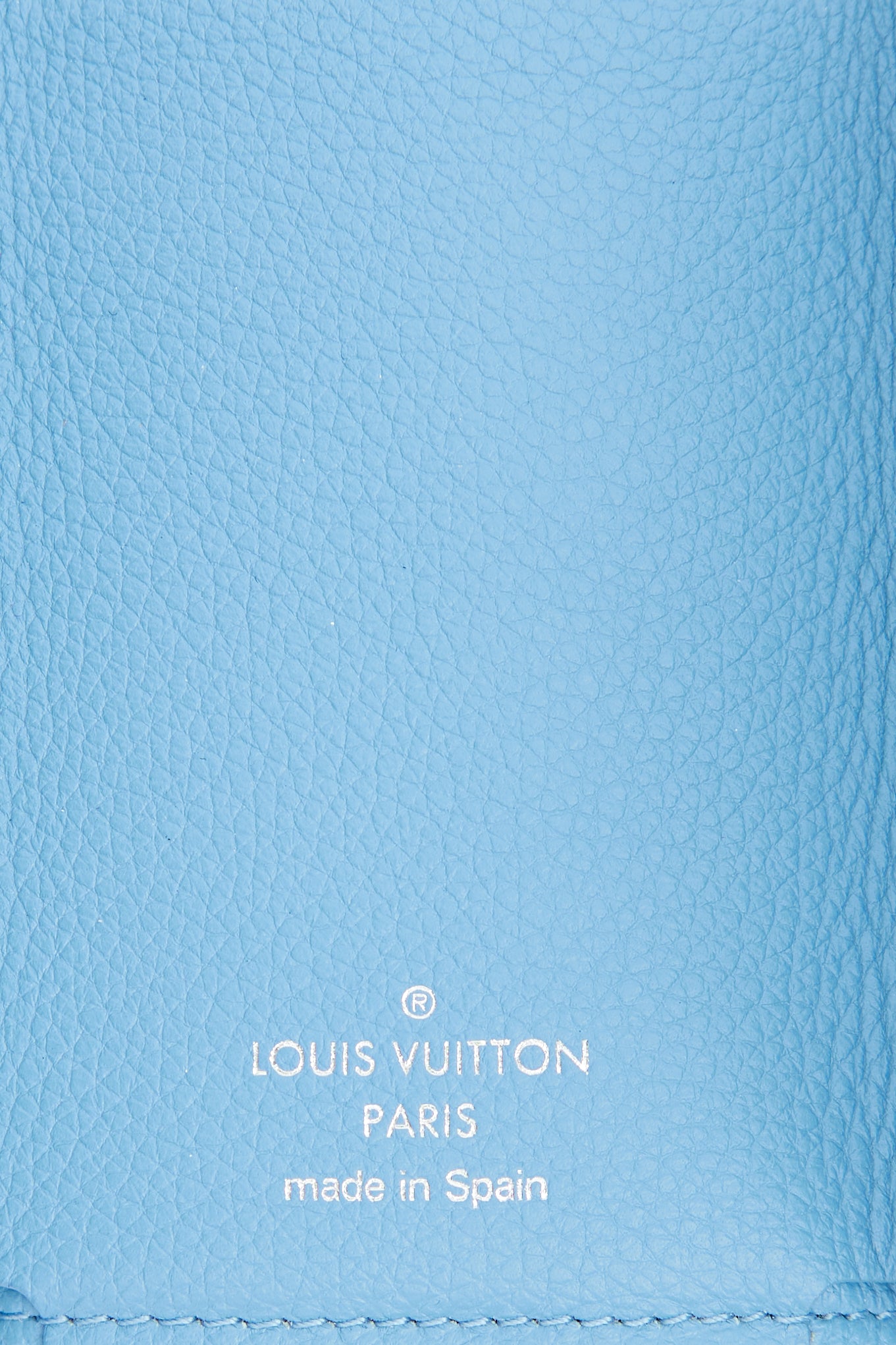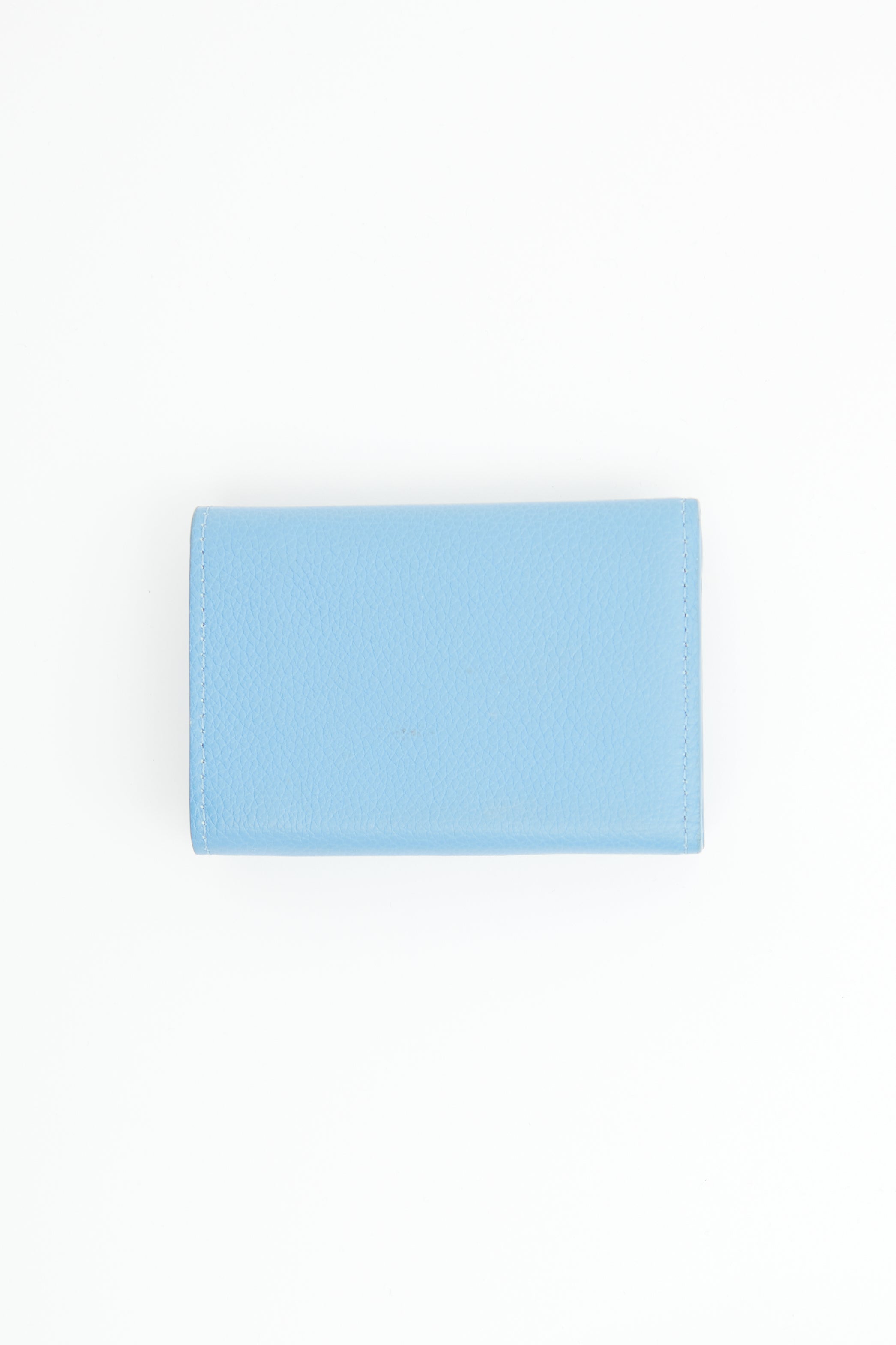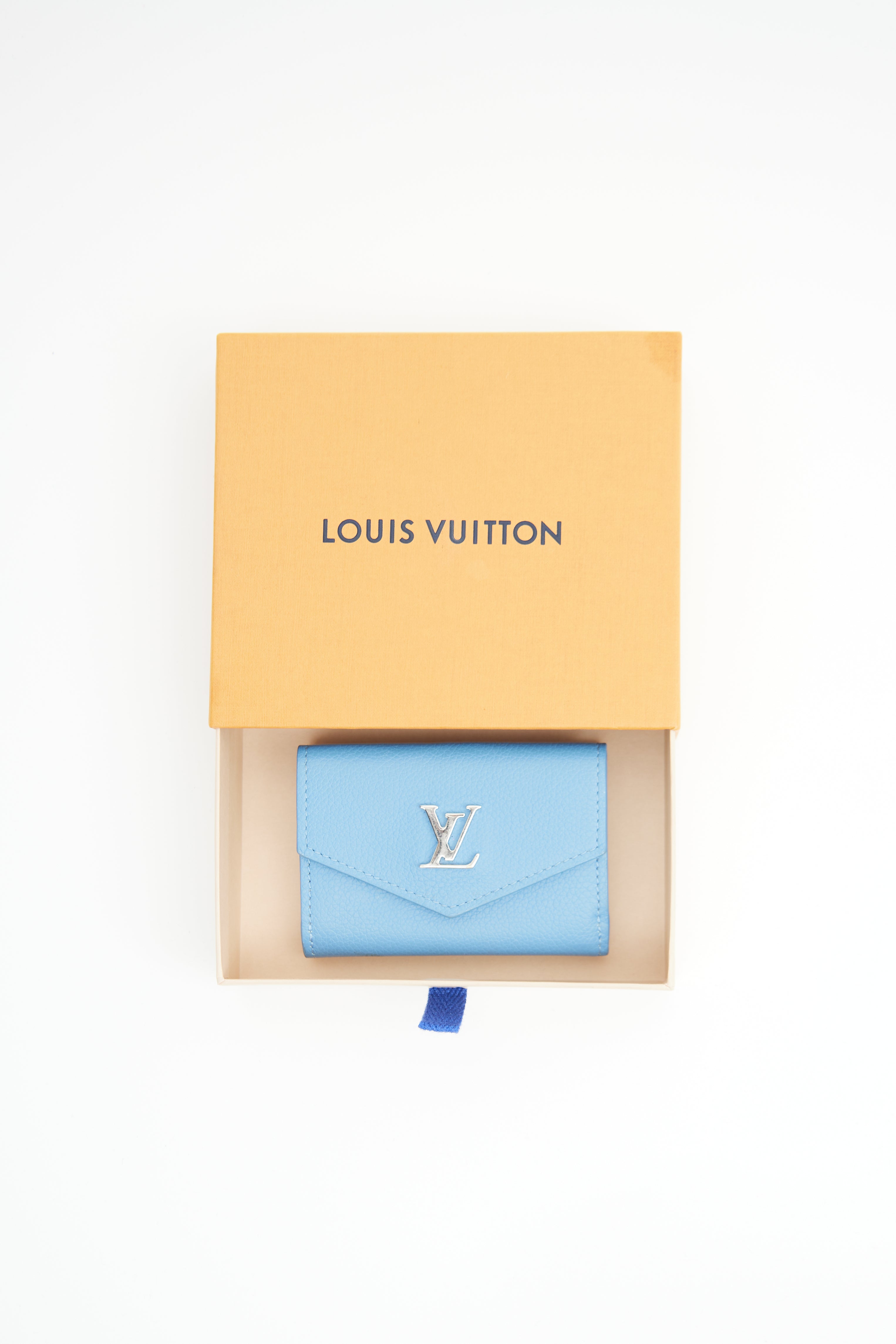 Pre-owned Louis Vuitton blue Portefeuille trifold wallet featuring pebbled leather, silver tone LV logo hardware on front, flap closure with snap button and one slip pocket. Snap button closure on back with one slip pocket. Includes original box and dust bag.