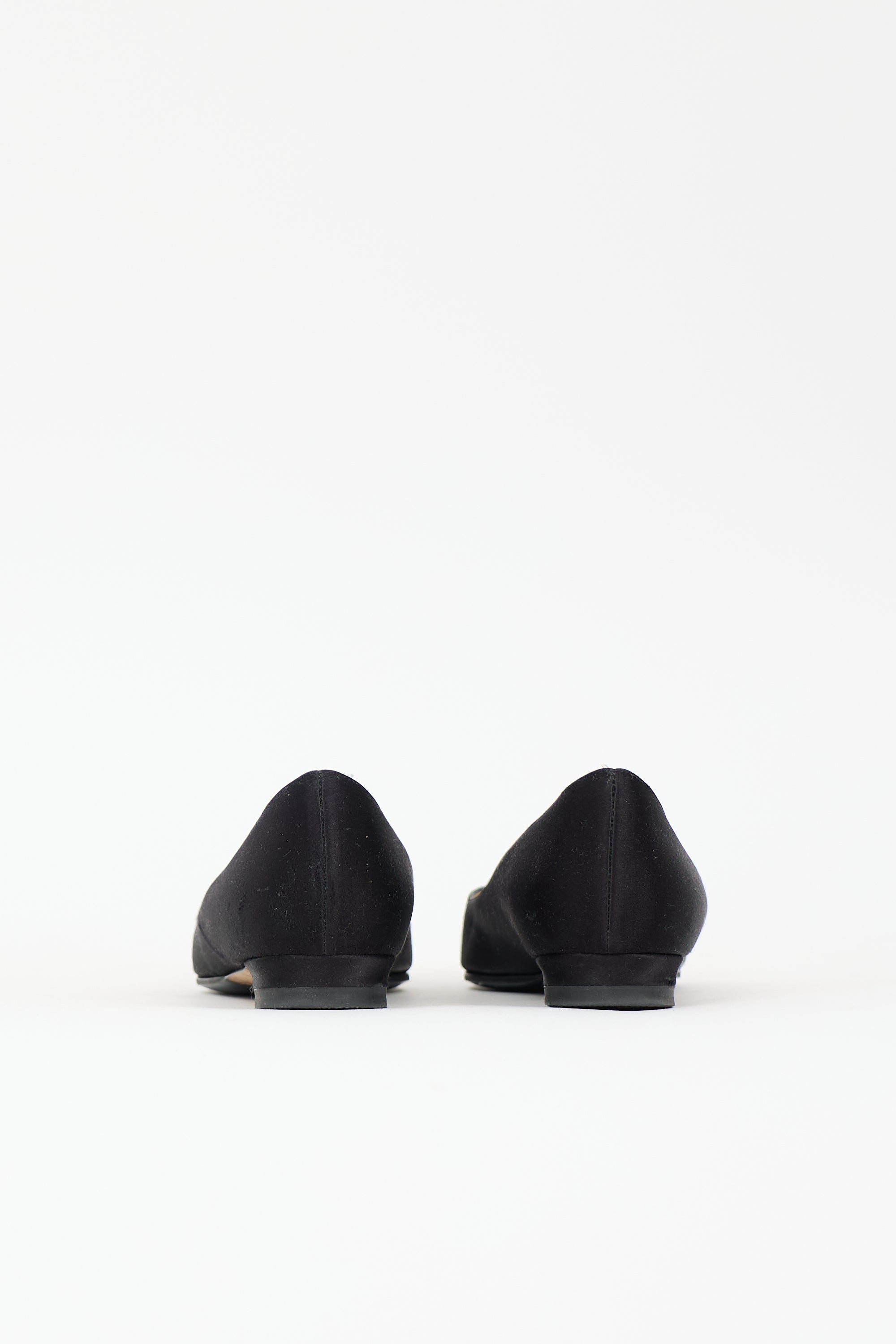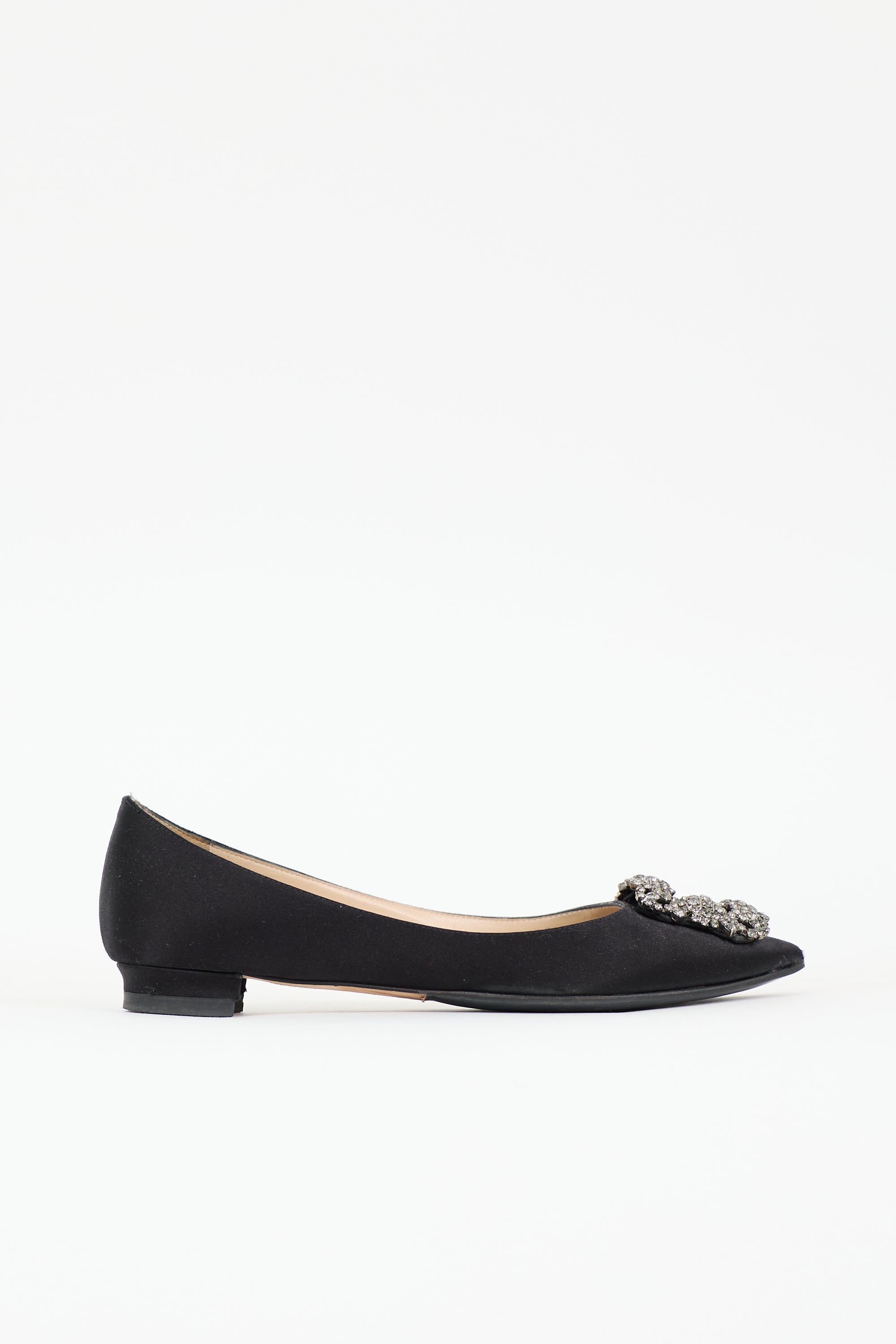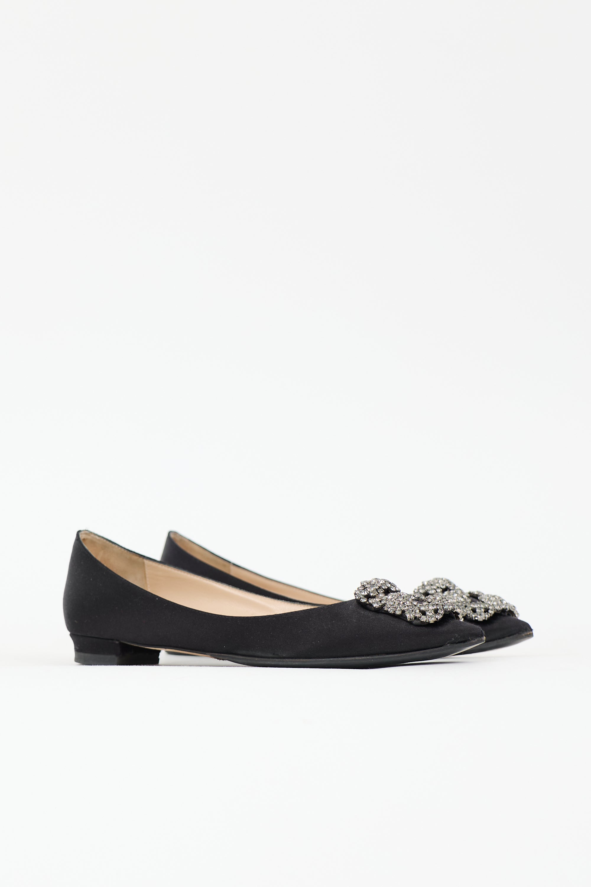 Pre-owned Manolo Blahnik black satin Hangisi flats featuring pointed toe, silver tone crystal buckle, and block heel. Includes original dust bag.